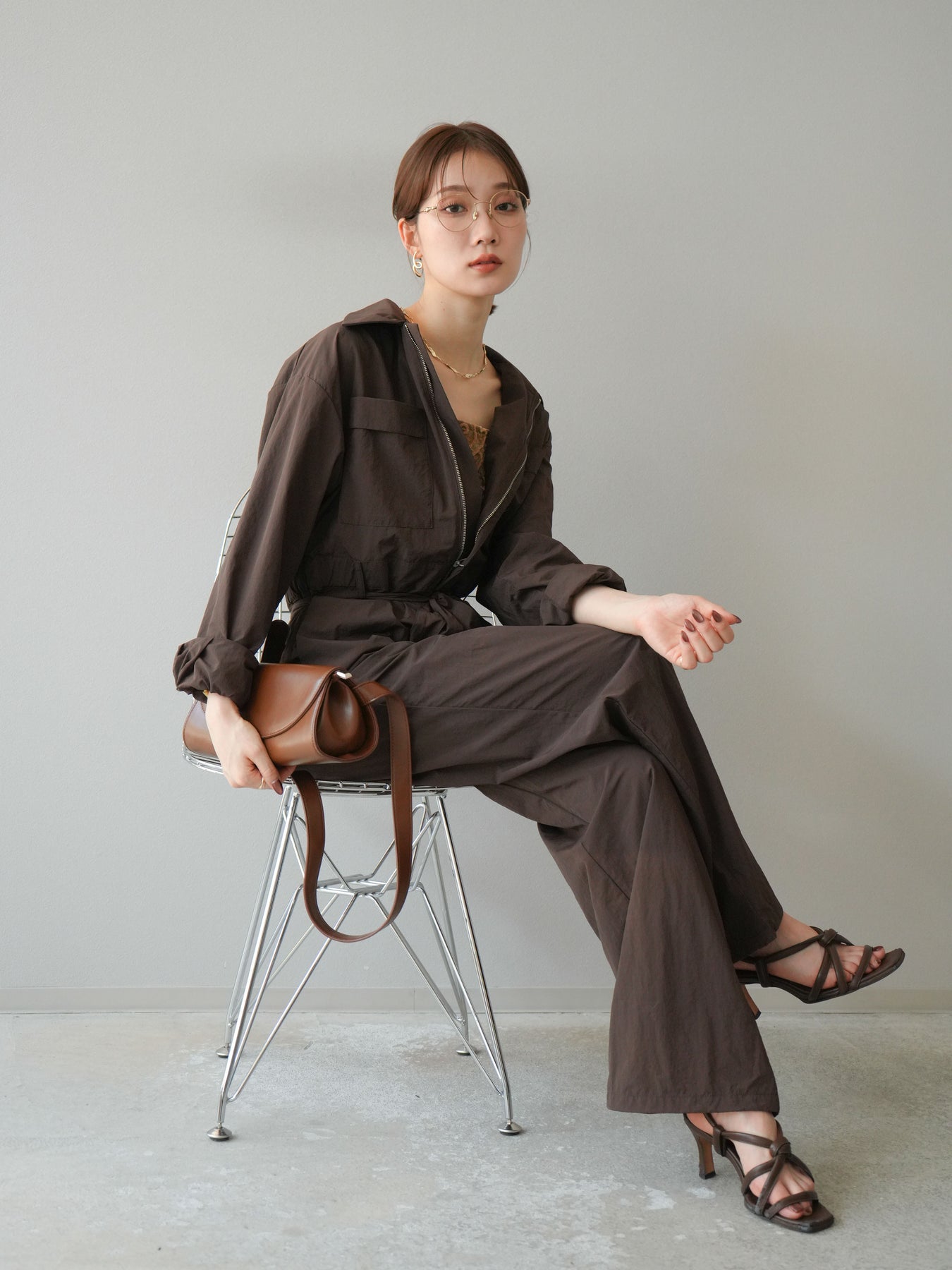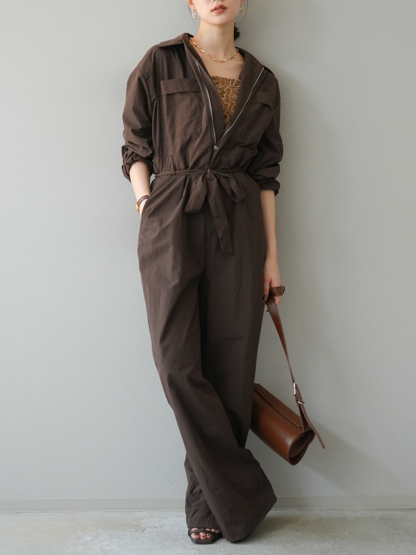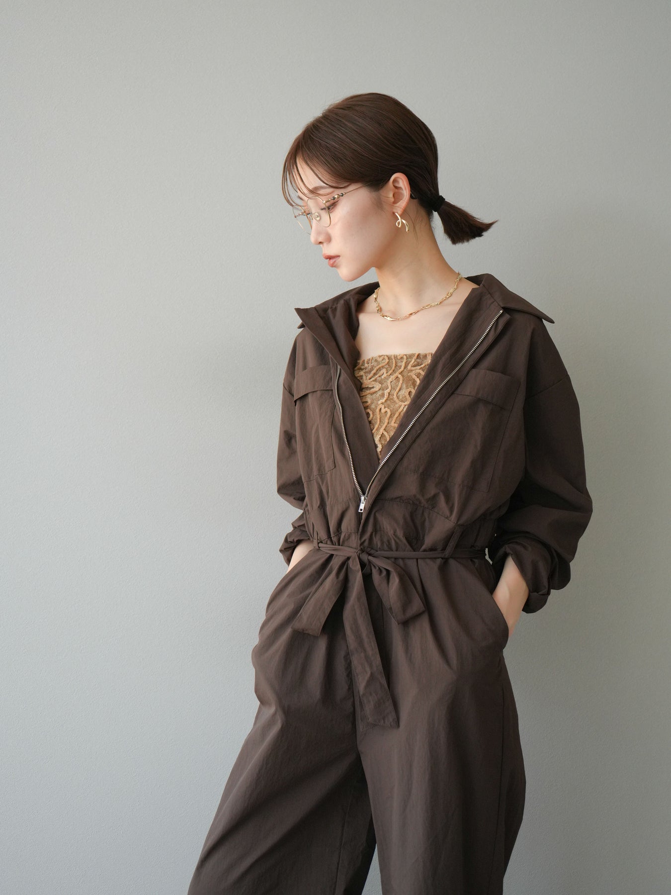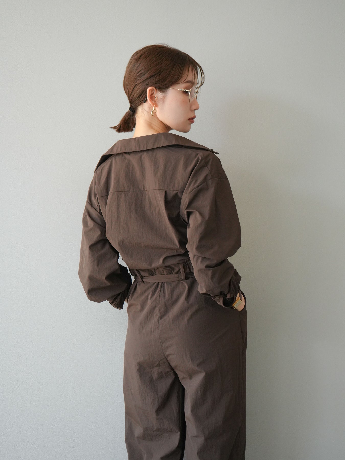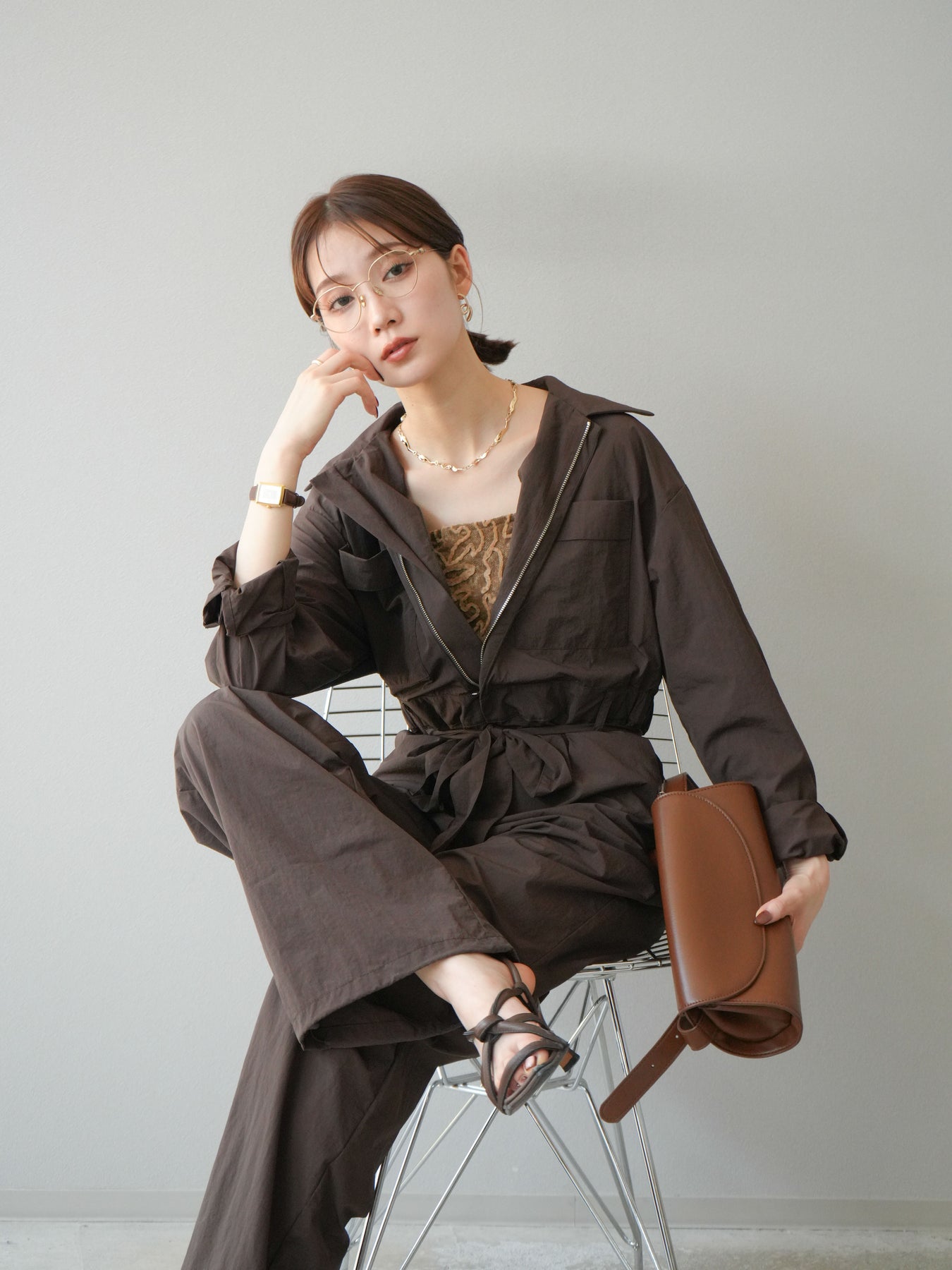 ミニマルなデザインとモード感を兼ね備えたナイロン素材のジャンプスーツ。 軽くしなやかな風合いで、ワイドなシルエットがこなれた印象を与えてくれます。 ウエストの共布ベルトでシルエットの調整も可能。 1枚でサマになる主役アイテムとして、デイリーにも旅行やお出かけにも活躍します。