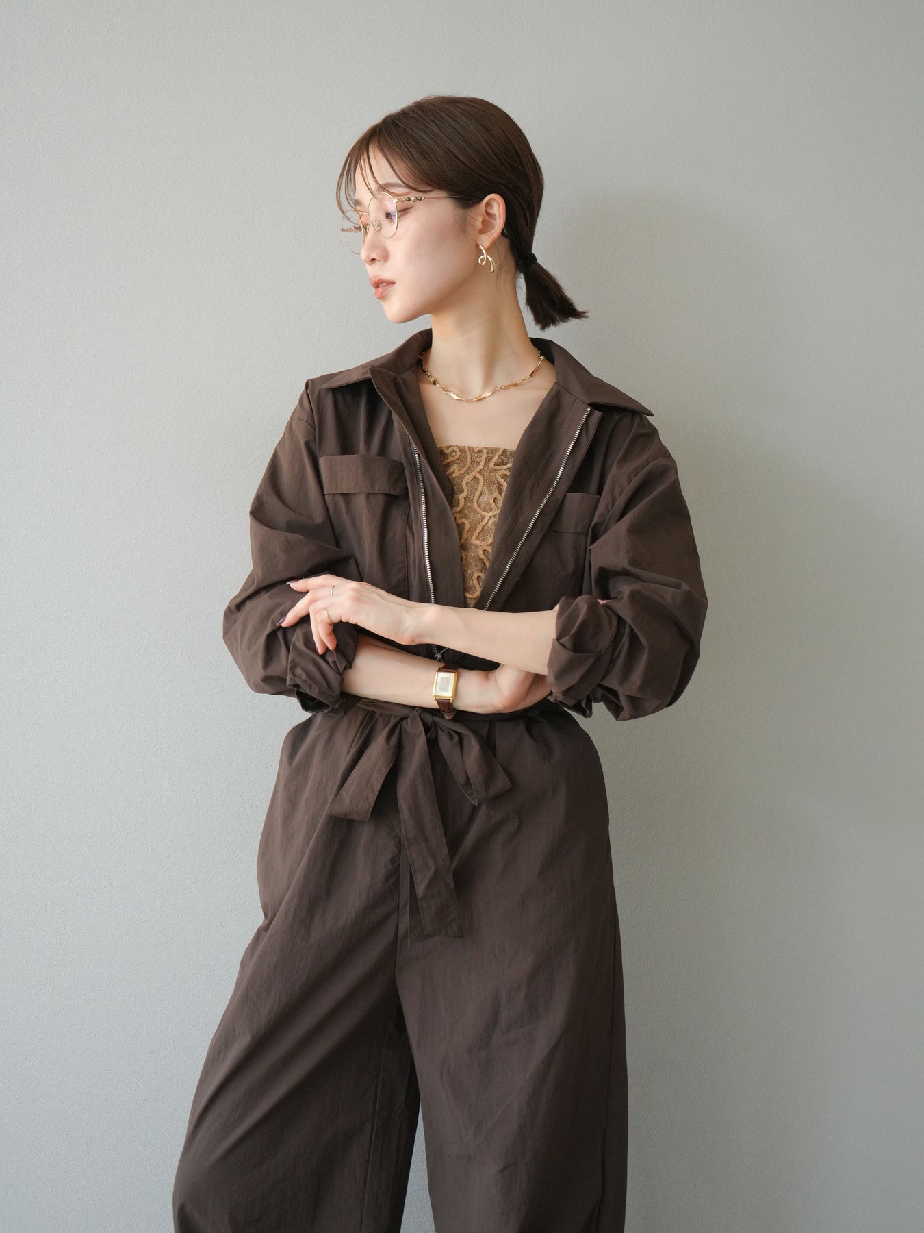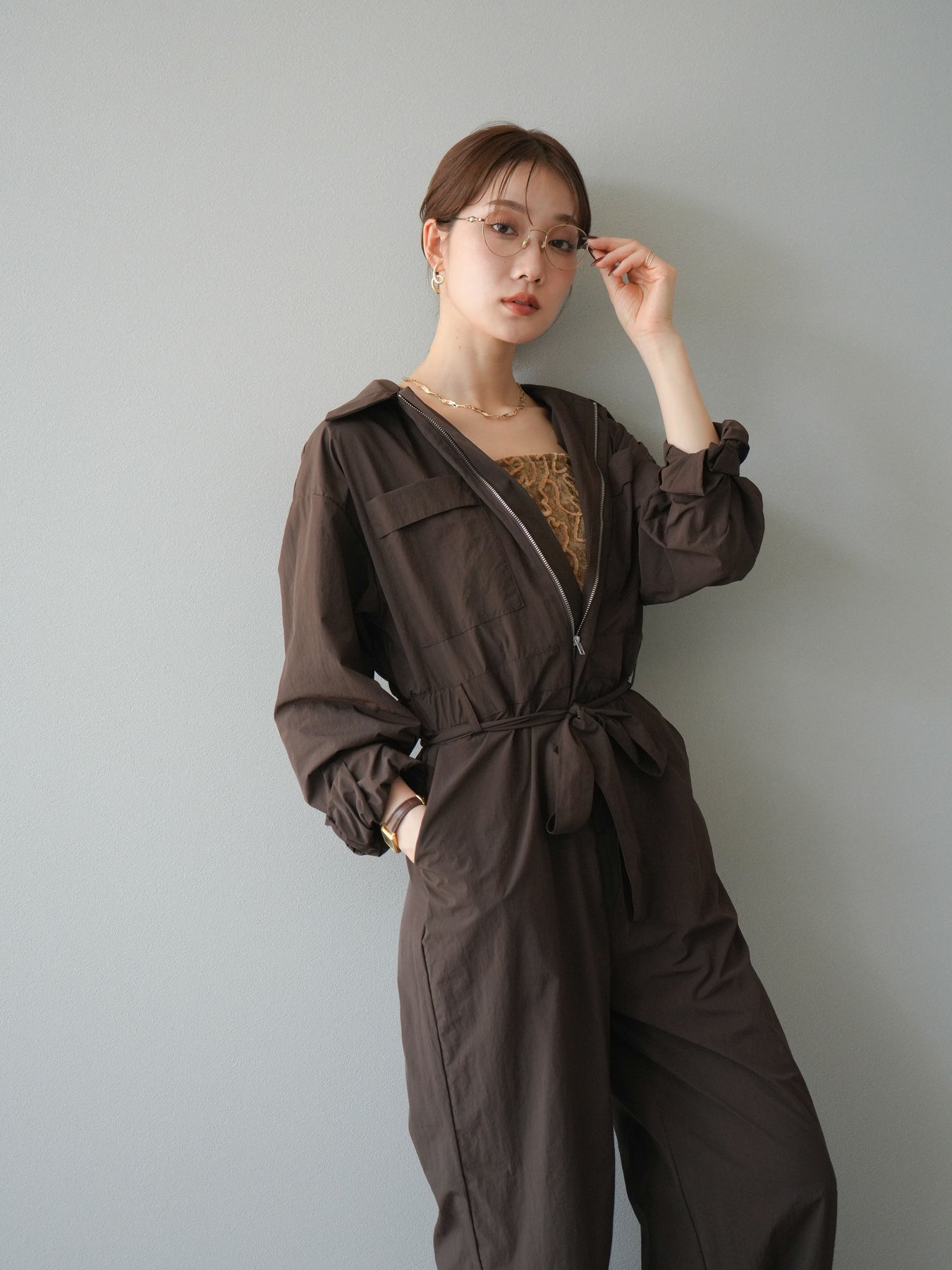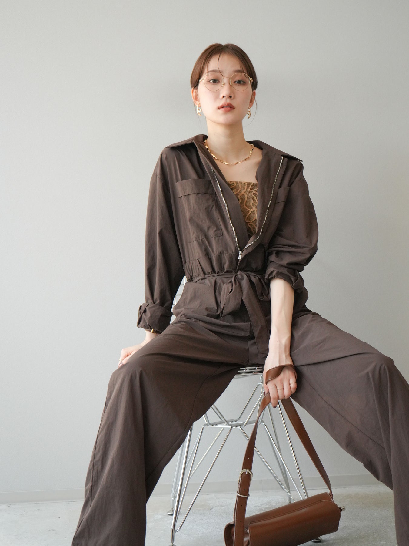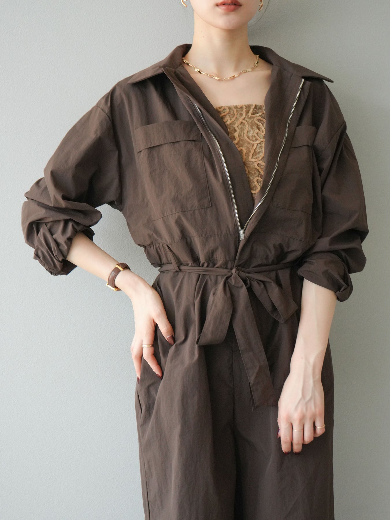 ミニマルなデザインとモード感を兼ね備えたナイロン素材のジャンプスーツ。 軽くしなやかな風合いで、ワイドなシルエットがこなれた印象を与えてくれます。 ウエストの共布ベルトでシルエットの調整も可能。 1枚でサマになる主役アイテムとして、デイリーにも旅行やお出かけにも活躍します。