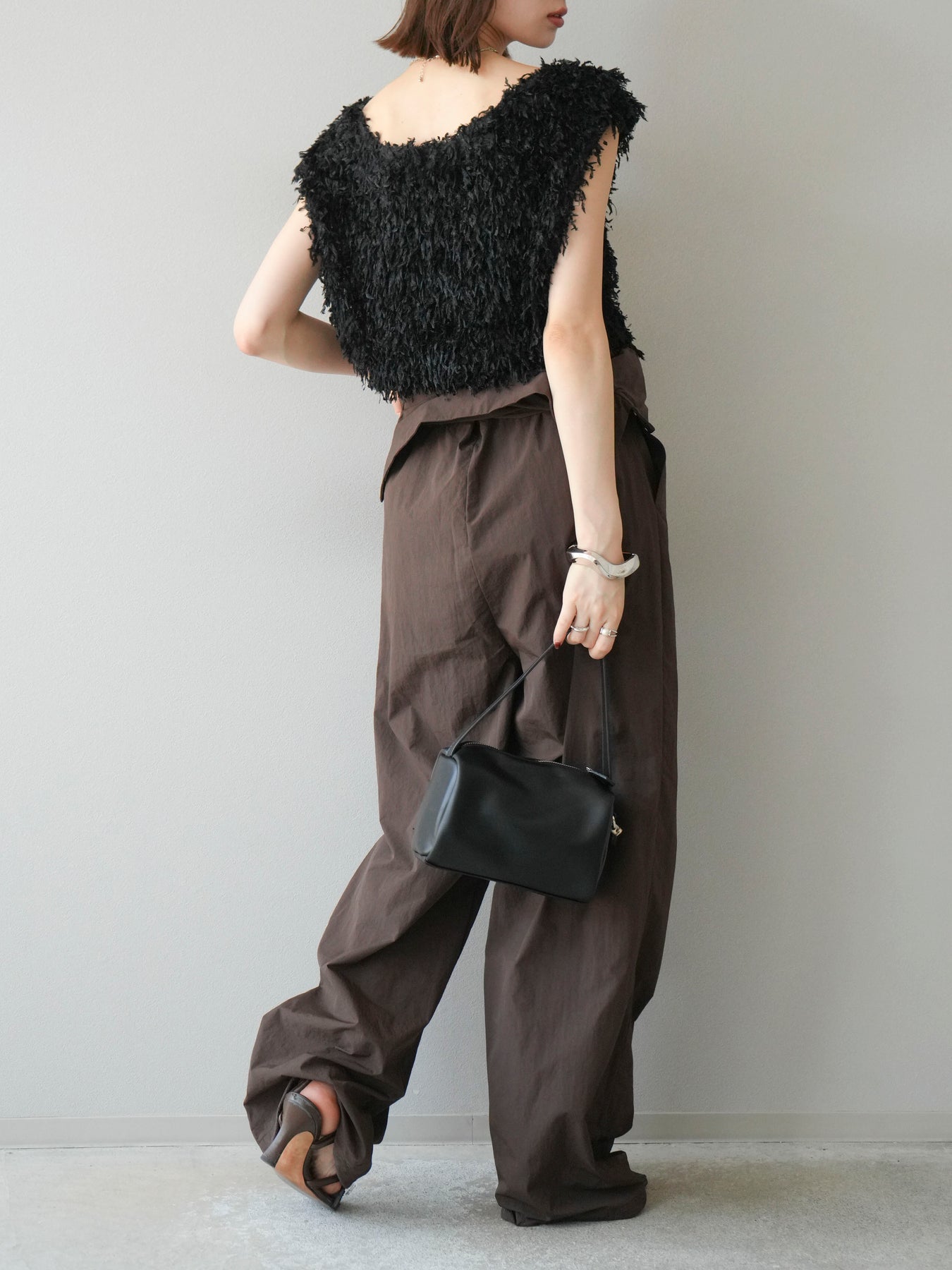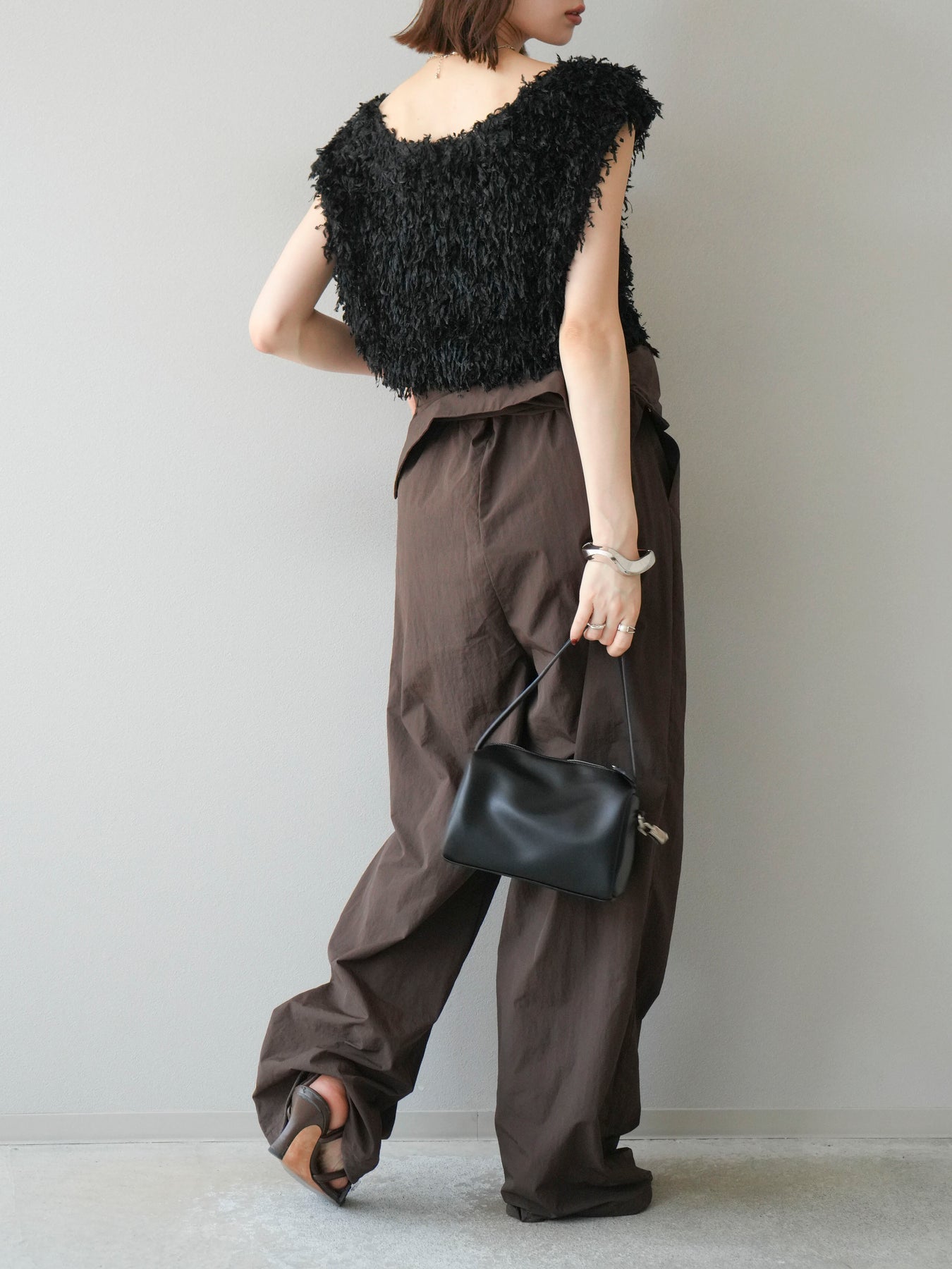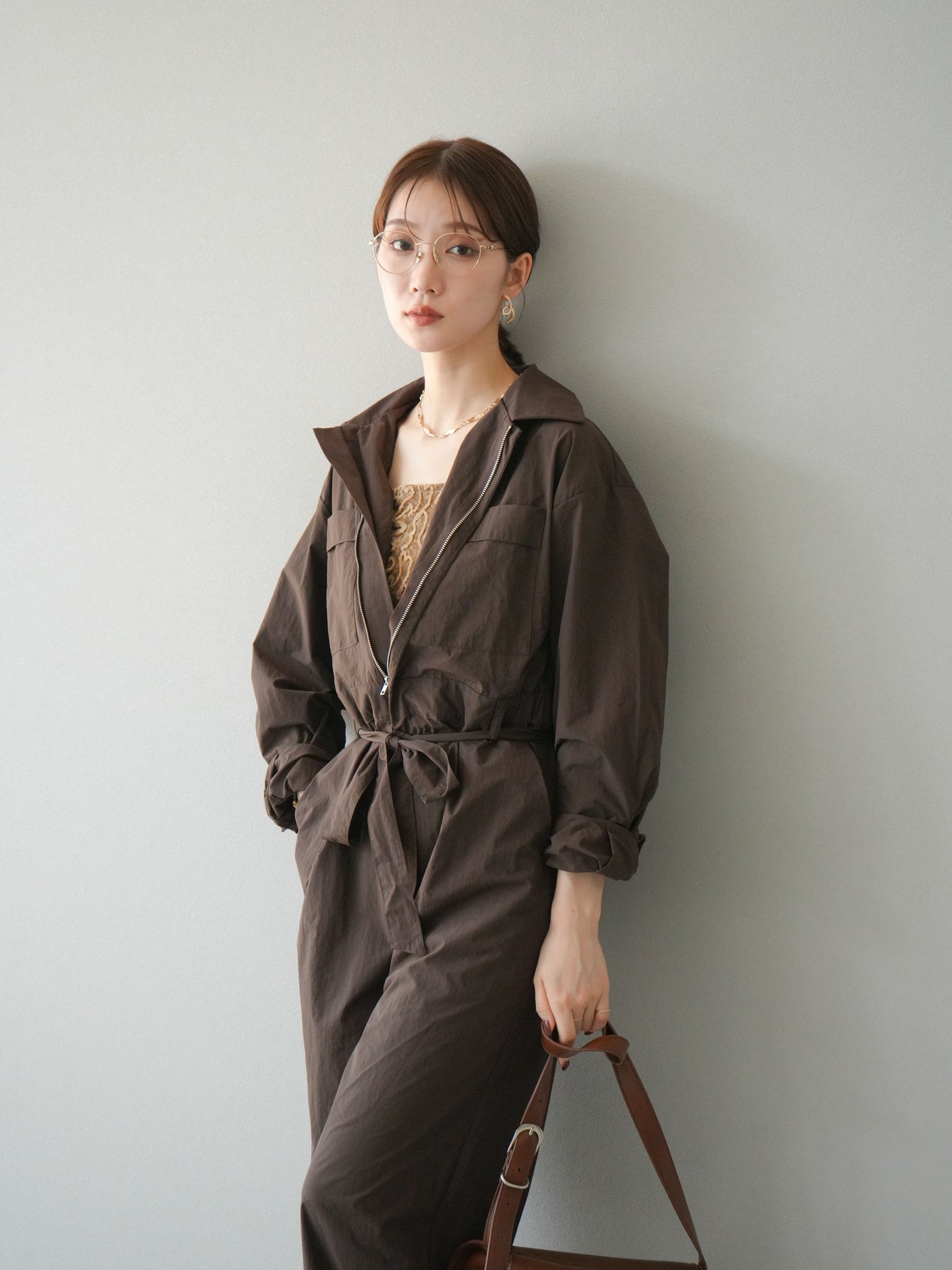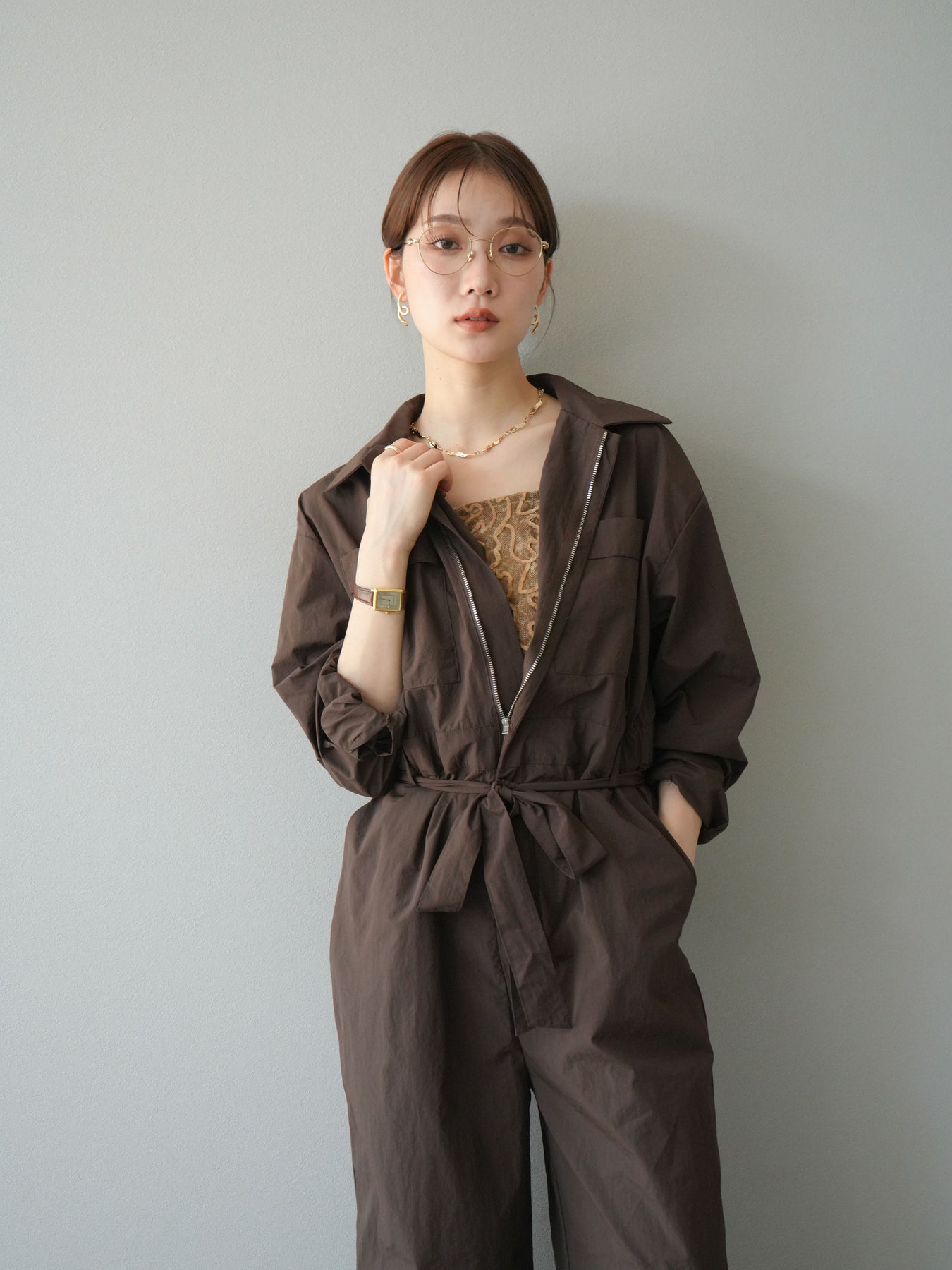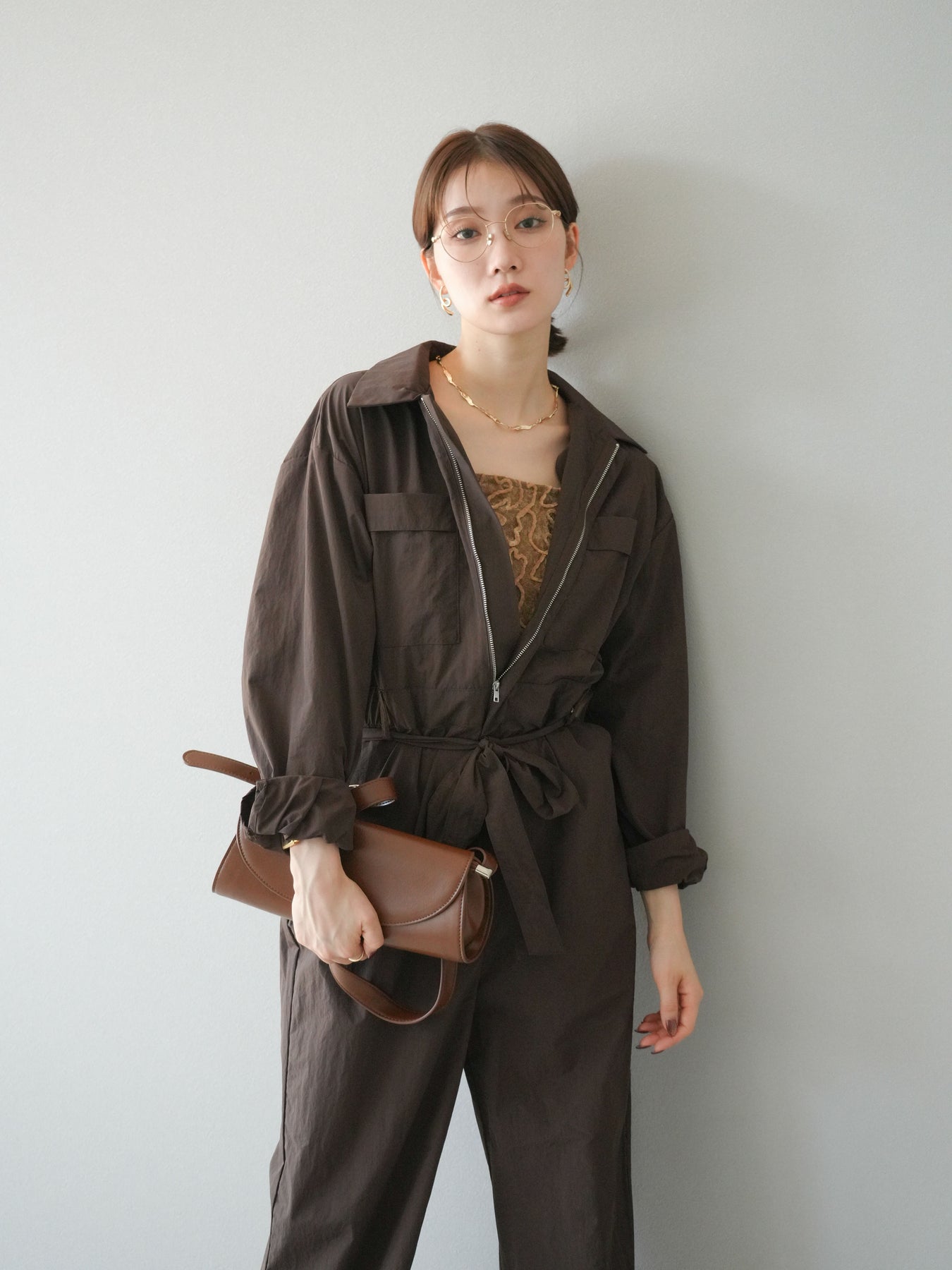 ミニマルなデザインとモード感を兼ね備えたナイロン素材のジャンプスーツ。 軽くしなやかな風合いで、ワイドなシルエットがこなれた印象を与えてくれます。 ウエストの共布ベルトでシルエットの調整も可能。 1枚でサマになる主役アイテムとして、デイリーにも旅行やお出かけにも活躍します。