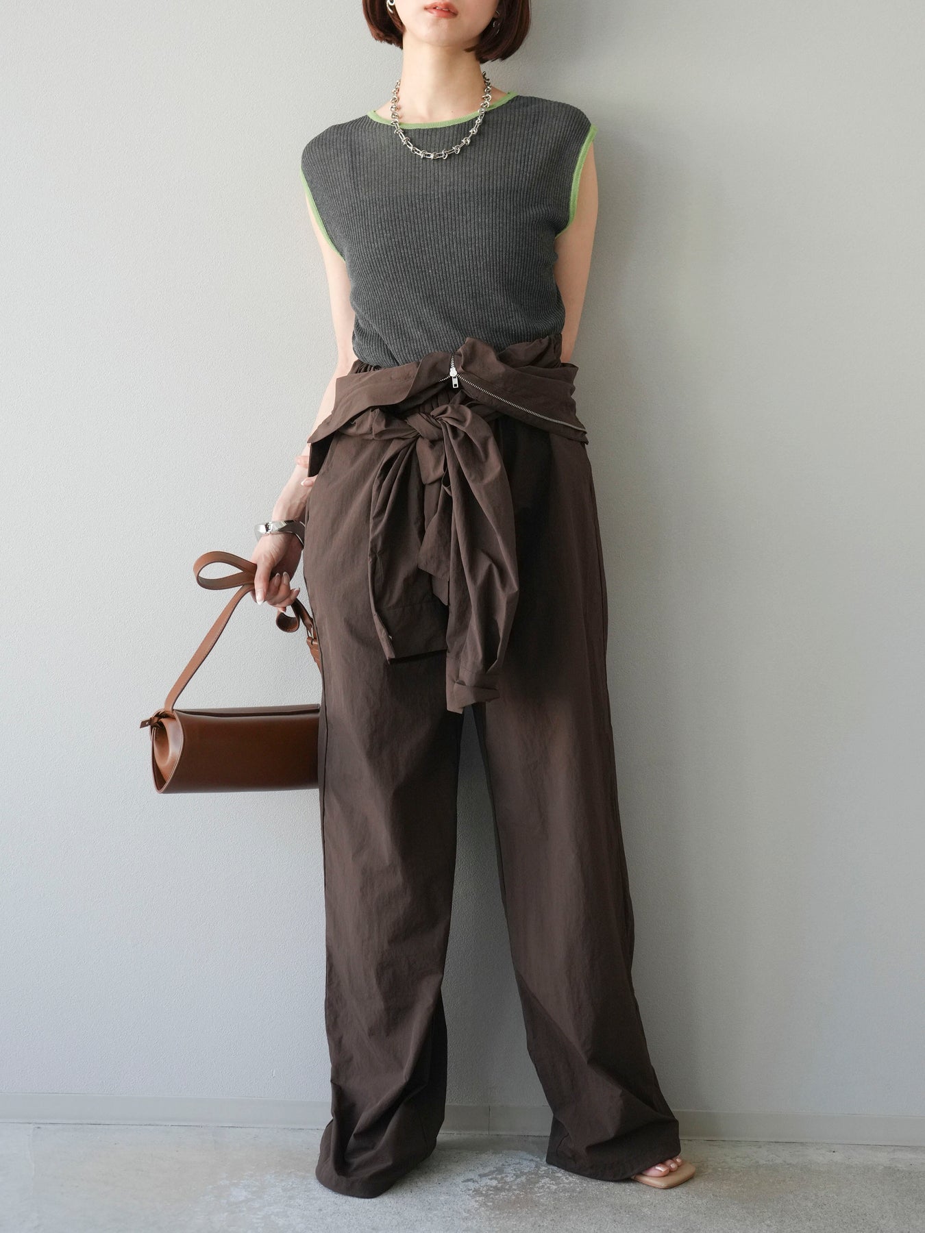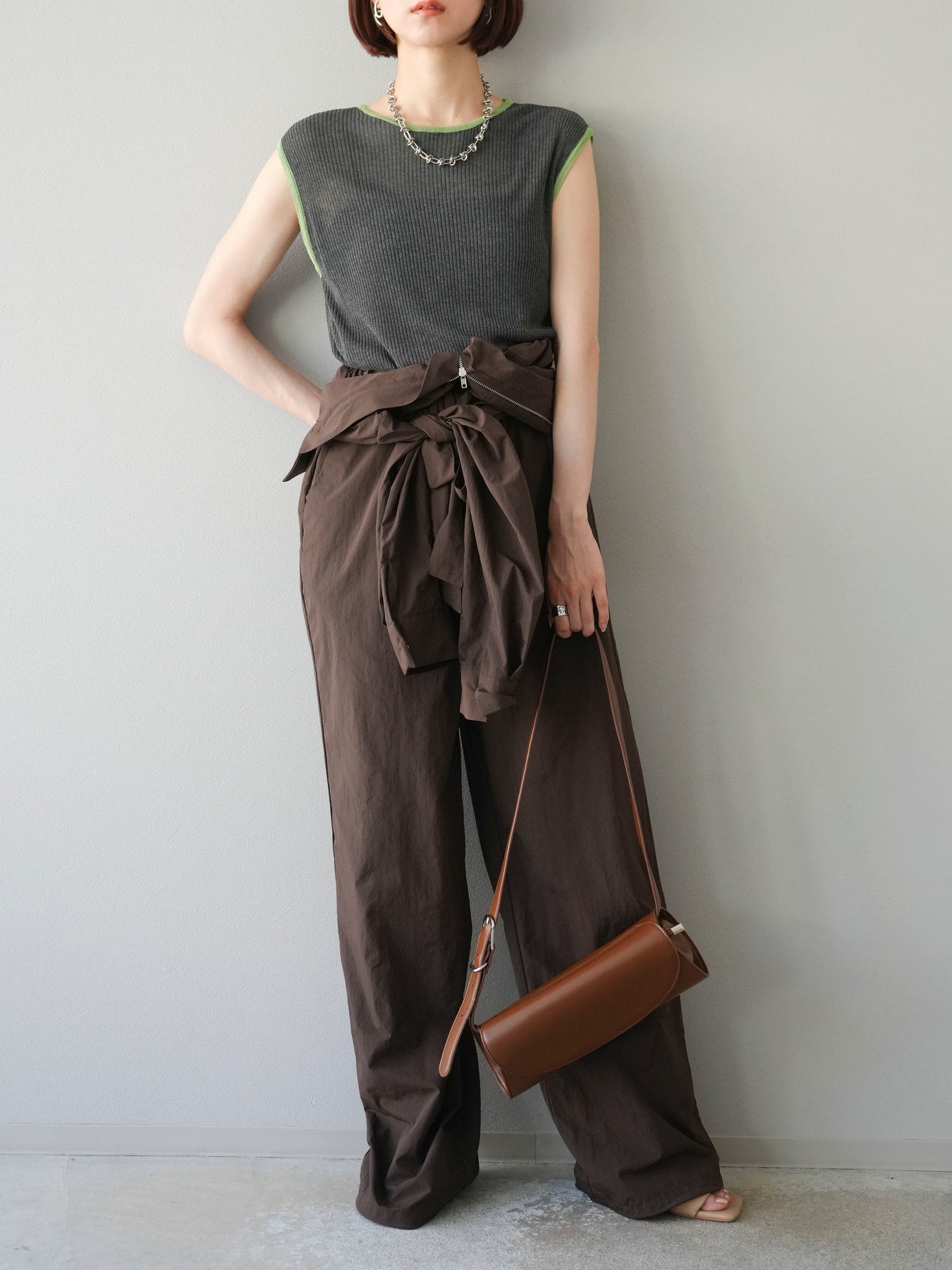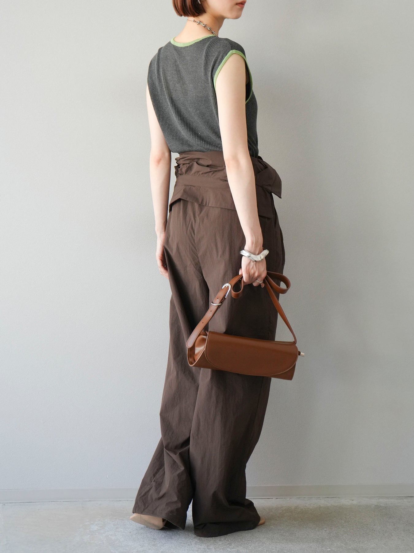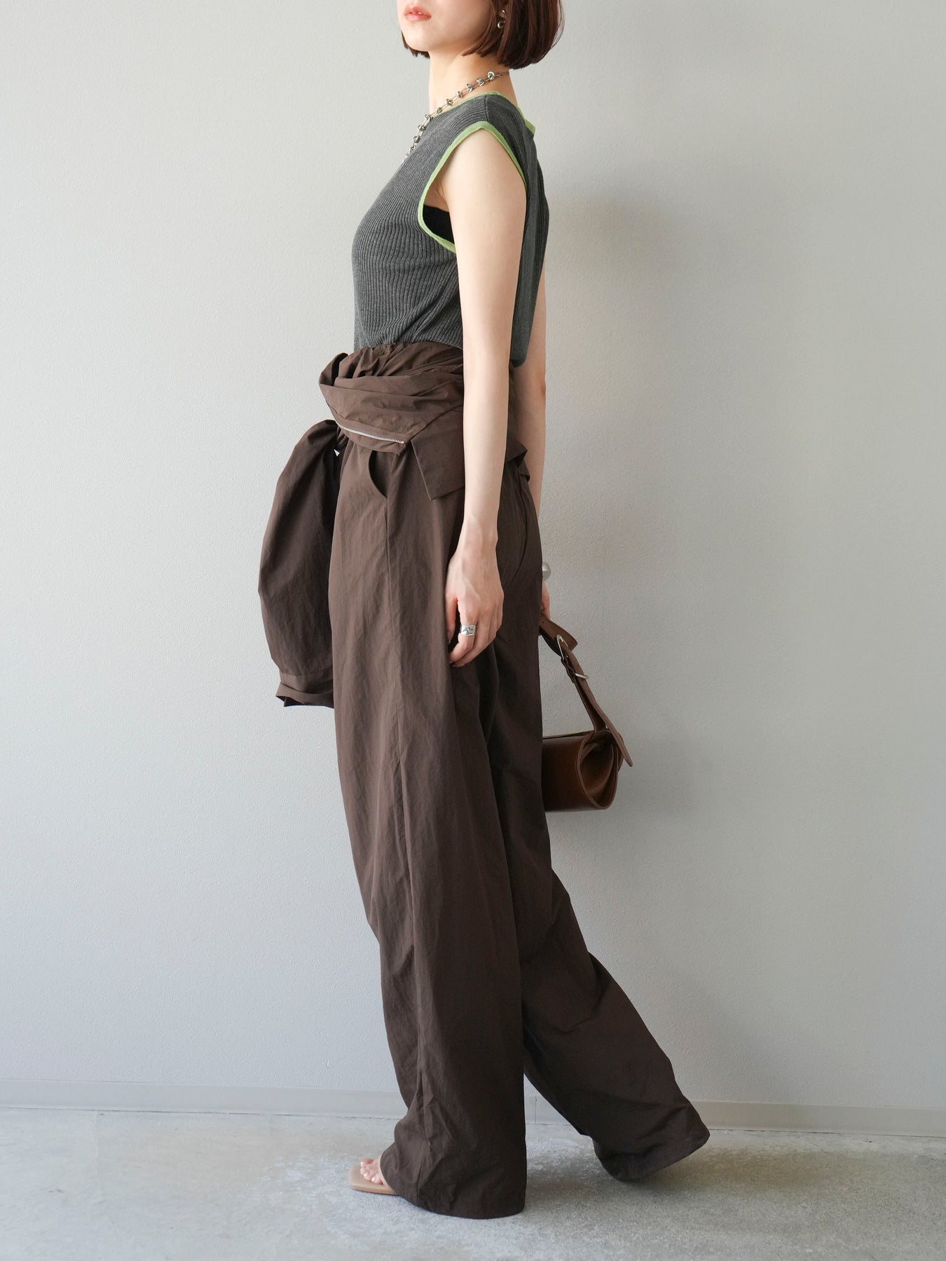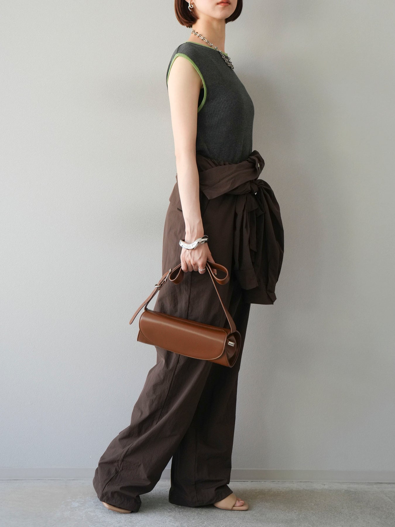 ミニマルなデザインとモード感を兼ね備えたナイロン素材のジャンプスーツ。 軽くしなやかな風合いで、ワイドなシルエットがこなれた印象を与えてくれます。 ウエストの共布ベルトでシルエットの調整も可能。 1枚でサマになる主役アイテムとして、デイリーにも旅行やお出かけにも活躍します。