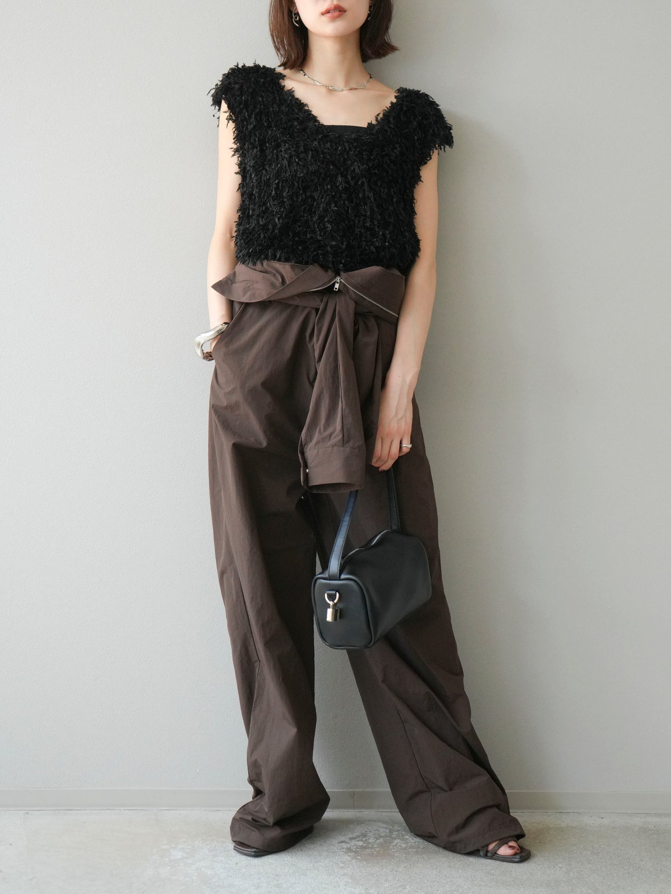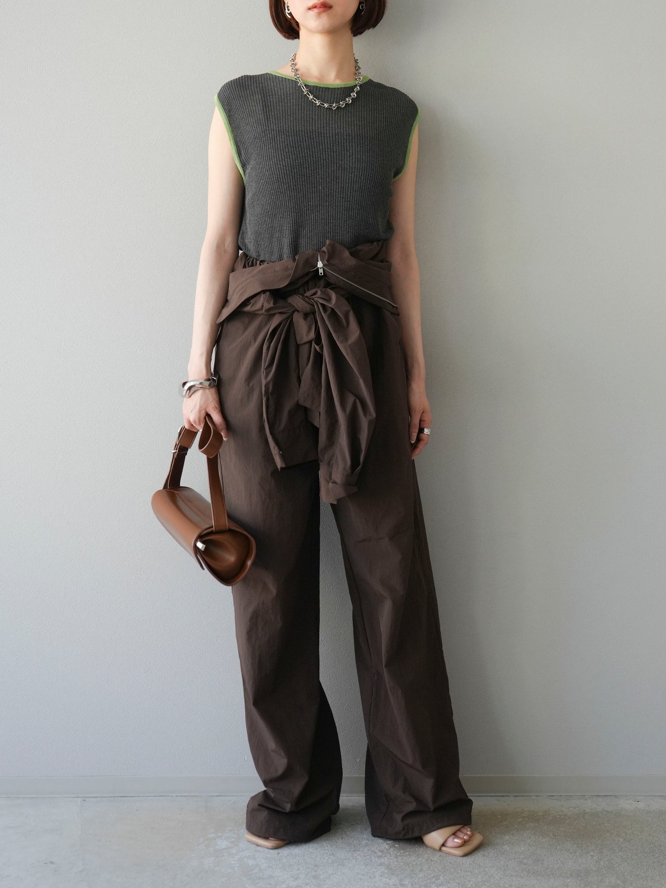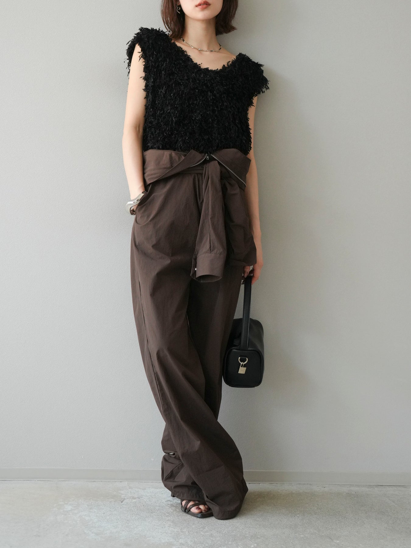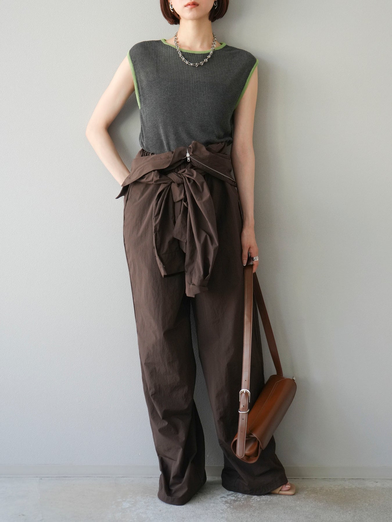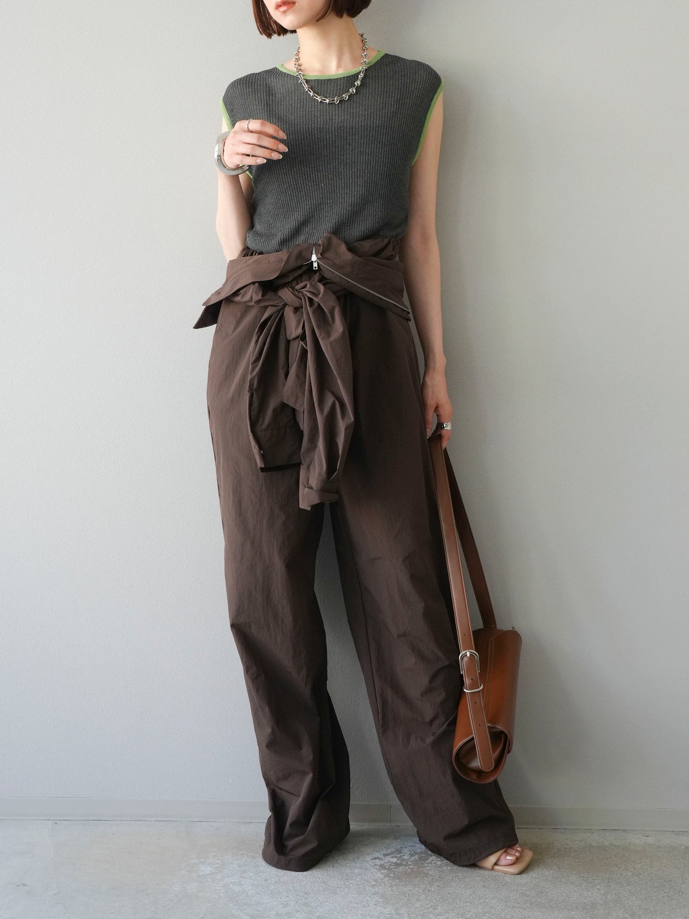 ミニマルなデザインとモード感を兼ね備えたナイロン素材のジャンプスーツ。 軽くしなやかな風合いで、ワイドなシルエットがこなれた印象を与えてくれます。 ウエストの共布ベルトでシルエットの調整も可能。 1枚でサマになる主役アイテムとして、デイリーにも旅行やお出かけにも活躍します。