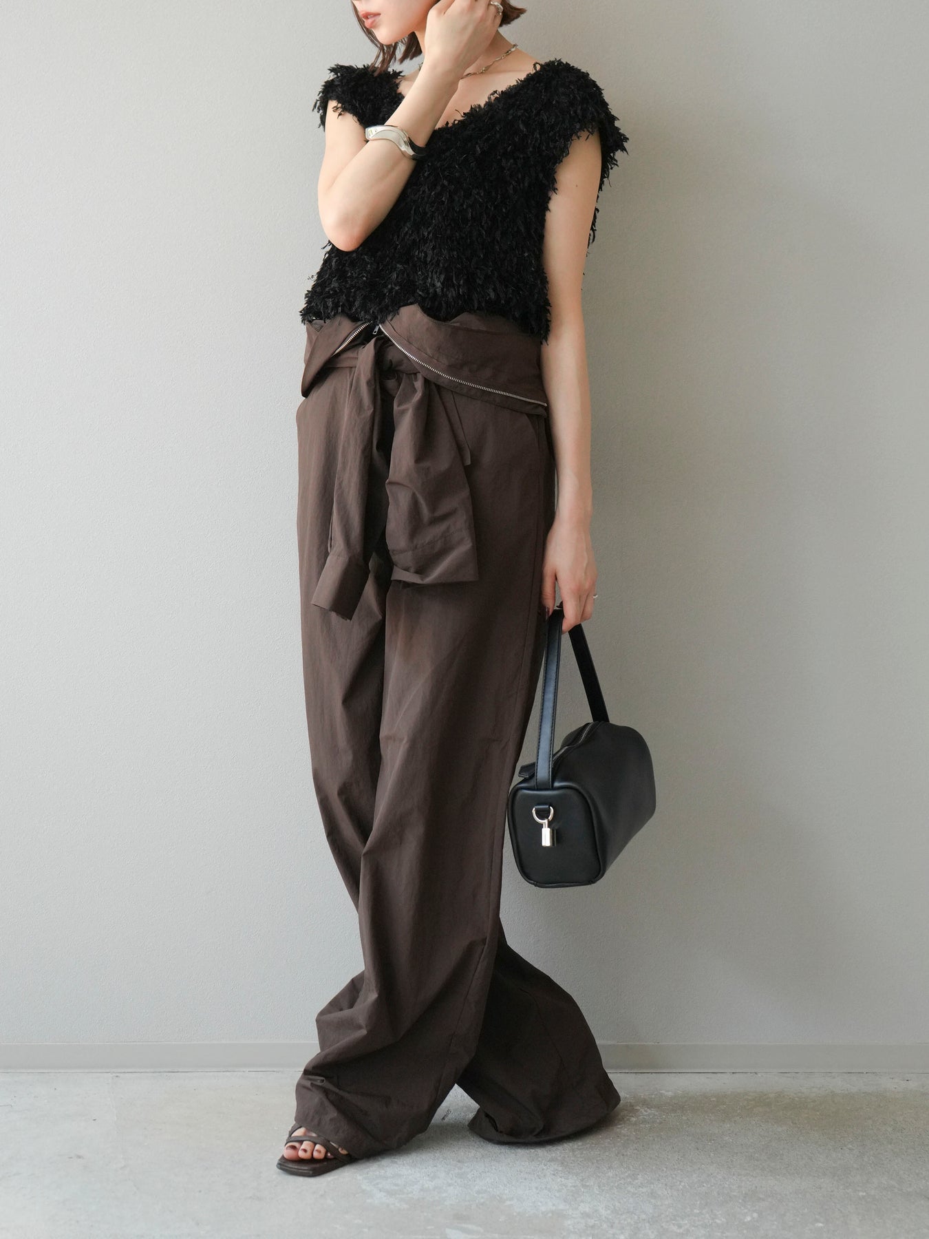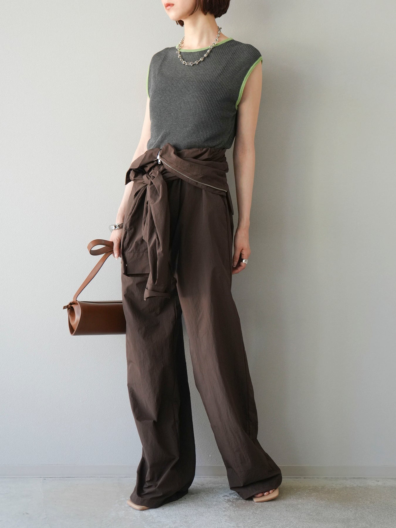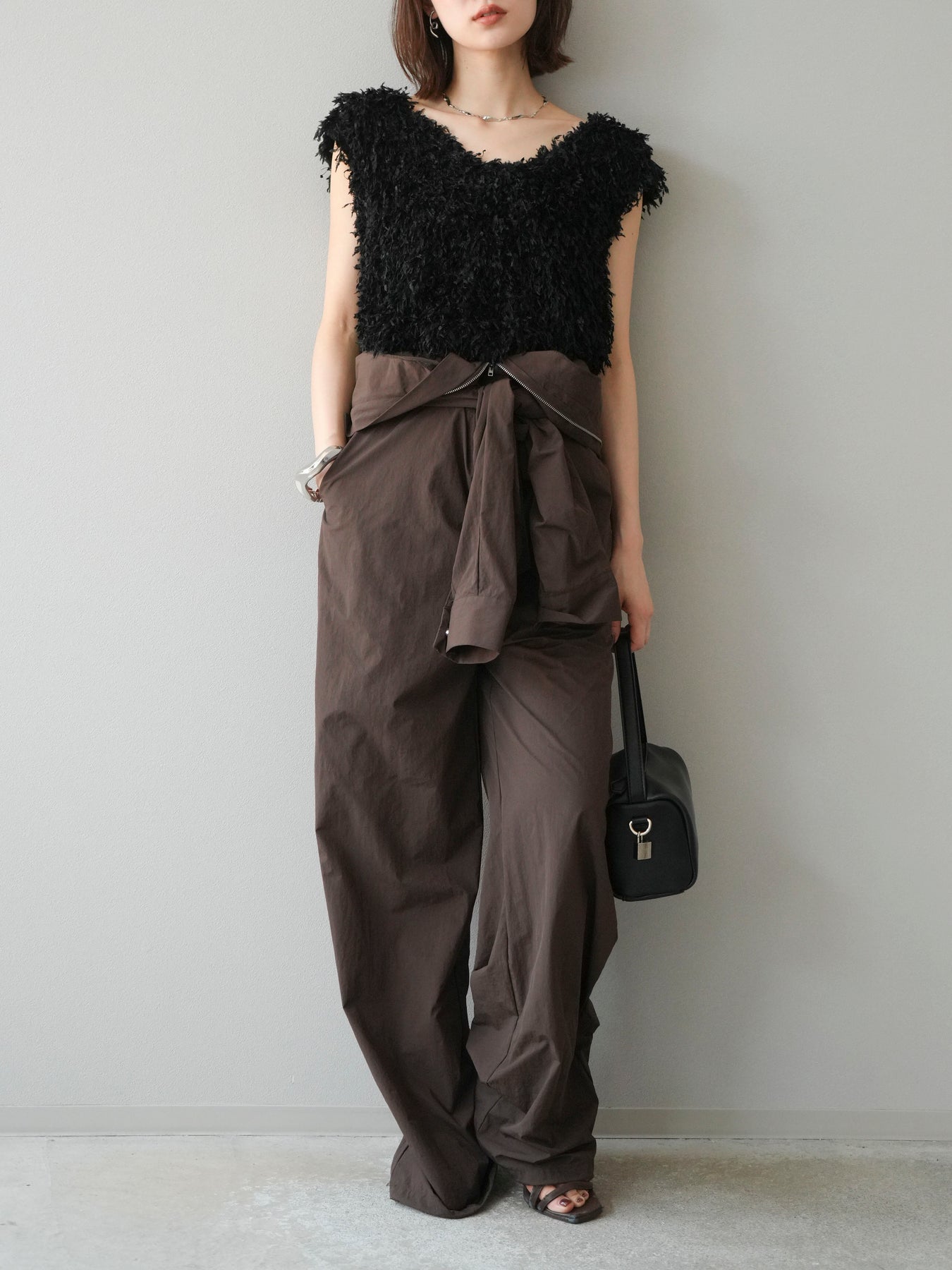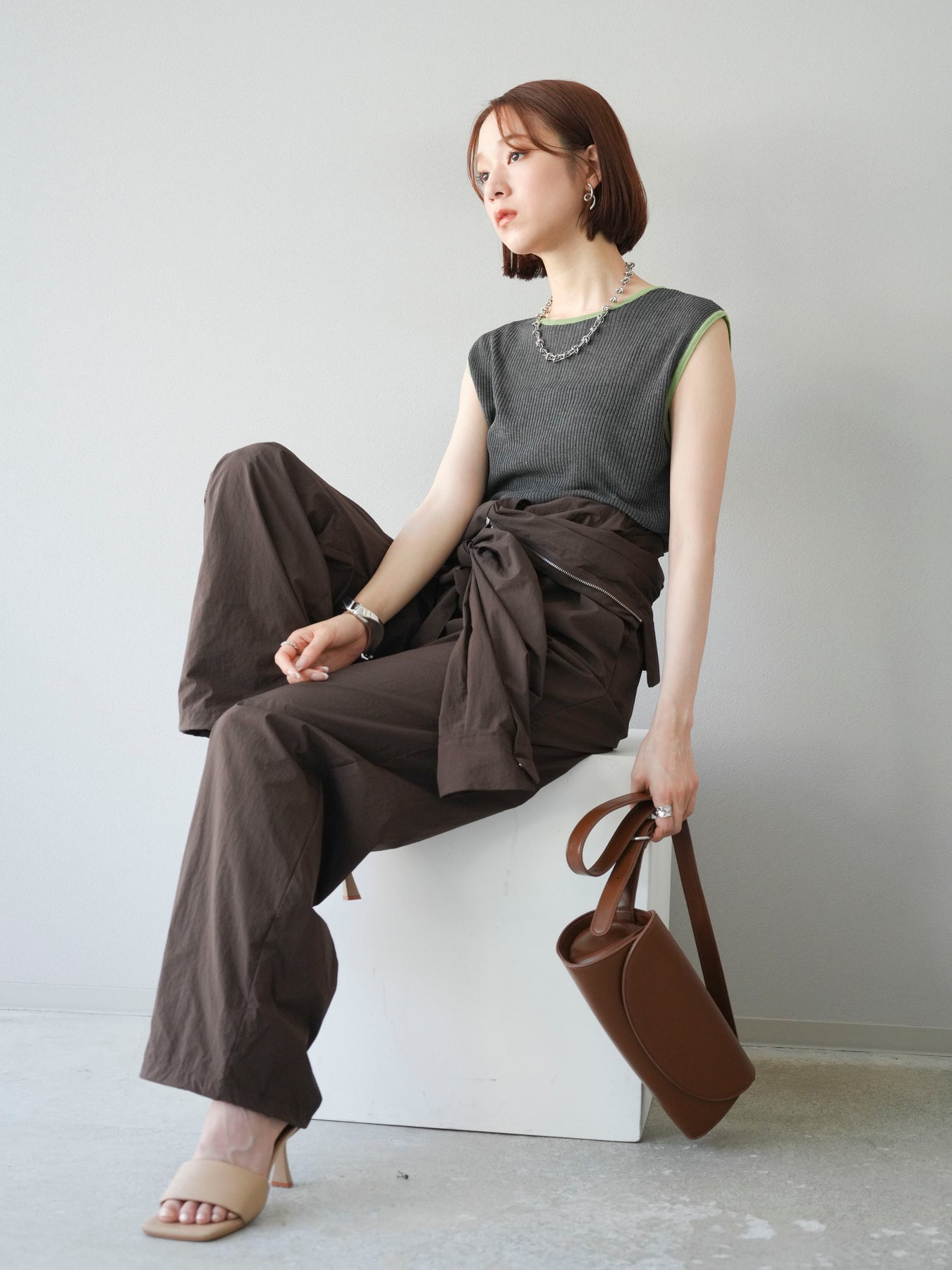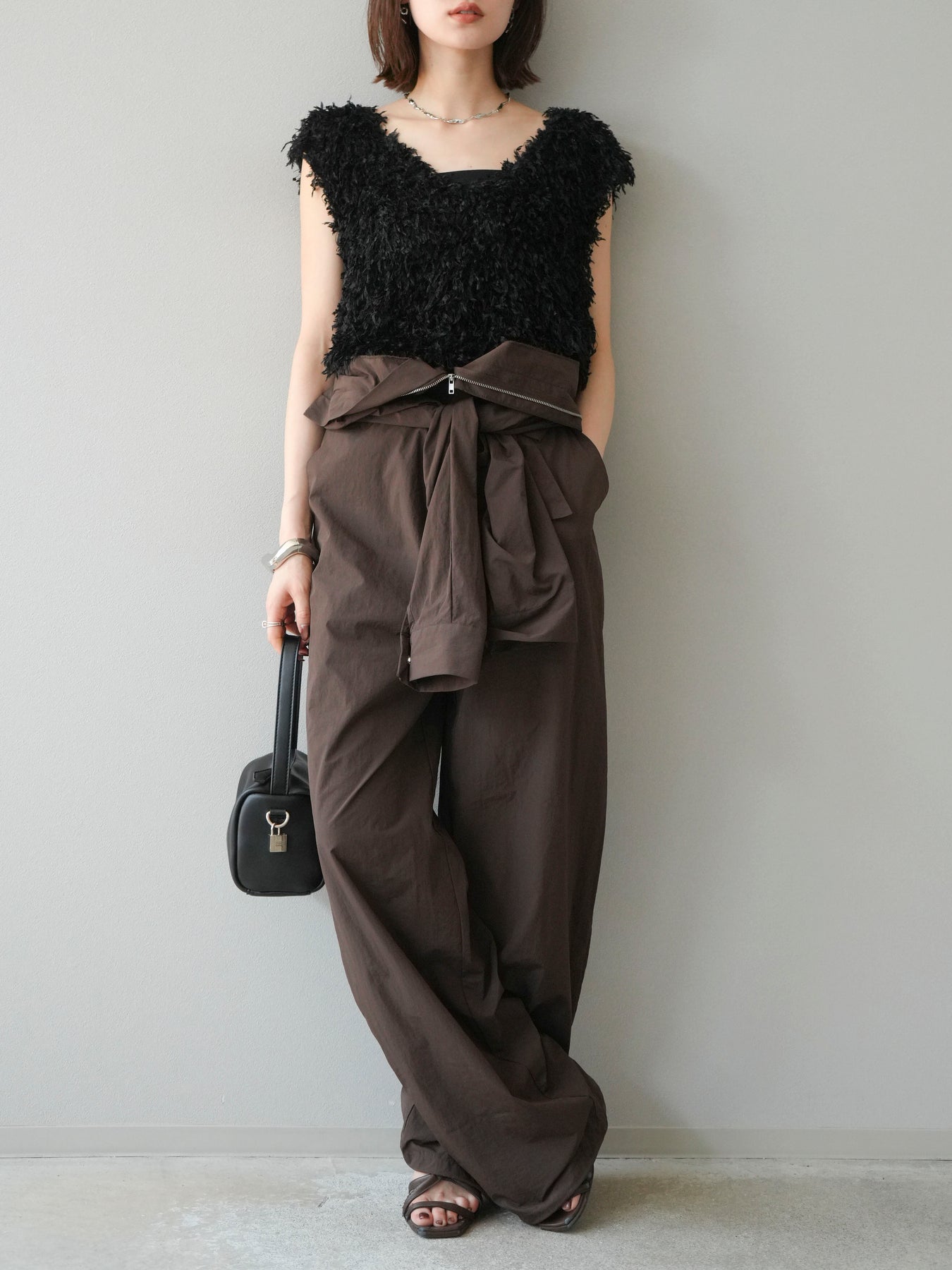 ミニマルなデザインとモード感を兼ね備えたナイロン素材のジャンプスーツ。 軽くしなやかな風合いで、ワイドなシルエットがこなれた印象を与えてくれます。 ウエストの共布ベルトでシルエットの調整も可能。 1枚でサマになる主役アイテムとして、デイリーにも旅行やお出かけにも活躍します。