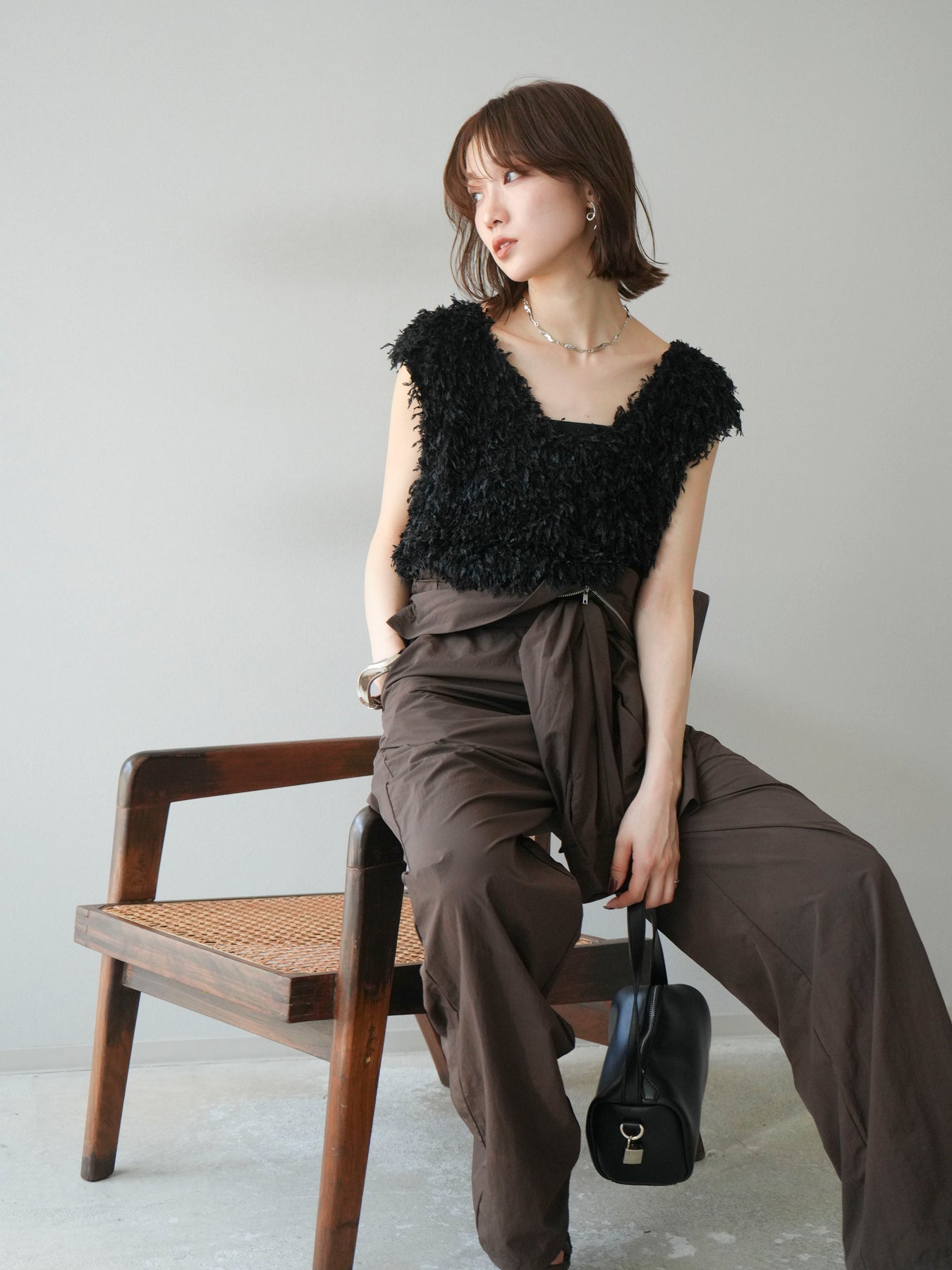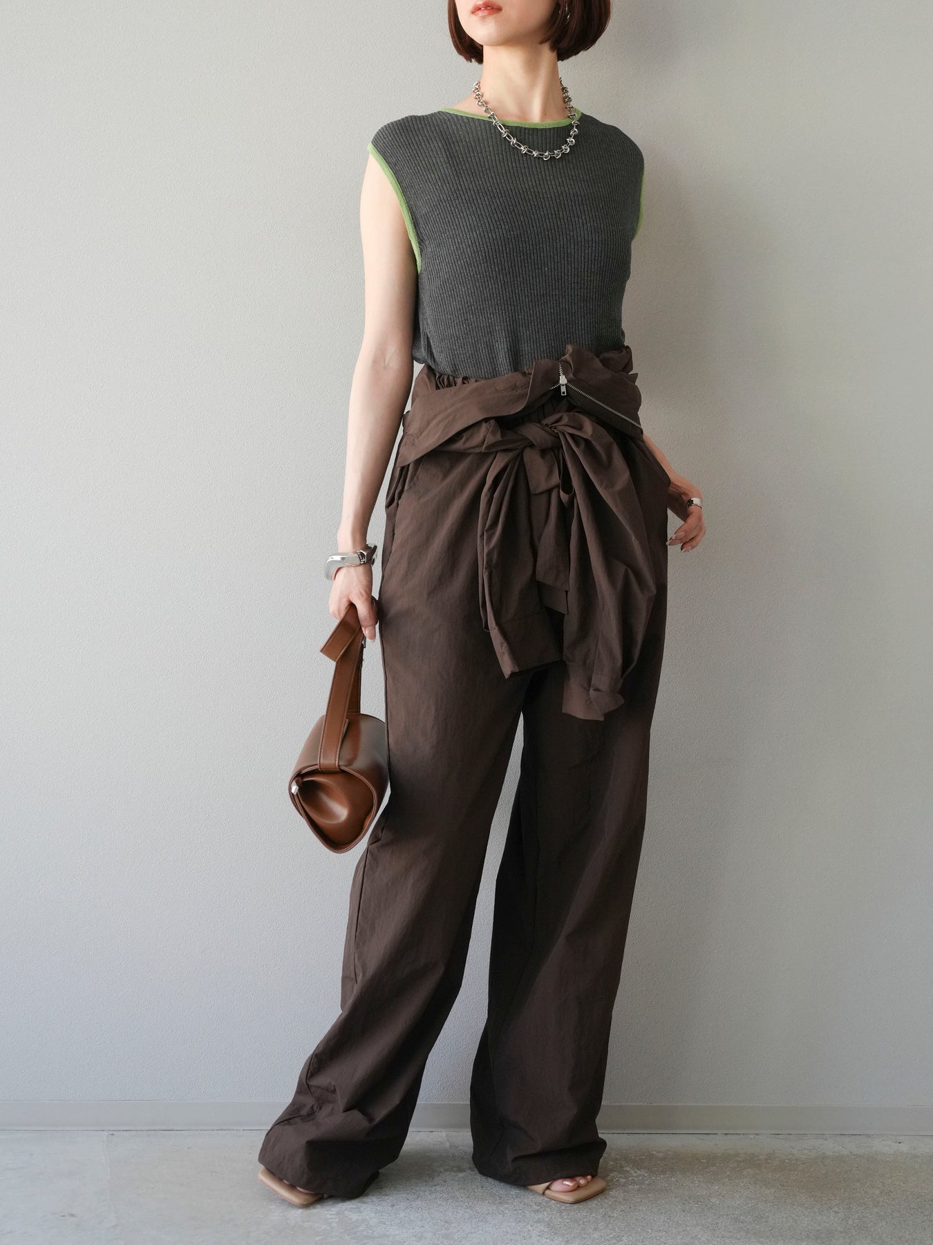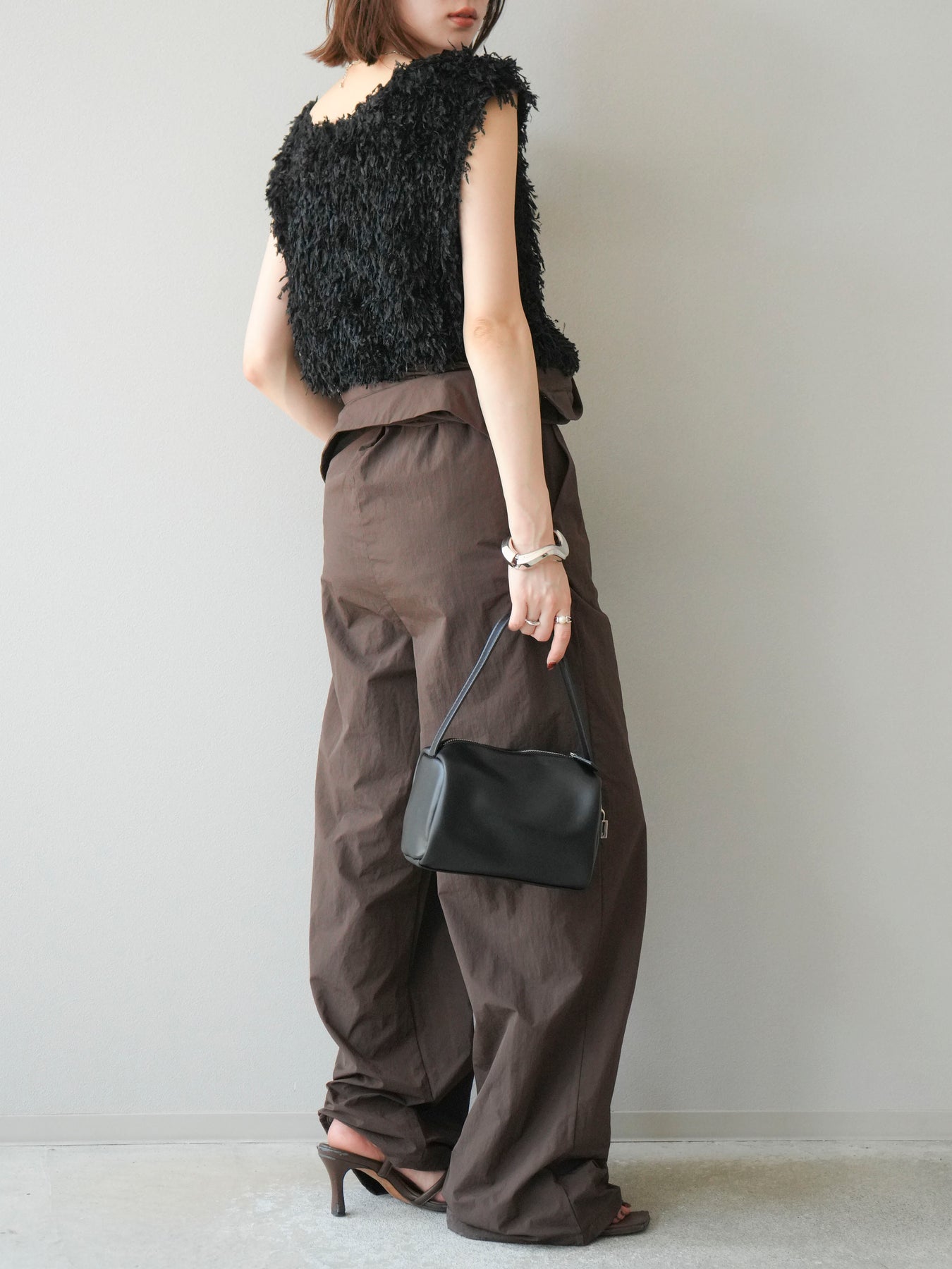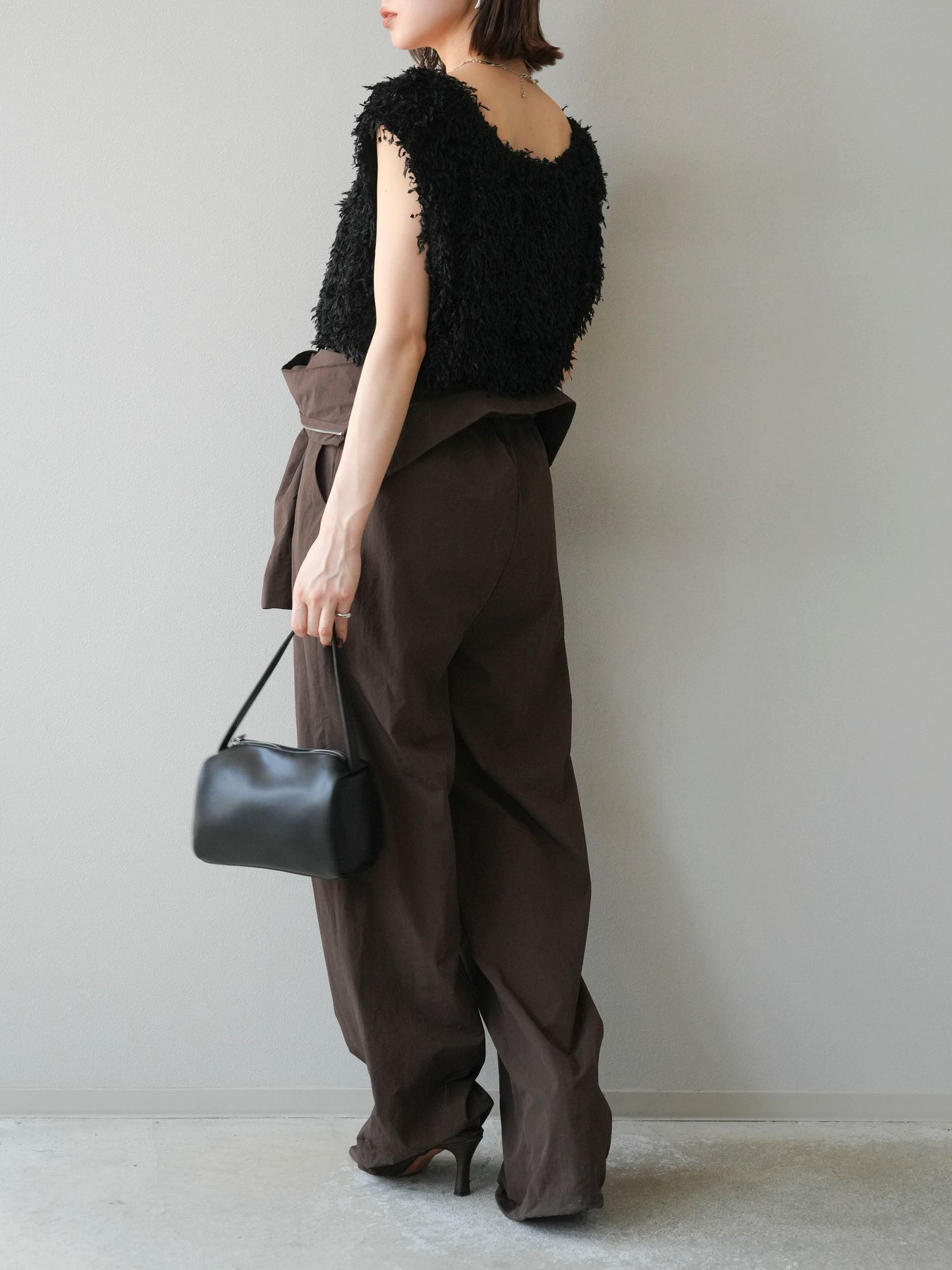 ミニマルなデザインとモード感を兼ね備えたナイロン素材のジャンプスーツ。 軽くしなやかな風合いで、ワイドなシルエットがこなれた印象を与えてくれます。 ウエストの共布ベルトでシルエットの調整も可能。 1枚でサマになる主役アイテムとして、デイリーにも旅行やお出かけにも活躍します。