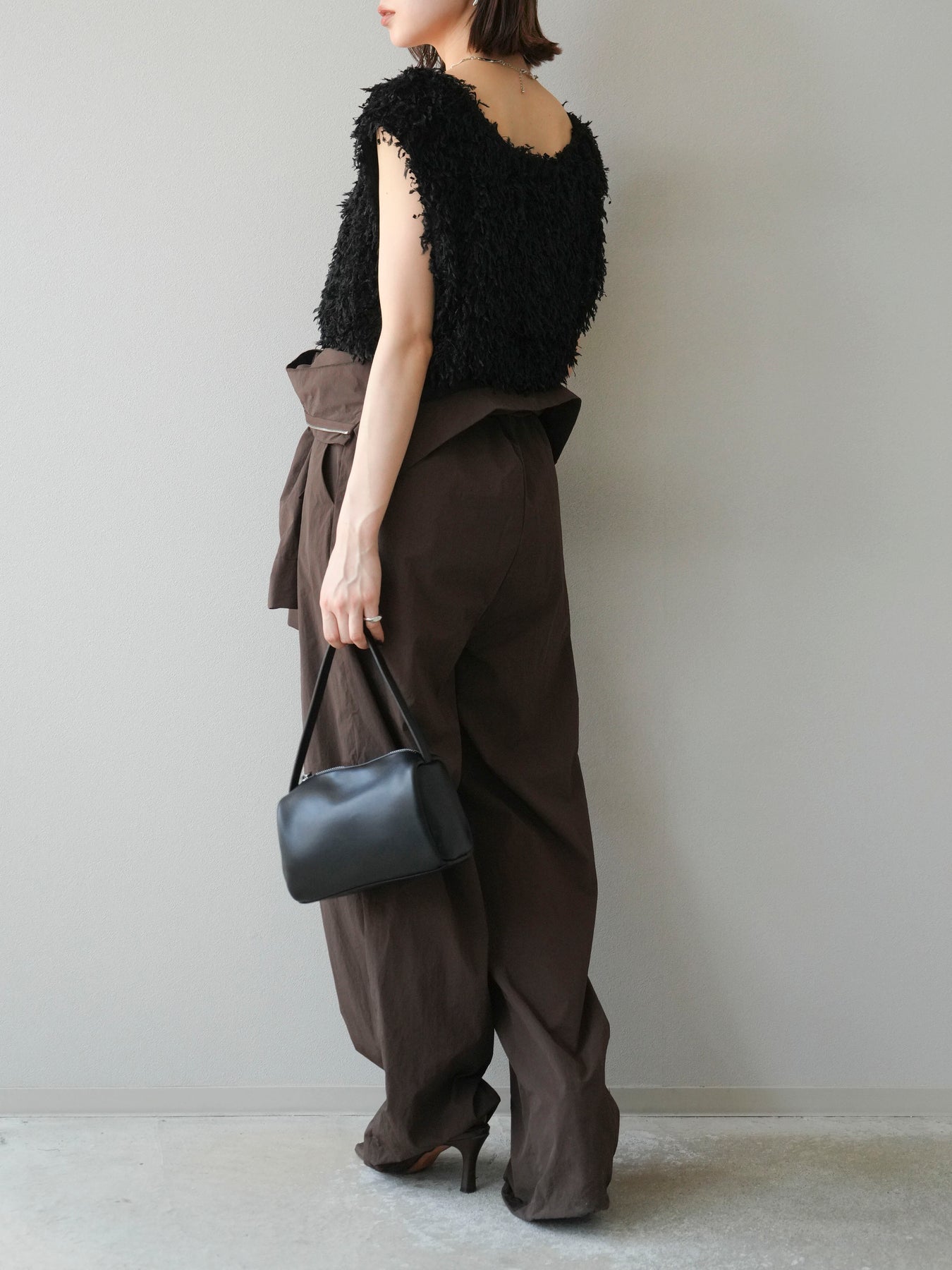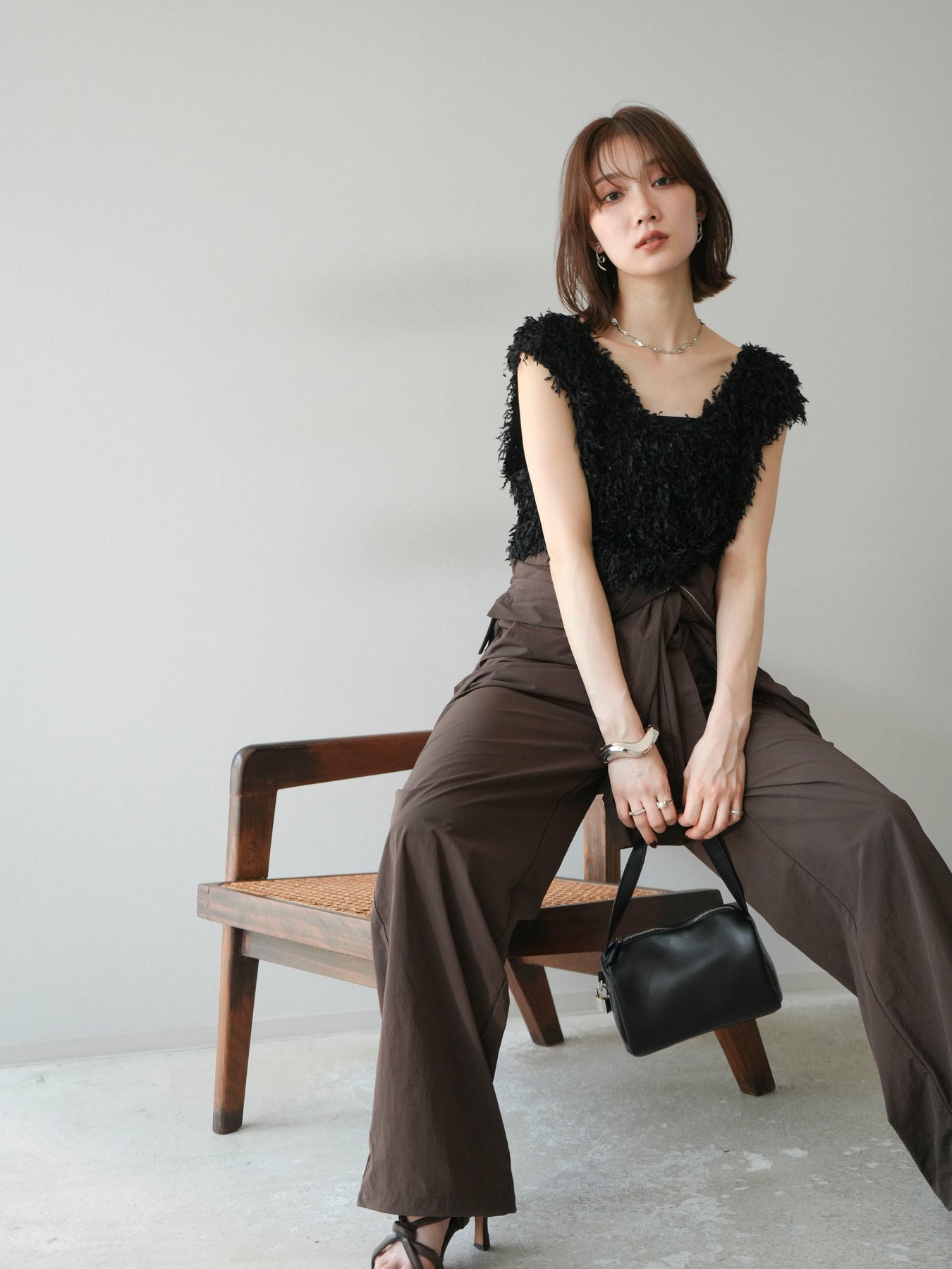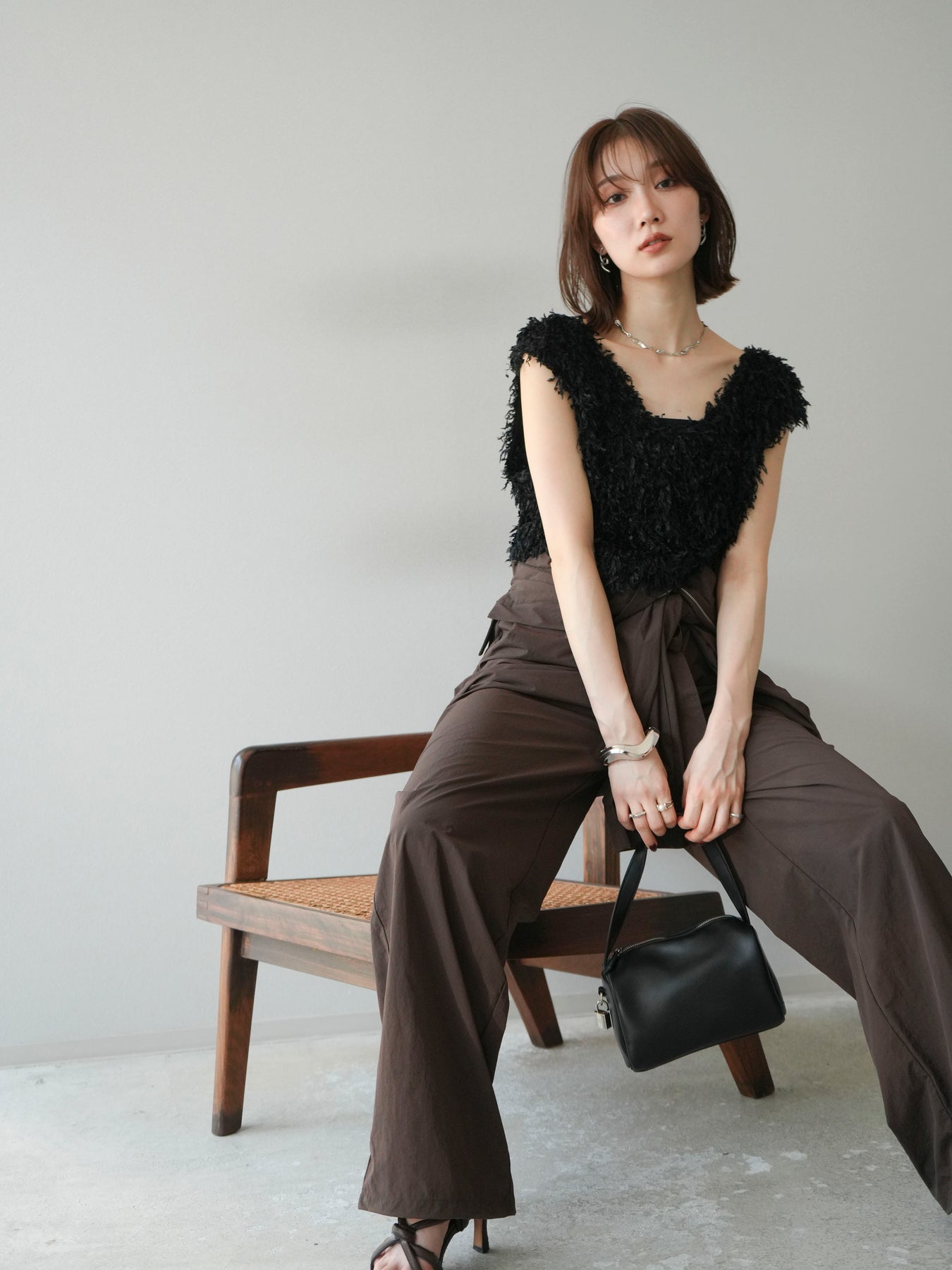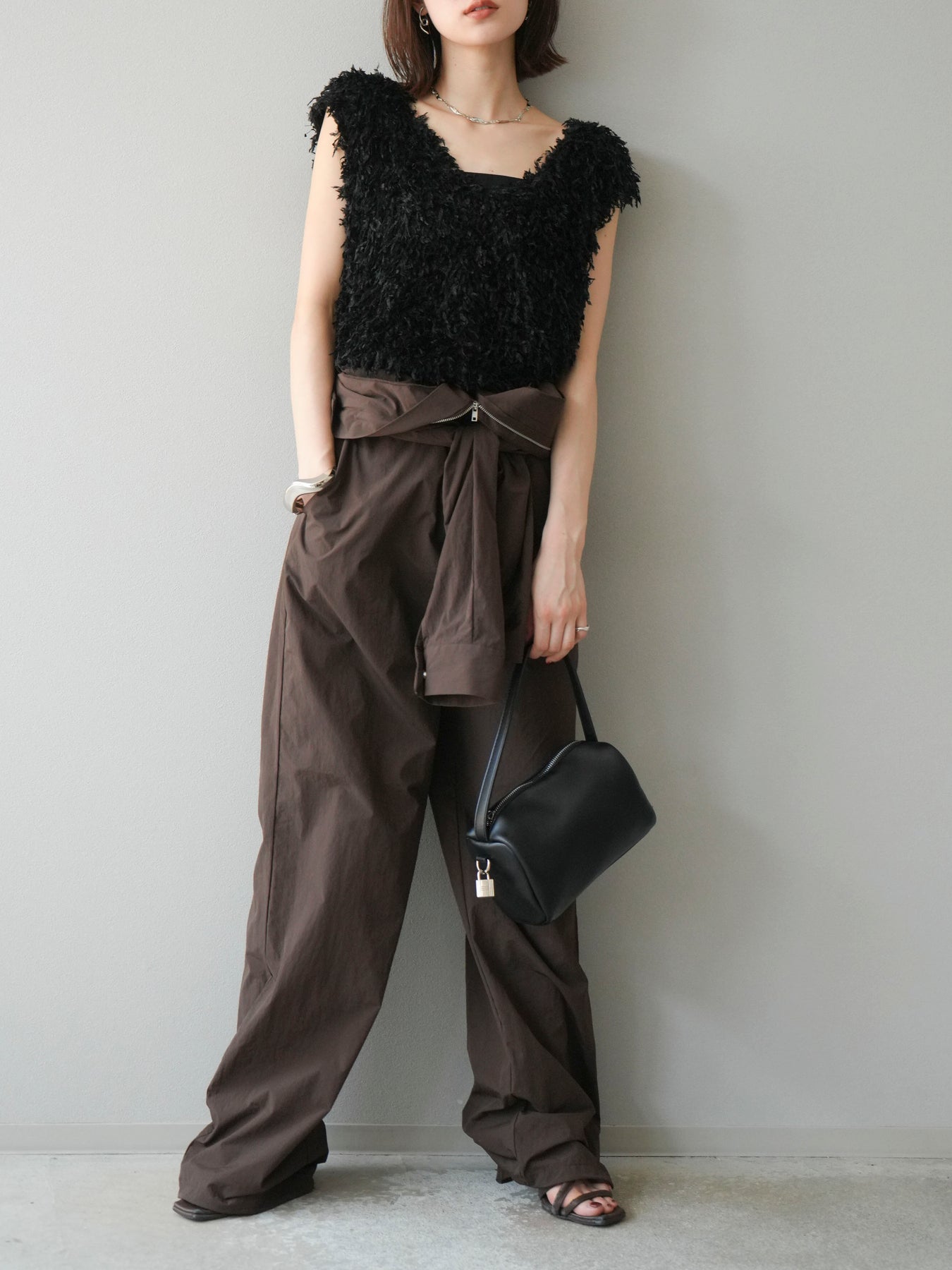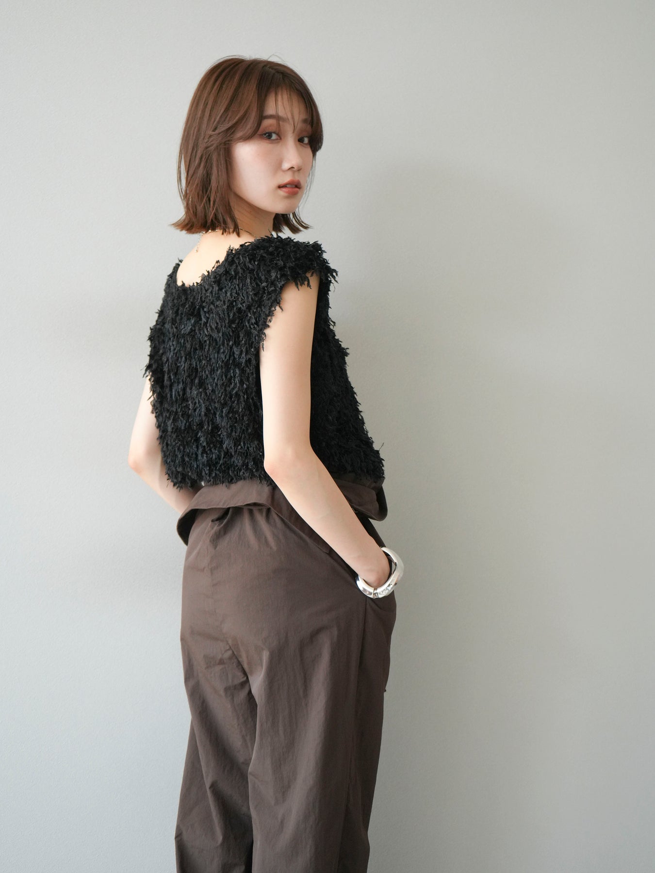 ・お手入れ方法:手洗い水温30℃以下、おしゃれ着用液体洗剤または中性洗剤のご使用をお薦めします。素材の特性上、洗濯の際に色落ちが生じる恐れがありますので単独で・短時間でのお洗濯をお薦めします。洗濯後は形を整えてから陰干ししてください。アイロンはご使用いただけません。※タンブラー乾燥は控え、色物とは分けてください。濡れたままの状態で擦れると、色落ち色移りすることがあります。つけ置き洗いや雨や汗で濡れたまま放置は避け、速やかに処理してください。着用中の摩擦や汗、水濡れ、濃淡差があるものとの重ね着にご注意ください。