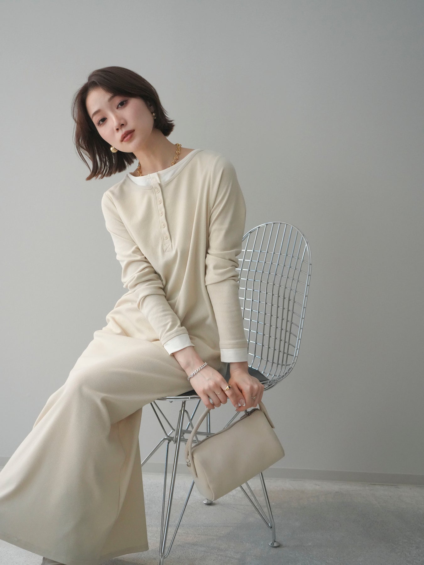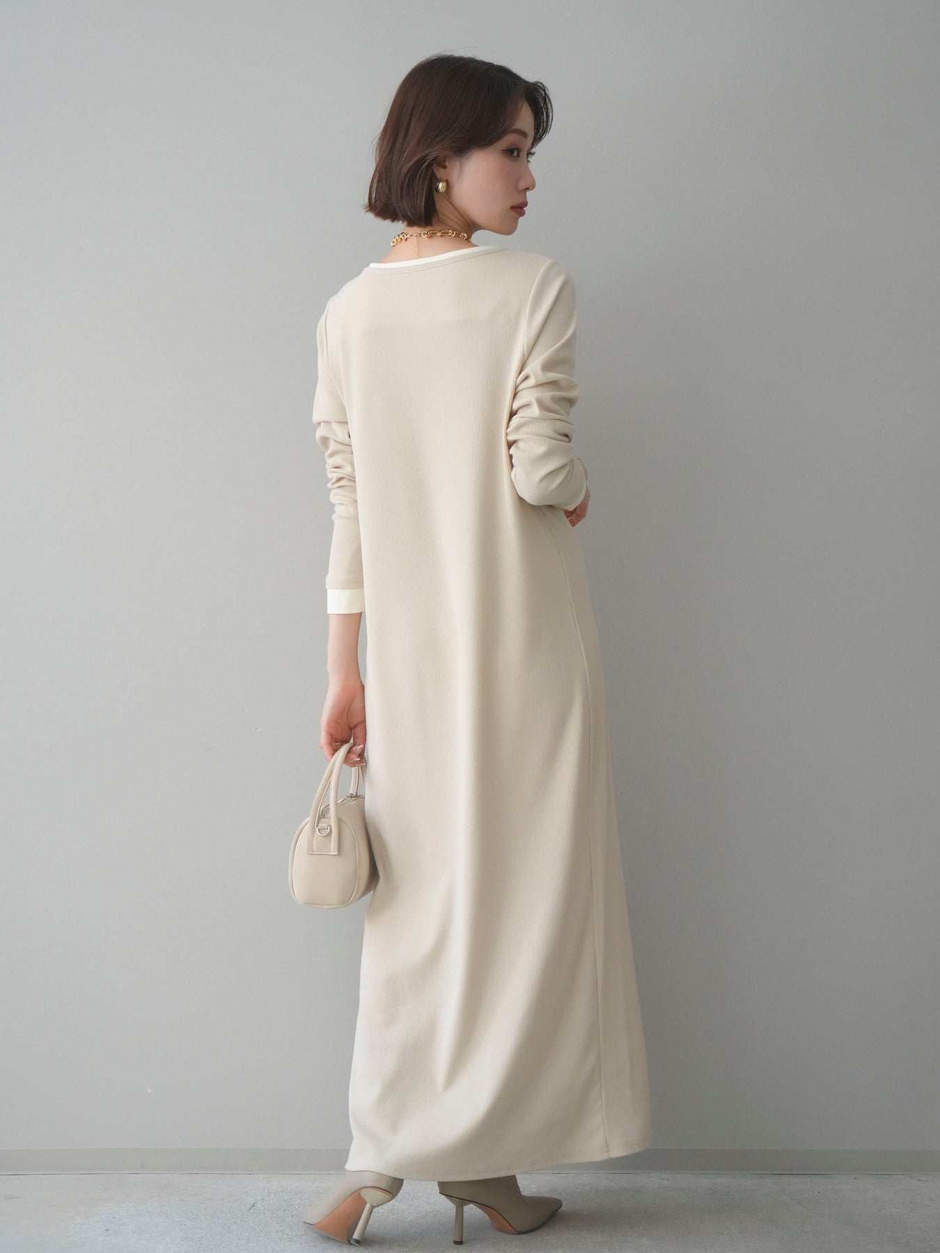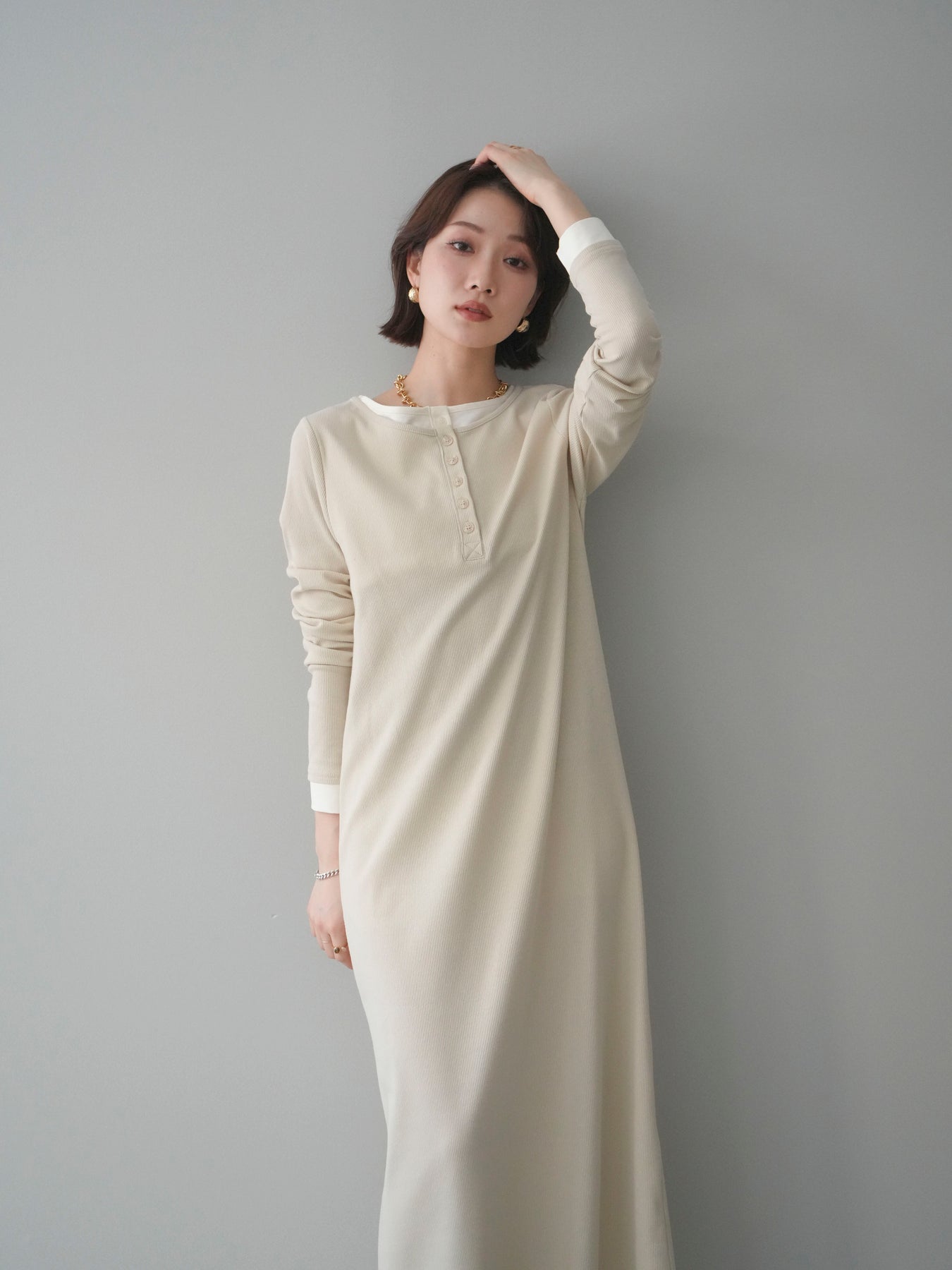 [予約]配色レイヤードヘンリーネックカットリブワンピース/ivory