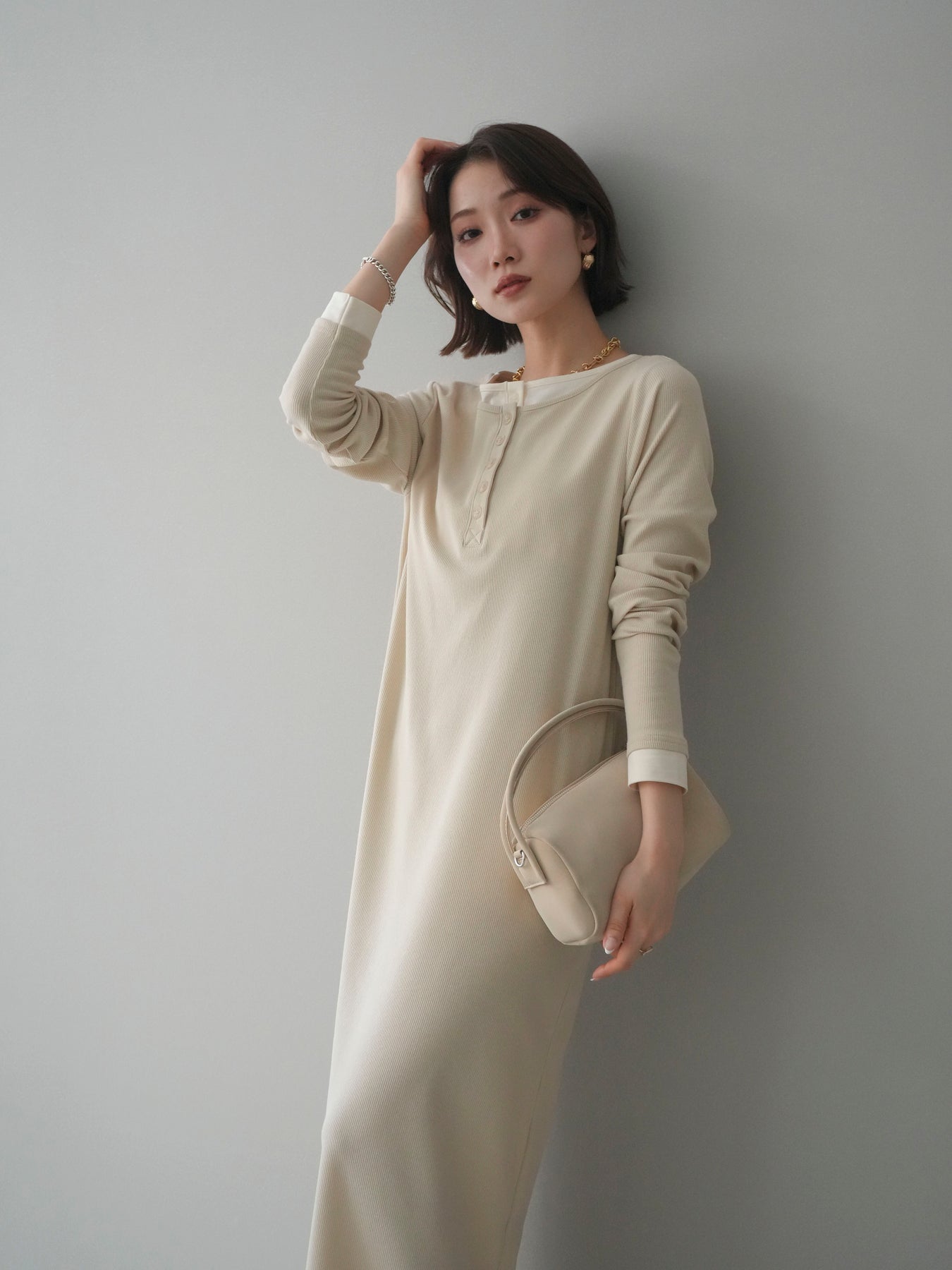 配色デザインを効かせたレイヤード風のヘンリーネックカットリブワンピース。 首元と袖口に覗くコントラストが、シンプルな中にさりげないアクセントを添えています。 程よく身体に沿うリブ素材は、縦ラインを強調し、すっきりとした印象に。 フロントのヘンリーネックデザインが抜け感を生み、ボタンの開け閉めで表情の変化も楽しめます。 一枚でスタイルが完成し、シューズや小物次第で雰囲気を切り替えられる、着回し力の高い一着です。 ※ボトムス、キャミソール(インナー)以外の商品は一律でインナーは付属していません。