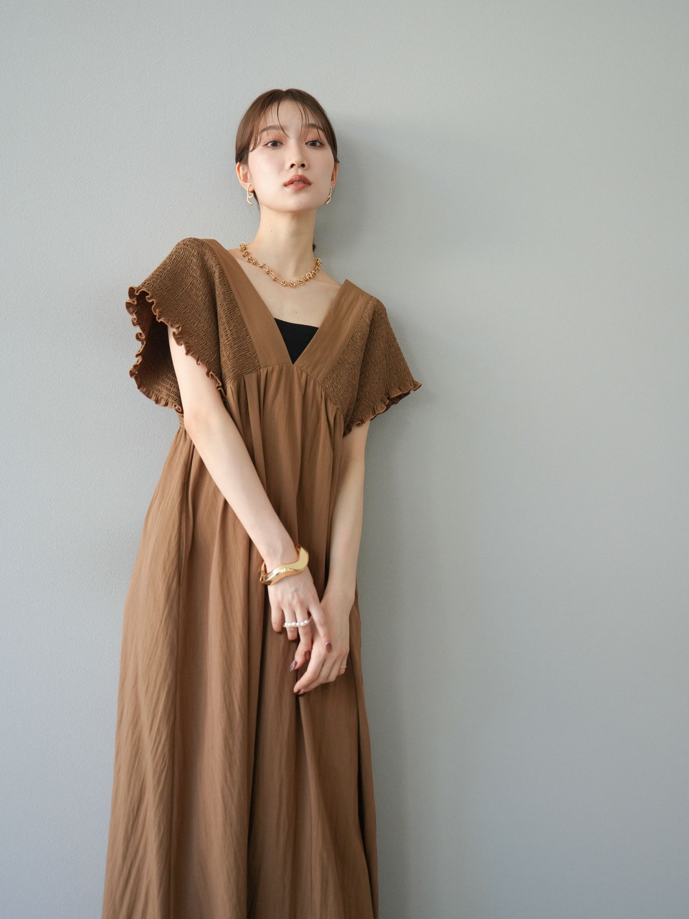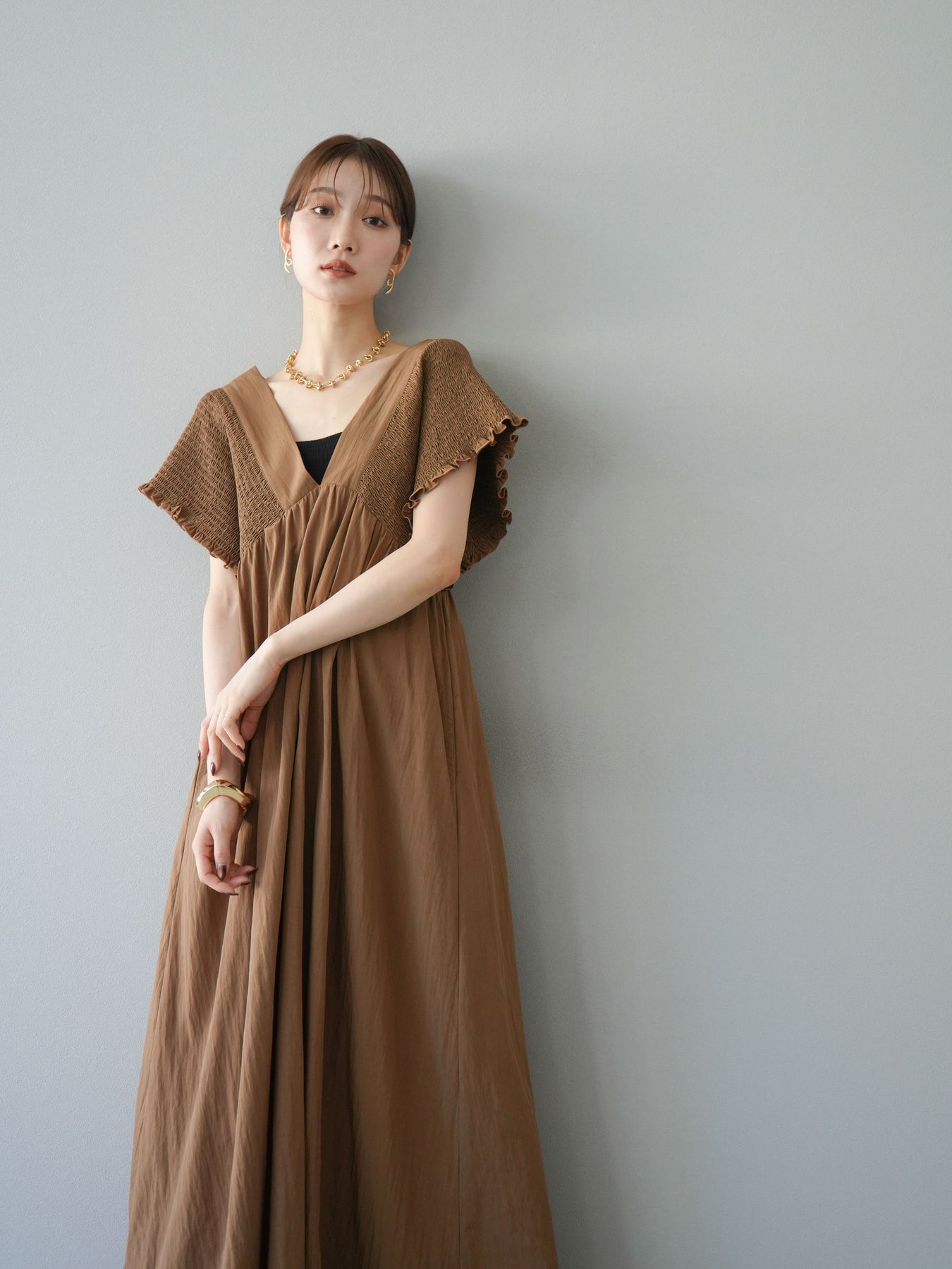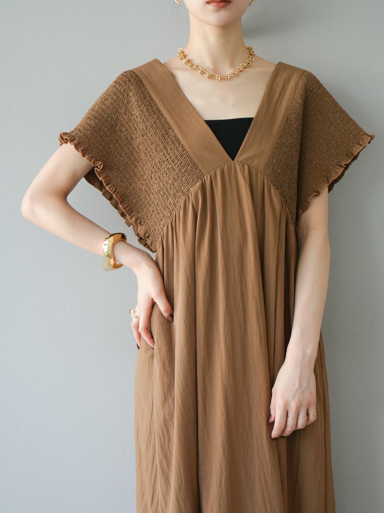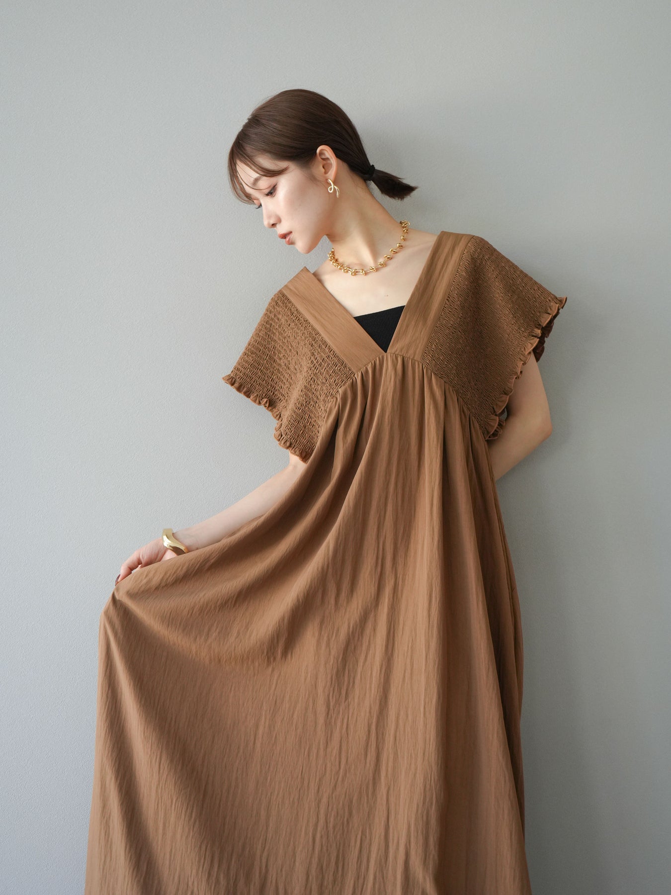 褶皺連身裙,輪廓柔和流暢。衣身採用大面積褶皺設計,打造貼身立體感。 V領設計凸顯肩膀曲線,包覆肩膀的荷葉邊袖口更添女性魅力。輕盈柔滑的布料即使單穿也能展現精緻優雅的氣質。無論是日常穿著,還是度假或休閒出遊,都值得推薦。 *除下裝和吊帶背心(內衣)外,其他商品均不含內衣。