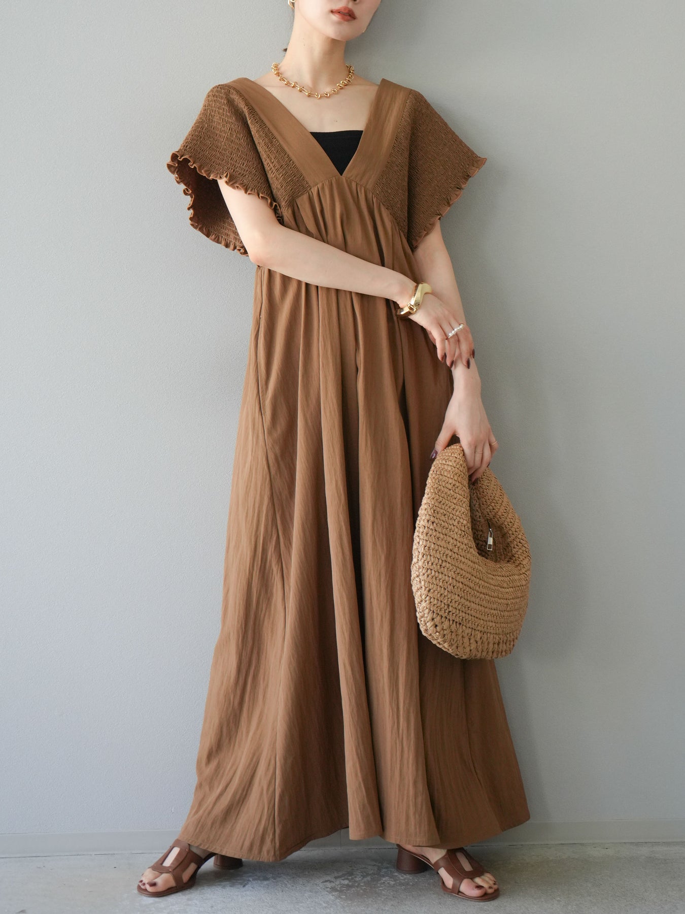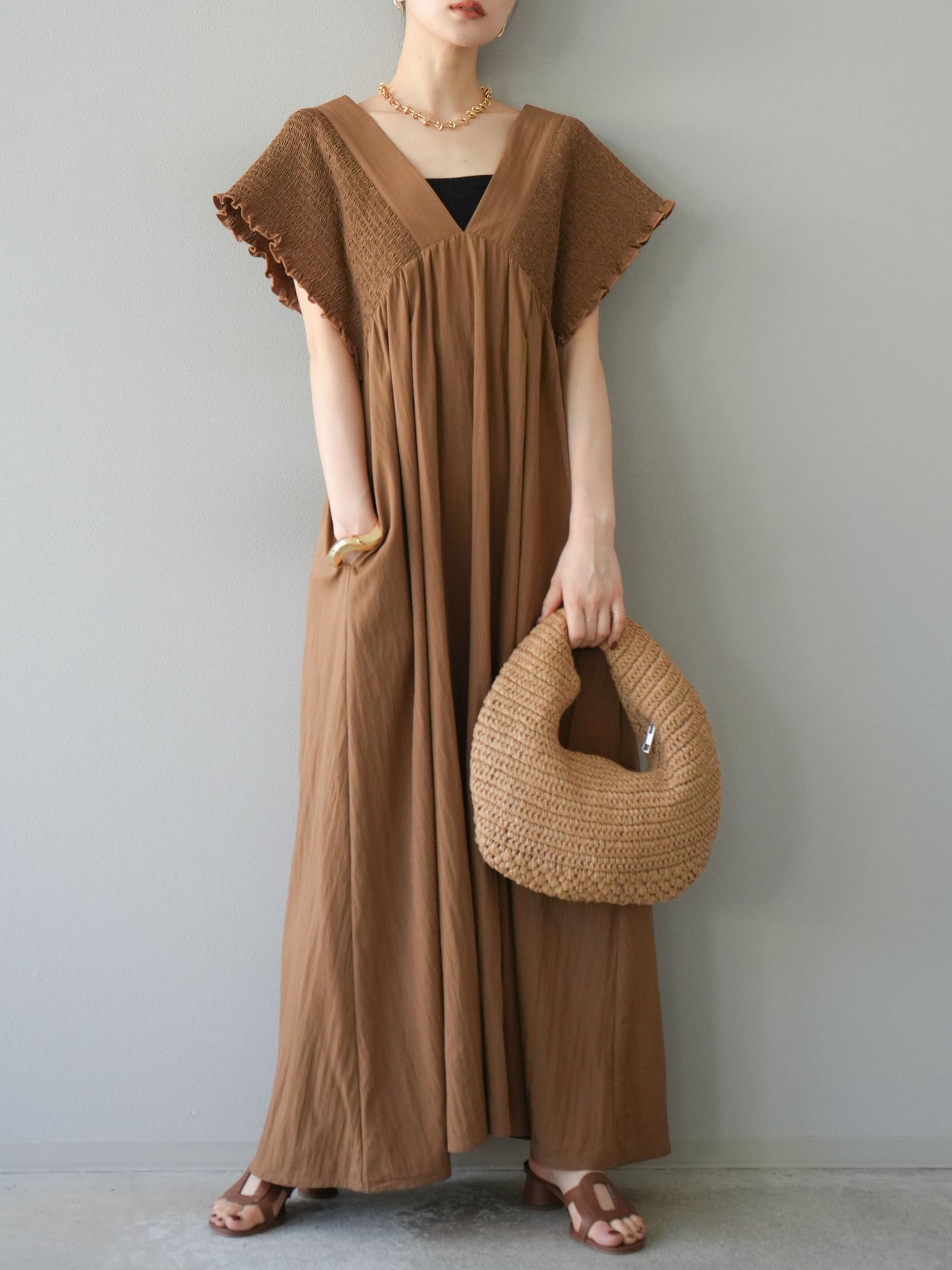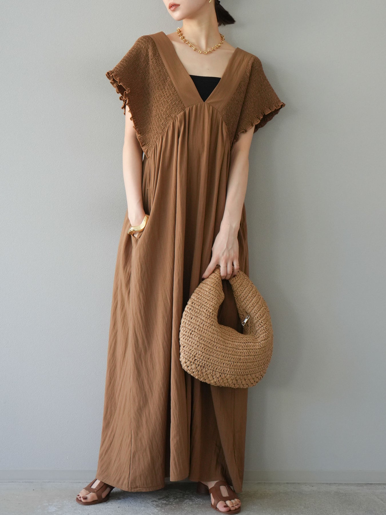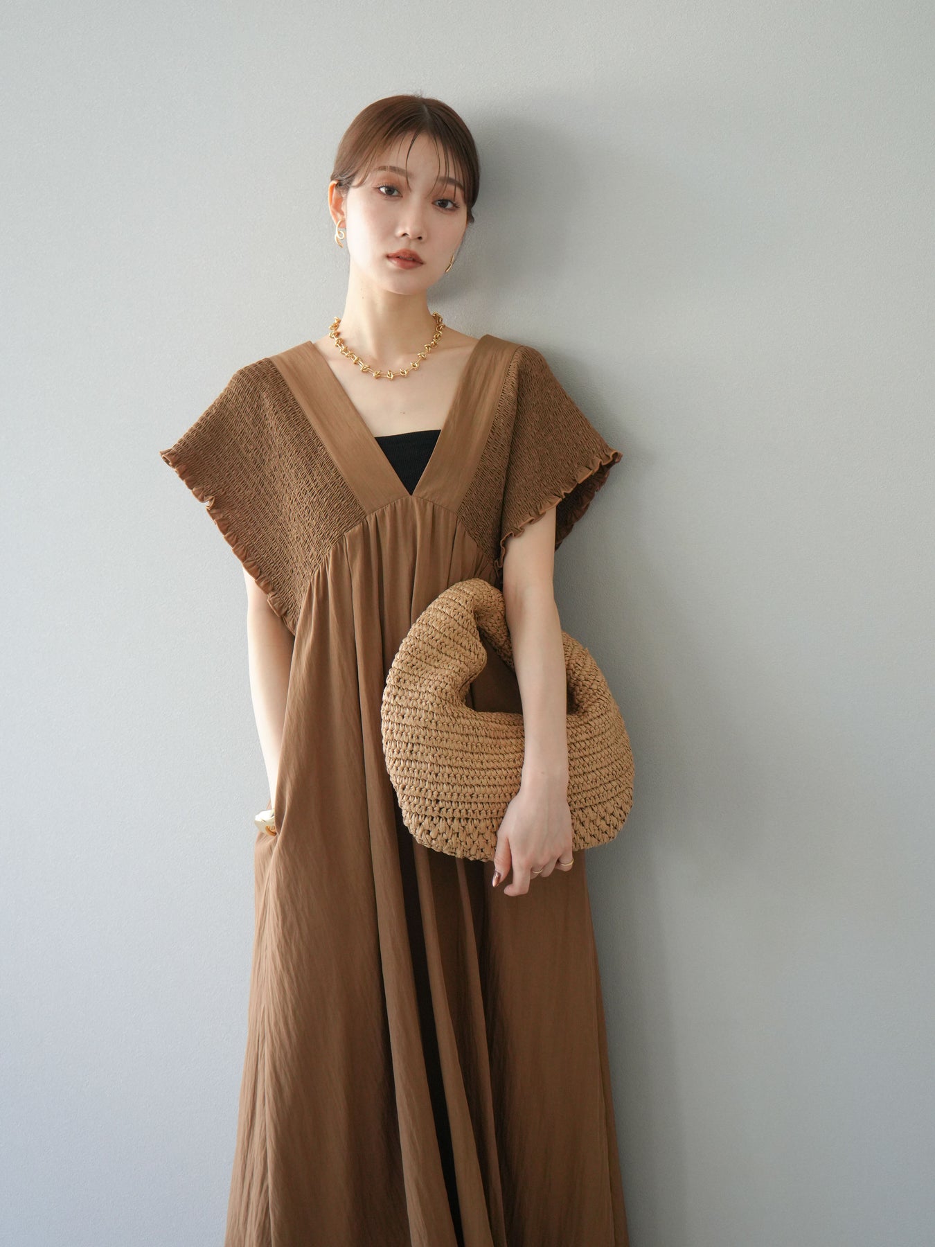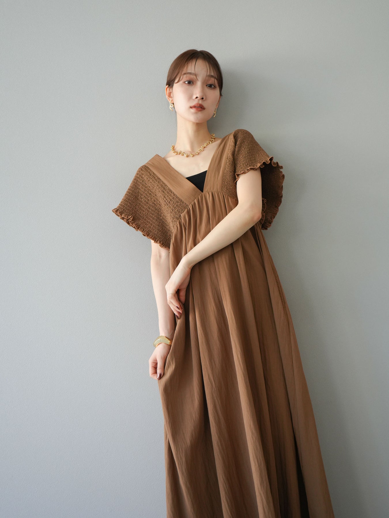 褶皺連身裙,輪廓柔和流暢。衣身採用大面積褶皺設計,打造貼身立體感。 V領設計凸顯肩膀曲線,包覆肩膀的荷葉邊袖口更添女性魅力。輕盈柔滑的布料即使單穿也能展現精緻優雅的氣質。無論是日常穿著,還是度假或休閒出遊,都值得推薦。 *除下裝和吊帶背心(內衣)外,其他商品均不含內衣。