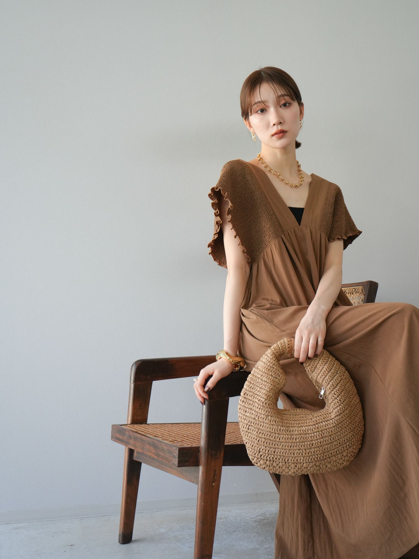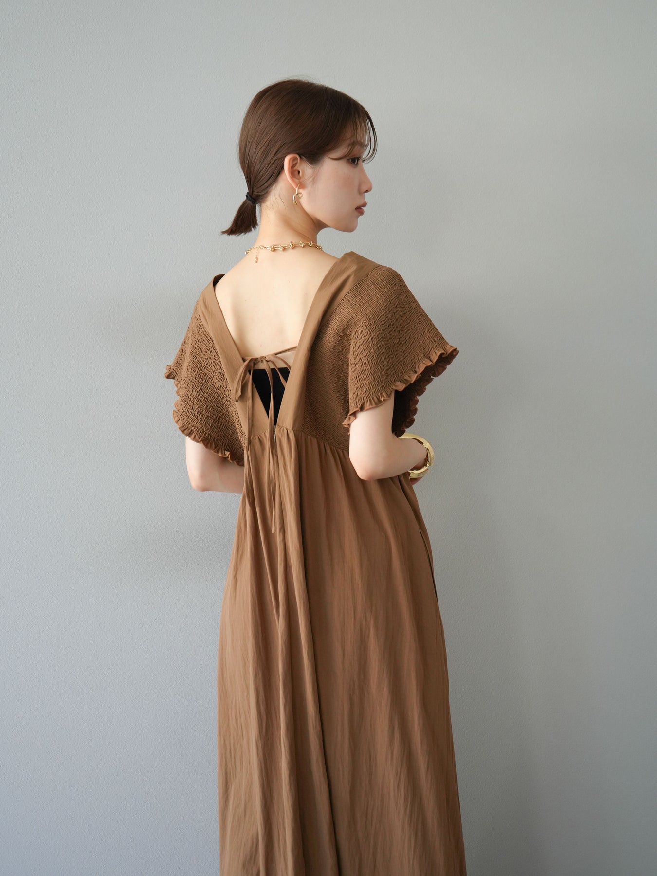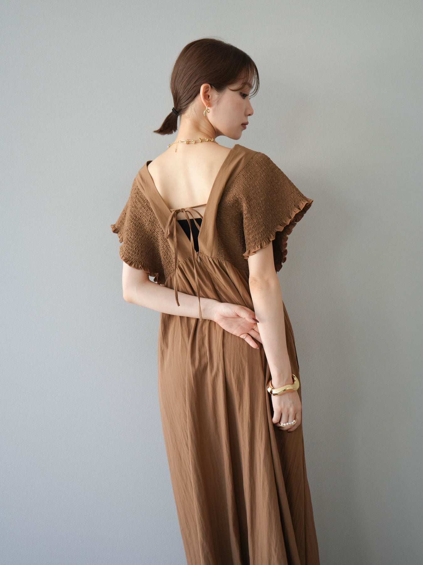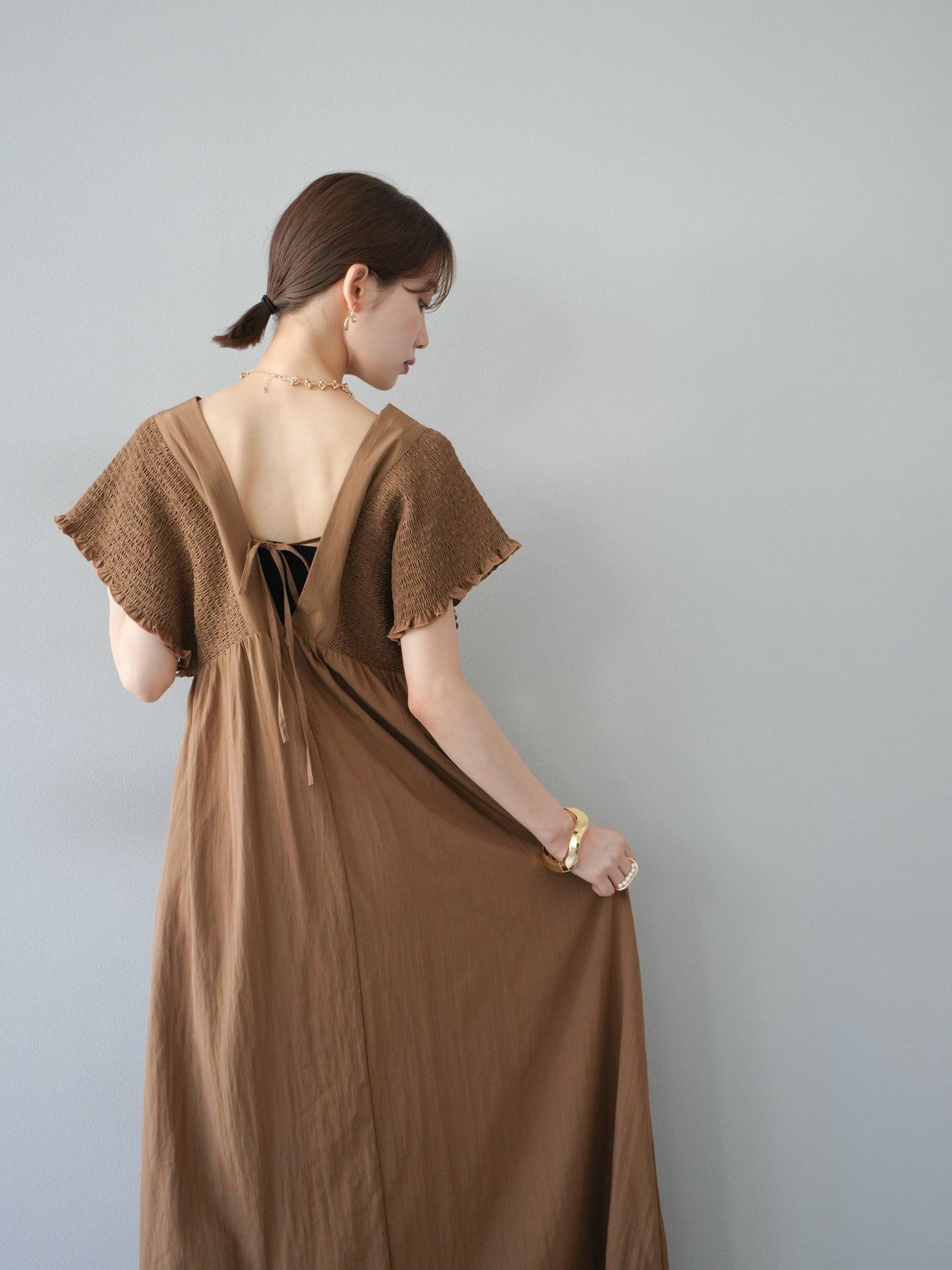 褶皺連身裙,輪廓柔和流暢。衣身採用大面積褶皺設計,打造貼身立體感。 V領設計凸顯肩膀曲線,包覆肩膀的荷葉邊袖口更添女性魅力。輕盈柔滑的布料即使單穿也能展現精緻優雅的氣質。無論是日常穿著,還是度假或休閒出遊,都值得推薦。 *除下裝和吊帶背心(內衣)外,其他商品均不含內衣。