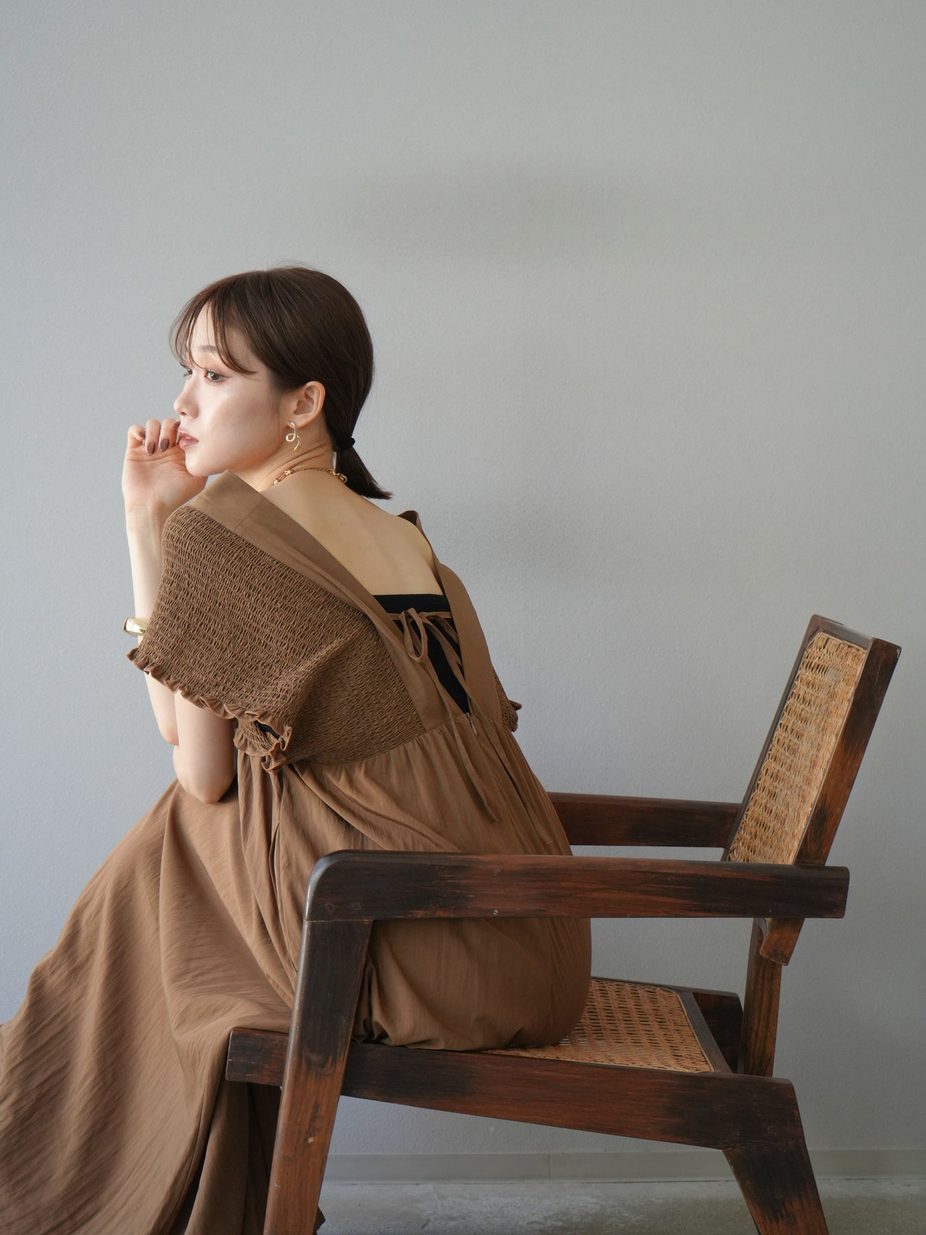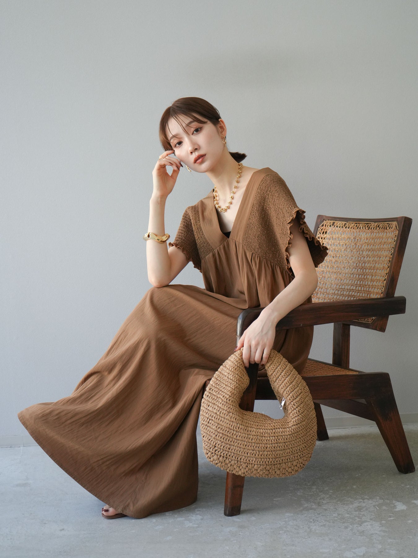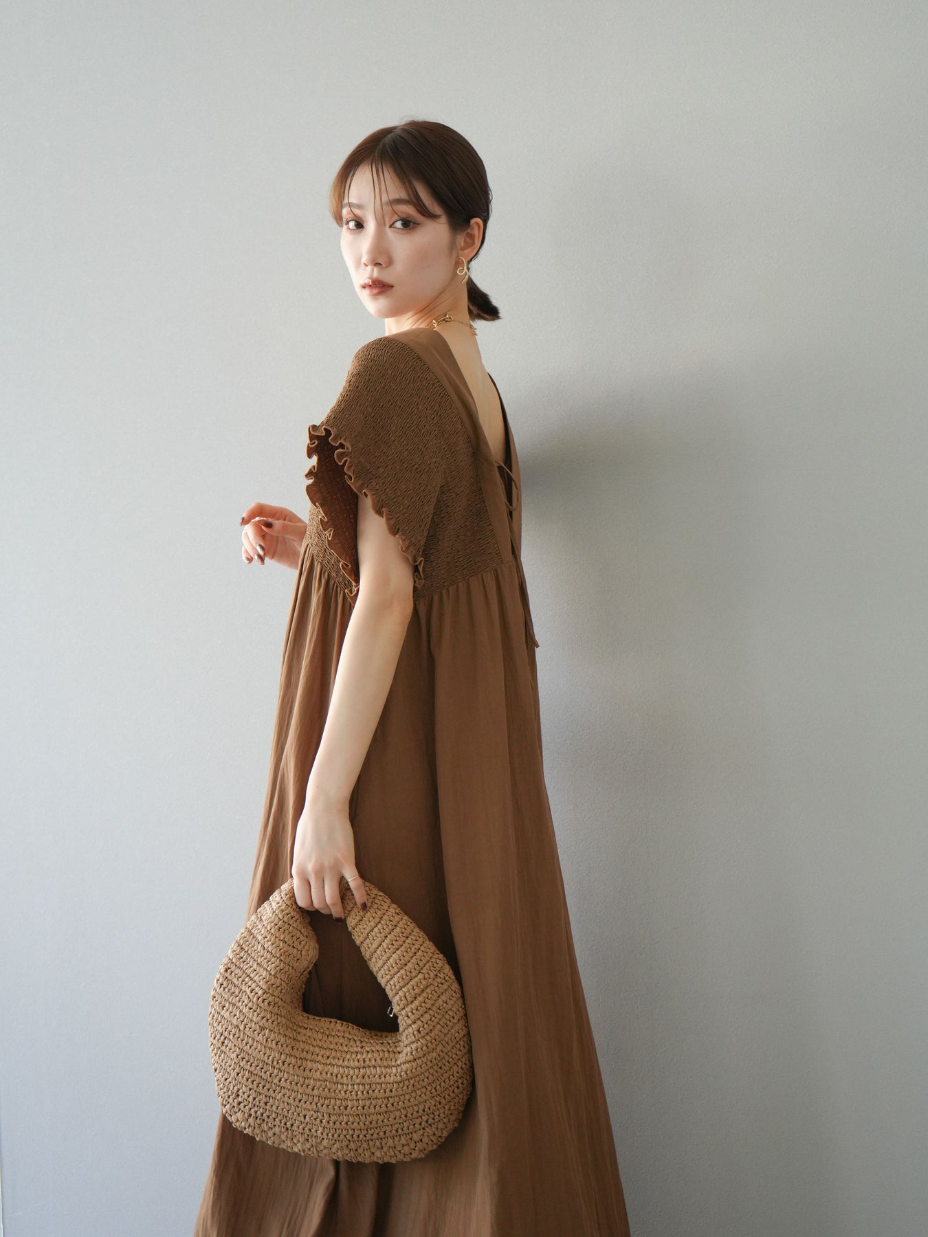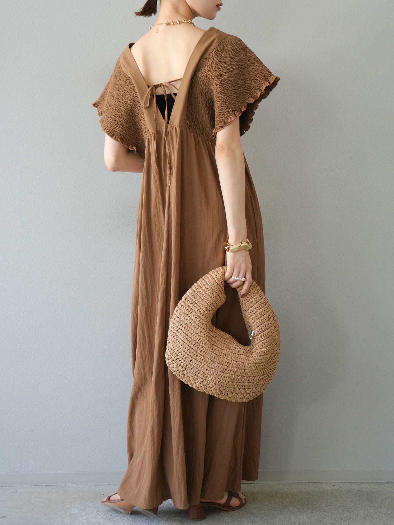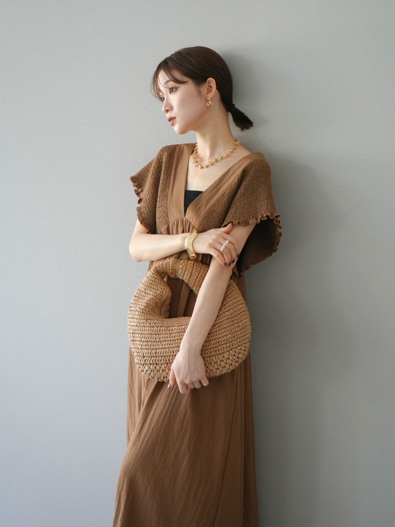 褶皺連身裙,輪廓柔和流暢。衣身採用大面積褶皺設計,打造貼身立體感。 V領設計凸顯肩膀曲線,包覆肩膀的荷葉邊袖口更添女性魅力。輕盈柔滑的布料即使單穿也能展現精緻優雅的氣質。無論是日常穿著,還是度假或休閒出遊,都值得推薦。 *除下裝和吊帶背心(內衣)外,其他商品均不含內衣。
