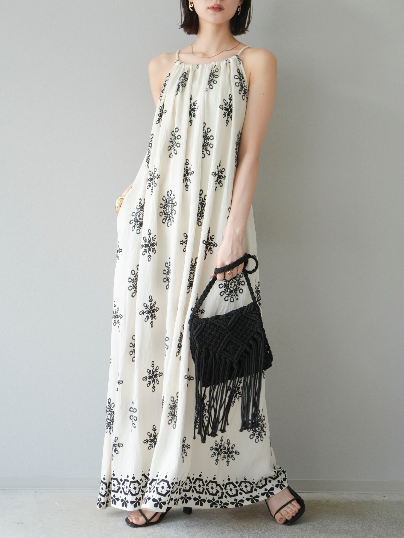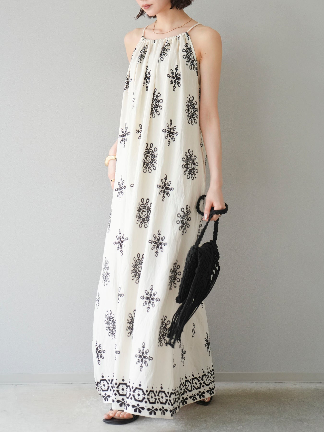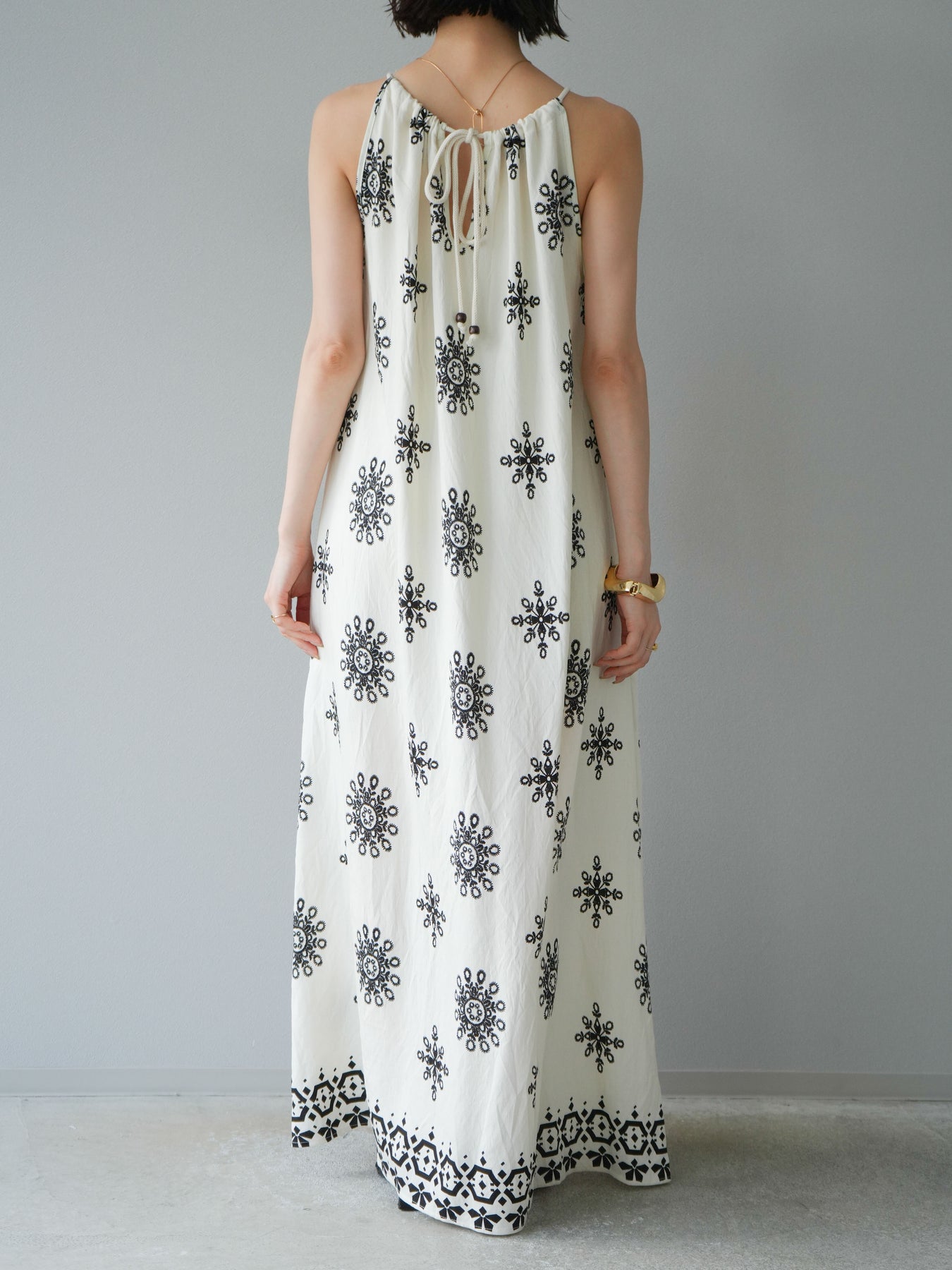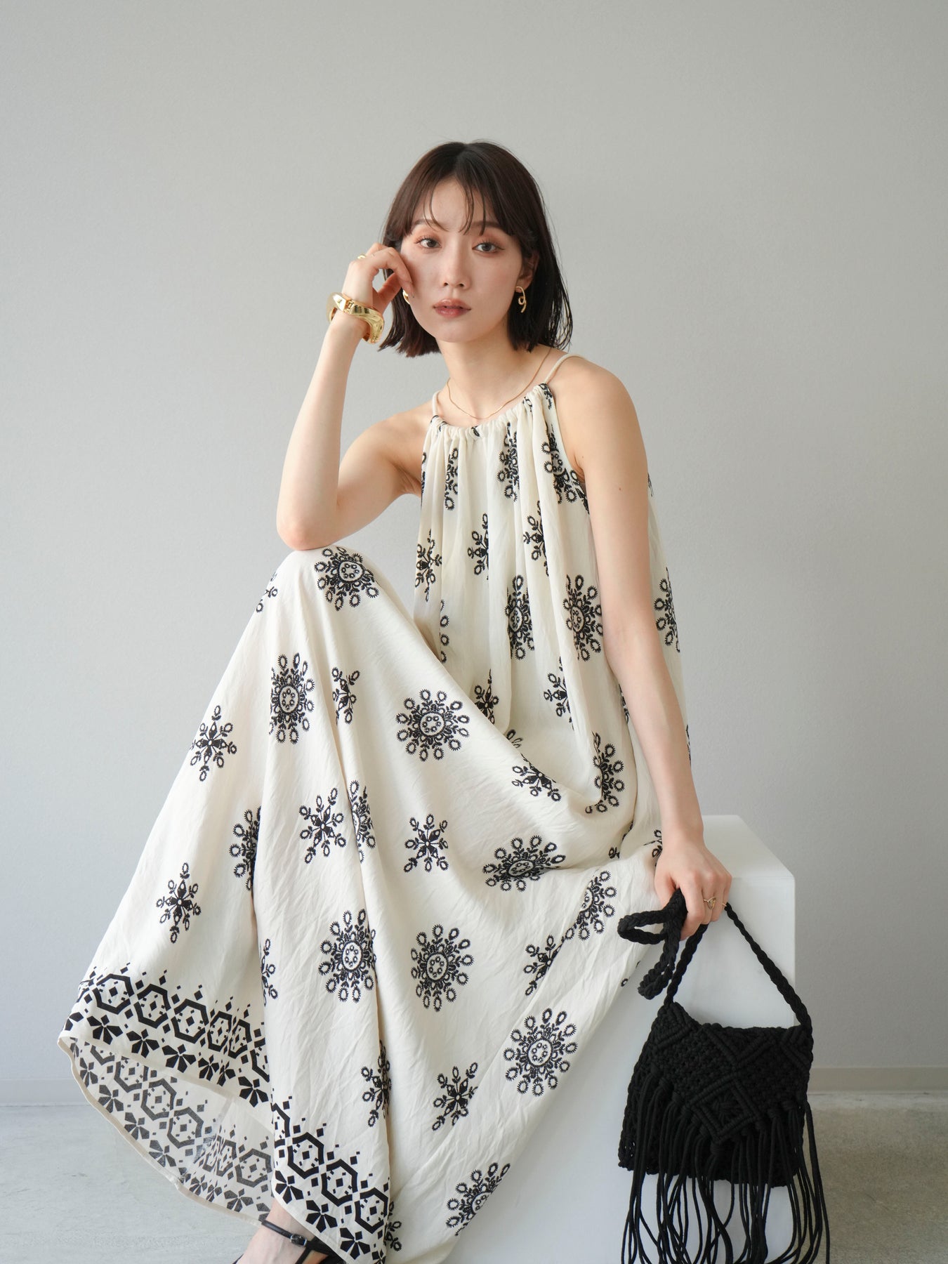 輕鬆愜意的民族風吊帶洋裝。布料的自然紋理點綴著精緻的民族風印花,單品即可成為點睛之筆,輕鬆打造完美造型。精緻的掛脖吊帶和褶皺豐富的喇叭廓形,營造出充滿女性魅力的休閒造型。這件洋裝不僅適合度假,也適合日常穿著。建議搭配開襟衫或夾克。 *除下裝和吊帶背心(內衣)外,其他商品均不含內衣。