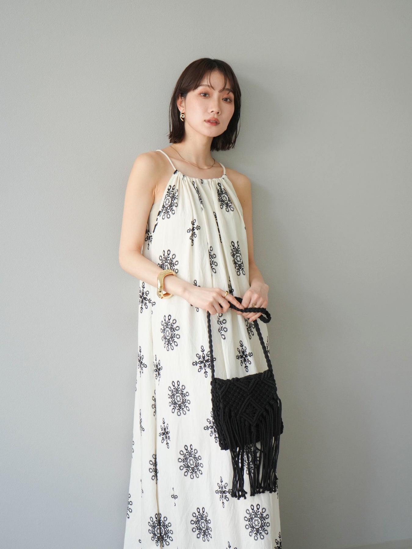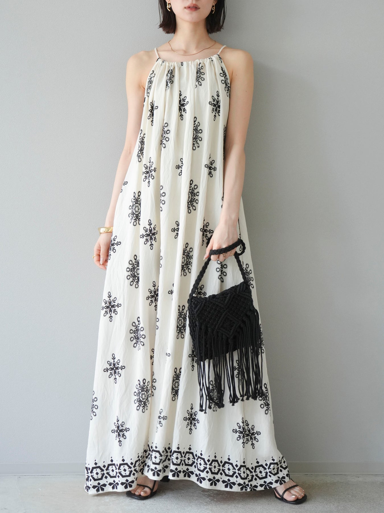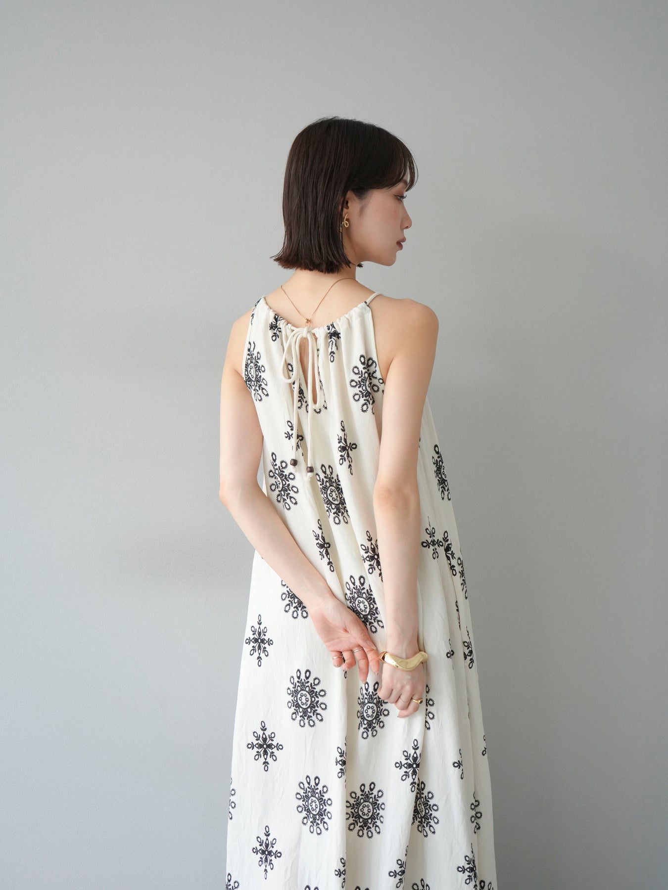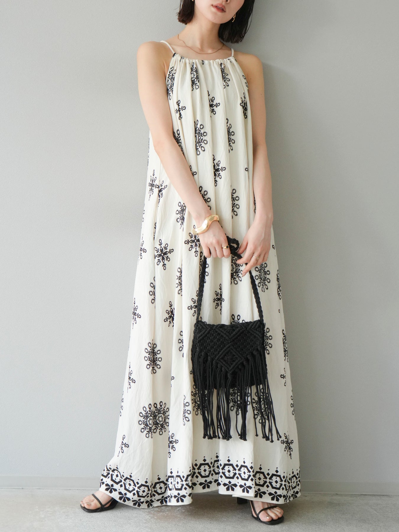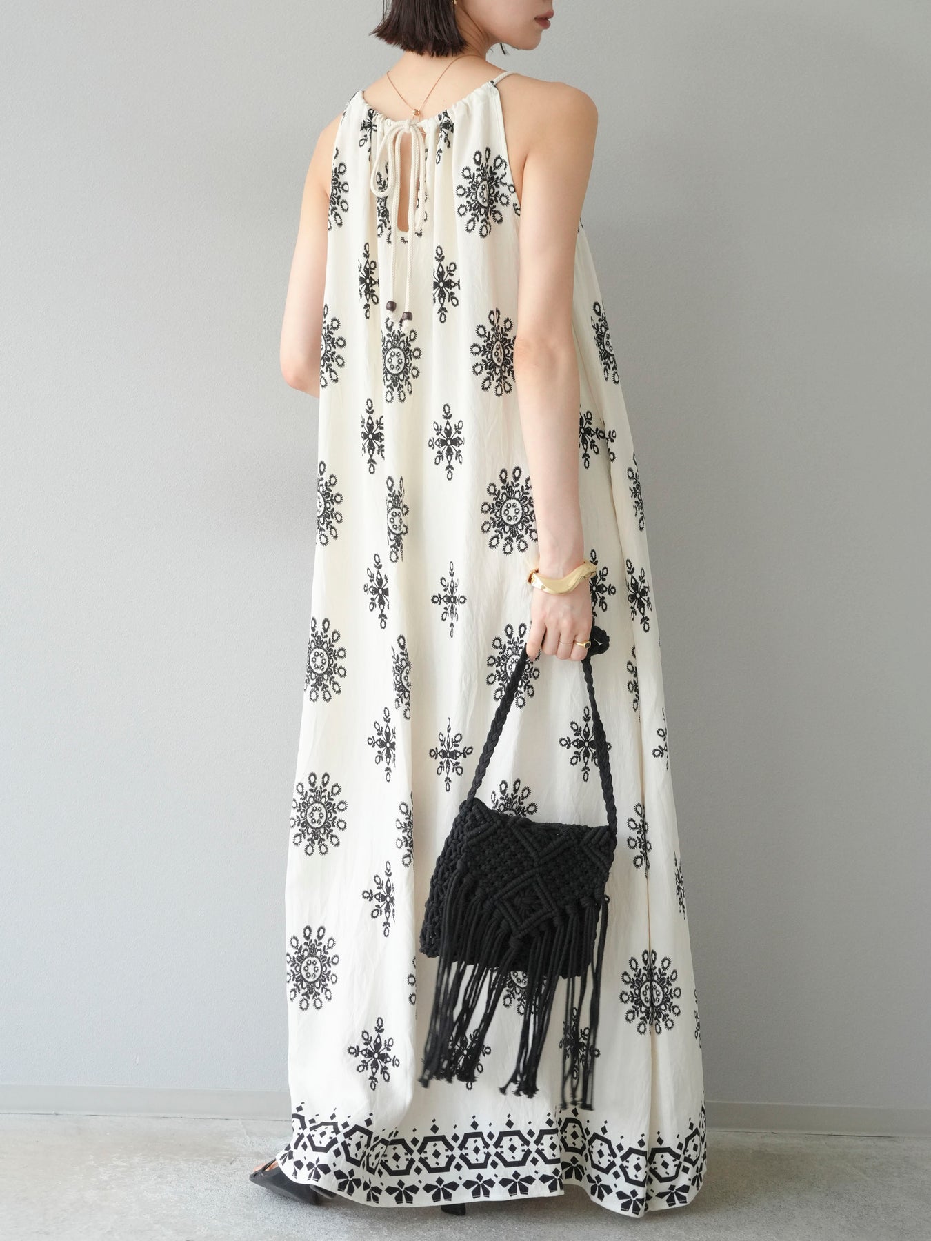 輕鬆愜意的民族風吊帶洋裝。布料的自然紋理點綴著精緻的民族風印花,單品即可成為點睛之筆,輕鬆打造完美造型。精緻的掛脖吊帶和褶皺豐富的喇叭廓形,營造出充滿女性魅力的休閒造型。這件洋裝不僅適合度假,也適合日常穿著。建議搭配開襟衫或夾克。 *除下裝和吊帶背心(內衣)外,其他商品均不含內衣。