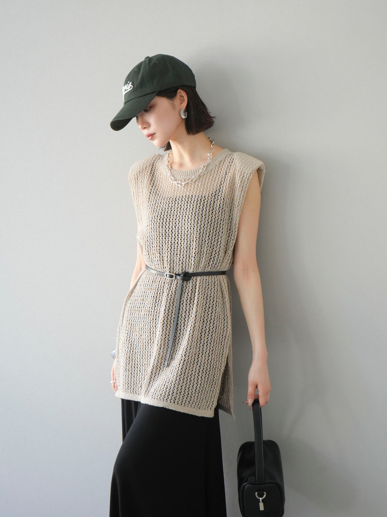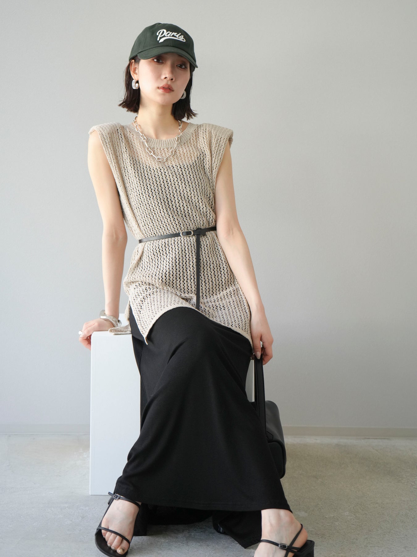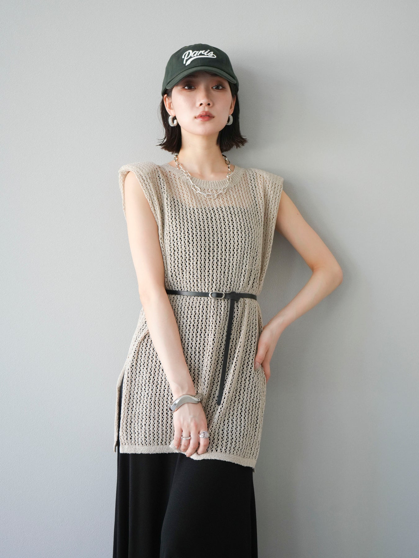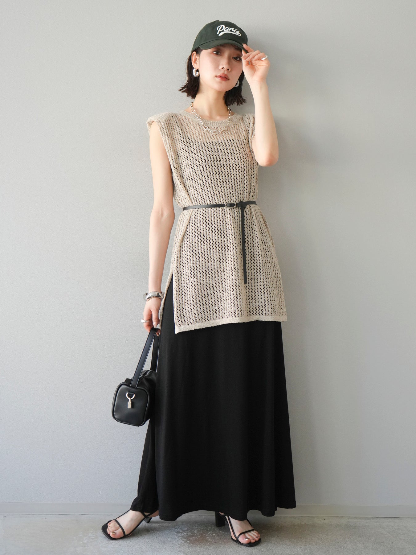 這款套裝洋裝配有腰帶,由時尚透視感十足的網眼針織衫和簡約的吊帶裙組成。網眼針織衫布料富有表現力,輕盈飄逸,烘托出季節感。附贈一條纖細腰帶,可修飾腰身,帶來纖細修身的效果。洋裝採用柔軟垂墜的布料,帶來輕鬆舒適的穿著體驗。它是百搭單品,既可作為套裝穿著,也可作為單品穿著,拓展了您的穿搭範圍。 ※除下裝、吊帶背心(內衣)以外的商品均不含內衣。