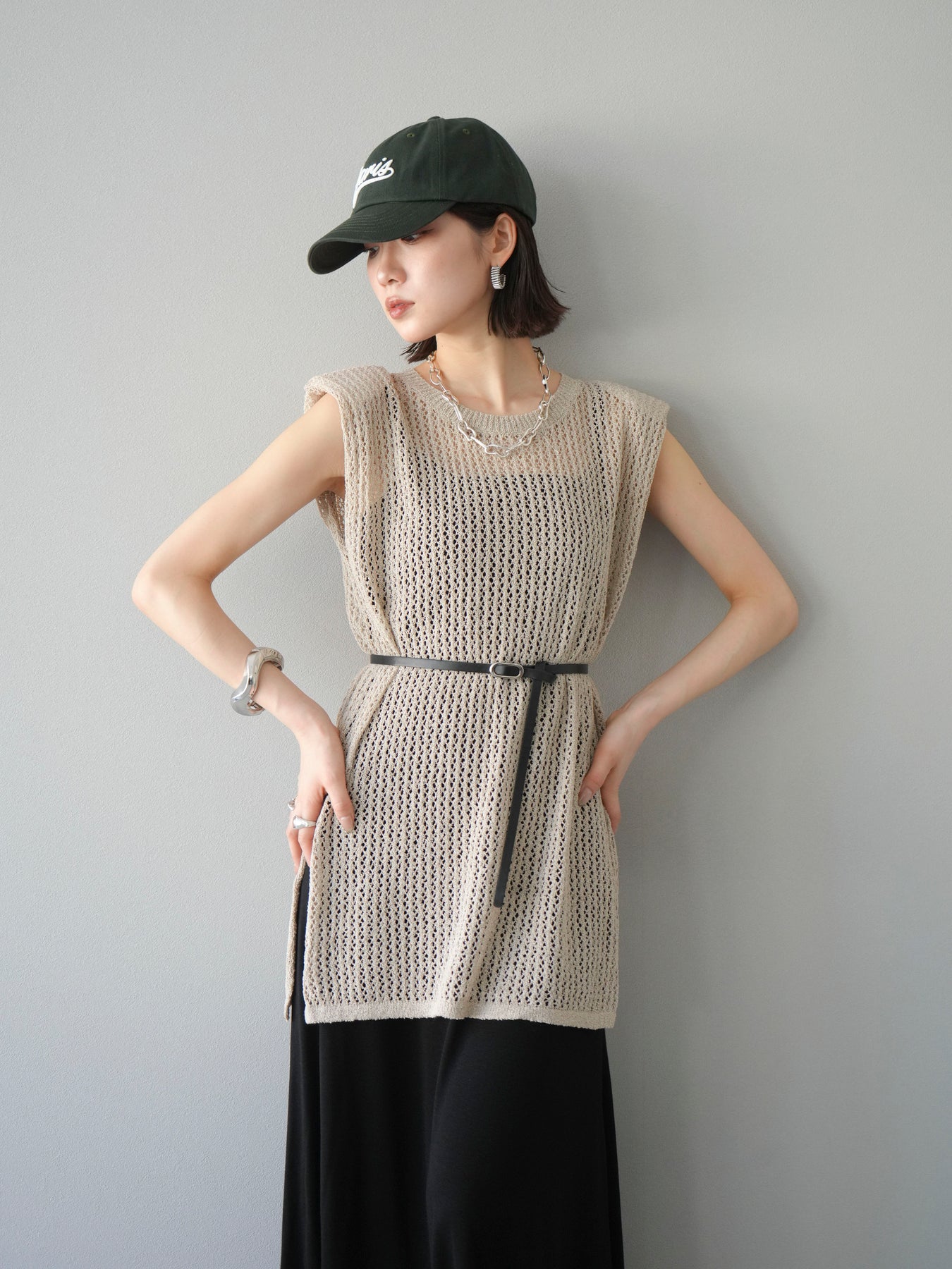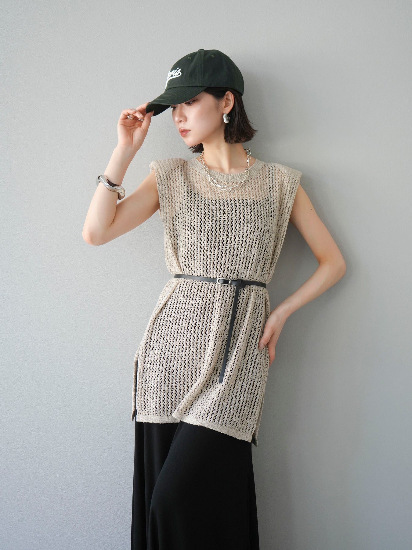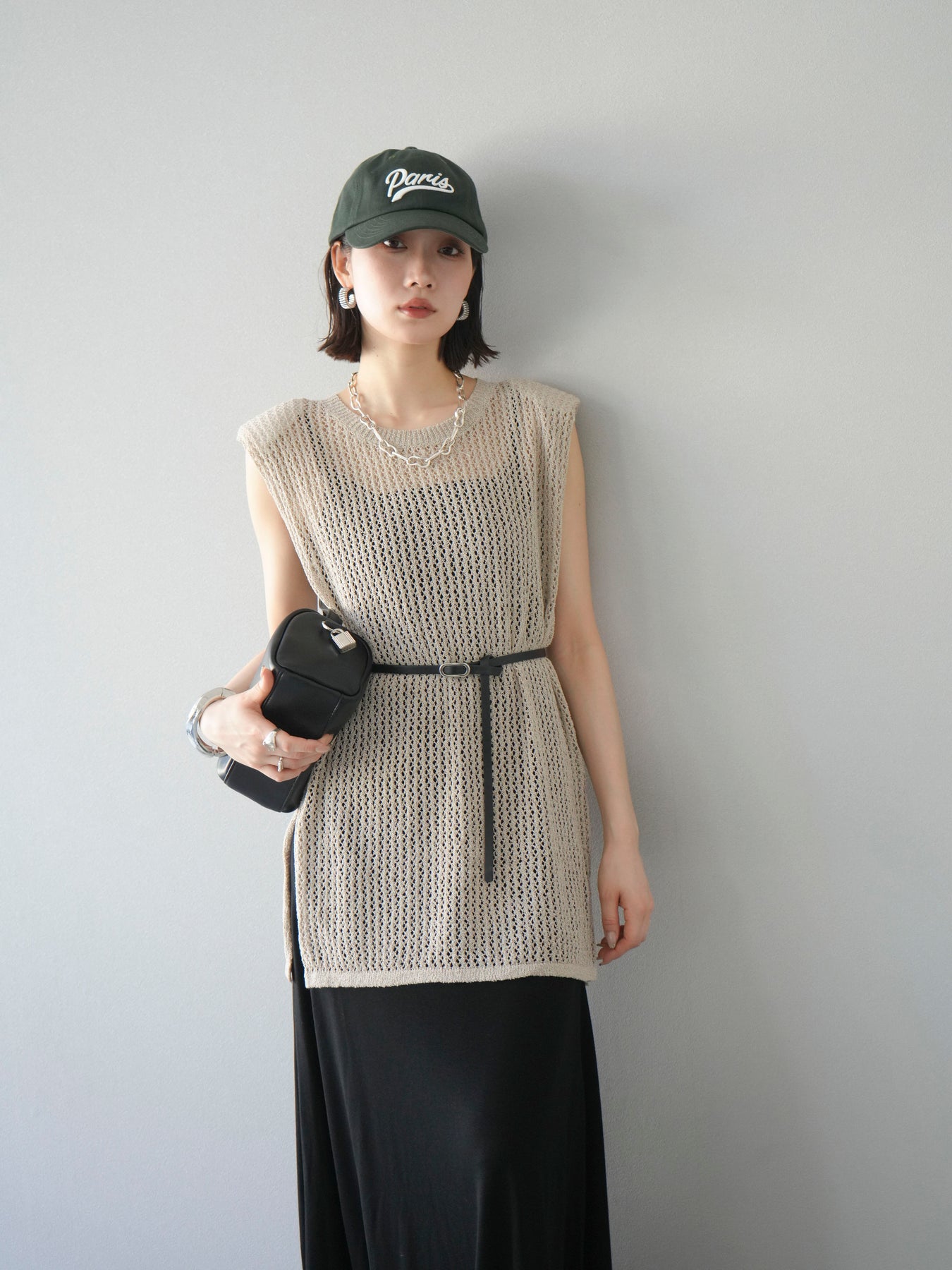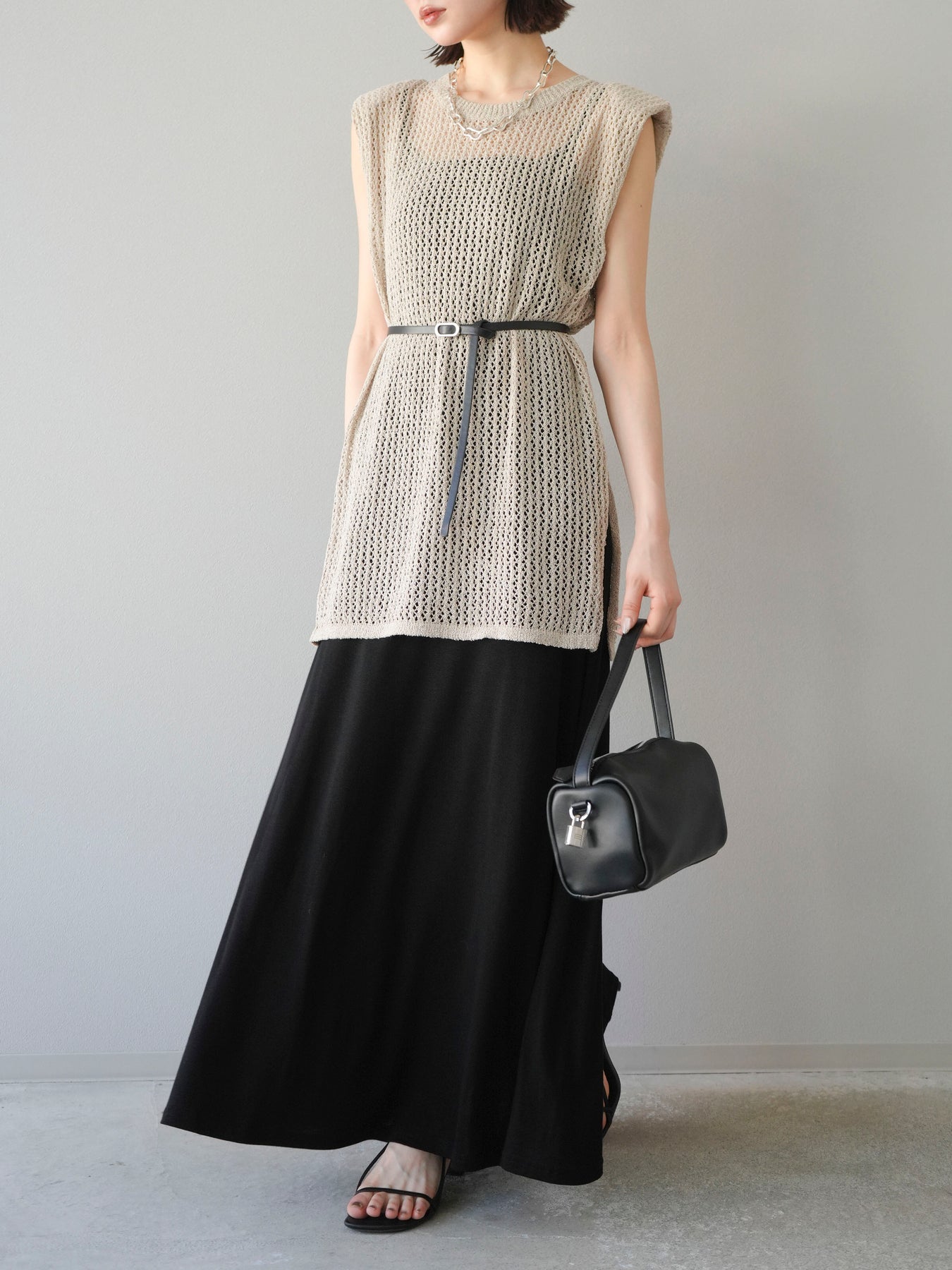 這款套裝洋裝配有腰帶,由時尚透視感十足的網眼針織衫和簡約的吊帶裙組成。網眼針織衫布料富有表現力,輕盈飄逸,烘托出季節感。附贈一條纖細腰帶,可修飾腰身,帶來纖細修身的效果。洋裝採用柔軟垂墜的布料,帶來輕鬆舒適的穿著體驗。它是百搭單品,既可作為套裝穿著,也可作為單品穿著,拓展了您的穿搭範圍。 ※除下裝、吊帶背心(內衣)以外的商品均不含內衣。