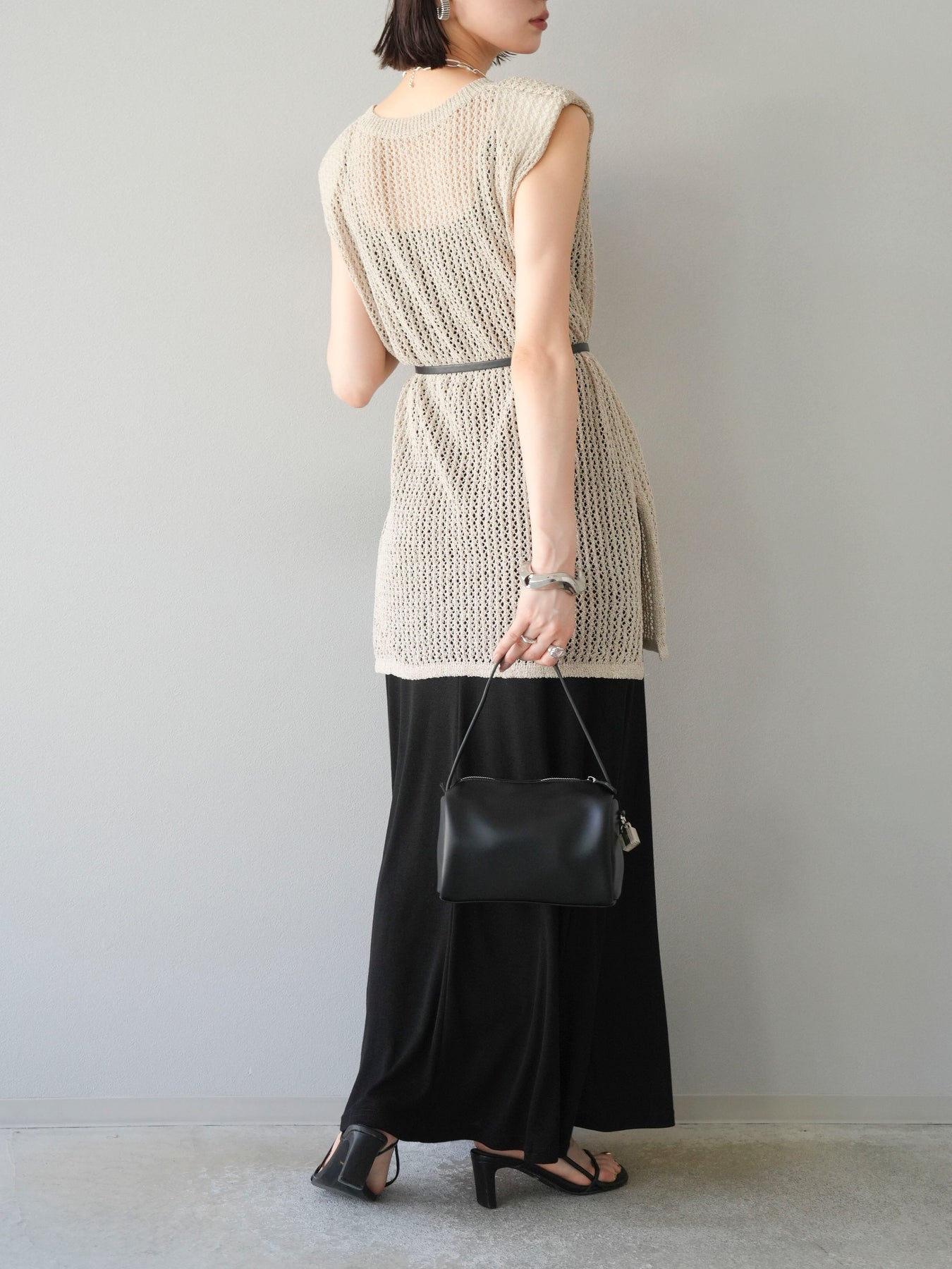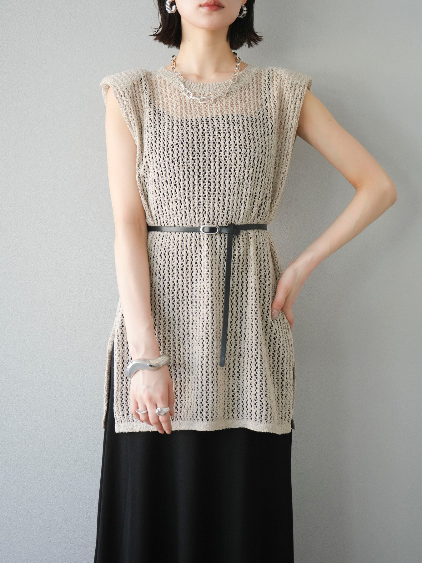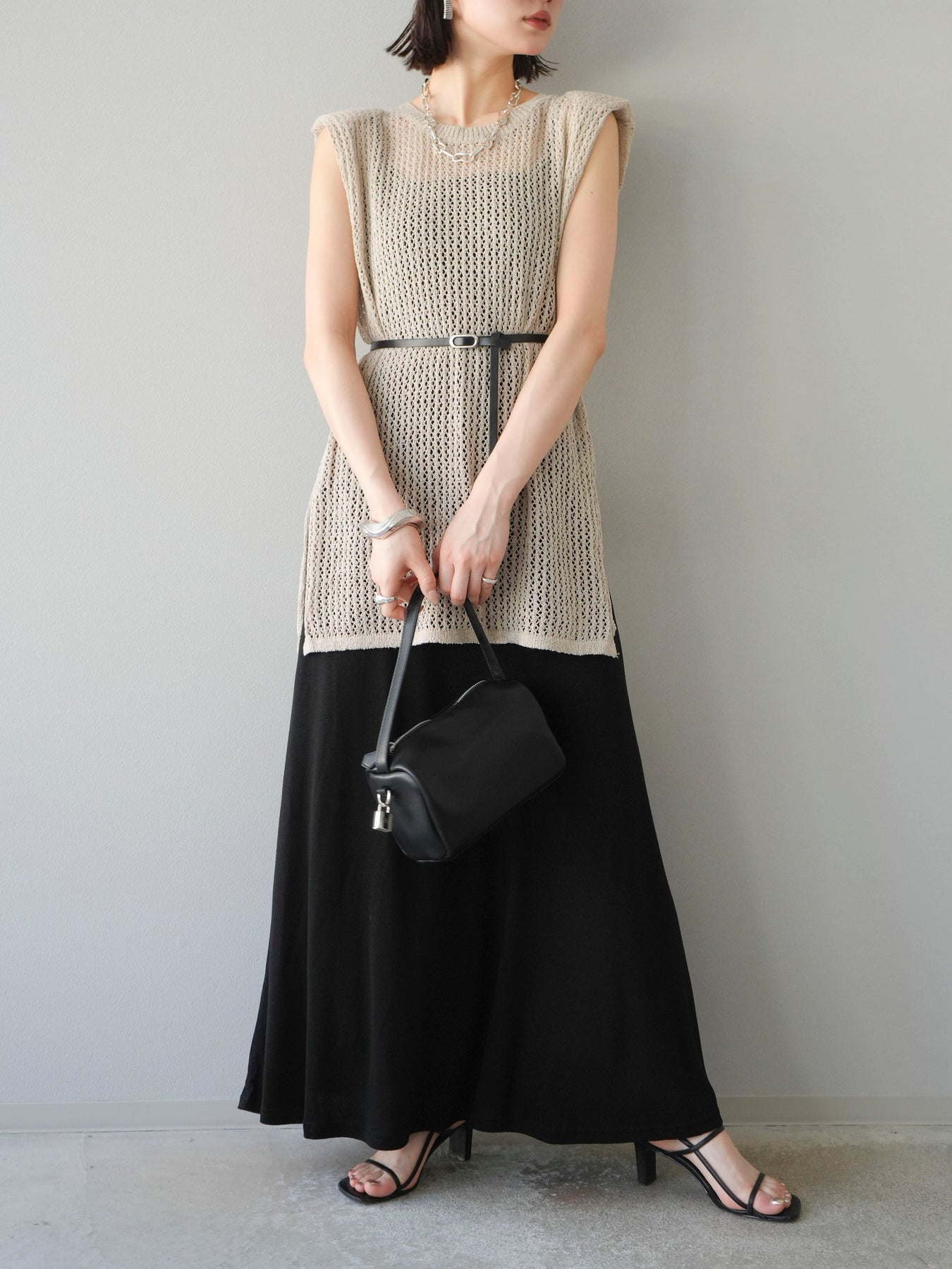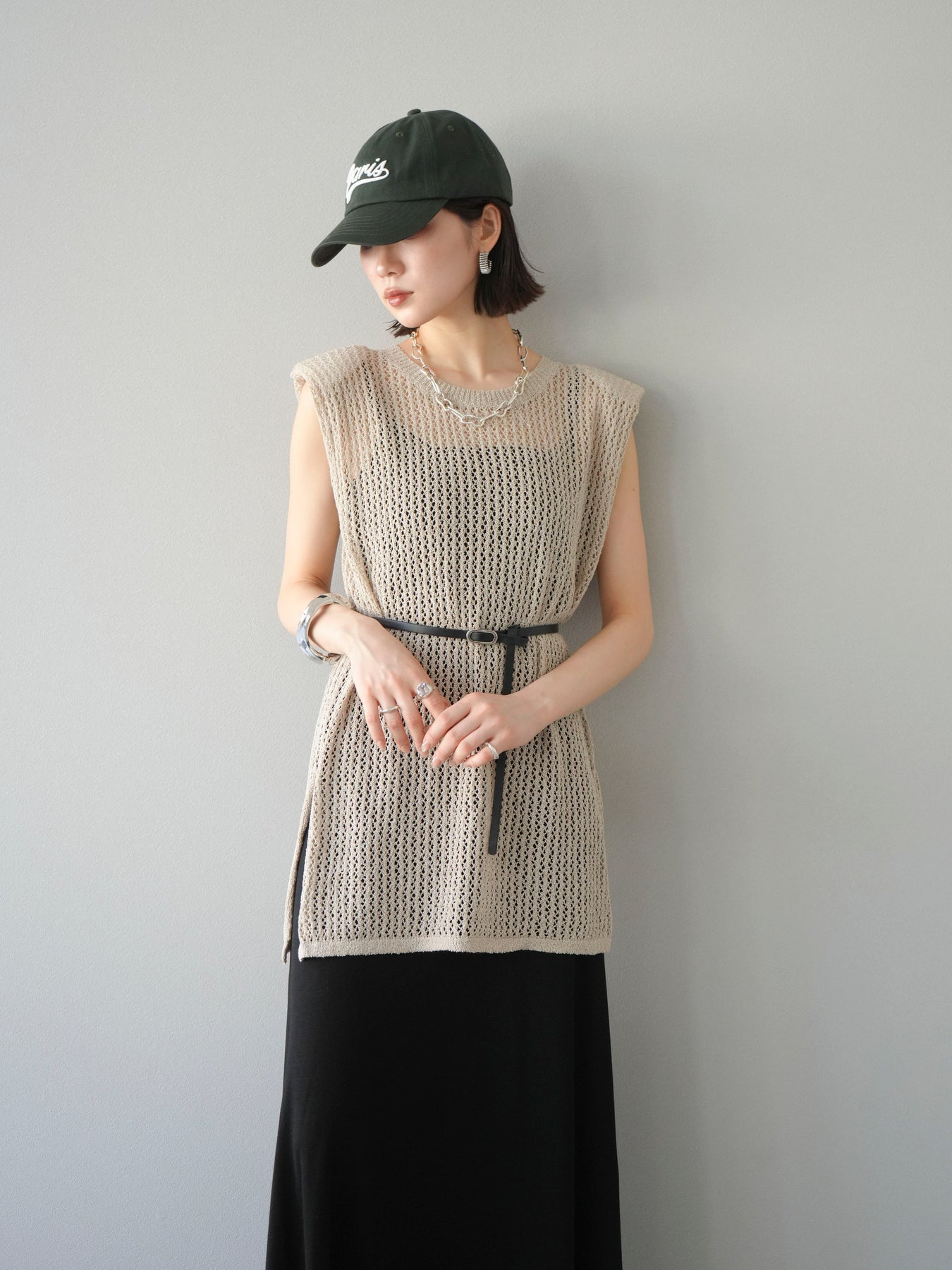 這款套裝洋裝配有腰帶,由時尚透視感十足的網眼針織衫和簡約的吊帶裙組成。網眼針織衫布料富有表現力,輕盈飄逸,烘托出季節感。附贈一條纖細腰帶,可修飾腰身,帶來纖細修身的效果。洋裝採用柔軟垂墜的布料,帶來輕鬆舒適的穿著體驗。它是百搭單品,既可作為套裝穿著,也可作為單品穿著,拓展了您的穿搭範圍。 ※除下裝、吊帶背心(內衣)以外的商品均不含內衣。