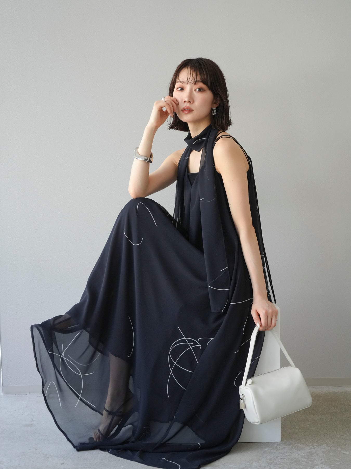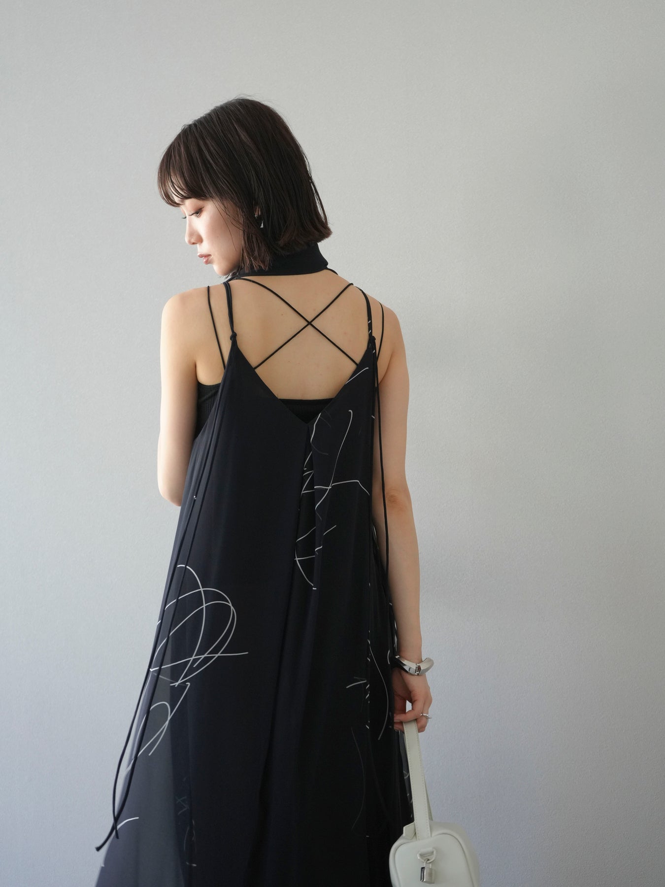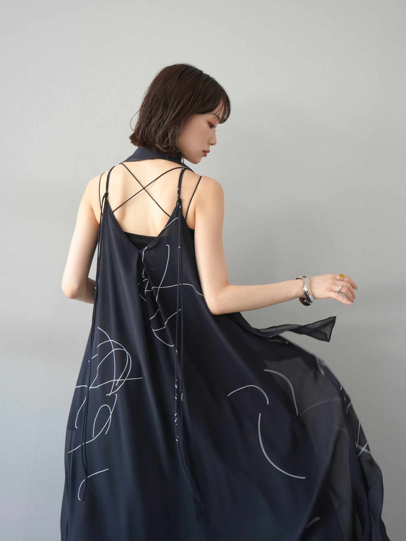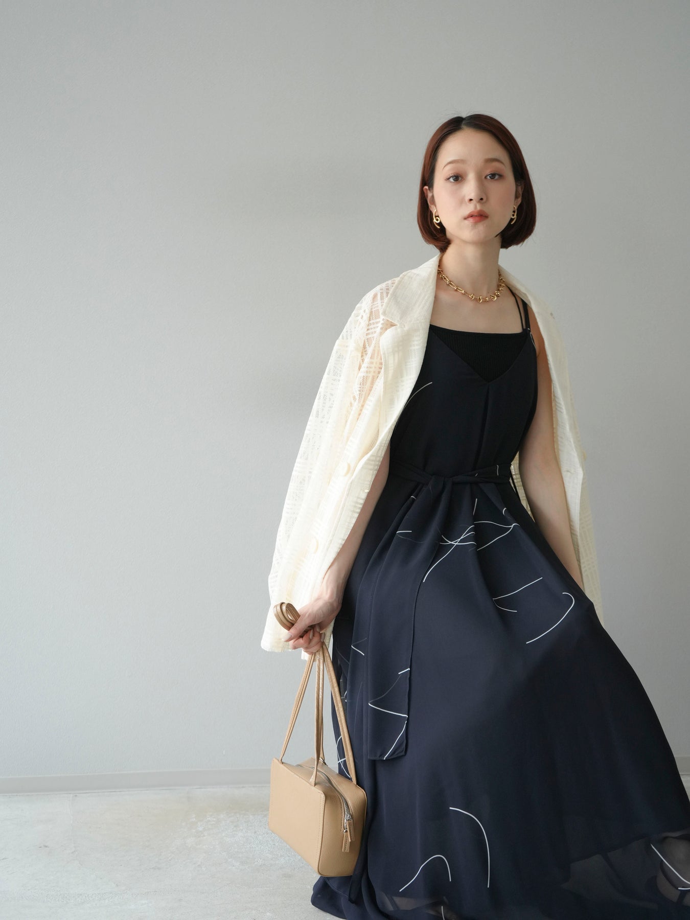 這款吊帶洋裝採用輕盈透明的雪紡面料製成,並飾有精緻的筆觸圖案。寬鬆的喇叭形輪廓隨著動作優雅擺動,只需一件即可打造優雅造型。精緻的肩帶使低胸設計更加利落,垂墜的面料營造出優雅而柔美的氛圍。您可以將其搭配剪裁縫製的內搭,或內搭襯衫或夾克,多種穿著方式。它是春夏季度假和外出的理想之選。 ※除下裝、吊帶背心(內衣)以外的商品均不含內衣。