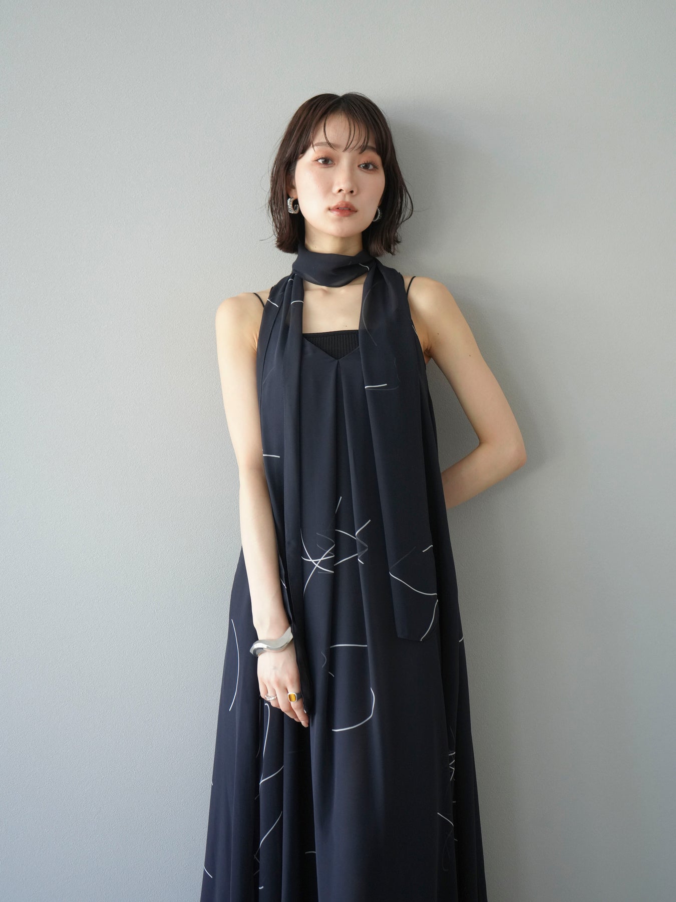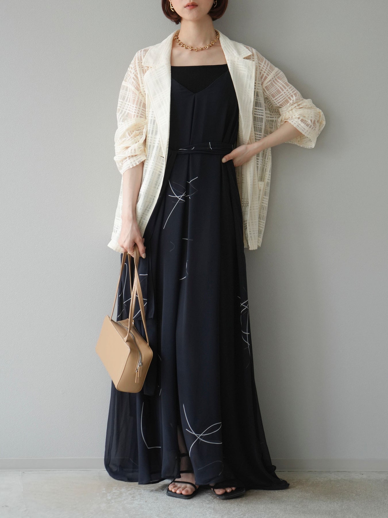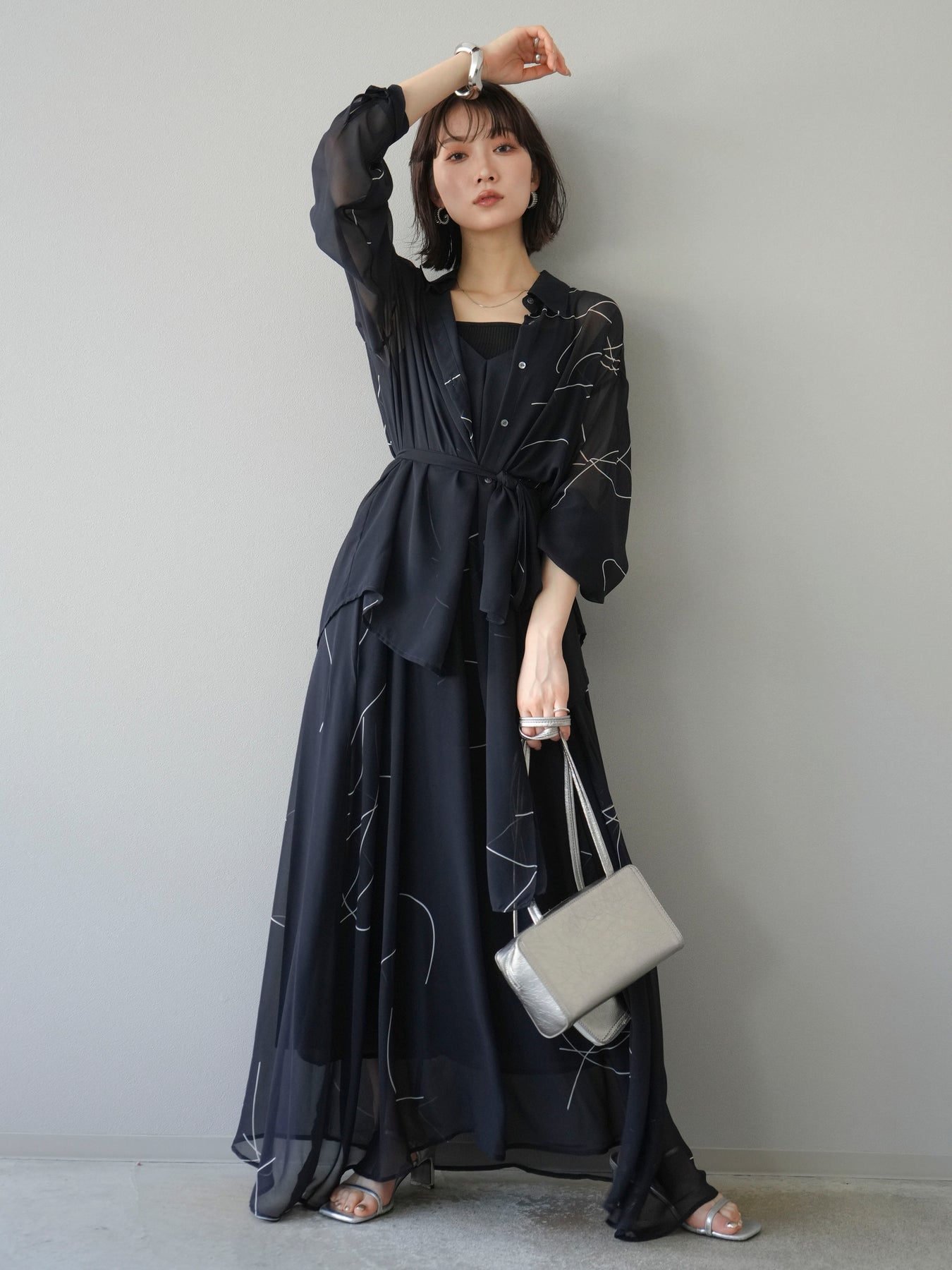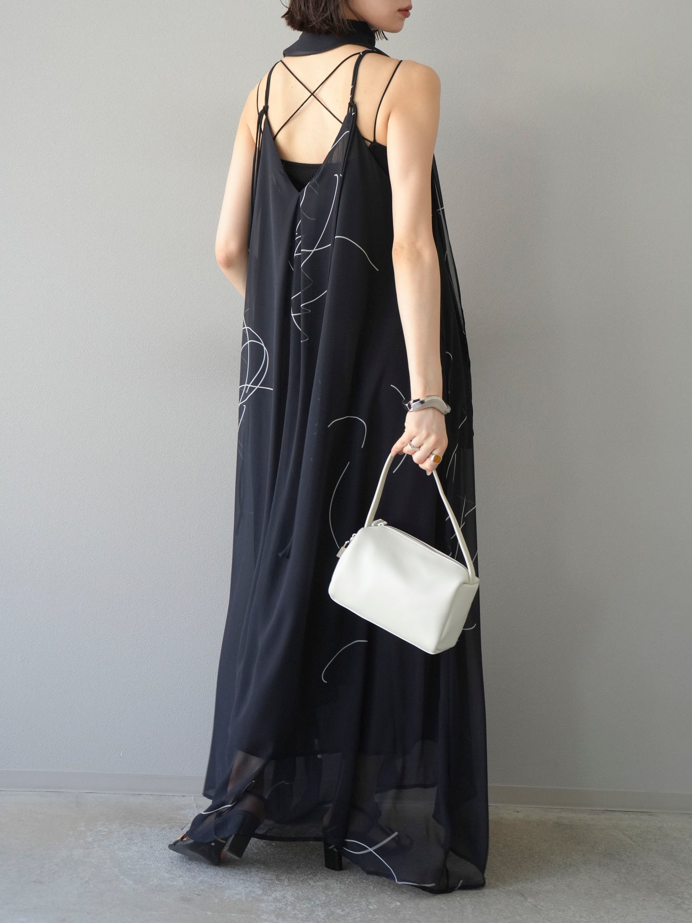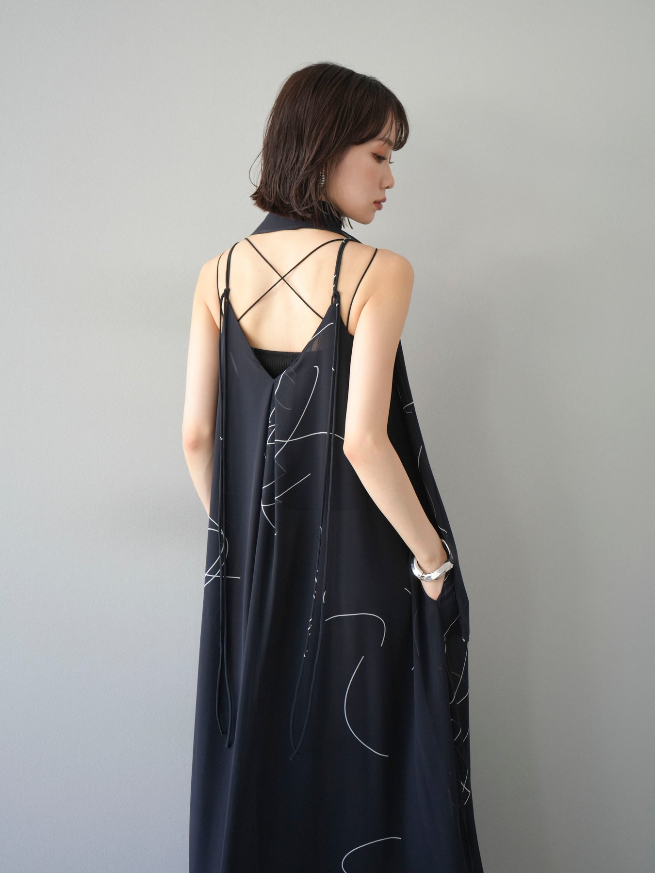 這款吊帶洋裝採用輕盈透明的雪紡面料製成,並飾有精緻的筆觸圖案。寬鬆的喇叭形輪廓隨著動作優雅擺動,只需一件即可打造優雅造型。精緻的肩帶使低胸設計更加利落,垂墜的面料營造出優雅而柔美的氛圍。您可以將其搭配剪裁縫製的內搭,或內搭襯衫或夾克,多種穿著方式。它是春夏季度假和外出的理想之選。 ※除下裝、吊帶背心(內衣)以外的商品均不含內衣。