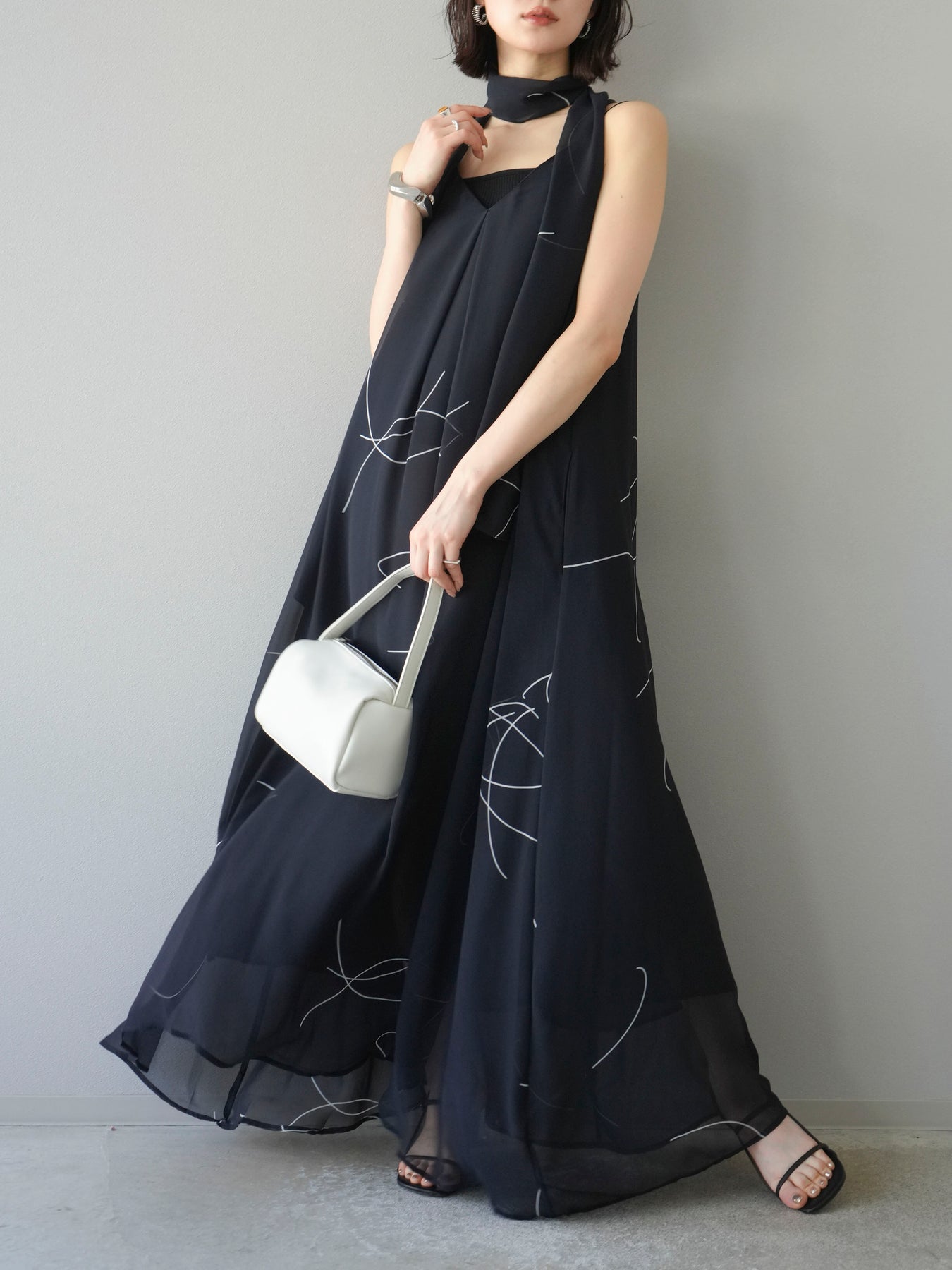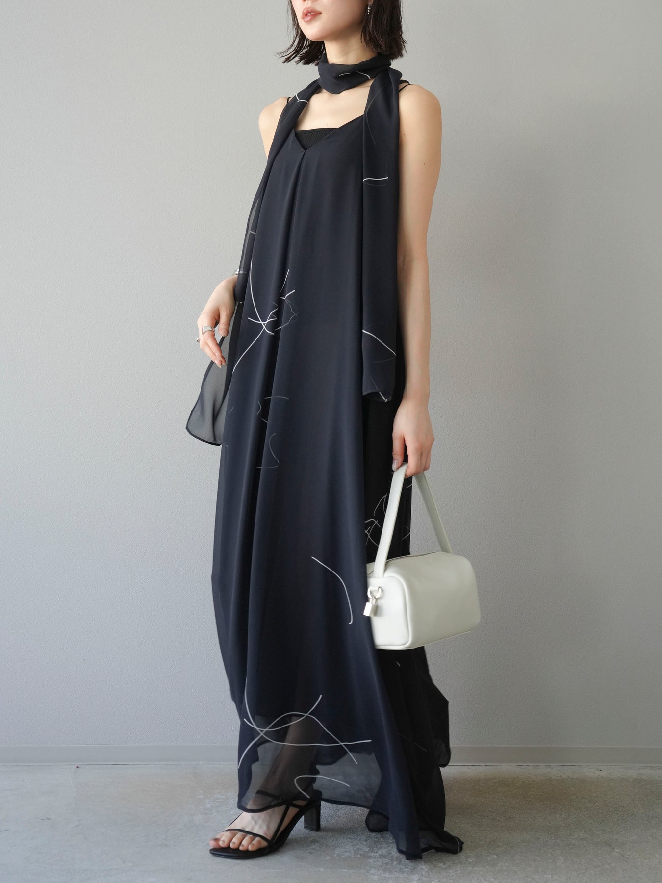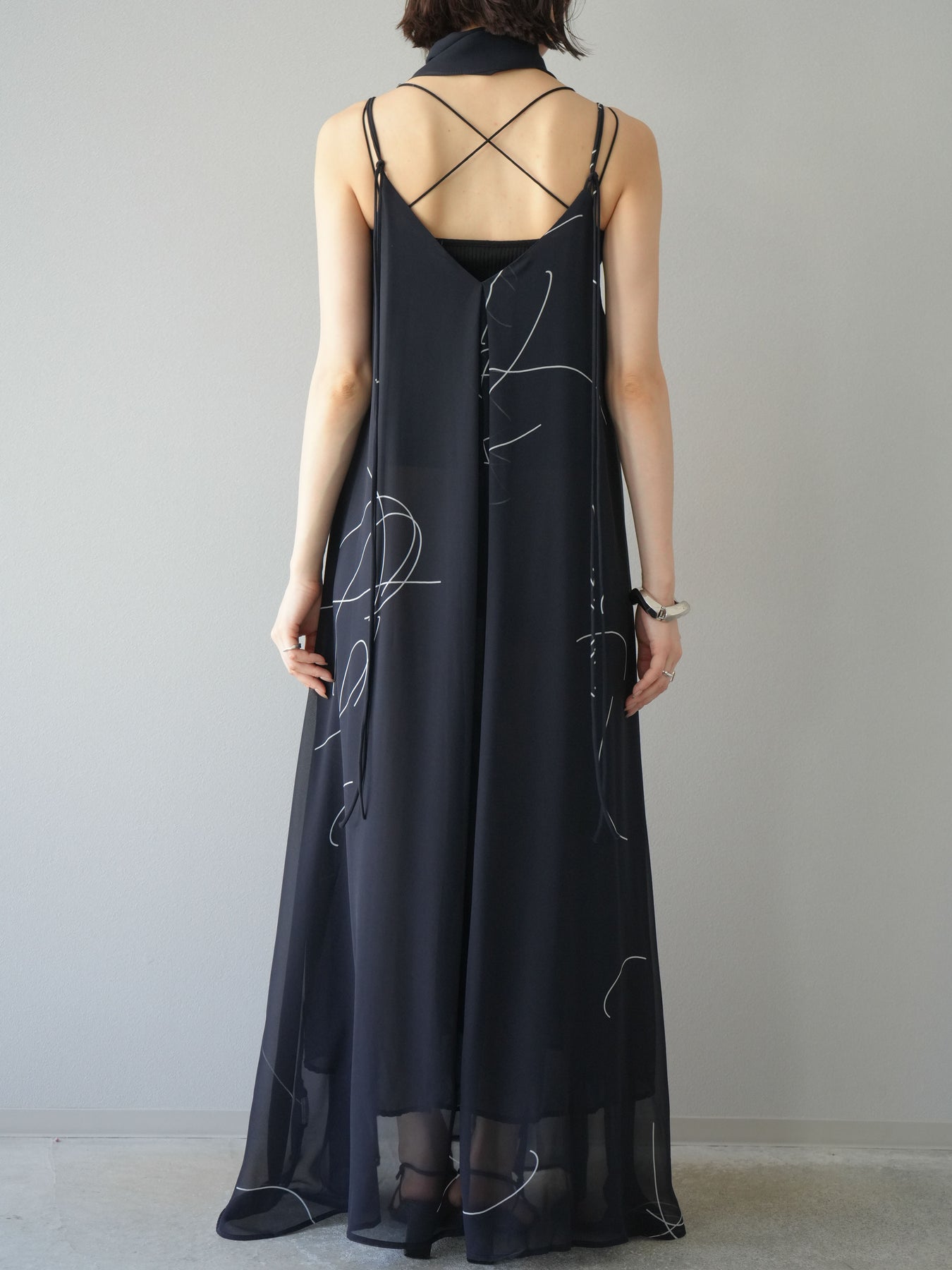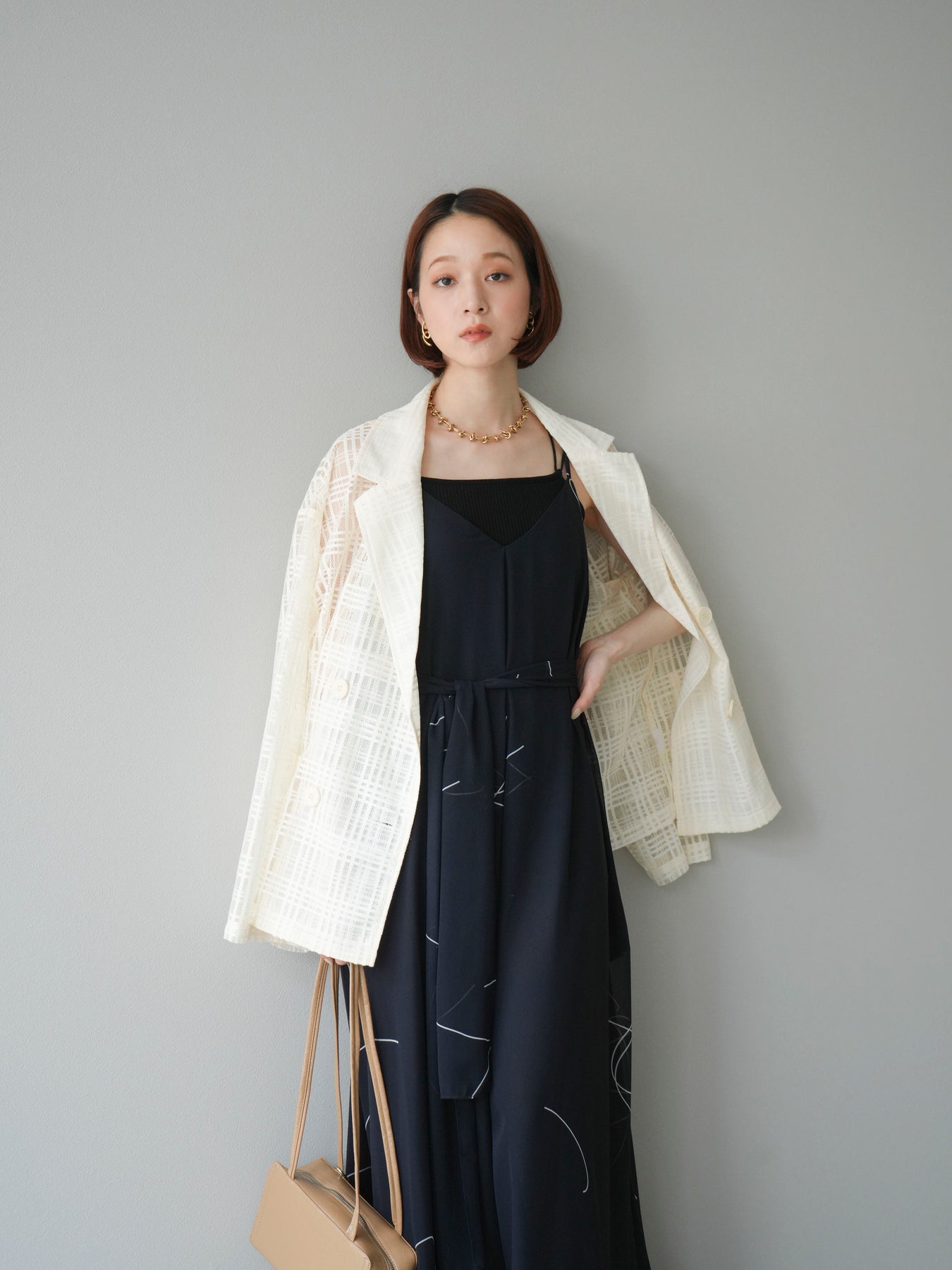 這款吊帶洋裝採用輕盈透明的雪紡面料製成,並飾有精緻的筆觸圖案。寬鬆的喇叭形輪廓隨著動作優雅擺動,只需一件即可打造優雅造型。精緻的肩帶使低胸設計更加利落,垂墜的面料營造出優雅而柔美的氛圍。您可以將其搭配剪裁縫製的內搭,或內搭襯衫或夾克,多種穿著方式。它是春夏季度假和外出的理想之選。 ※除下裝、吊帶背心(內衣)以外的商品均不含內衣。