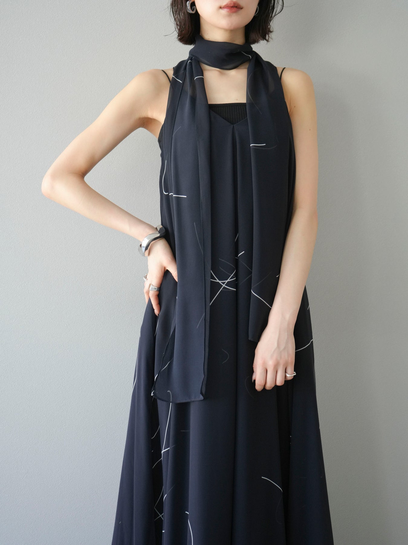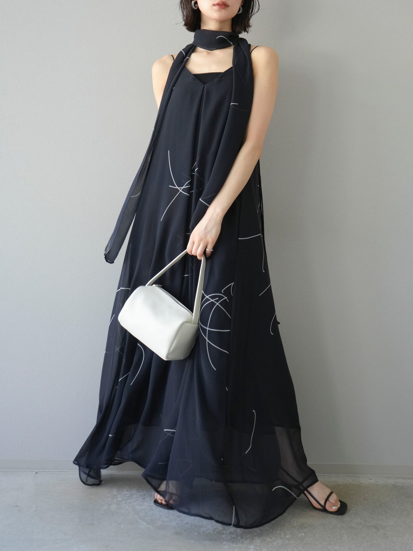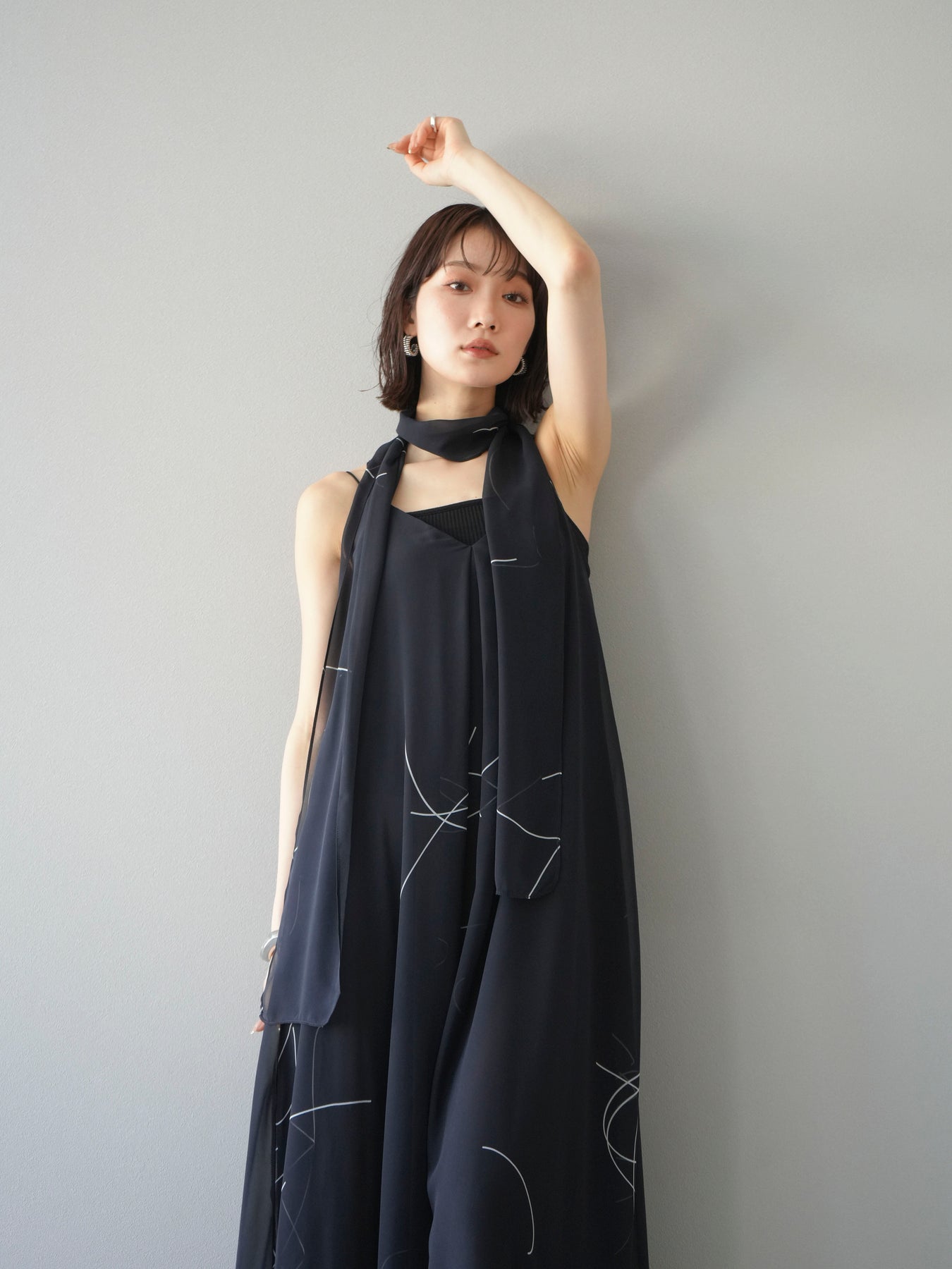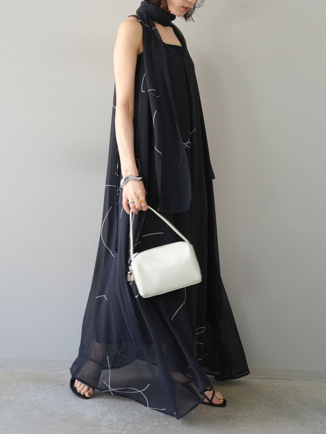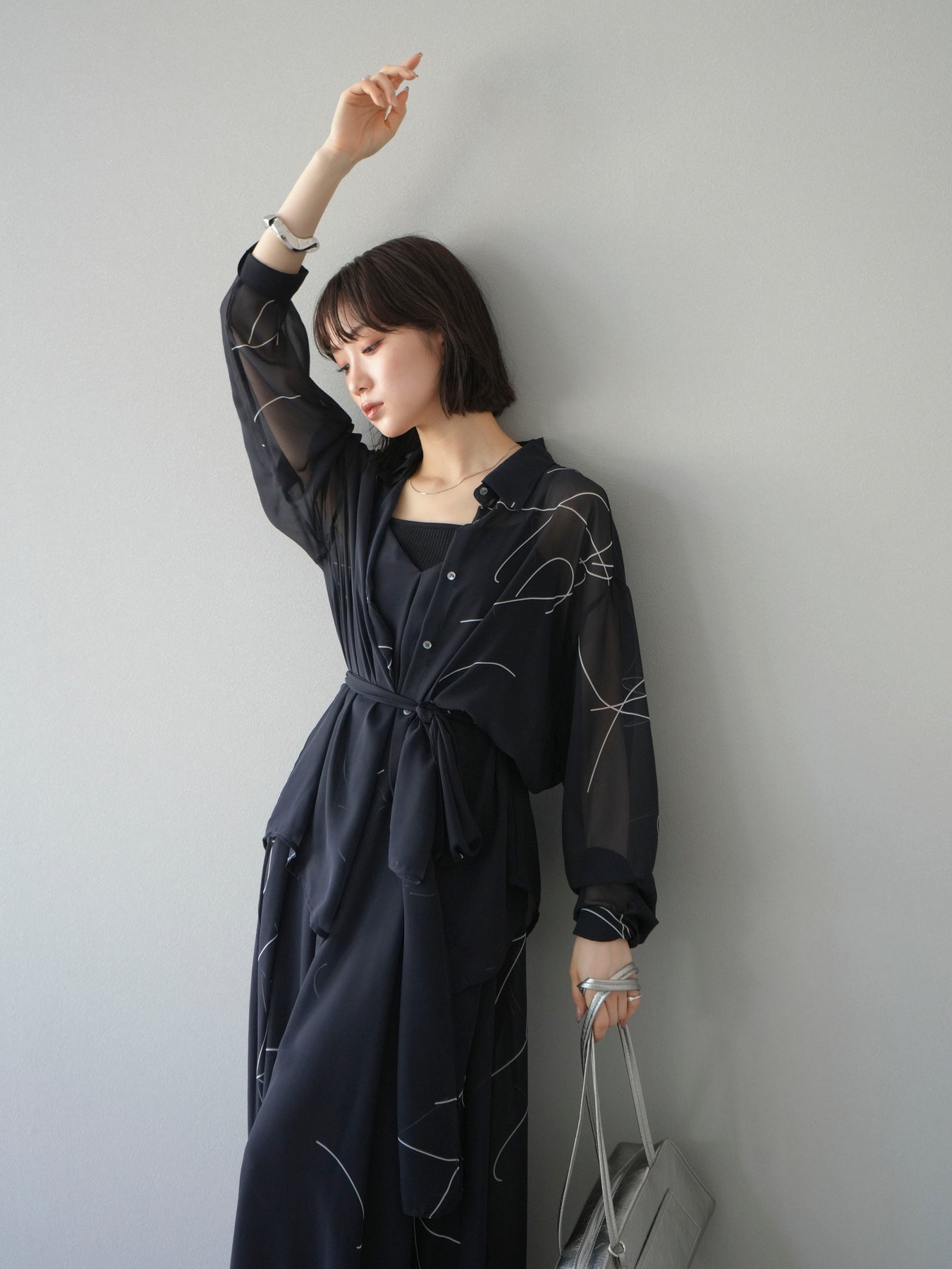 這款吊帶洋裝採用輕盈透明的雪紡面料製成,並飾有精緻的筆觸圖案。寬鬆的喇叭形輪廓隨著動作優雅擺動,只需一件即可打造優雅造型。精緻的肩帶使低胸設計更加利落,垂墜的面料營造出優雅而柔美的氛圍。您可以將其搭配剪裁縫製的內搭,或內搭襯衫或夾克,多種穿著方式。它是春夏季度假和外出的理想之選。 ※除下裝、吊帶背心(內衣)以外的商品均不含內衣。