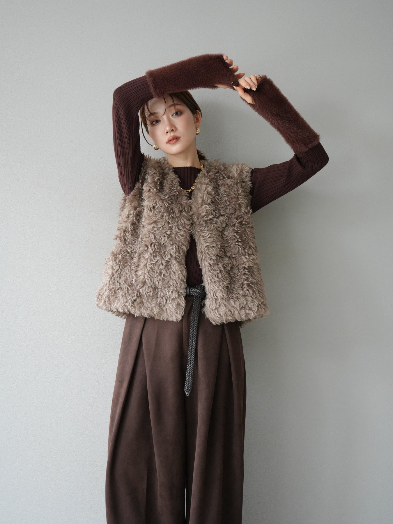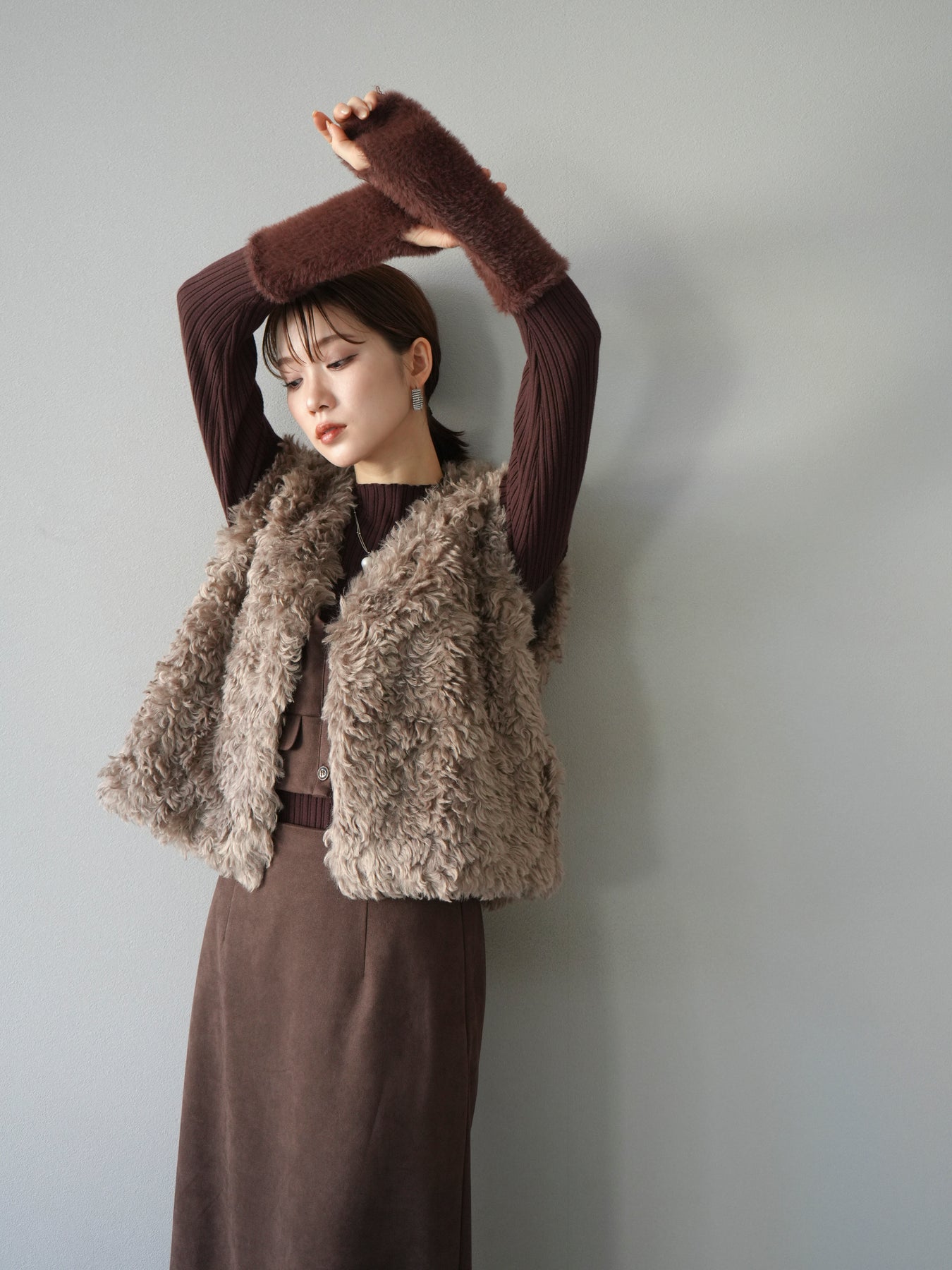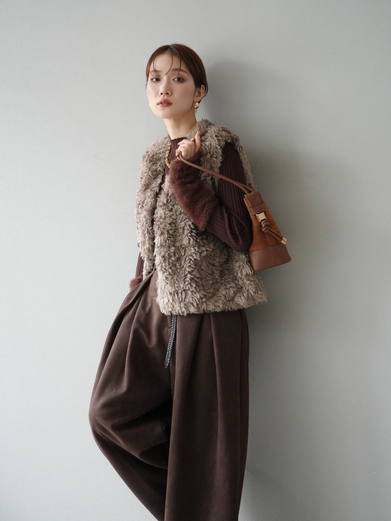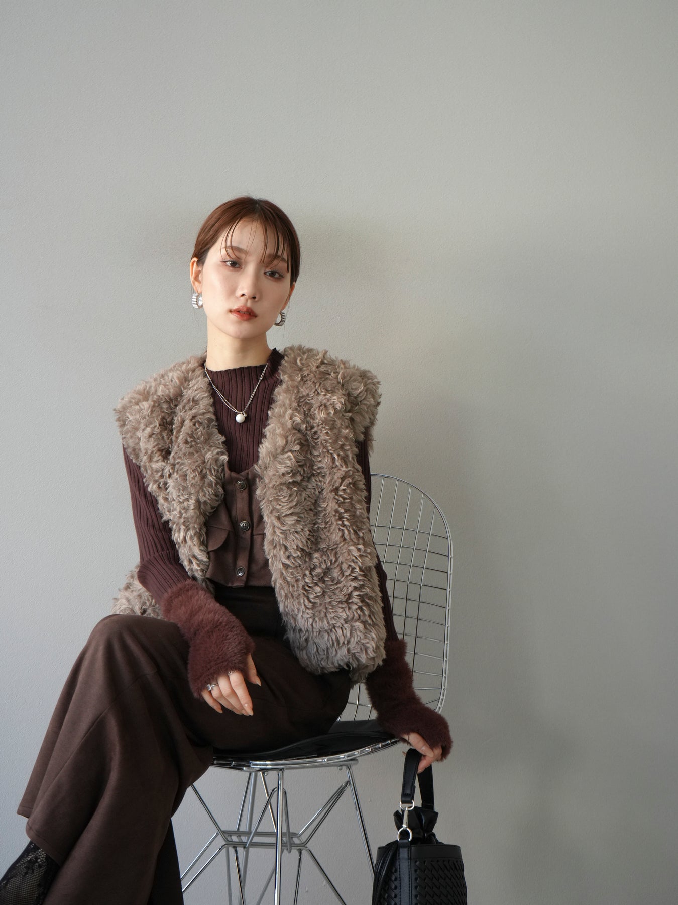 ふんわりとしたプードルファー素材がシーズンムードを高めるショートベスト。コンパクトな丈感でバランスが取りやすく、どんなコーディネートにも羽織るだけで立体感をプラスしてくれます。柔らかい質感で軽やかな着心地ながら、存在感のあるデザインがスタイリングの主役に。シャツやワンピースの上からレイヤードすればこなれ感が生まれ、デイリーから特別なお出かけまで幅広く活躍するアイテムです。 ※ボトムス、キャミソール(インナー)以外の商品は一律でインナーは付属していません。