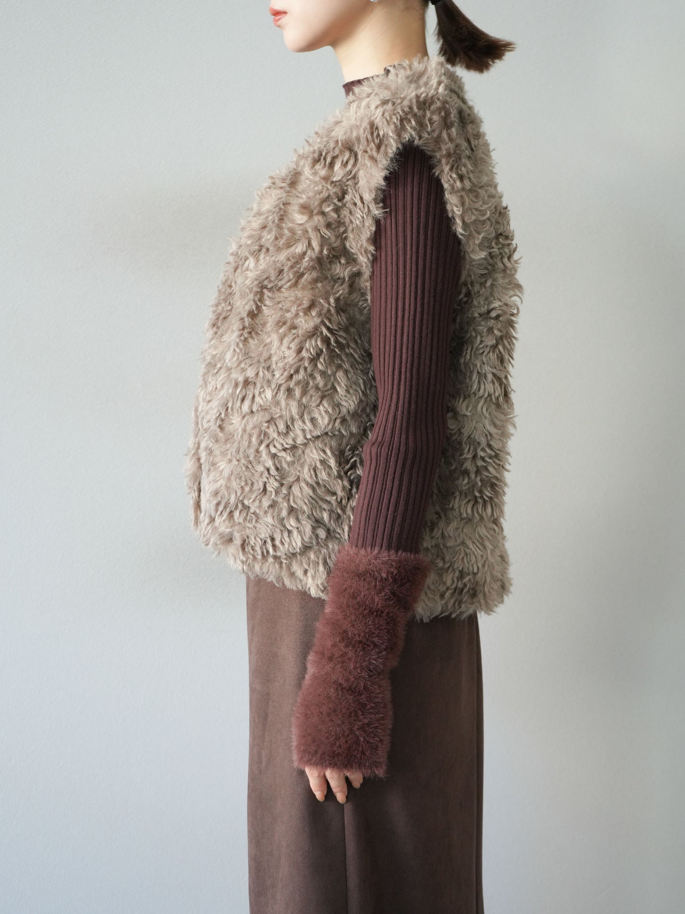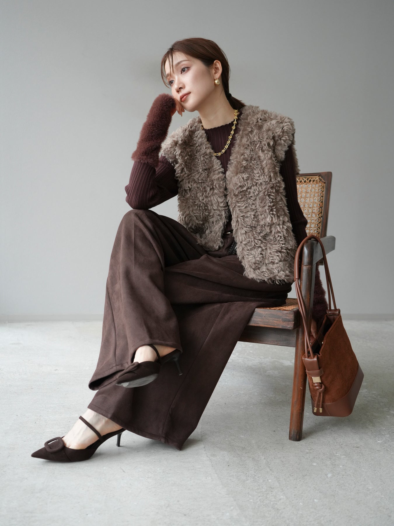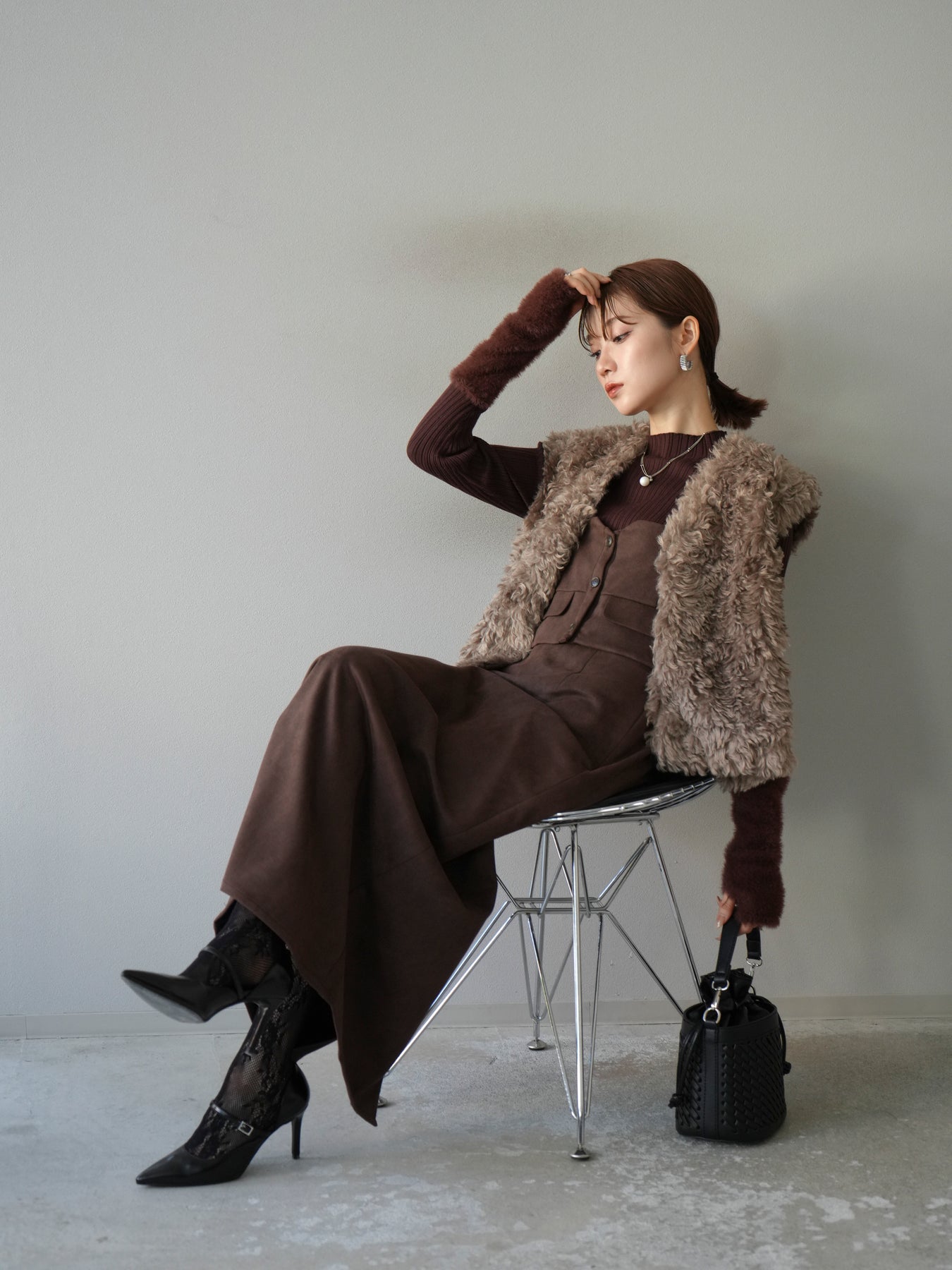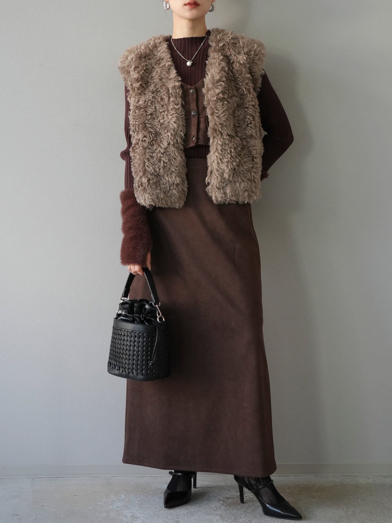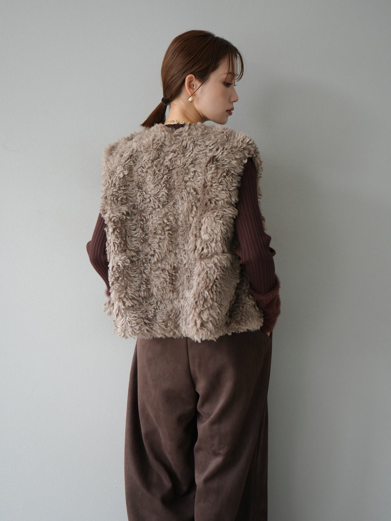 ふんわりとしたプードルファー素材がシーズンムードを高めるショートベスト。コンパクトな丈感でバランスが取りやすく、どんなコーディネートにも羽織るだけで立体感をプラスしてくれます。柔らかい質感で軽やかな着心地ながら、存在感のあるデザインがスタイリングの主役に。シャツやワンピースの上からレイヤードすればこなれ感が生まれ、デイリーから特別なお出かけまで幅広く活躍するアイテムです。 ※ボトムス、キャミソール(インナー)以外の商品は一律でインナーは付属していません。