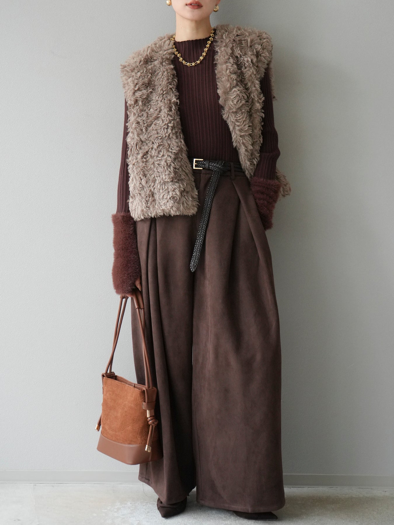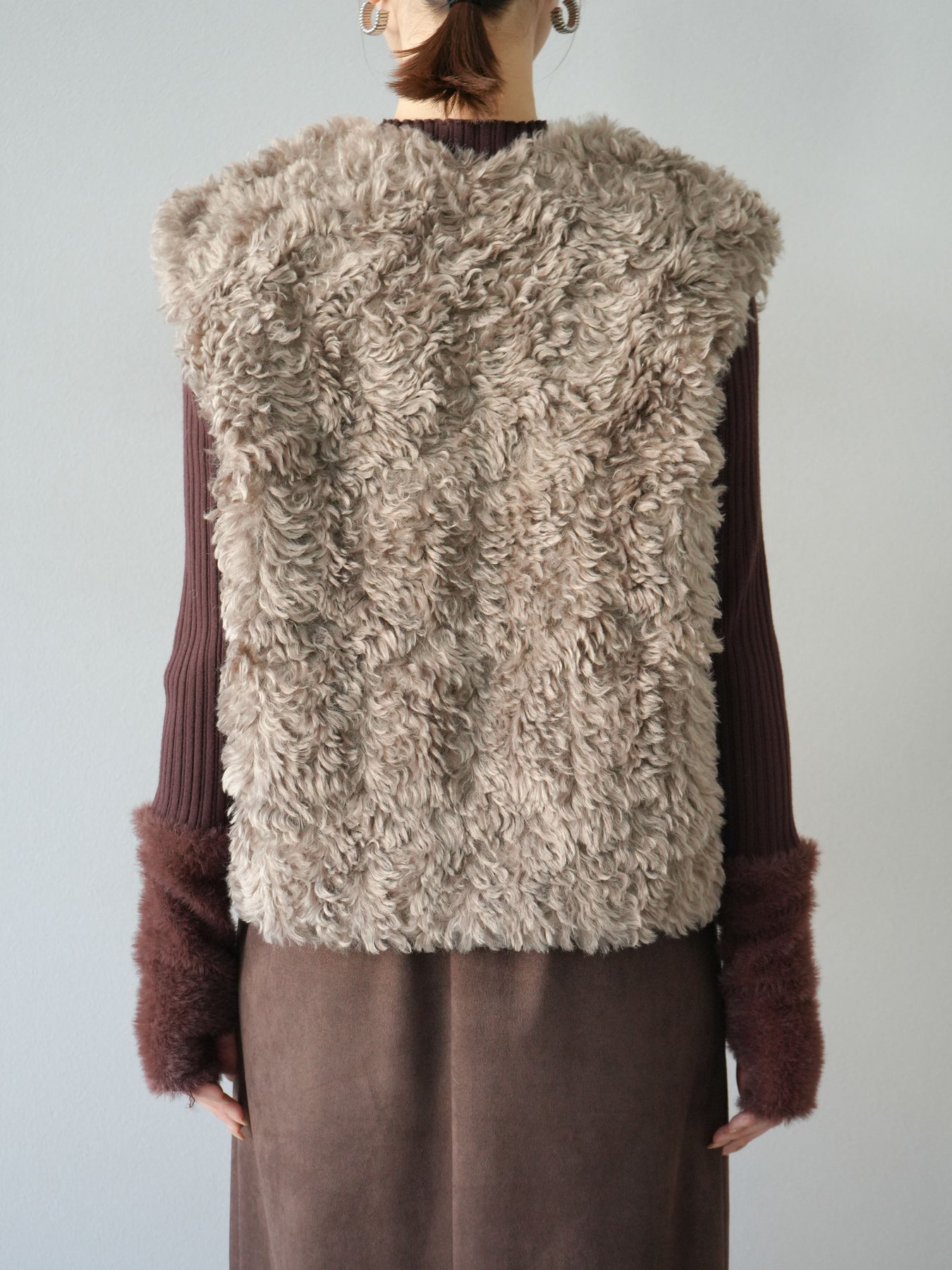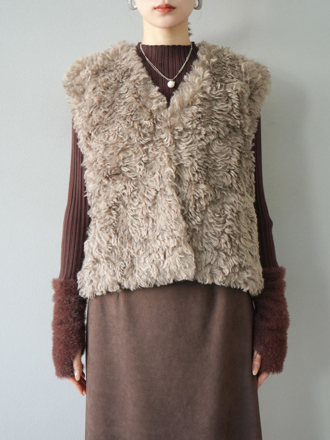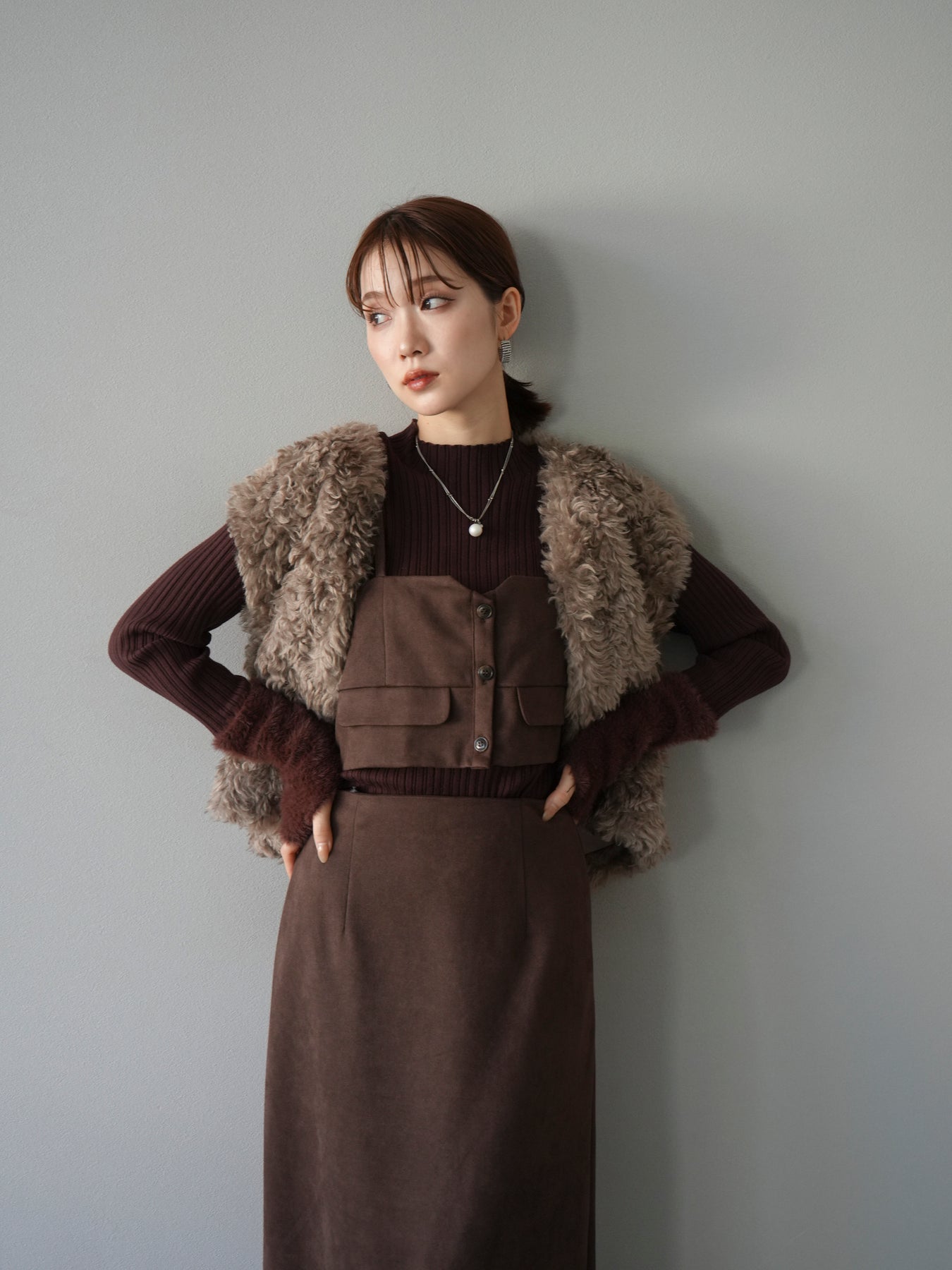 ふんわりとしたプードルファー素材がシーズンムードを高めるショートベスト。コンパクトな丈感でバランスが取りやすく、どんなコーディネートにも羽織るだけで立体感をプラスしてくれます。柔らかい質感で軽やかな着心地ながら、存在感のあるデザインがスタイリングの主役に。シャツやワンピースの上からレイヤードすればこなれ感が生まれ、デイリーから特別なお出かけまで幅広く活躍するアイテムです。 ※ボトムス、キャミソール(インナー)以外の商品は一律でインナーは付属していません。