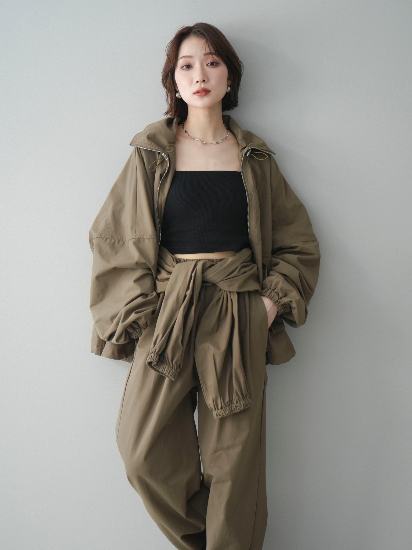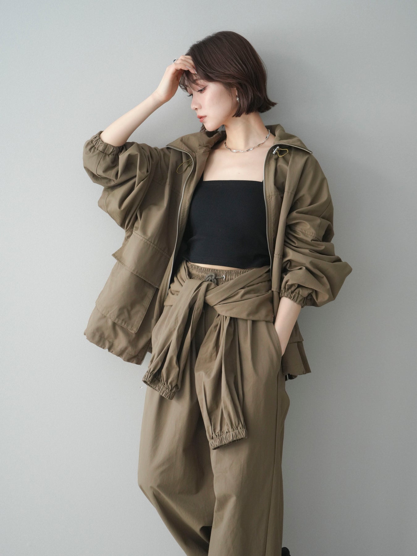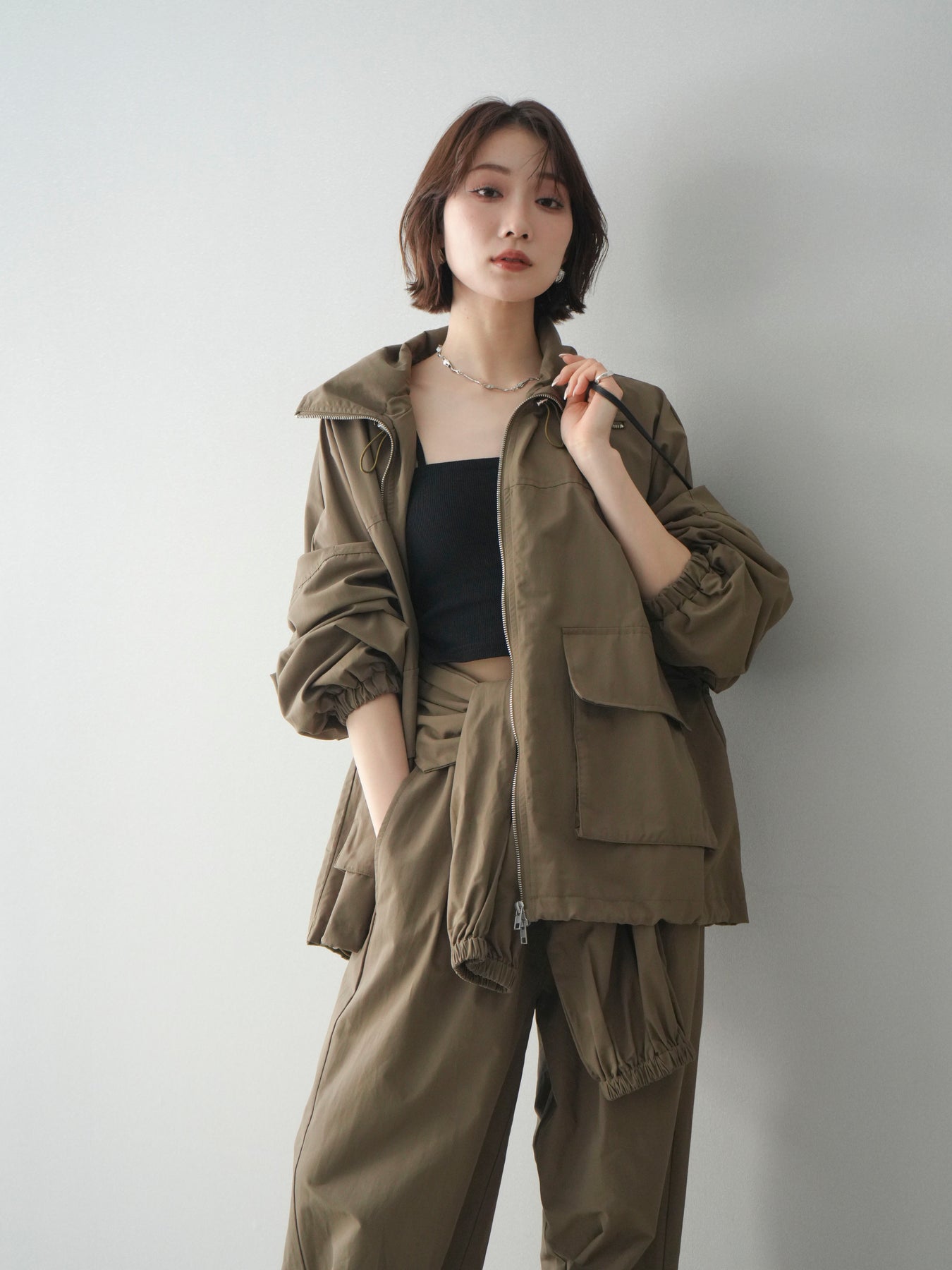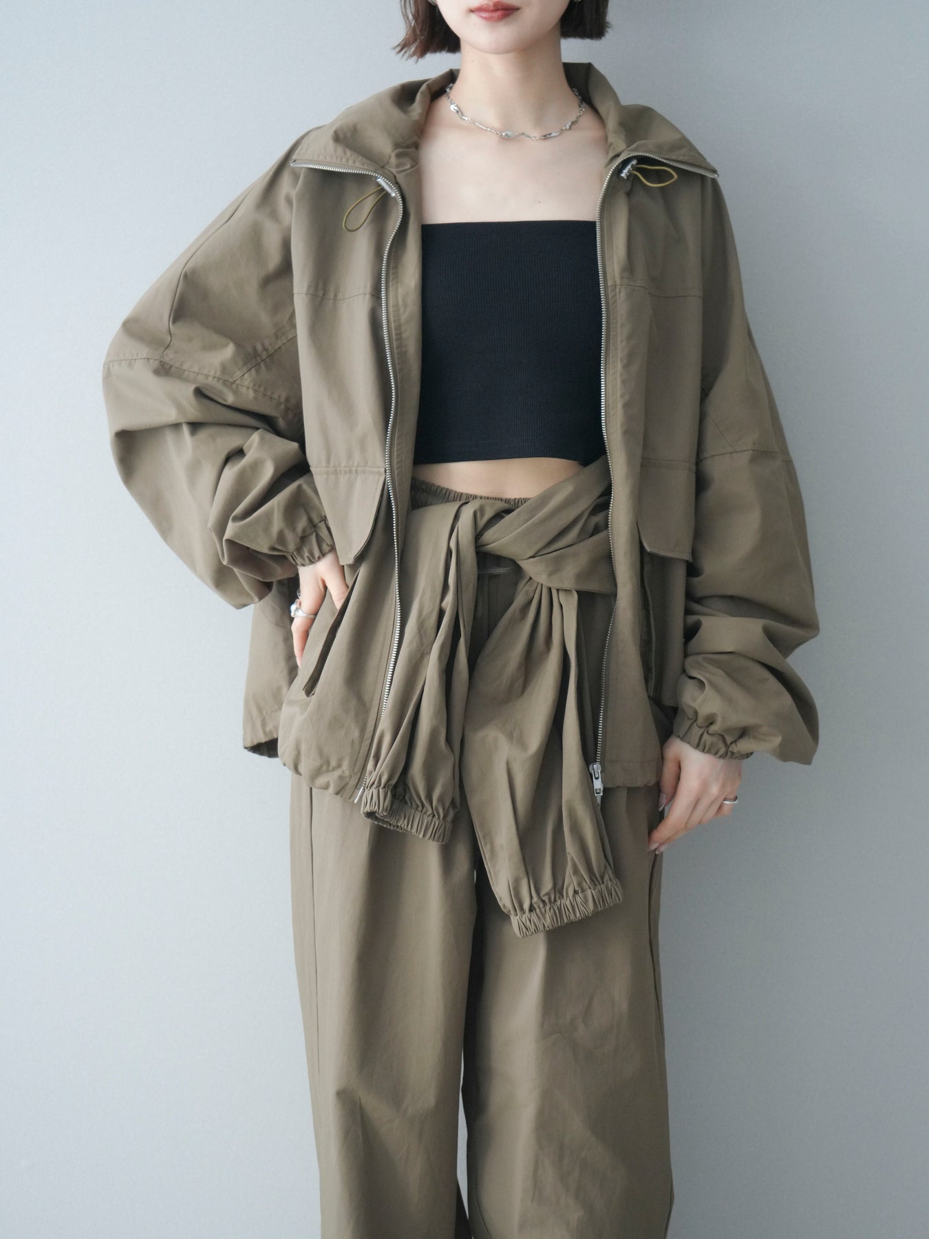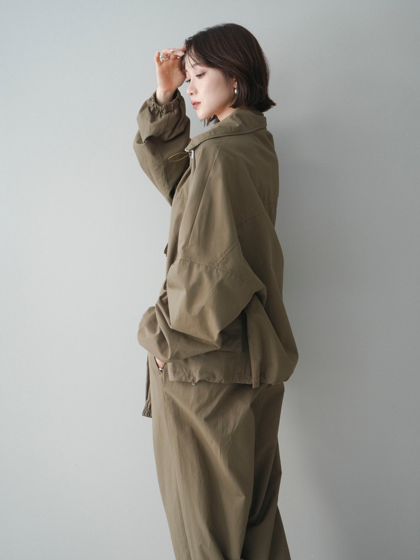 程よいハリ感のあるコットンナイロン素材を使用した、ジップ仕様のブルゾン。存在感のあるビッグポケットがデザインのアクセントとなり、シンプルなコーディネートにさっと羽織るだけでこなれた印象に仕上がります。ゆとりのあるシルエットと、裾・袖口のギャザーデザインが立体感を演出し、カジュアルながらもバランスの取れた一着に。軽やかな着心地で、季節の変わり目のアウターとしてデイリーに活躍します。 ※ボトムス、キャミソール(インナー)以外の商品は一律でインナーは付属していません。