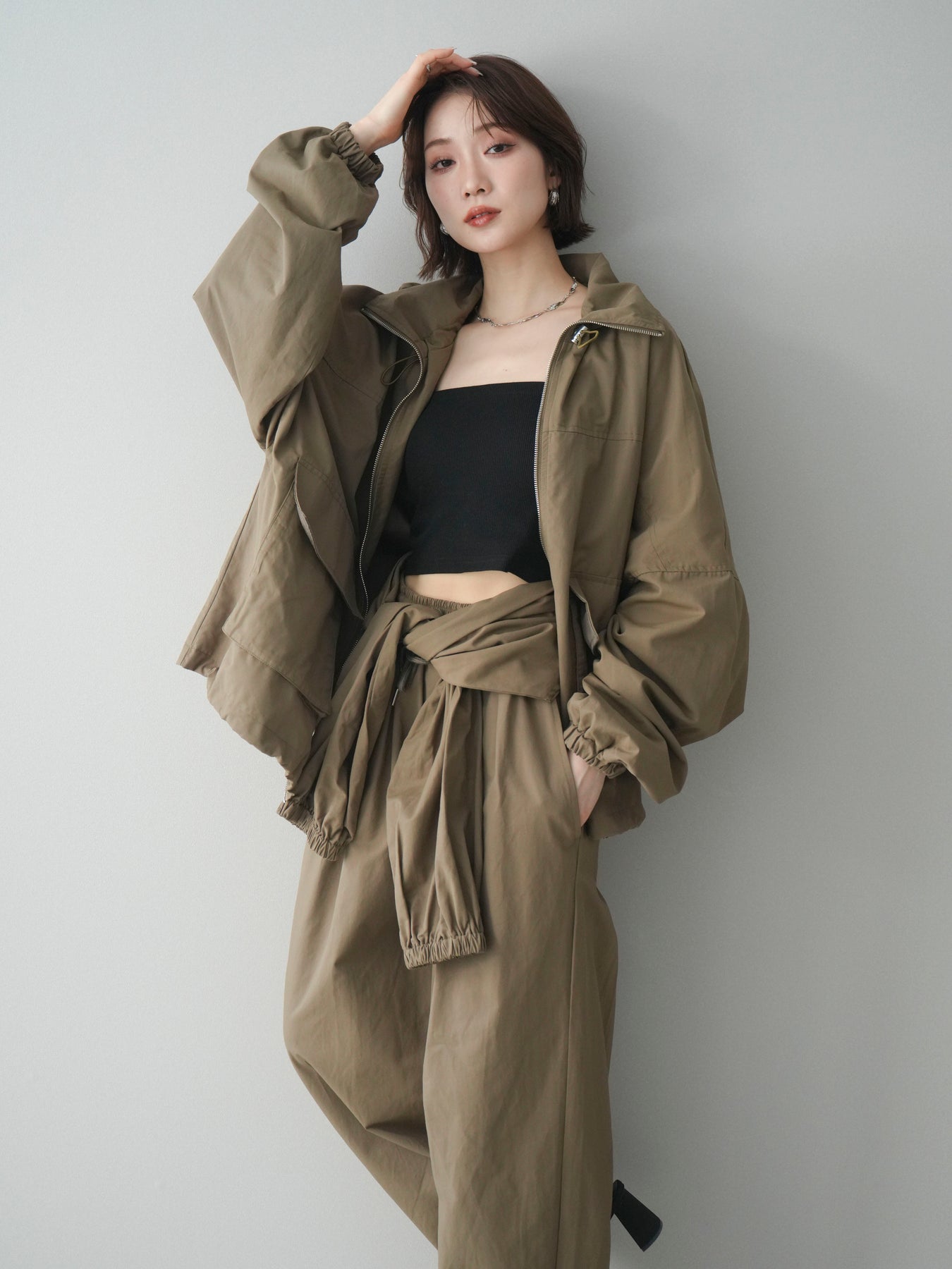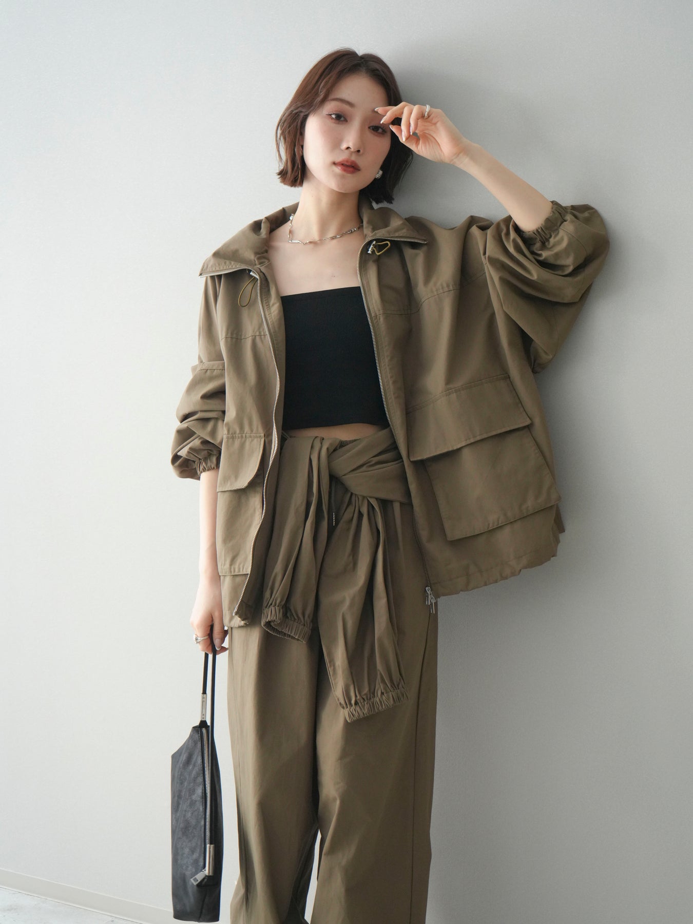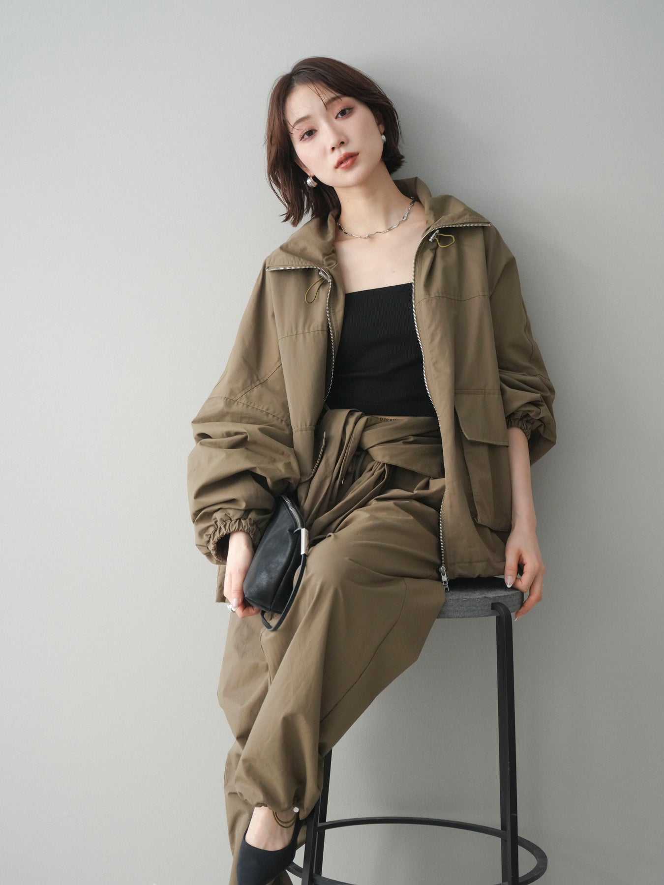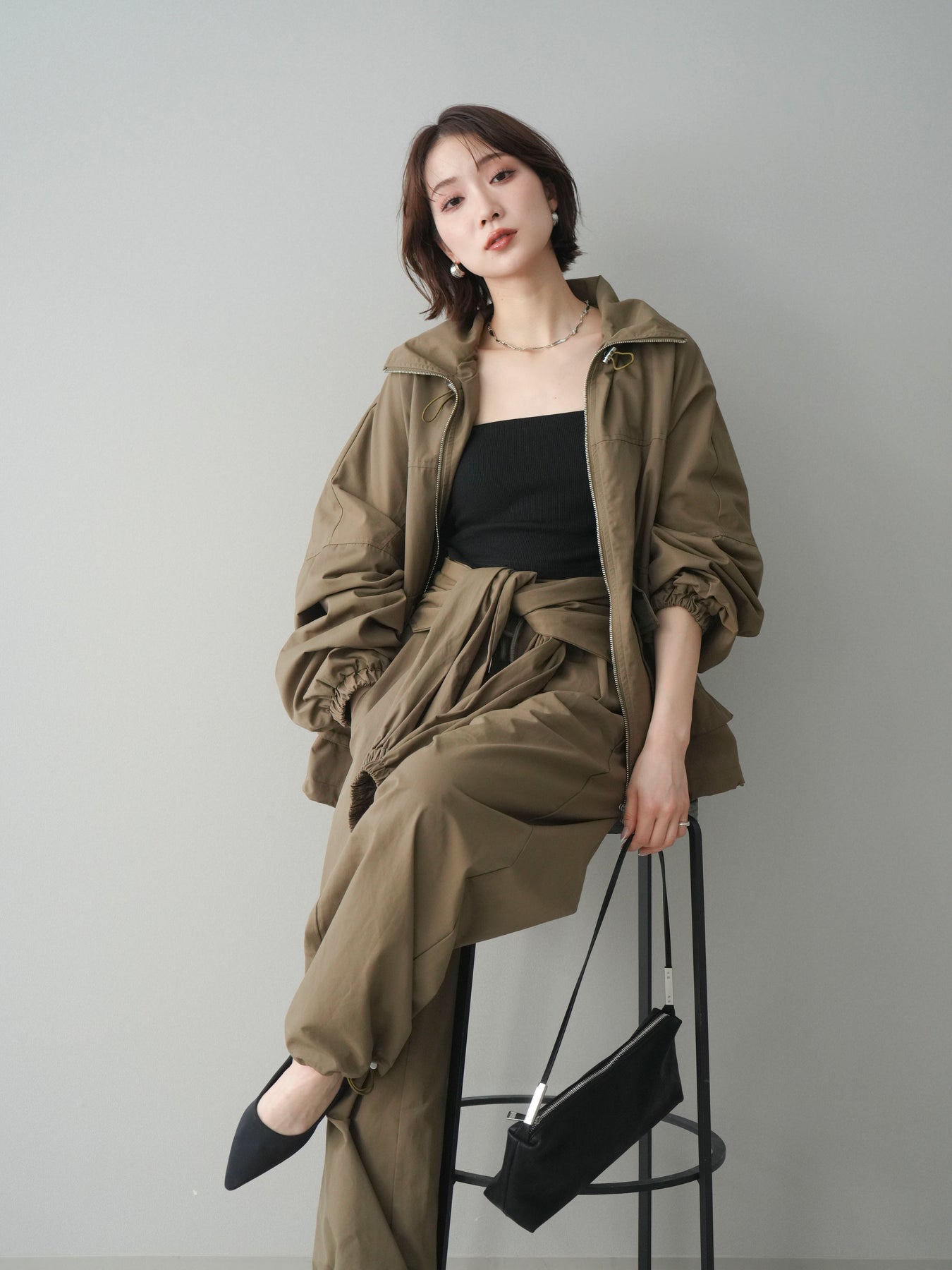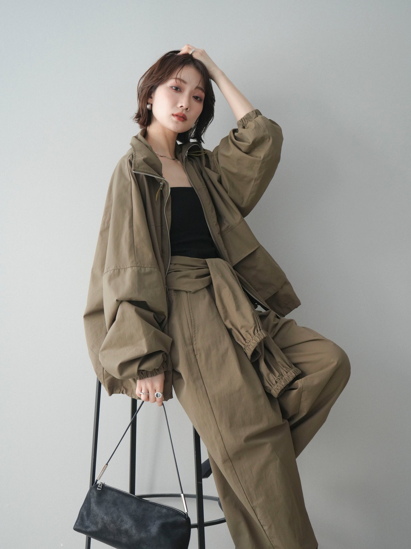 程よいハリ感のあるコットンナイロン素材を使用した、ジップ仕様のブルゾン。存在感のあるビッグポケットがデザインのアクセントとなり、シンプルなコーディネートにさっと羽織るだけでこなれた印象に仕上がります。ゆとりのあるシルエットと、裾・袖口のギャザーデザインが立体感を演出し、カジュアルながらもバランスの取れた一着に。軽やかな着心地で、季節の変わり目のアウターとしてデイリーに活躍します。 ※ボトムス、キャミソール(インナー)以外の商品は一律でインナーは付属していません。