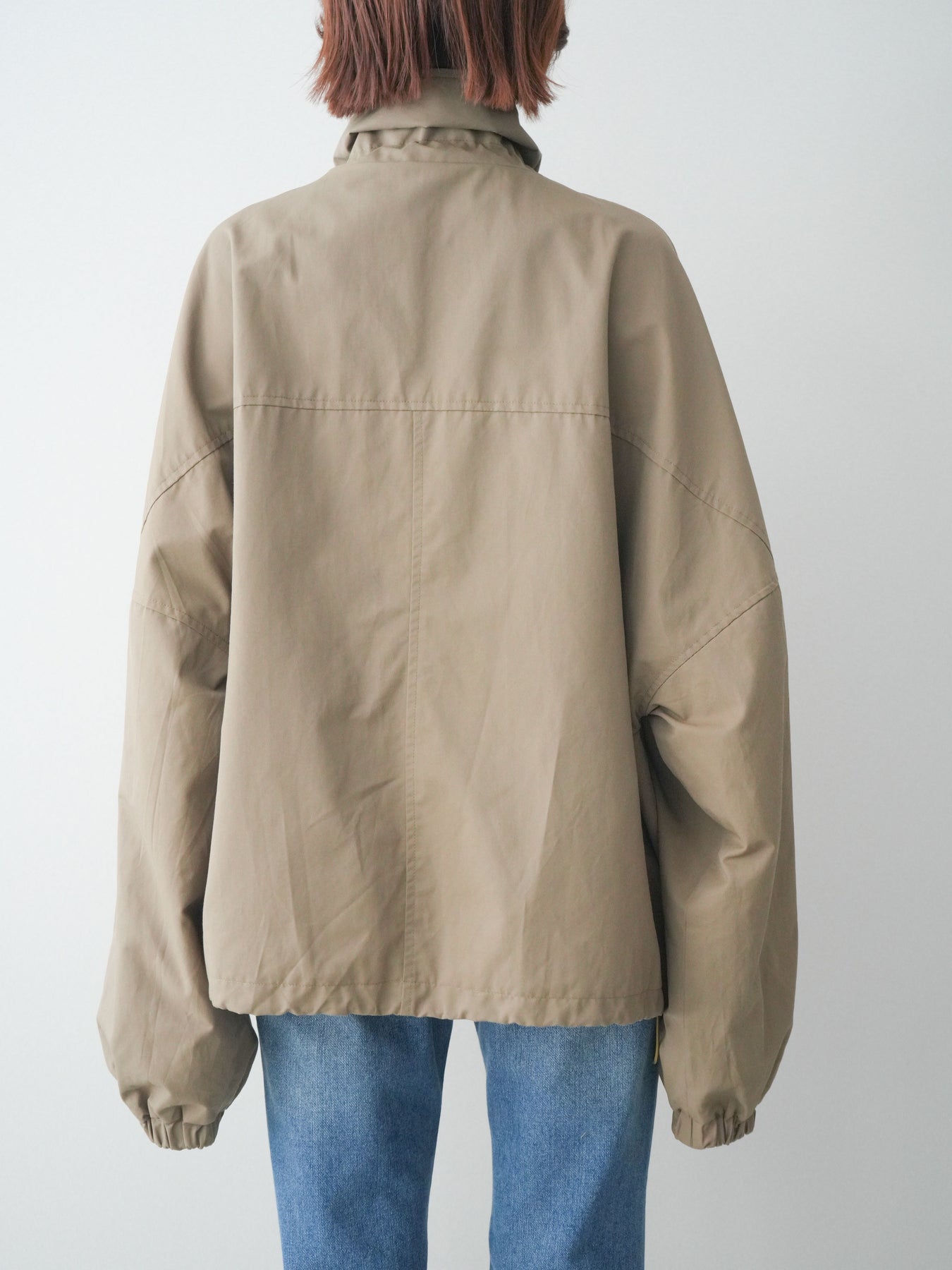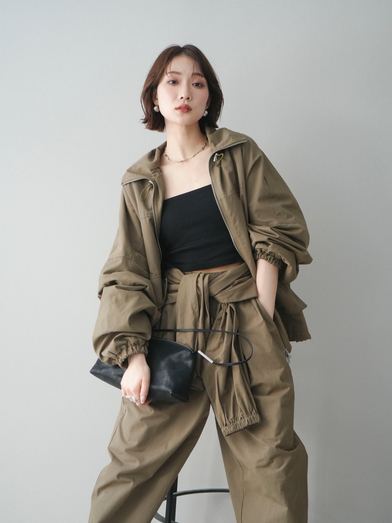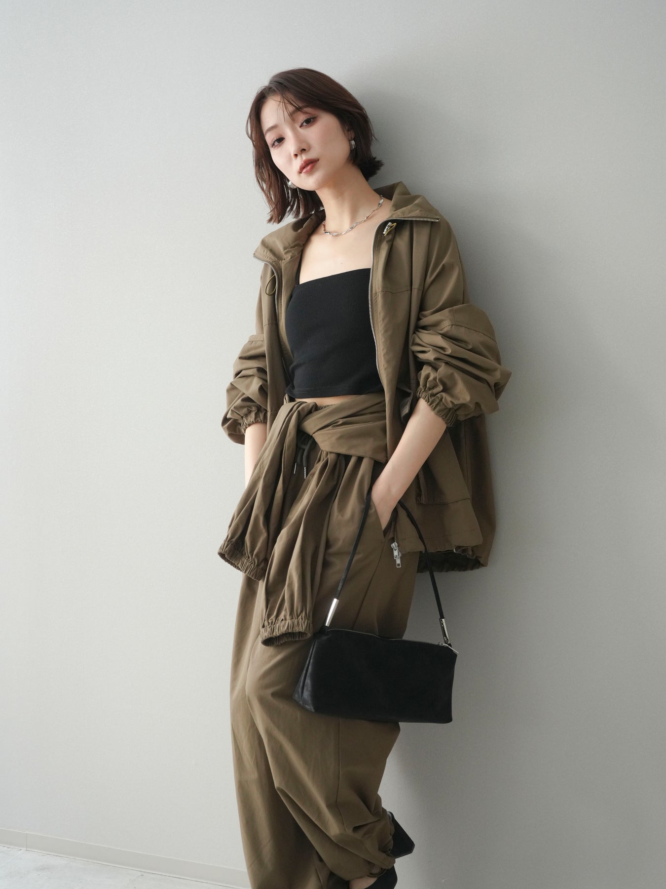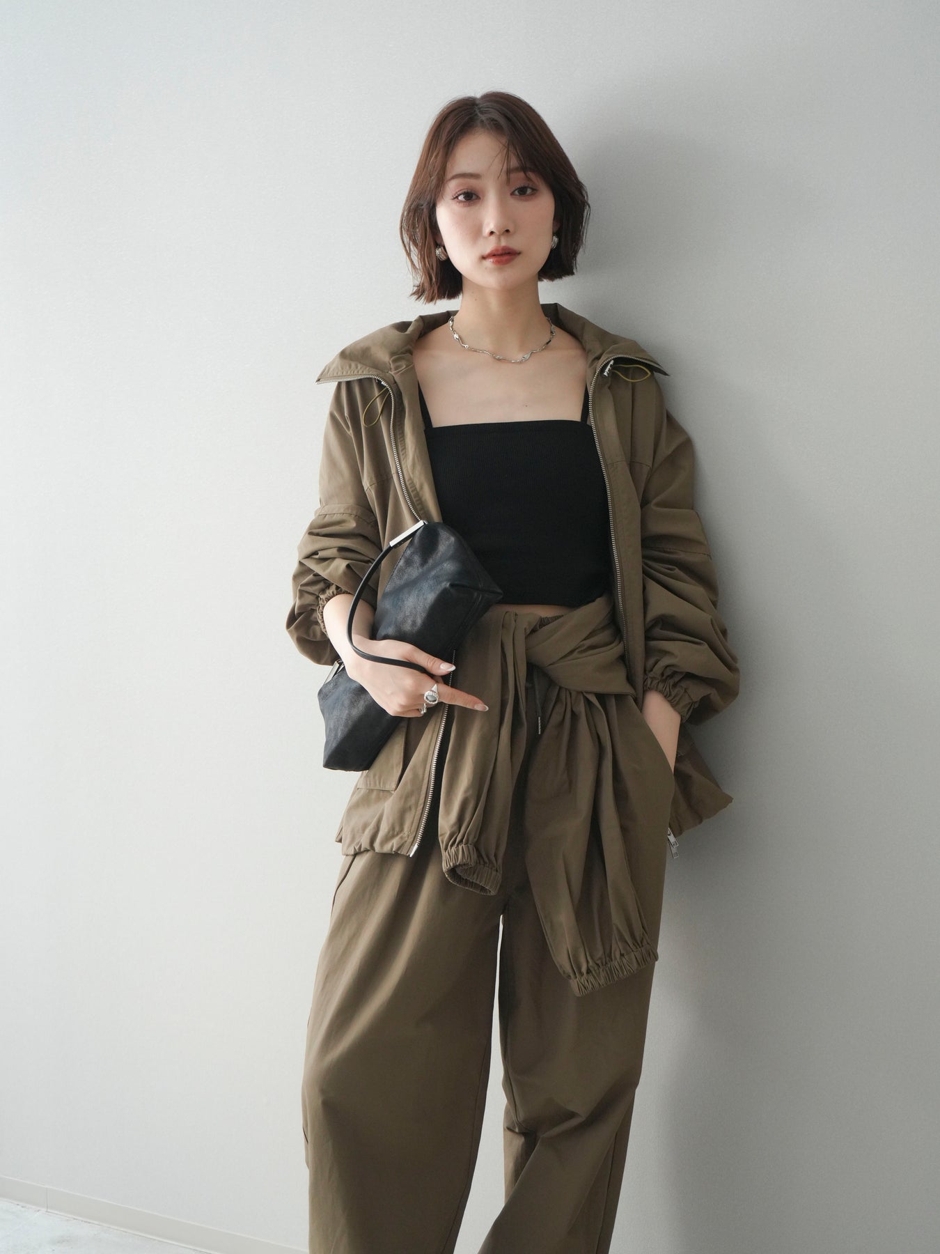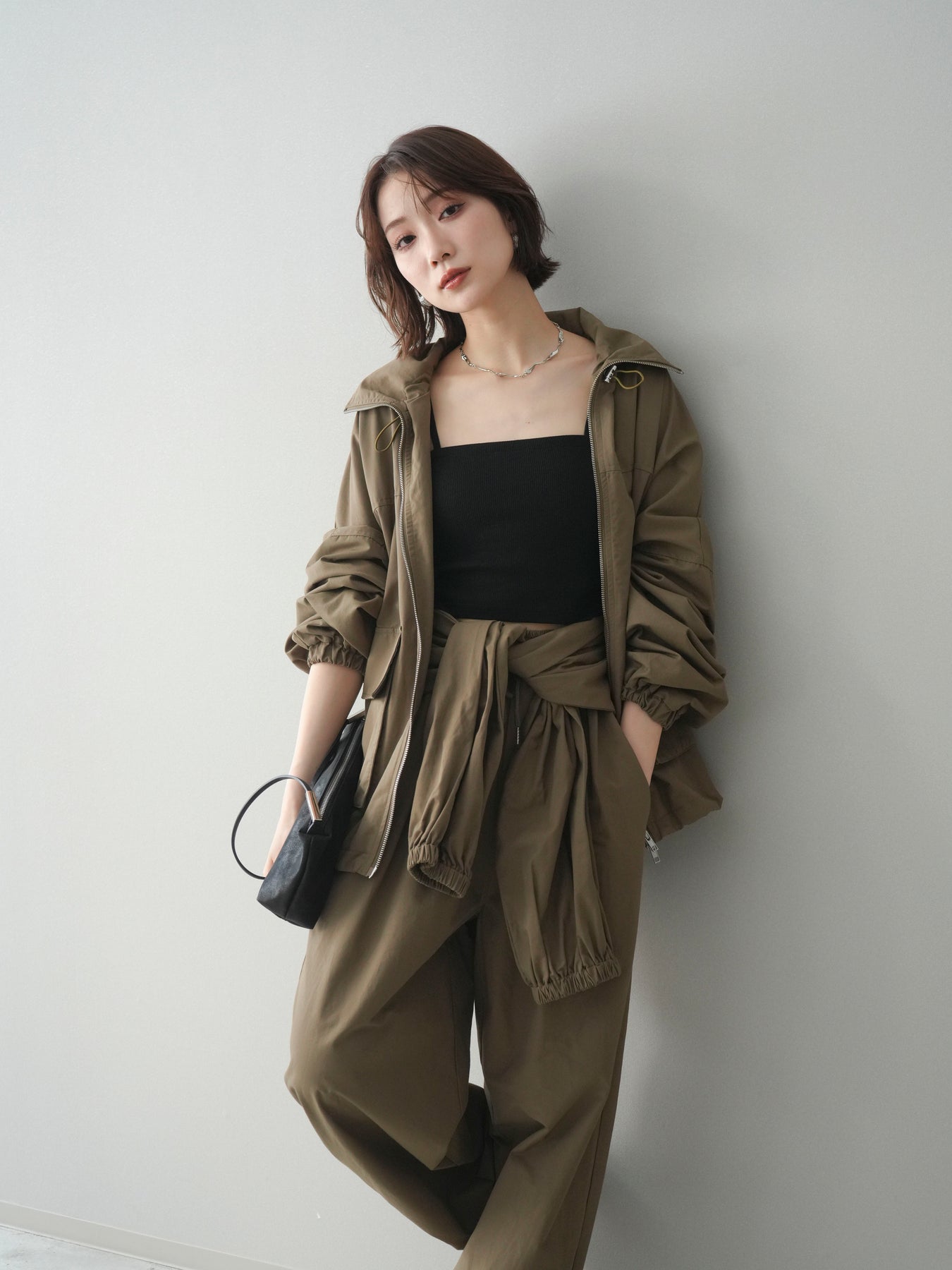 程よいハリ感のあるコットンナイロン素材を使用した、ジップ仕様のブルゾン。存在感のあるビッグポケットがデザインのアクセントとなり、シンプルなコーディネートにさっと羽織るだけでこなれた印象に仕上がります。ゆとりのあるシルエットと、裾・袖口のギャザーデザインが立体感を演出し、カジュアルながらもバランスの取れた一着に。軽やかな着心地で、季節の変わり目のアウターとしてデイリーに活躍します。 ※ボトムス、キャミソール(インナー)以外の商品は一律でインナーは付属していません。