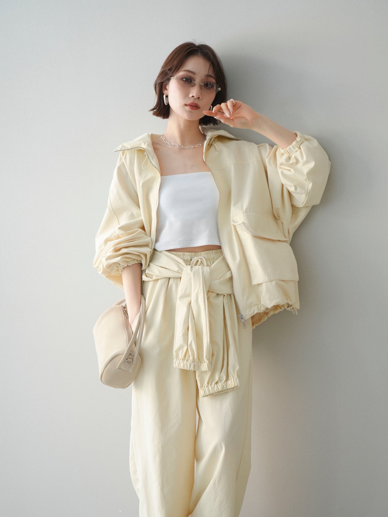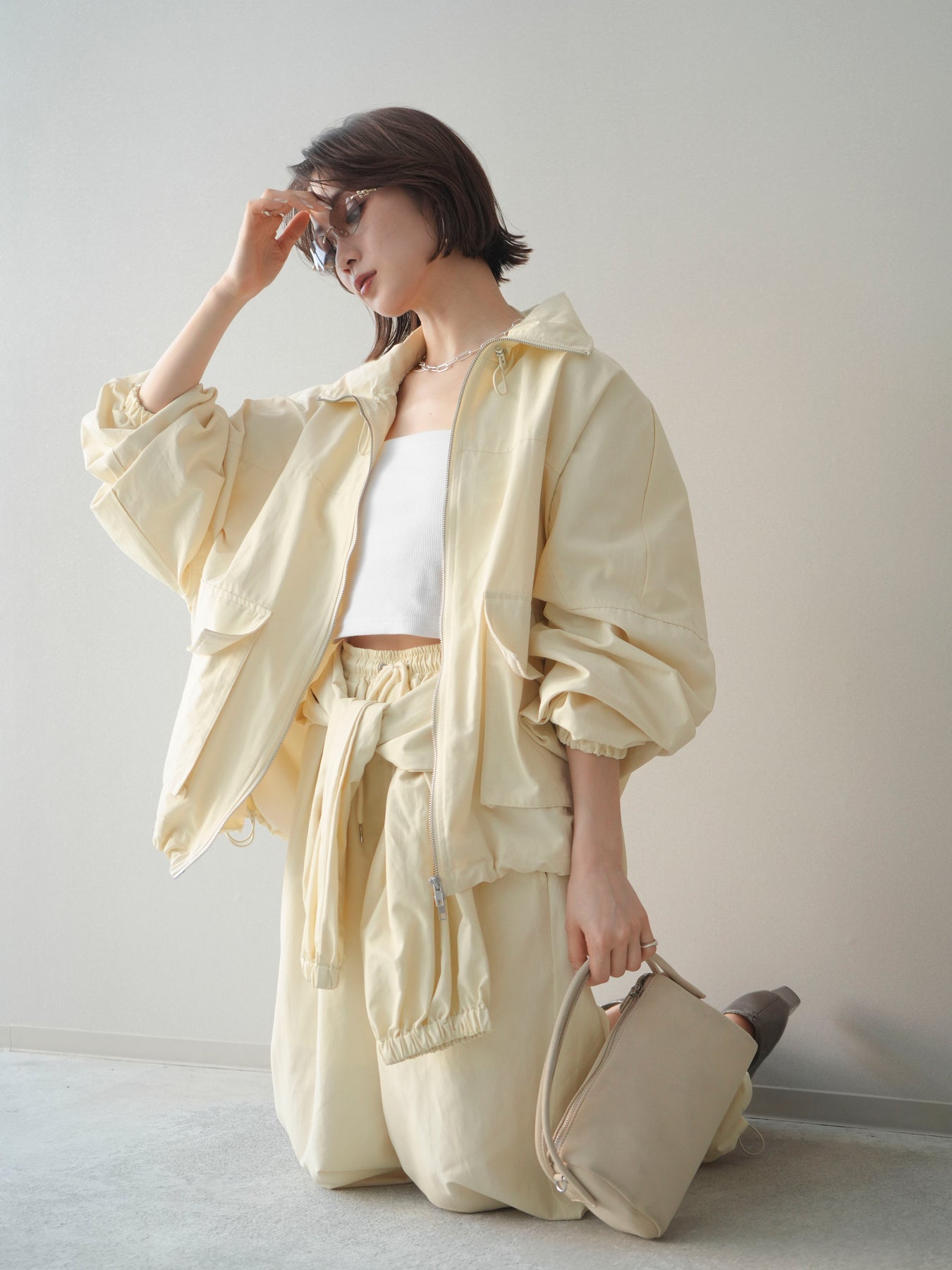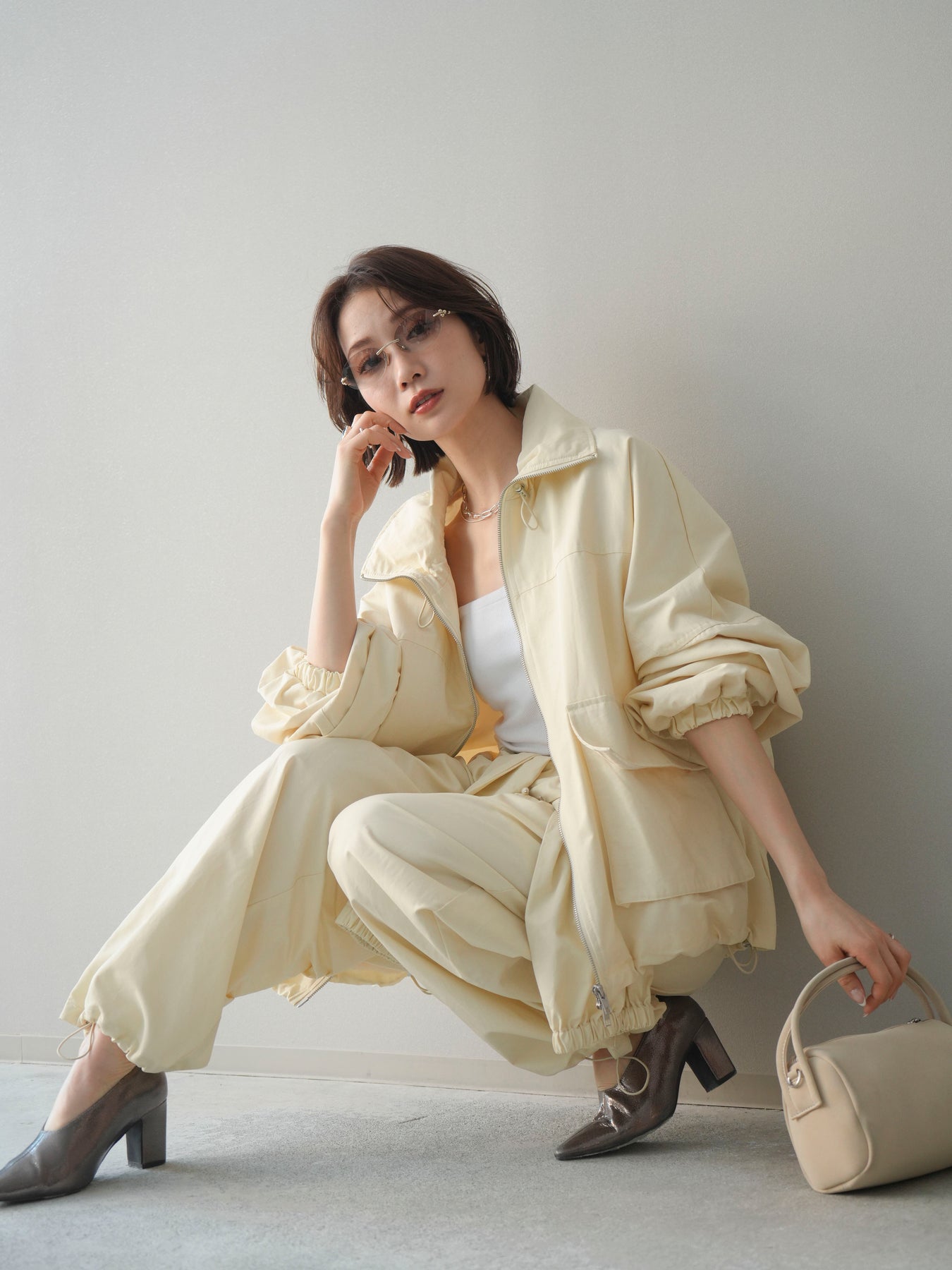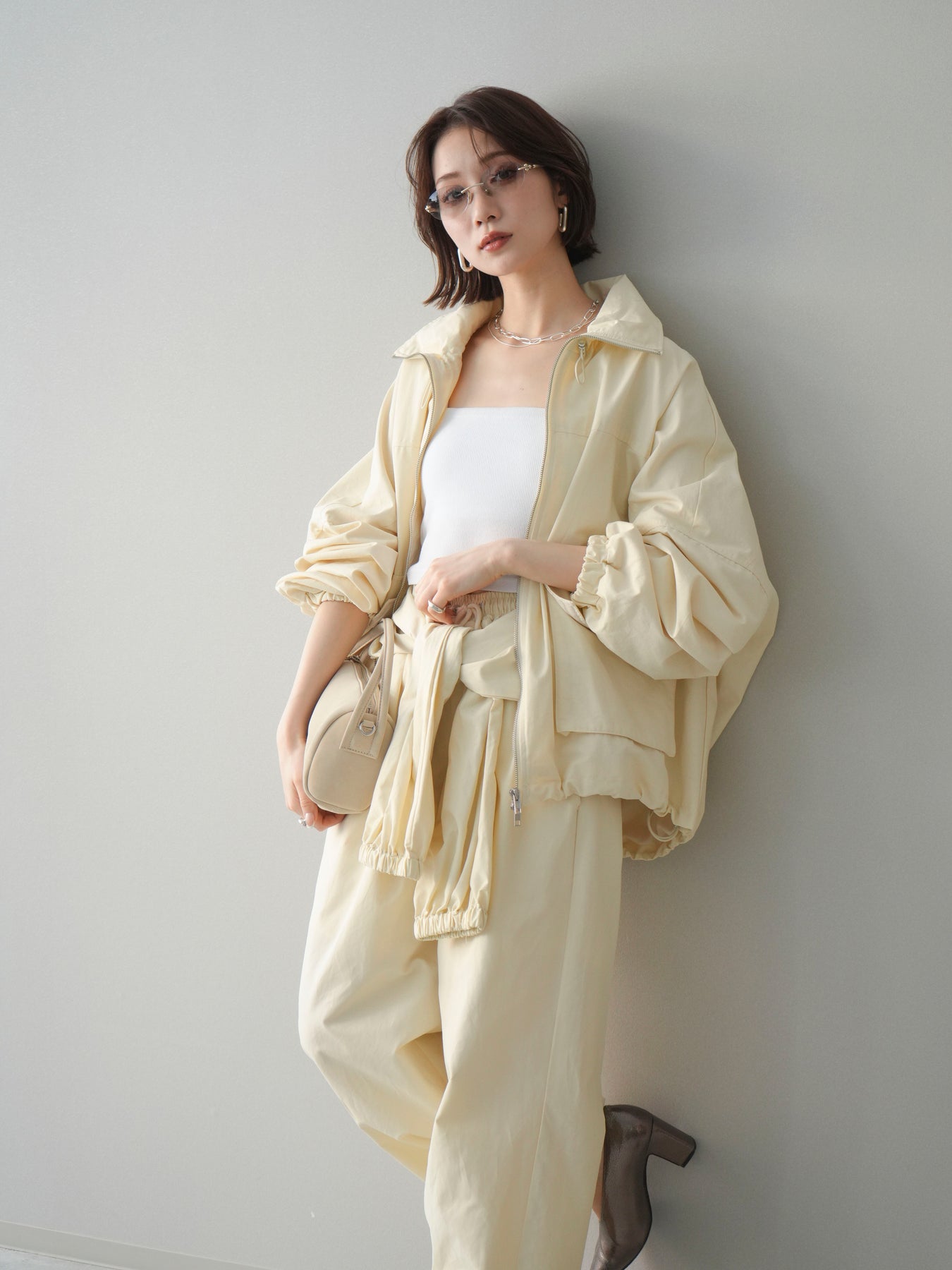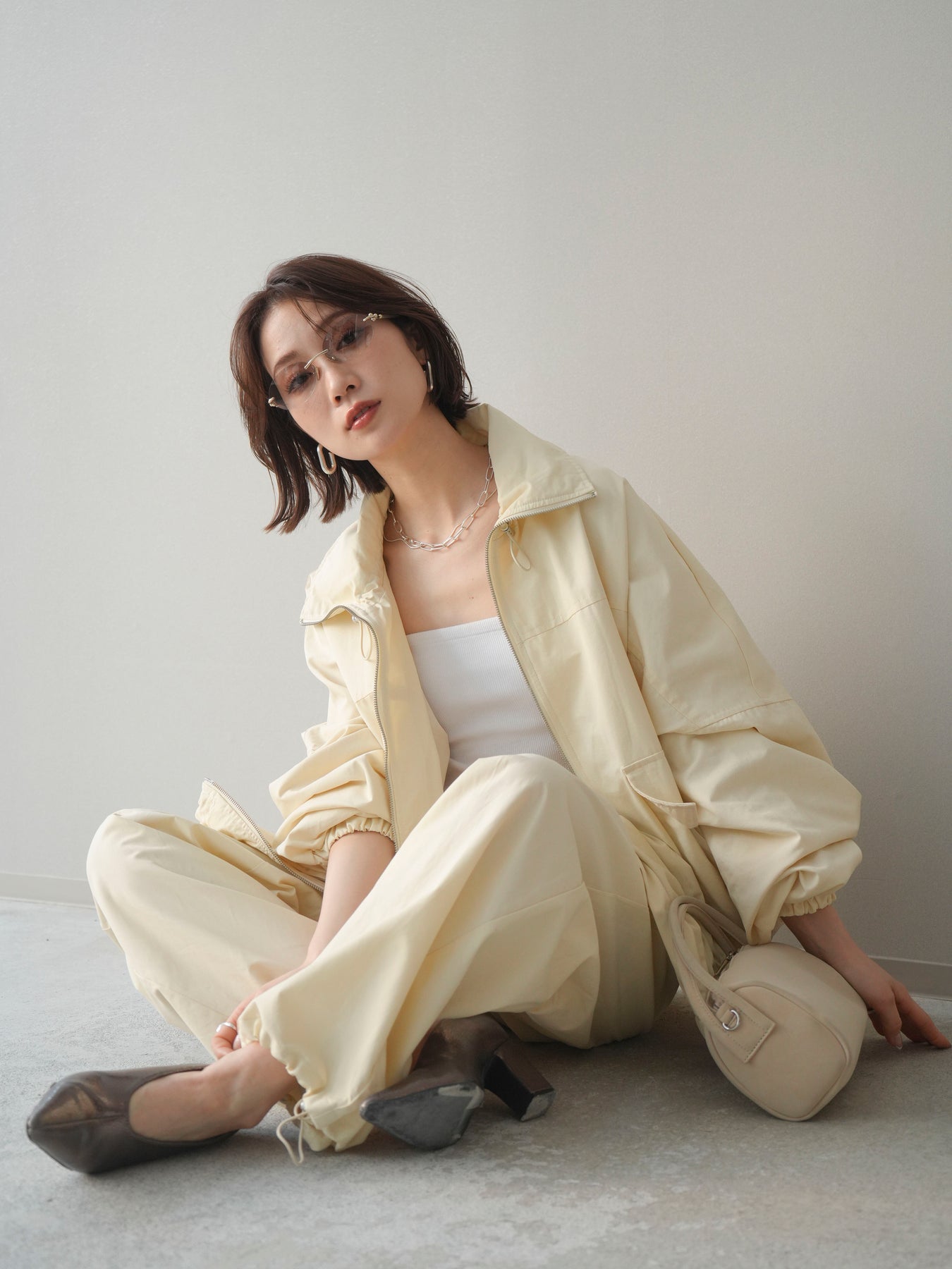 程よいハリ感のあるコットンナイロン素材を使用した、ジップ仕様のブルゾン。存在感のあるビッグポケットがデザインのアクセントとなり、シンプルなコーディネートにさっと羽織るだけでこなれた印象に仕上がります。ゆとりのあるシルエットと、裾・袖口のギャザーデザインが立体感を演出し、カジュアルながらもバランスの取れた一着に。軽やかな着心地で、季節の変わり目のアウターとしてデイリーに活躍します。 ※ボトムス、キャミソール(インナー)以外の商品は一律でインナーは付属していません。