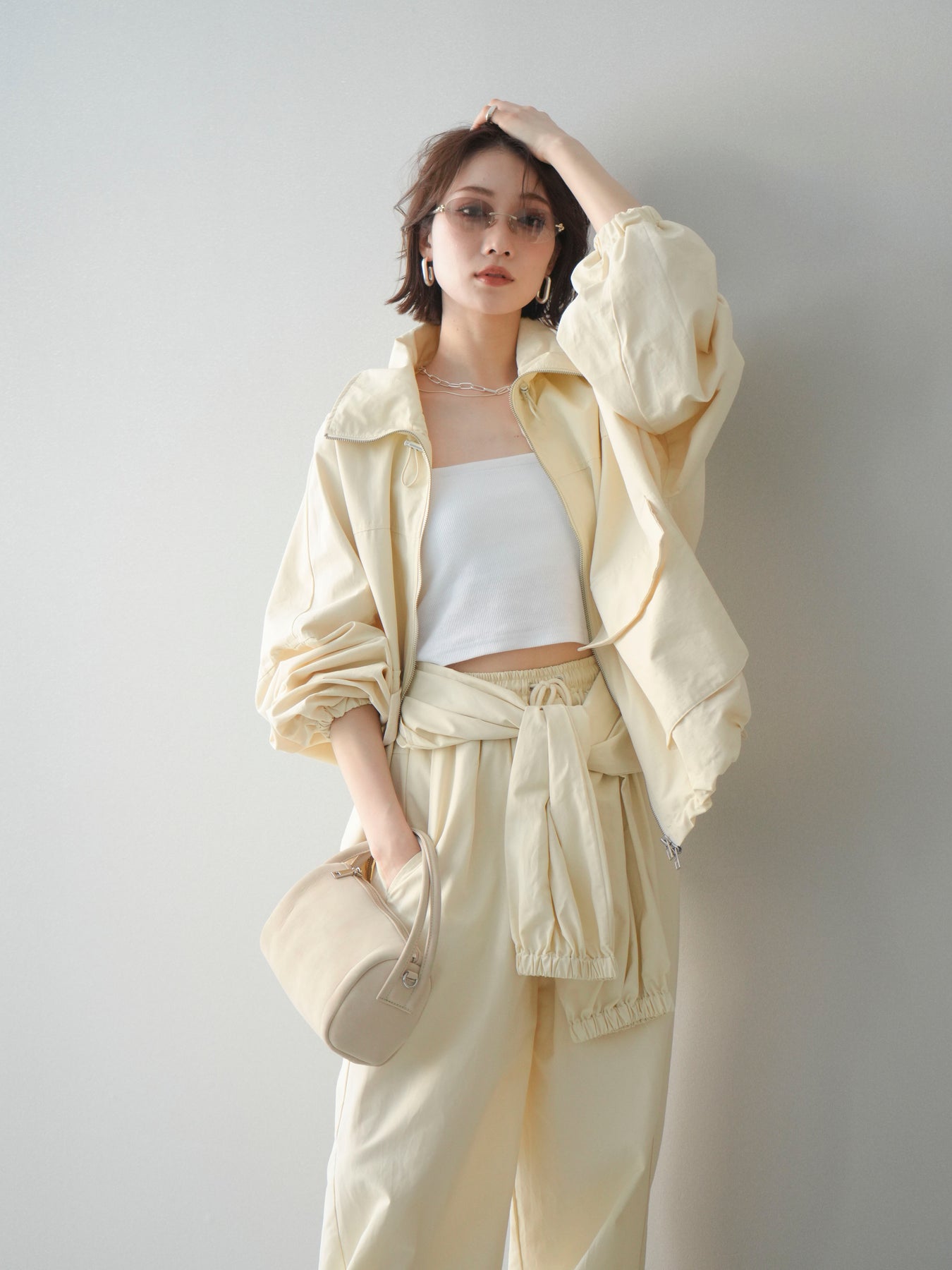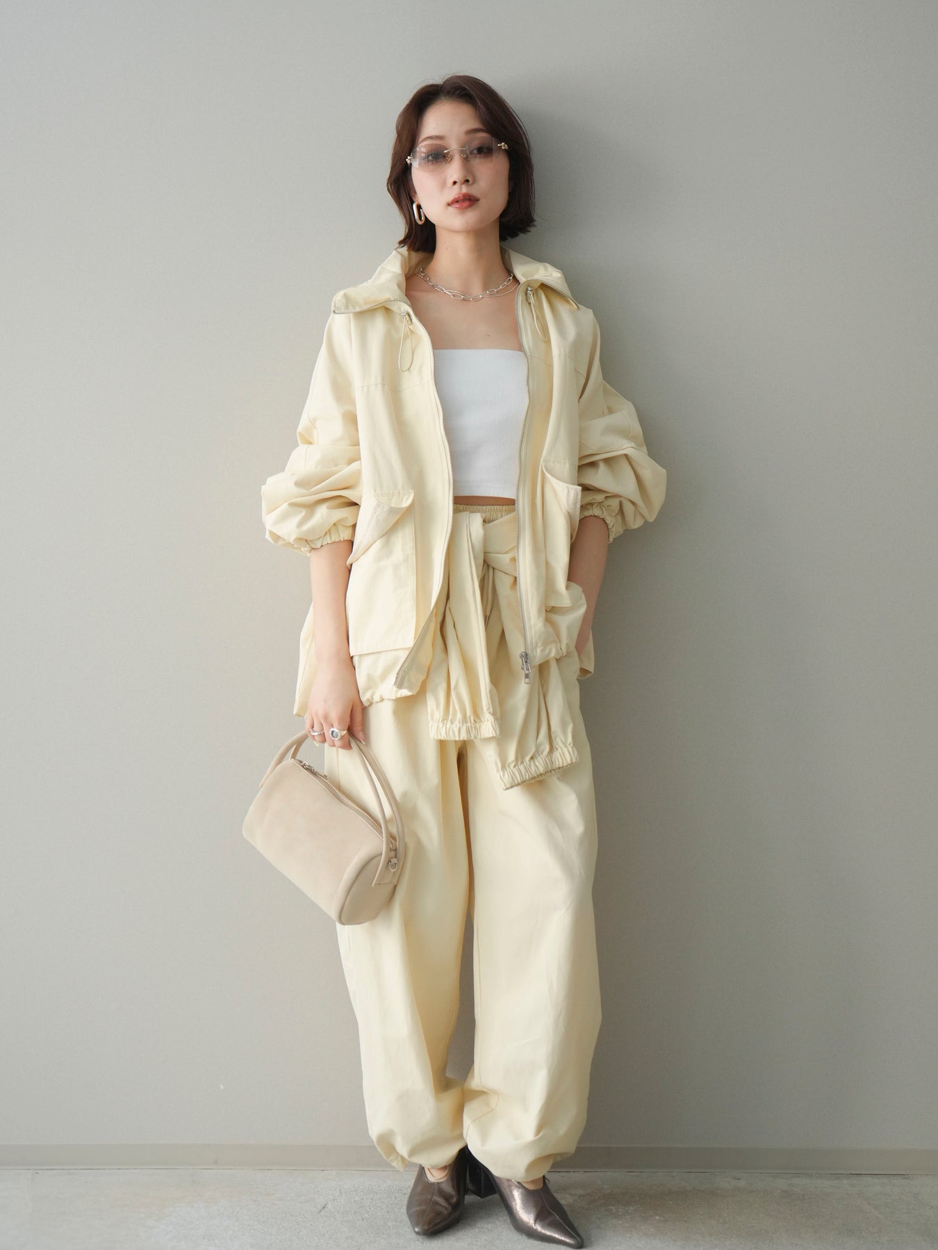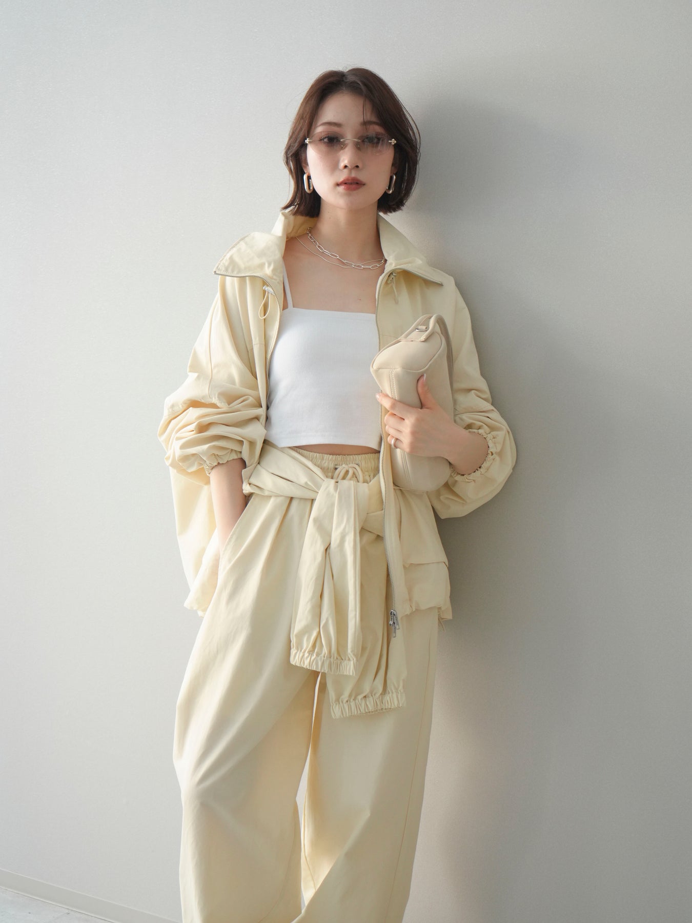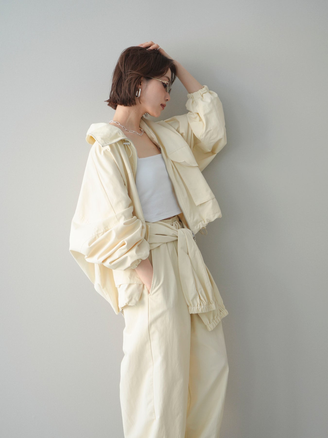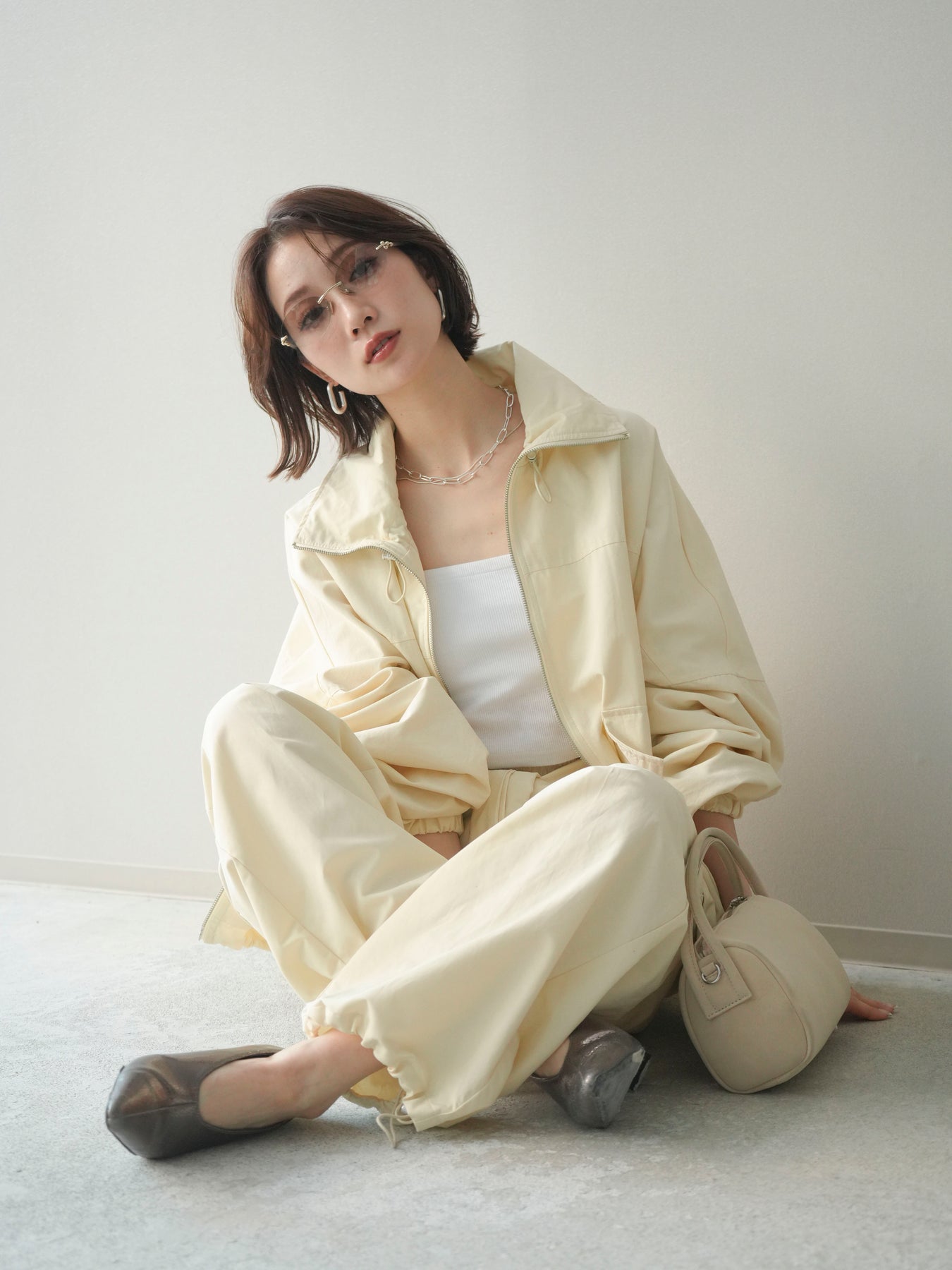 程よいハリ感のあるコットンナイロン素材を使用した、ジップ仕様のブルゾン。存在感のあるビッグポケットがデザインのアクセントとなり、シンプルなコーディネートにさっと羽織るだけでこなれた印象に仕上がります。ゆとりのあるシルエットと、裾・袖口のギャザーデザインが立体感を演出し、カジュアルながらもバランスの取れた一着に。軽やかな着心地で、季節の変わり目のアウターとしてデイリーに活躍します。 ※ボトムス、キャミソール(インナー)以外の商品は一律でインナーは付属していません。