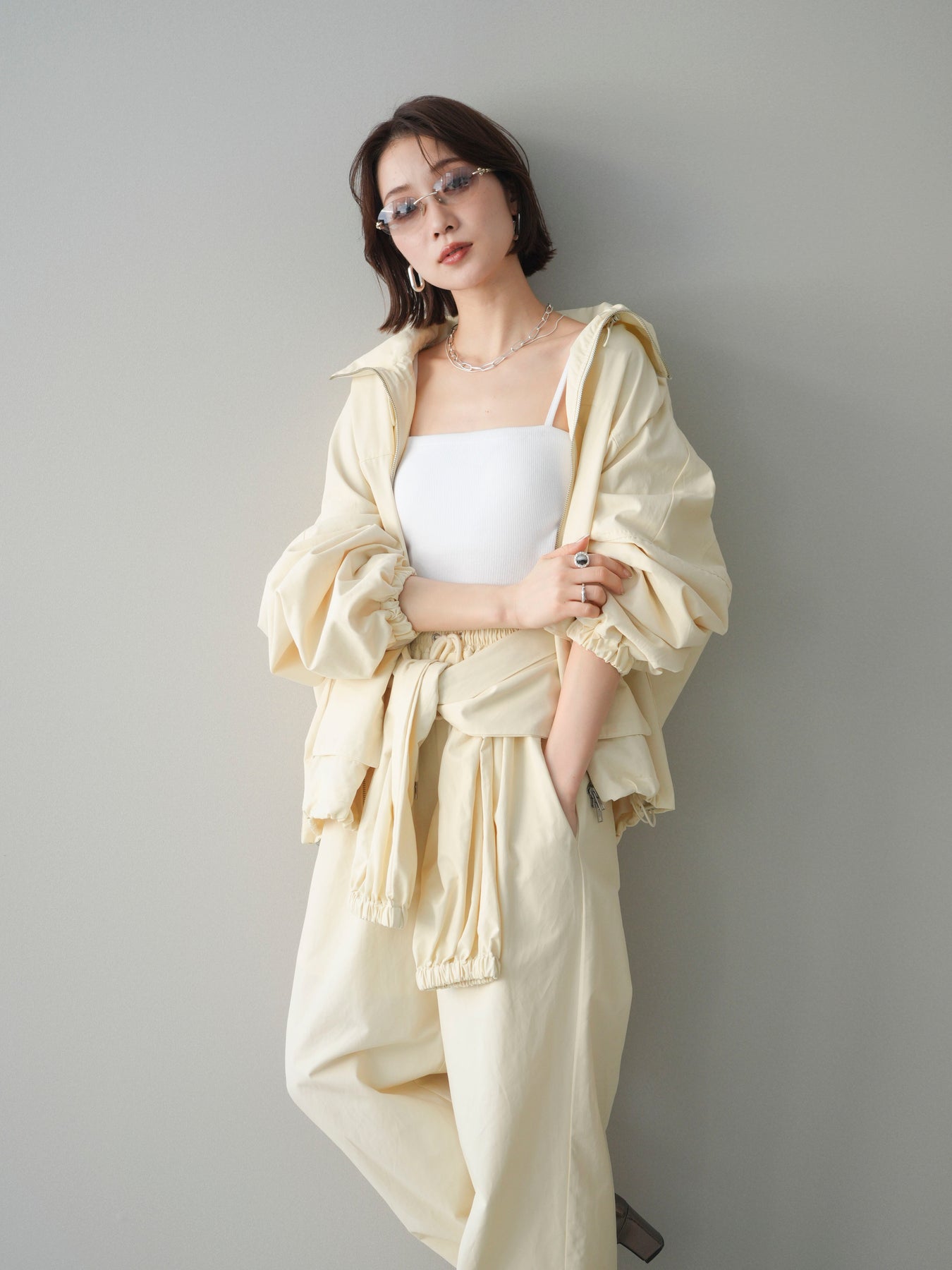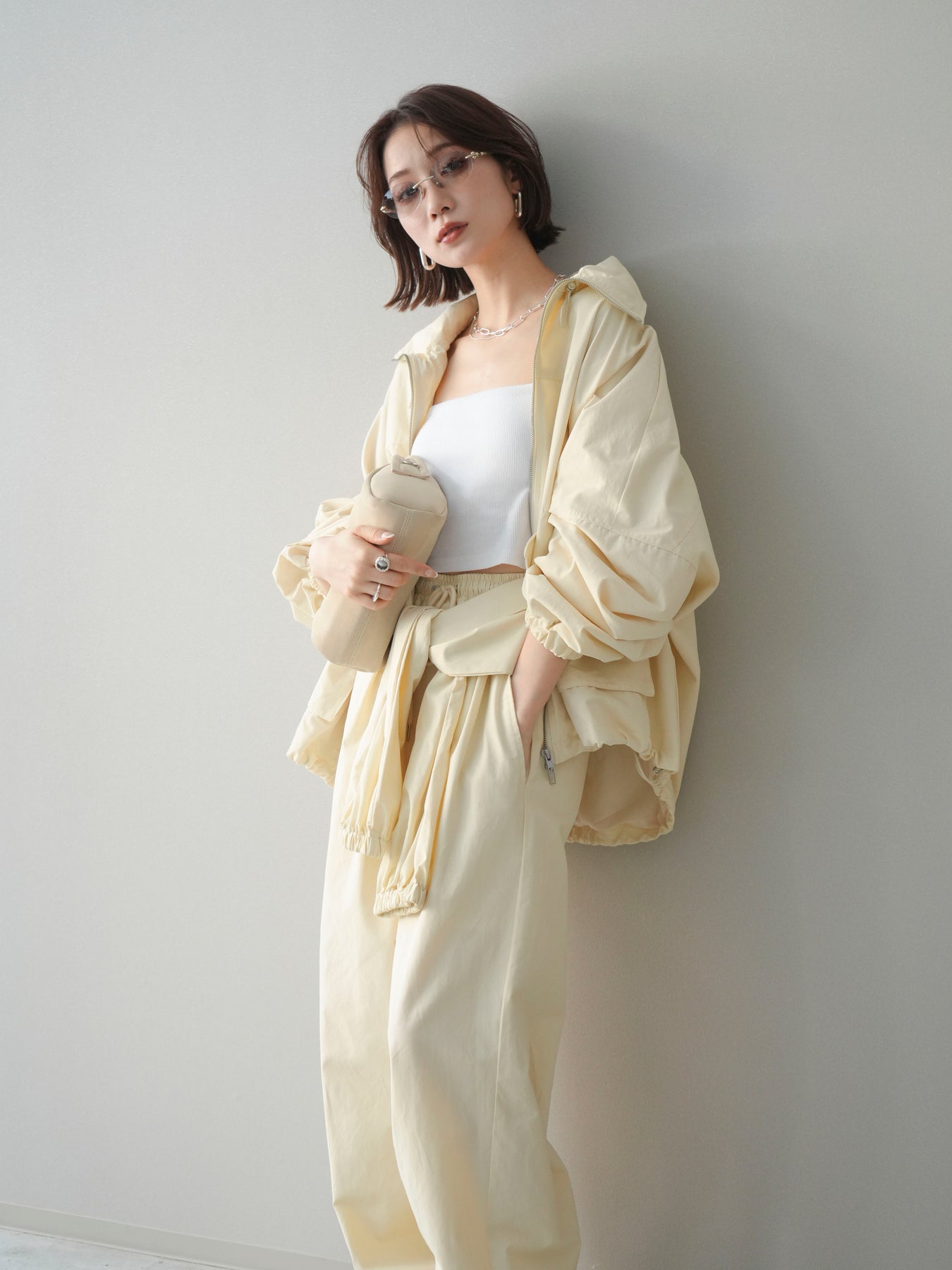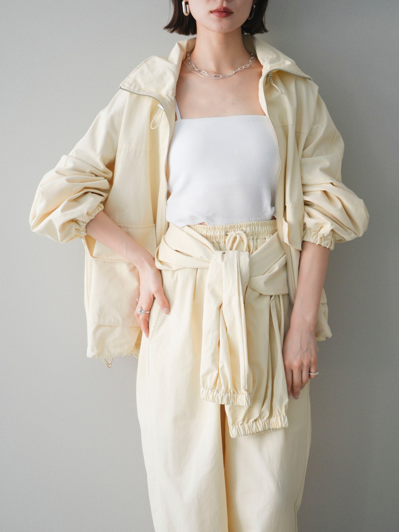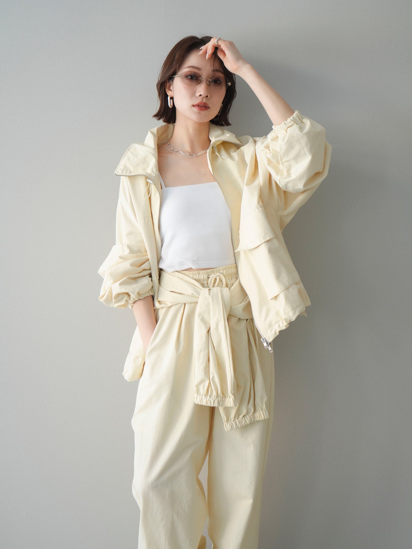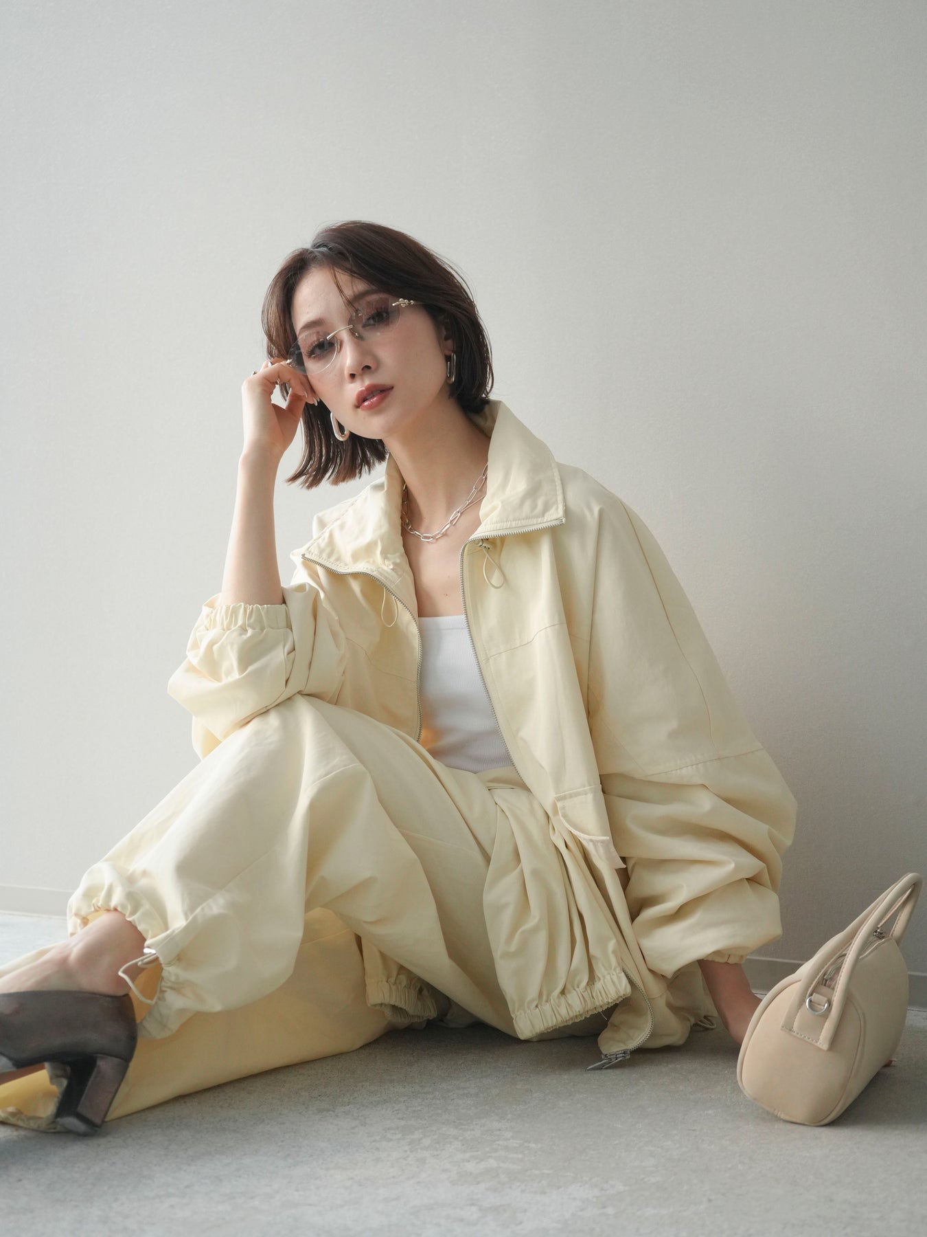 程よいハリ感のあるコットンナイロン素材を使用した、ジップ仕様のブルゾン。存在感のあるビッグポケットがデザインのアクセントとなり、シンプルなコーディネートにさっと羽織るだけでこなれた印象に仕上がります。ゆとりのあるシルエットと、裾・袖口のギャザーデザインが立体感を演出し、カジュアルながらもバランスの取れた一着に。軽やかな着心地で、季節の変わり目のアウターとしてデイリーに活躍します。 ※ボトムス、キャミソール(インナー)以外の商品は一律でインナーは付属していません。