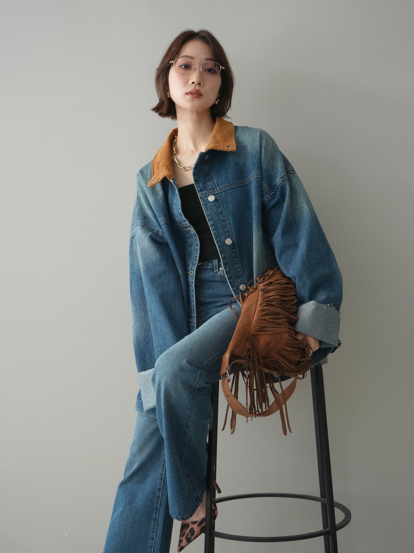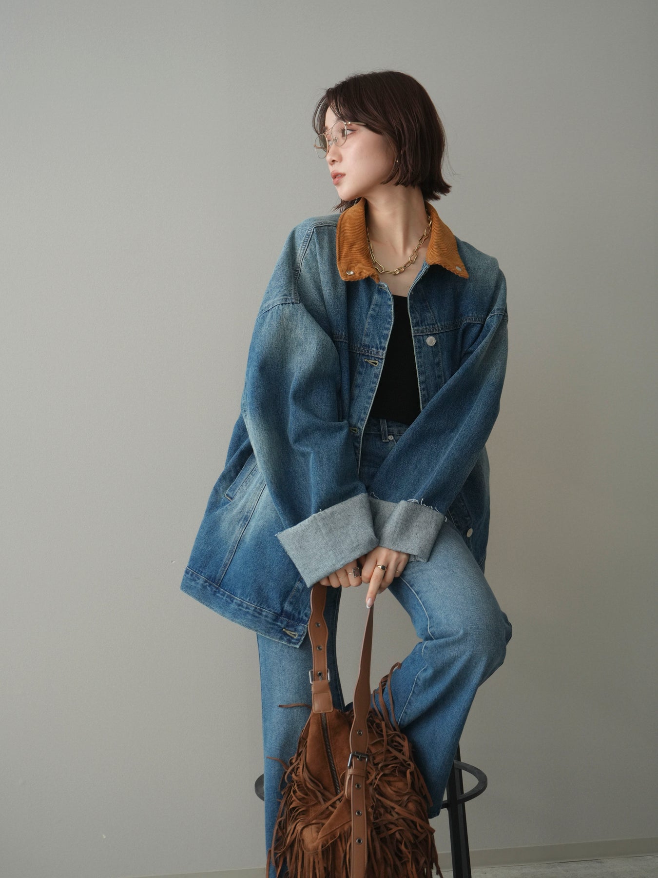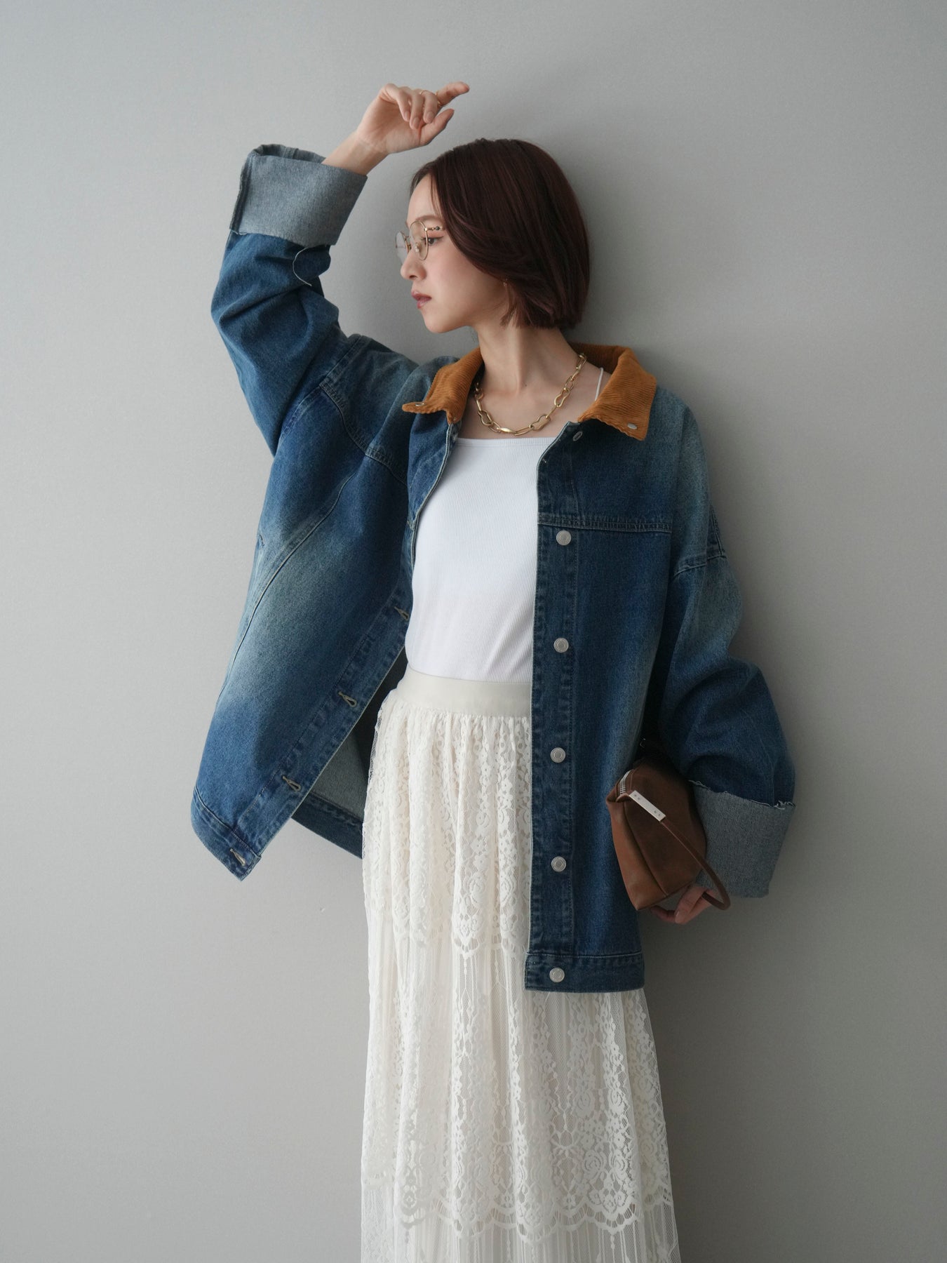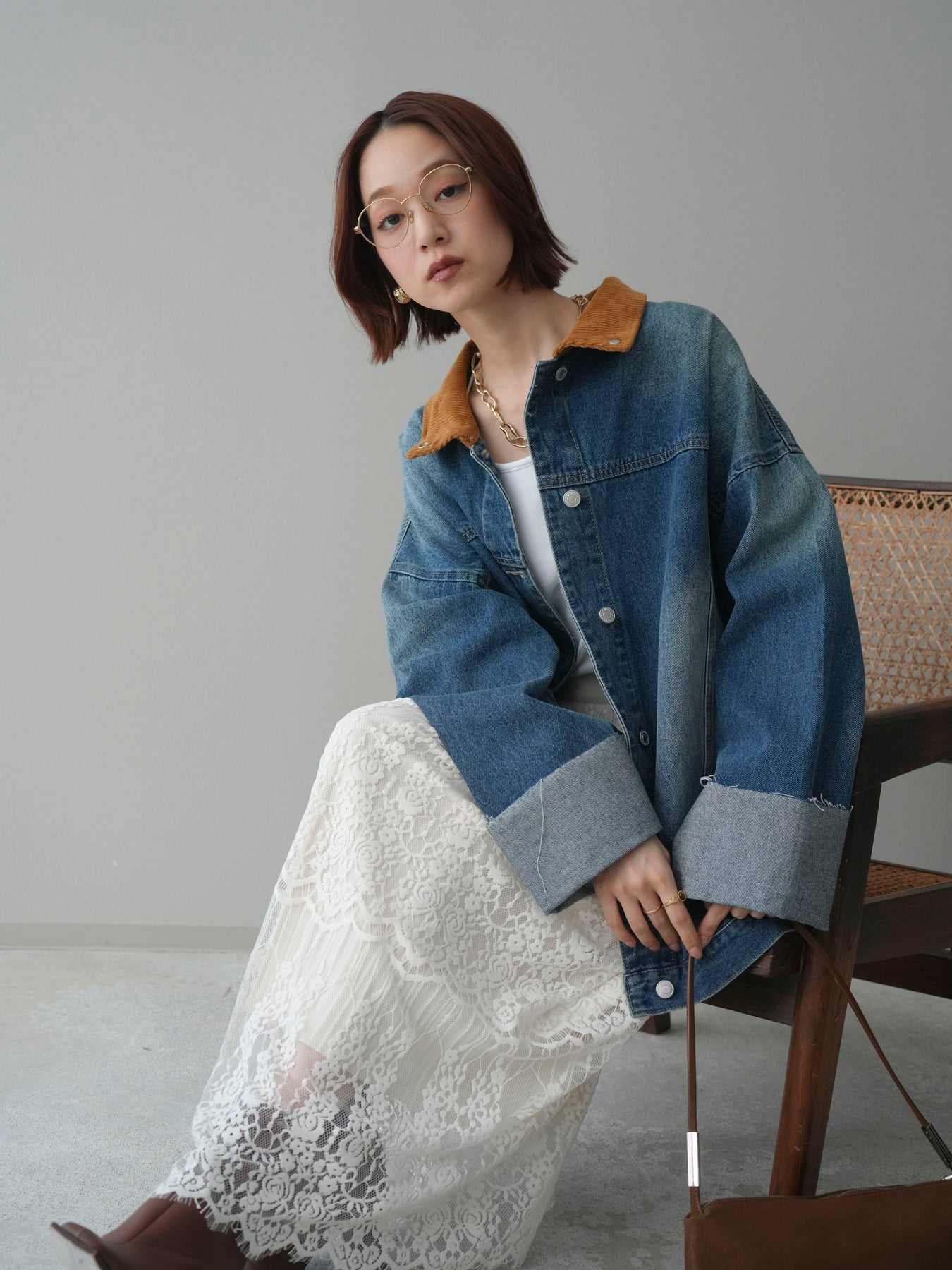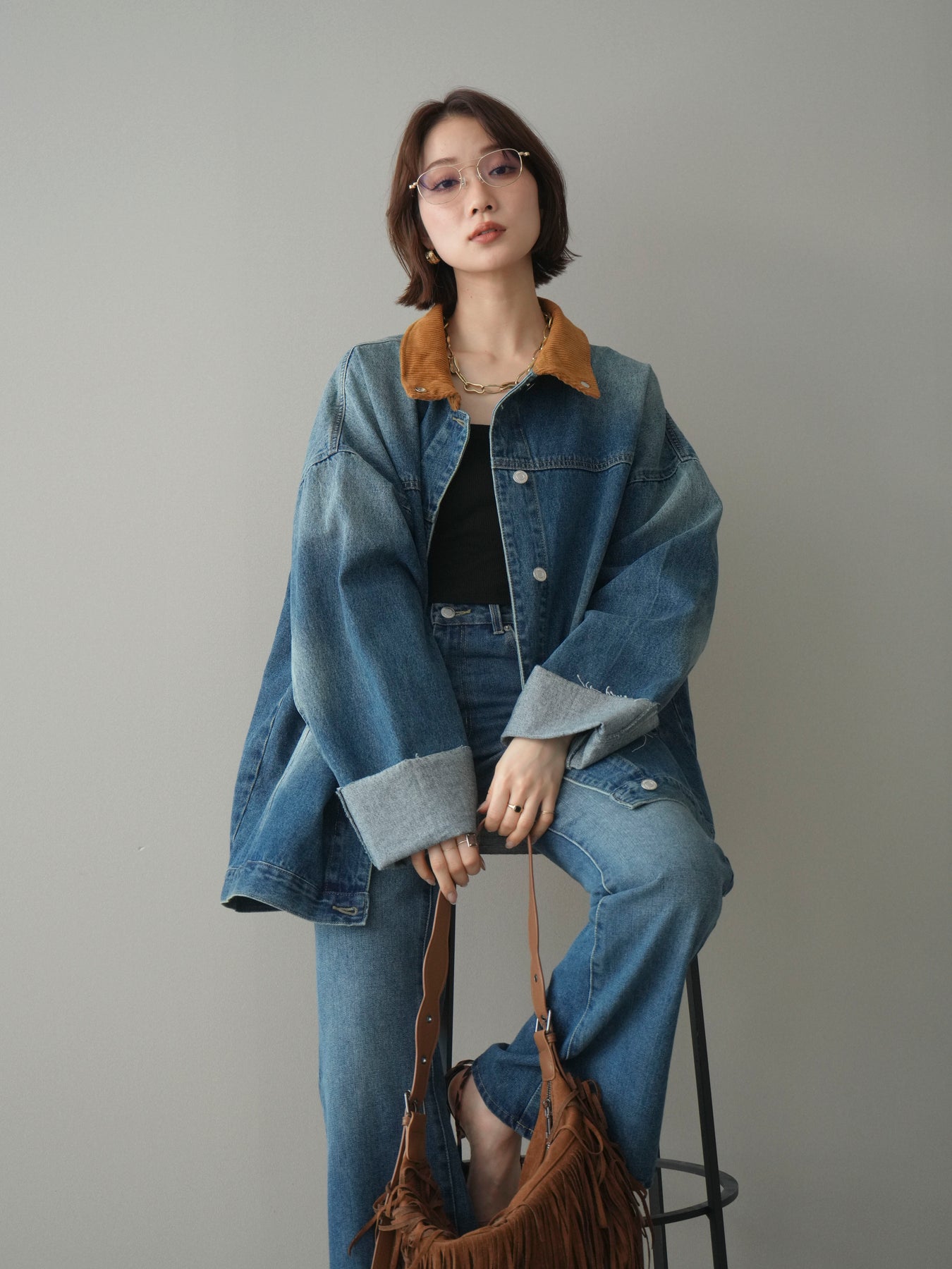 コーデュロイとデニムを組み合わせた、存在感のあるミドル丈ジャケット。異素材の切り替えがシンプルな中にも奥行きを生み、羽織るだけでこなれた印象に仕上がります。程よくゆとりのあるシルエットで、厚手のトップスの上からも着用しやすく、ロングシーズン活躍。袖口を折り返した際のデザインもアクセントになり、カジュアルながらも計算されたバランスの一着です。パンツにもスカートにも合わせやすく、デイリーからお出かけまで幅広いスタイリングに対応します。 ※ボトムス、キャミソール(インナー)以外の商品は一律でインナーは付属していません。