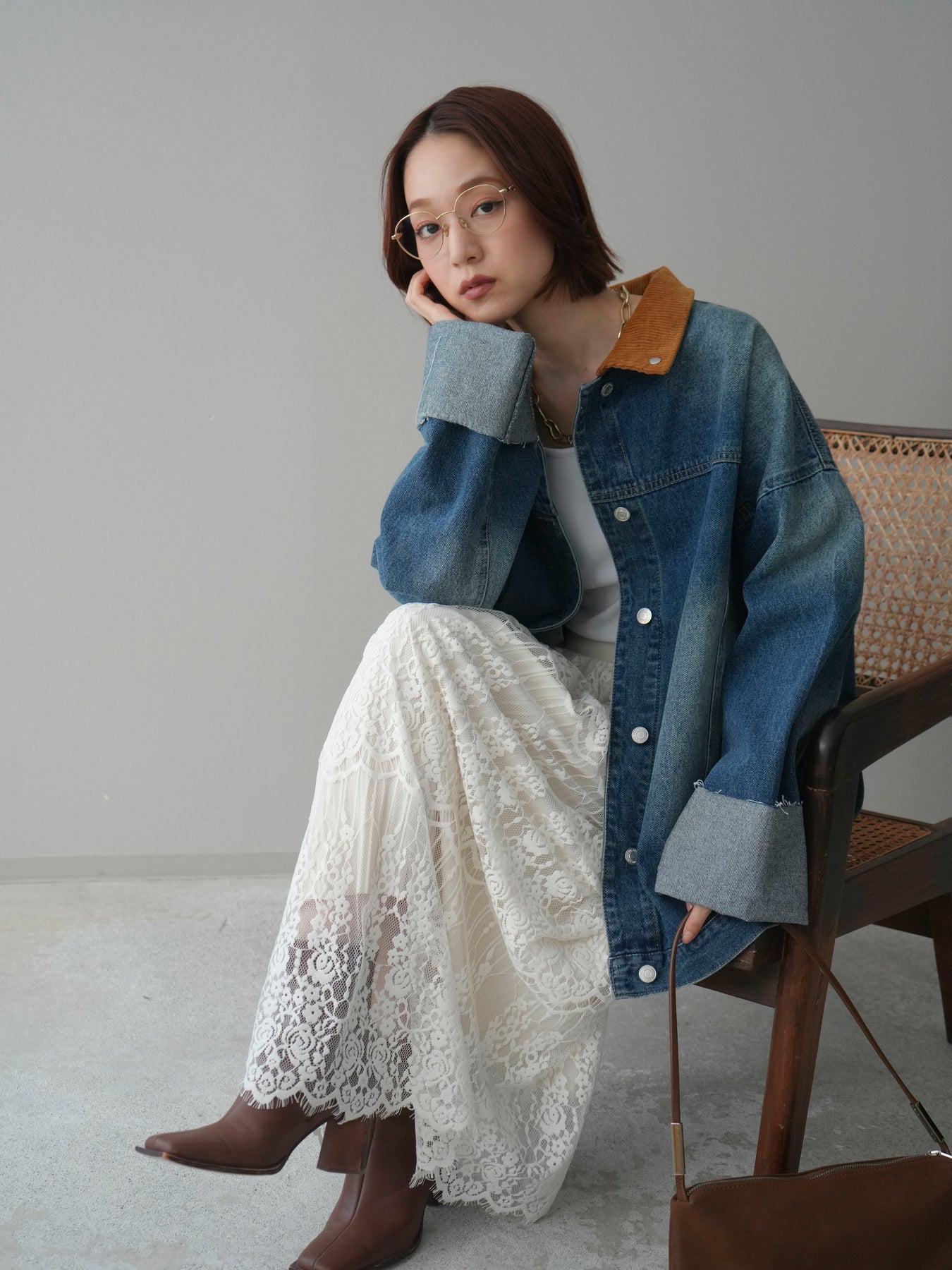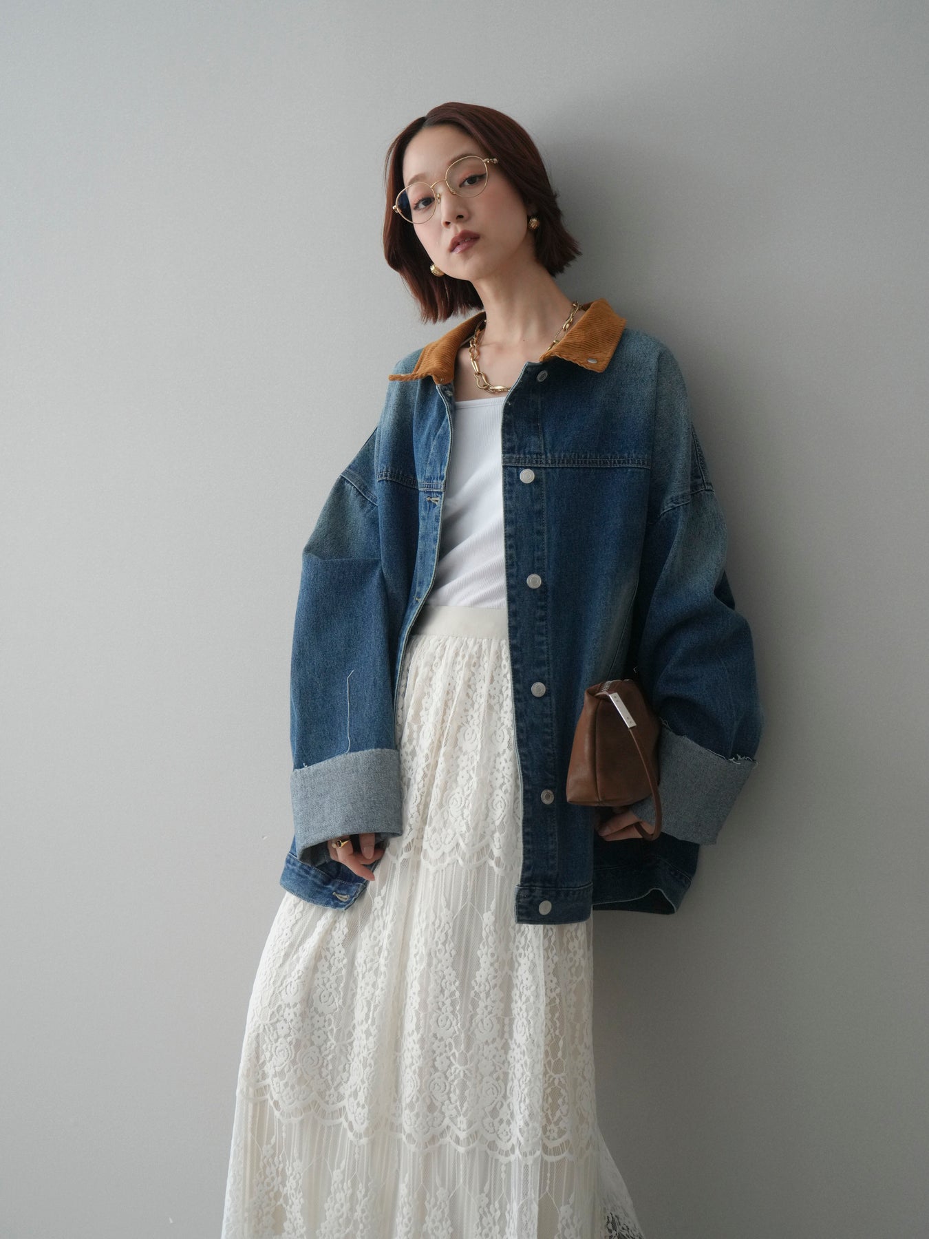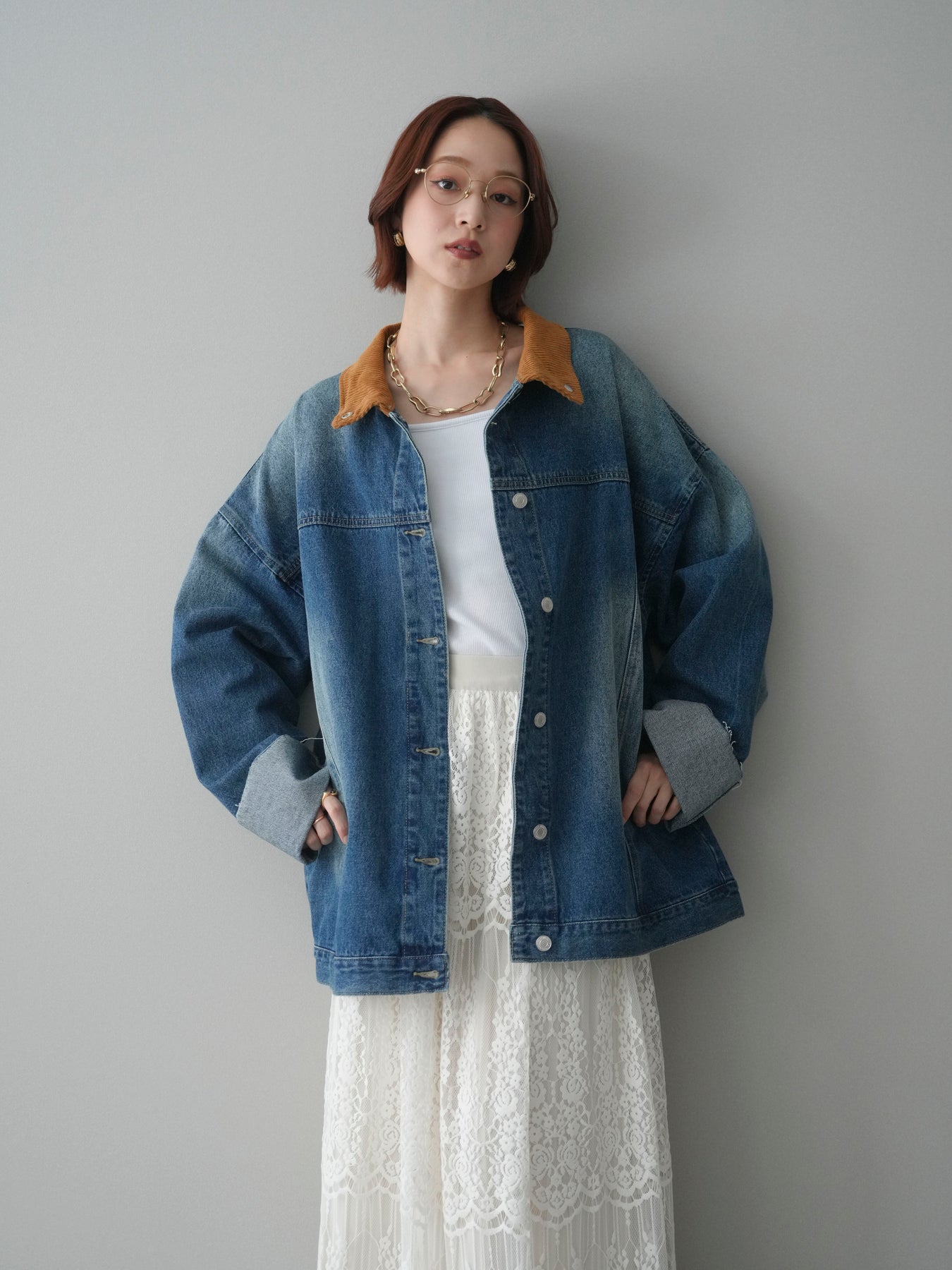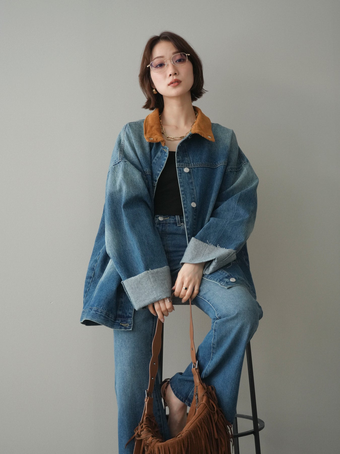 コーデュロイとデニムを組み合わせた、存在感のあるミドル丈ジャケット。異素材の切り替えがシンプルな中にも奥行きを生み、羽織るだけでこなれた印象に仕上がります。程よくゆとりのあるシルエットで、厚手のトップスの上からも着用しやすく、ロングシーズン活躍。袖口を折り返した際のデザインもアクセントになり、カジュアルながらも計算されたバランスの一着です。パンツにもスカートにも合わせやすく、デイリーからお出かけまで幅広いスタイリングに対応します。 ※ボトムス、キャミソール(インナー)以外の商品は一律でインナーは付属していません。