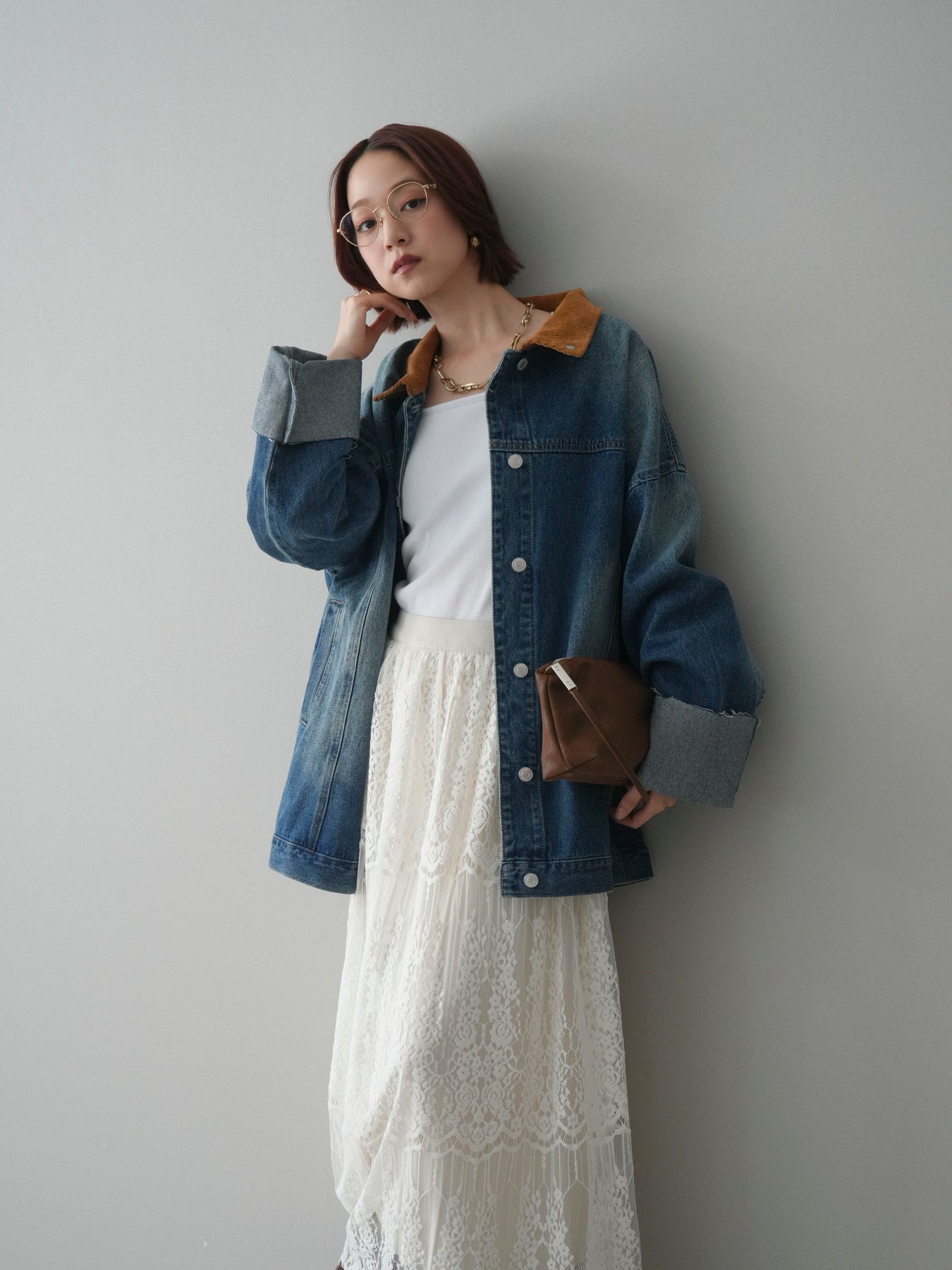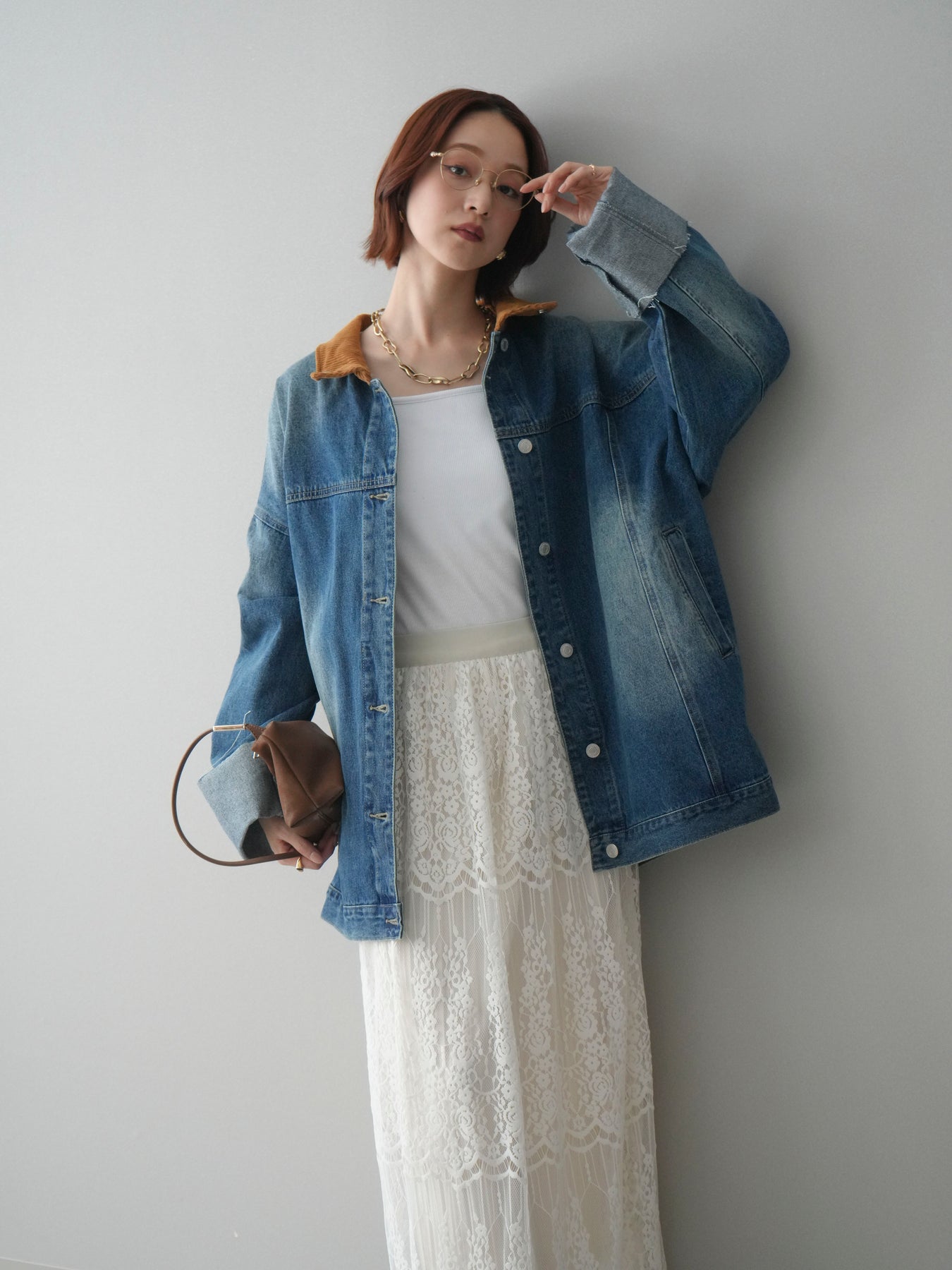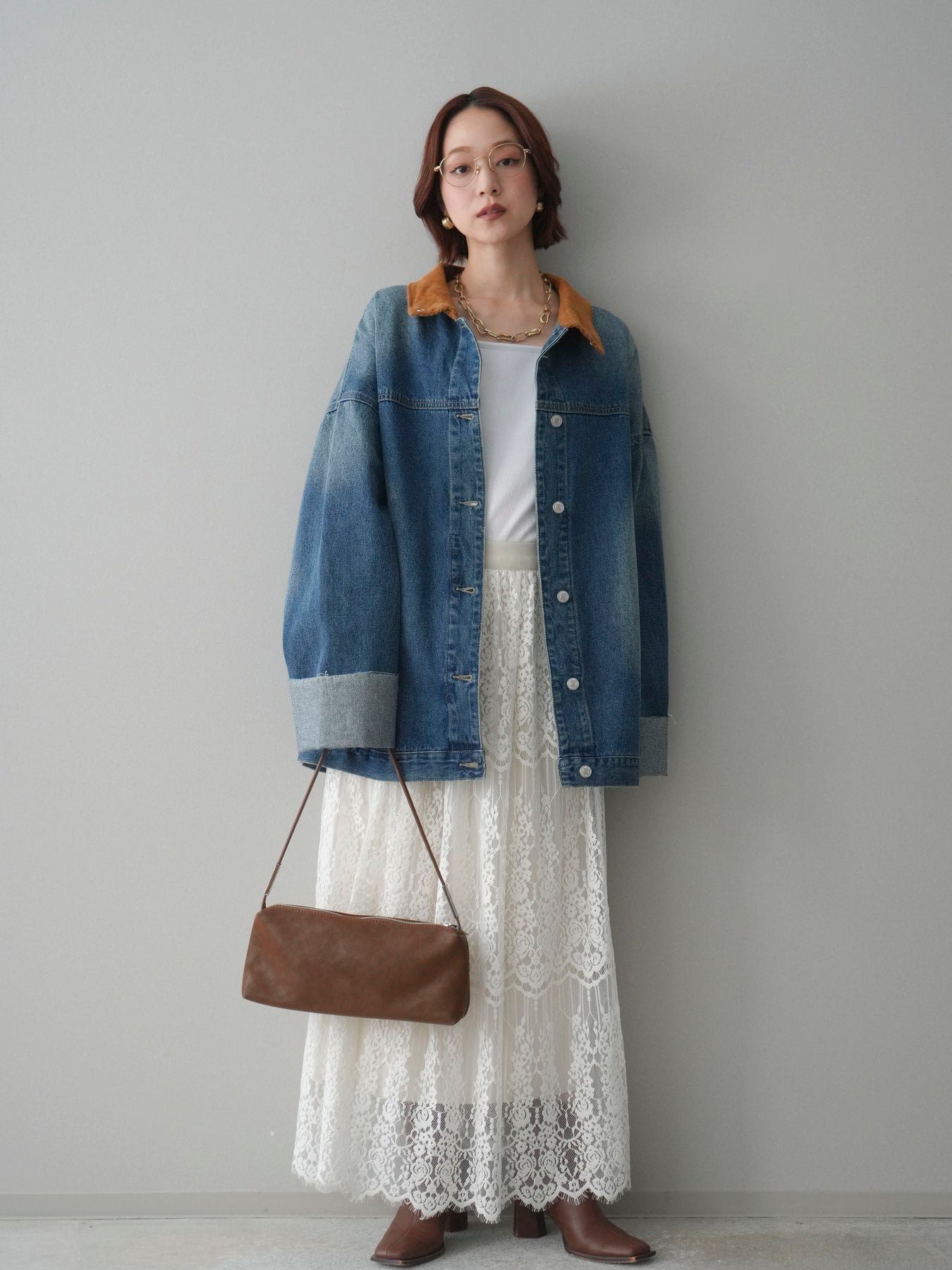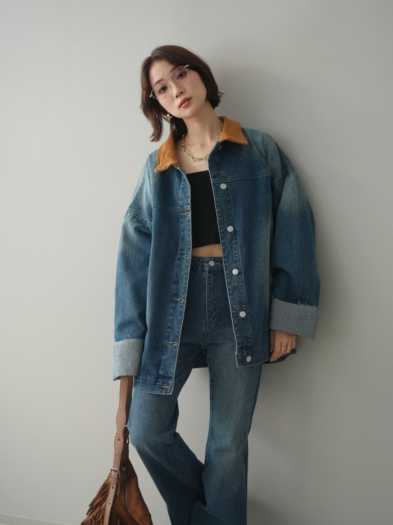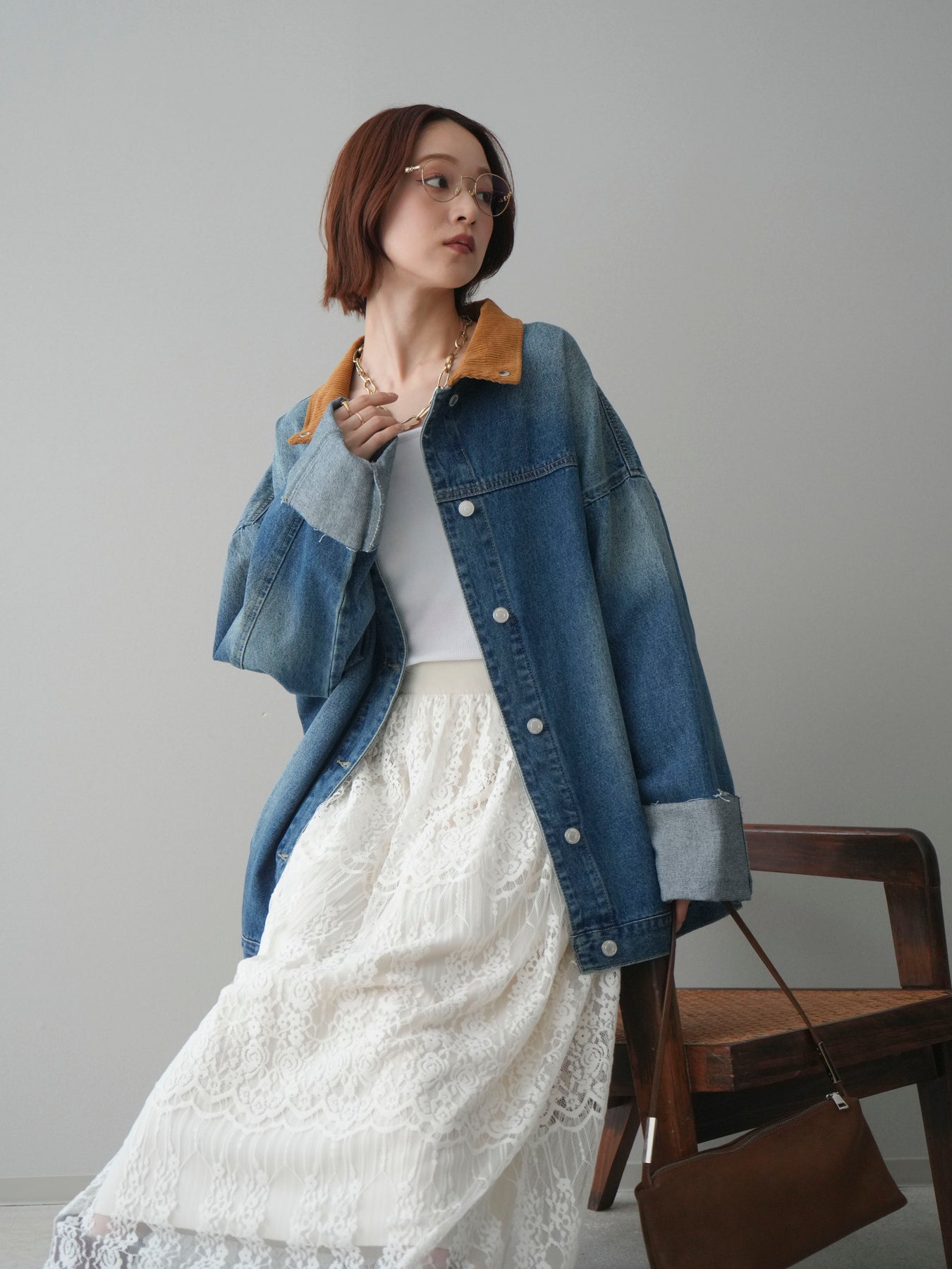 コーデュロイとデニムを組み合わせた、存在感のあるミドル丈ジャケット。異素材の切り替えがシンプルな中にも奥行きを生み、羽織るだけでこなれた印象に仕上がります。程よくゆとりのあるシルエットで、厚手のトップスの上からも着用しやすく、ロングシーズン活躍。袖口を折り返した際のデザインもアクセントになり、カジュアルながらも計算されたバランスの一着です。パンツにもスカートにも合わせやすく、デイリーからお出かけまで幅広いスタイリングに対応します。 ※ボトムス、キャミソール(インナー)以外の商品は一律でインナーは付属していません。
