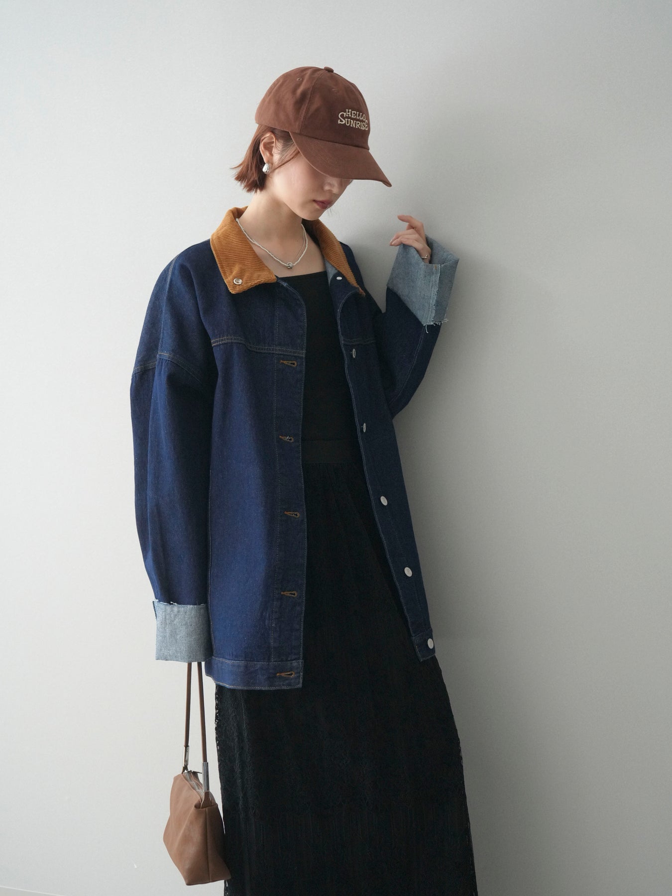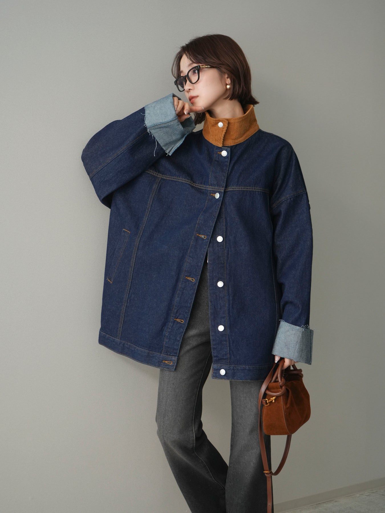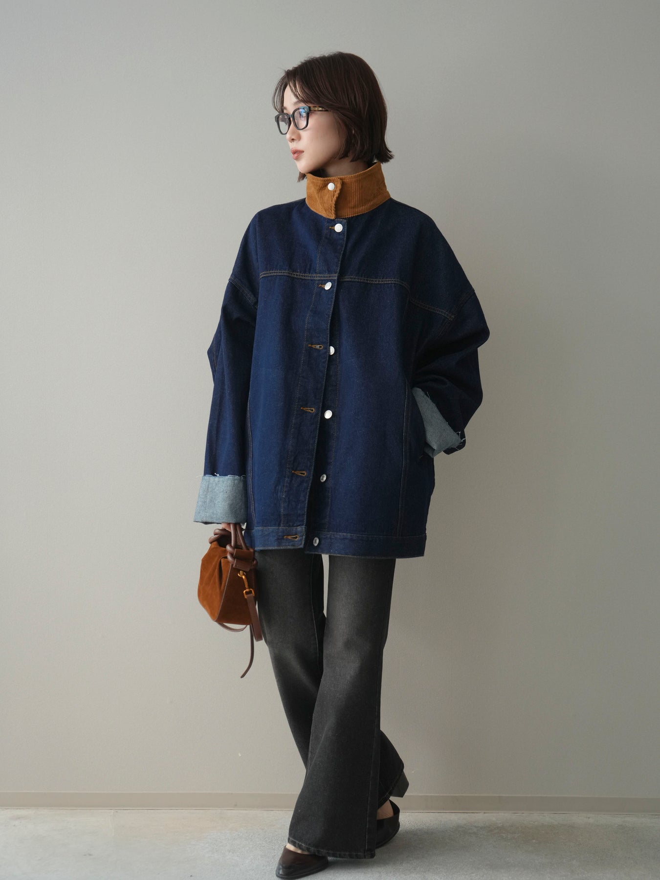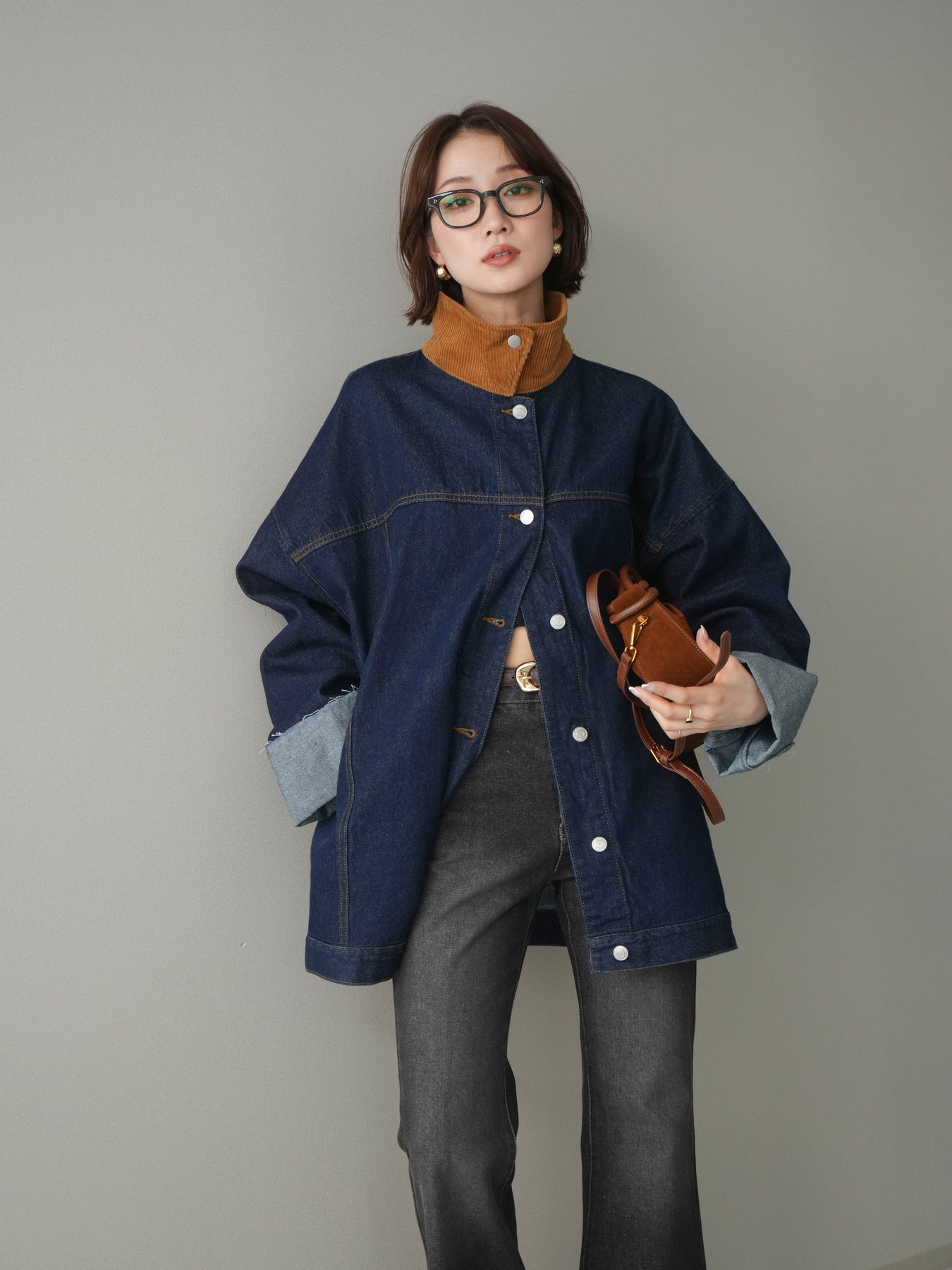 コーデュロイとデニムを組み合わせた、存在感のあるミドル丈ジャケット。異素材の切り替えがシンプルな中にも奥行きを生み、羽織るだけでこなれた印象に仕上がります。程よくゆとりのあるシルエットで、厚手のトップスの上からも着用しやすく、ロングシーズン活躍。袖口を折り返した際のデザインもアクセントになり、カジュアルながらも計算されたバランスの一着です。パンツにもスカートにも合わせやすく、デイリーからお出かけまで幅広いスタイリングに対応します。 ※ボトムス、キャミソール(インナー)以外の商品は一律でインナーは付属していません。