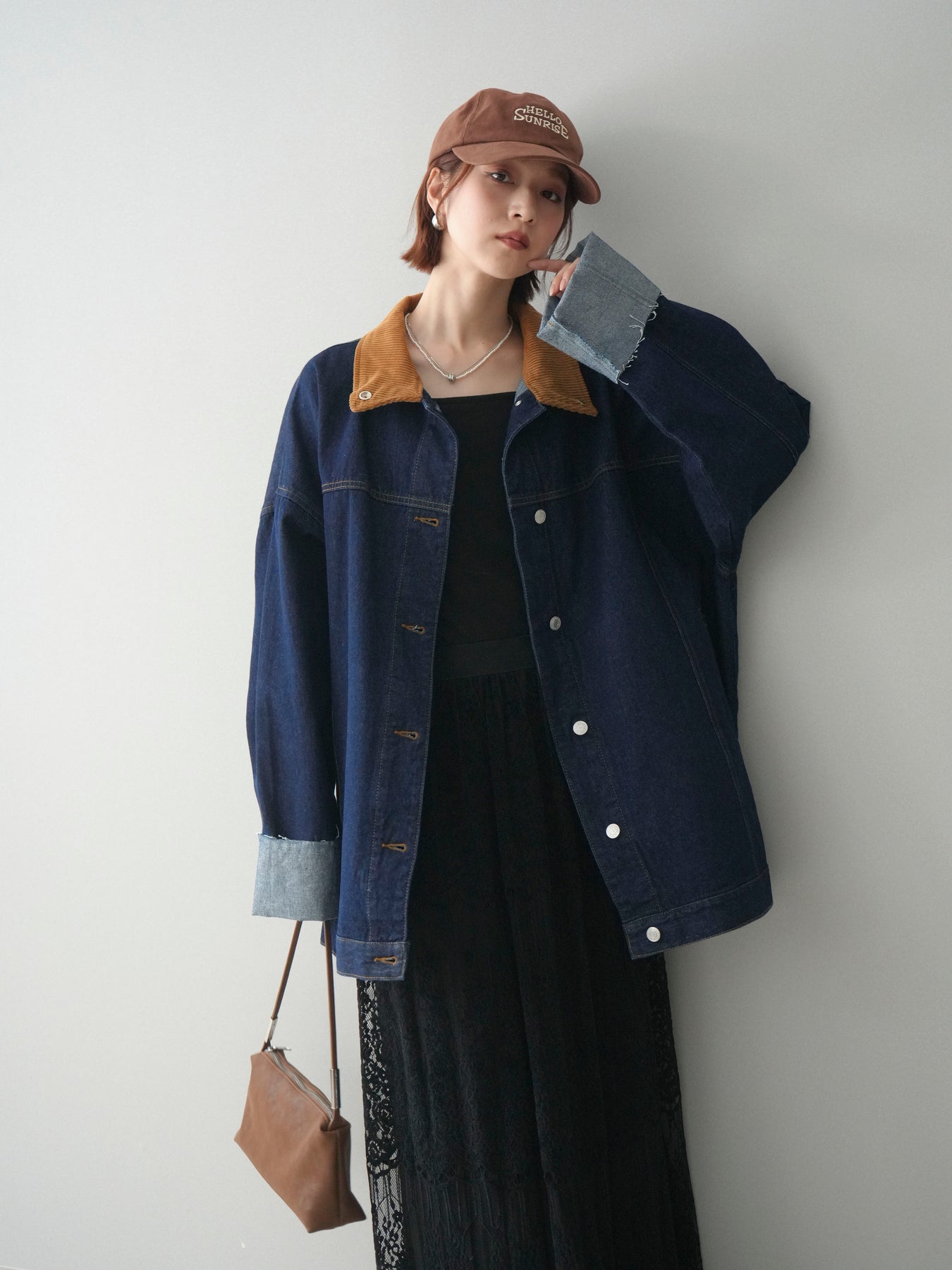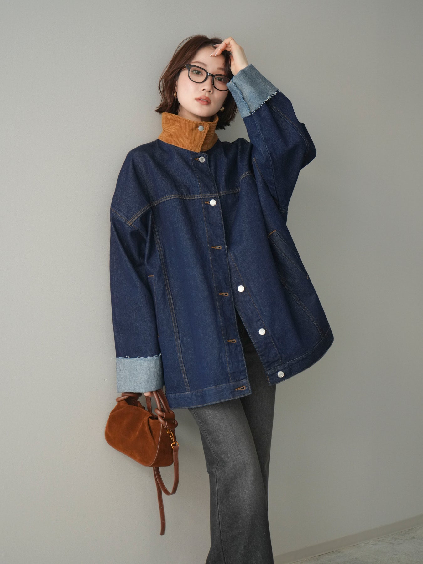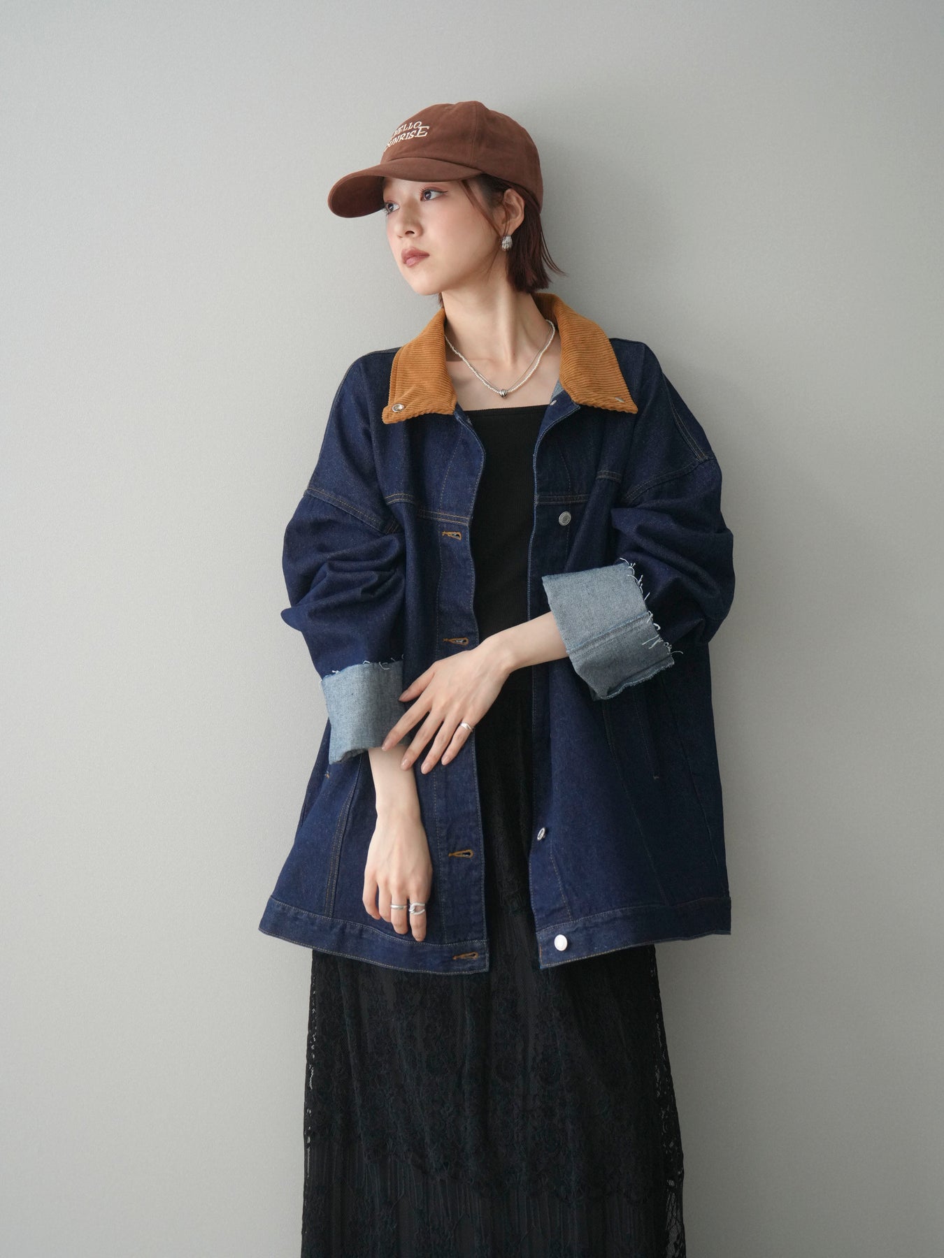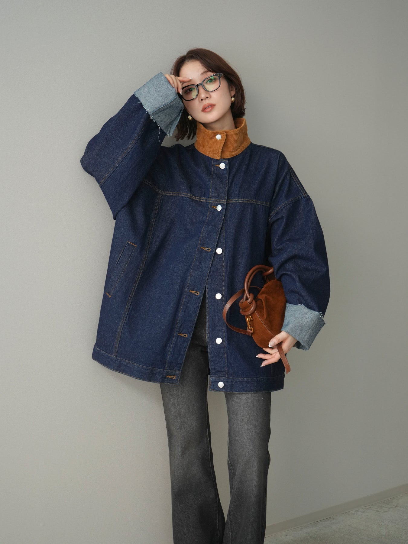 コーデュロイとデニムを組み合わせた、存在感のあるミドル丈ジャケット。異素材の切り替えがシンプルな中にも奥行きを生み、羽織るだけでこなれた印象に仕上がります。程よくゆとりのあるシルエットで、厚手のトップスの上からも着用しやすく、ロングシーズン活躍。袖口を折り返した際のデザインもアクセントになり、カジュアルながらも計算されたバランスの一着です。パンツにもスカートにも合わせやすく、デイリーからお出かけまで幅広いスタイリングに対応します。 ※ボトムス、キャミソール(インナー)以外の商品は一律でインナーは付属していません。