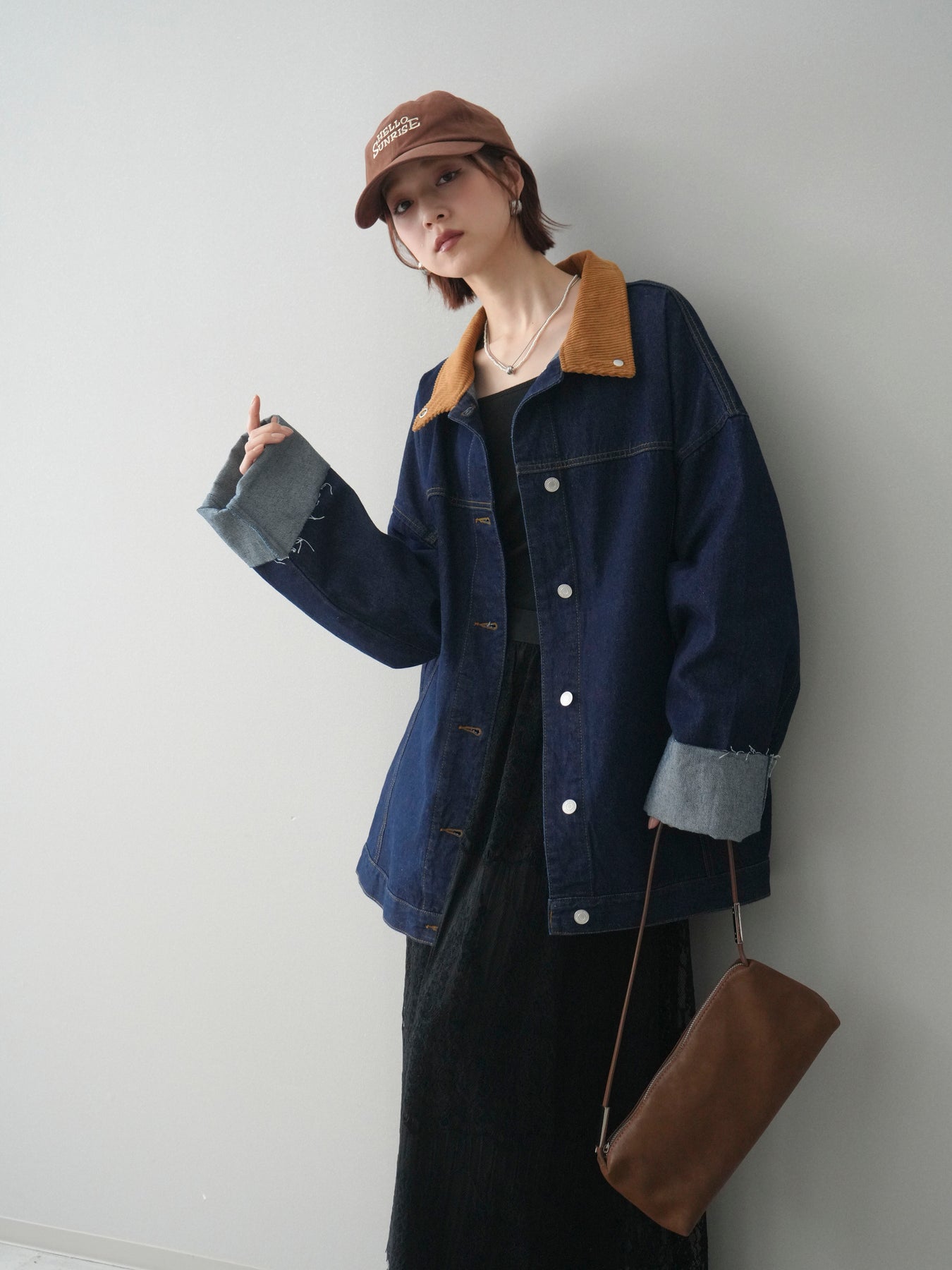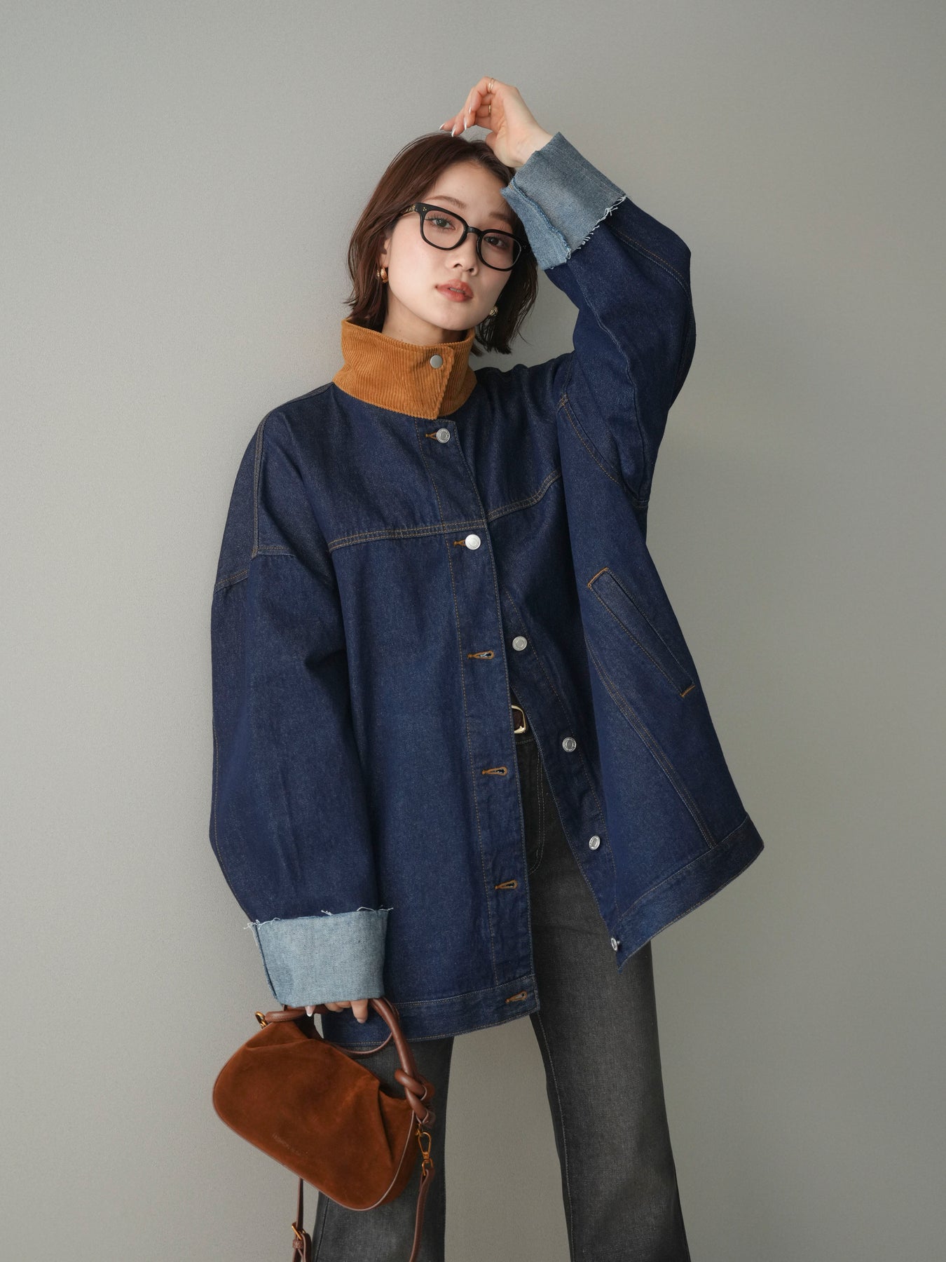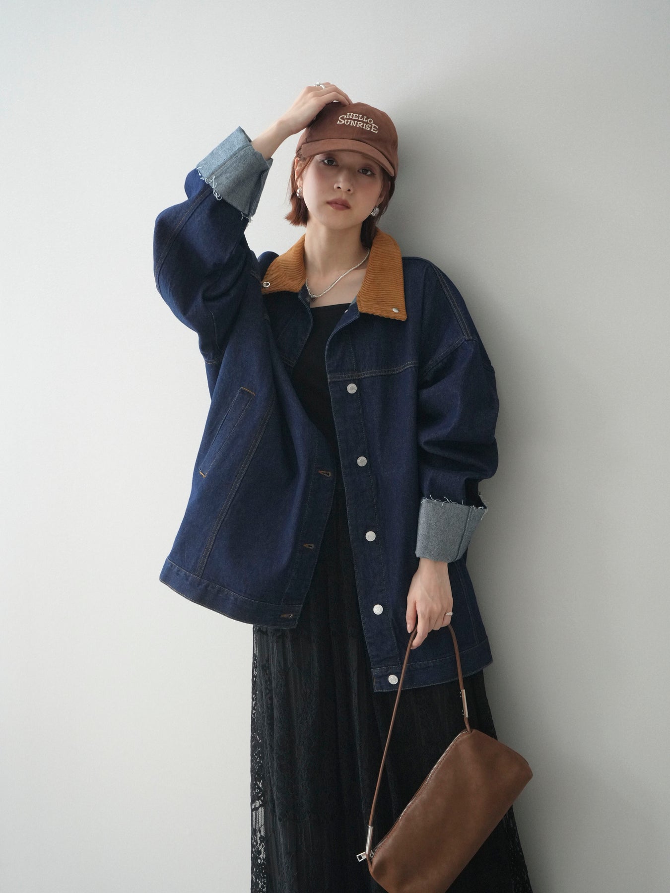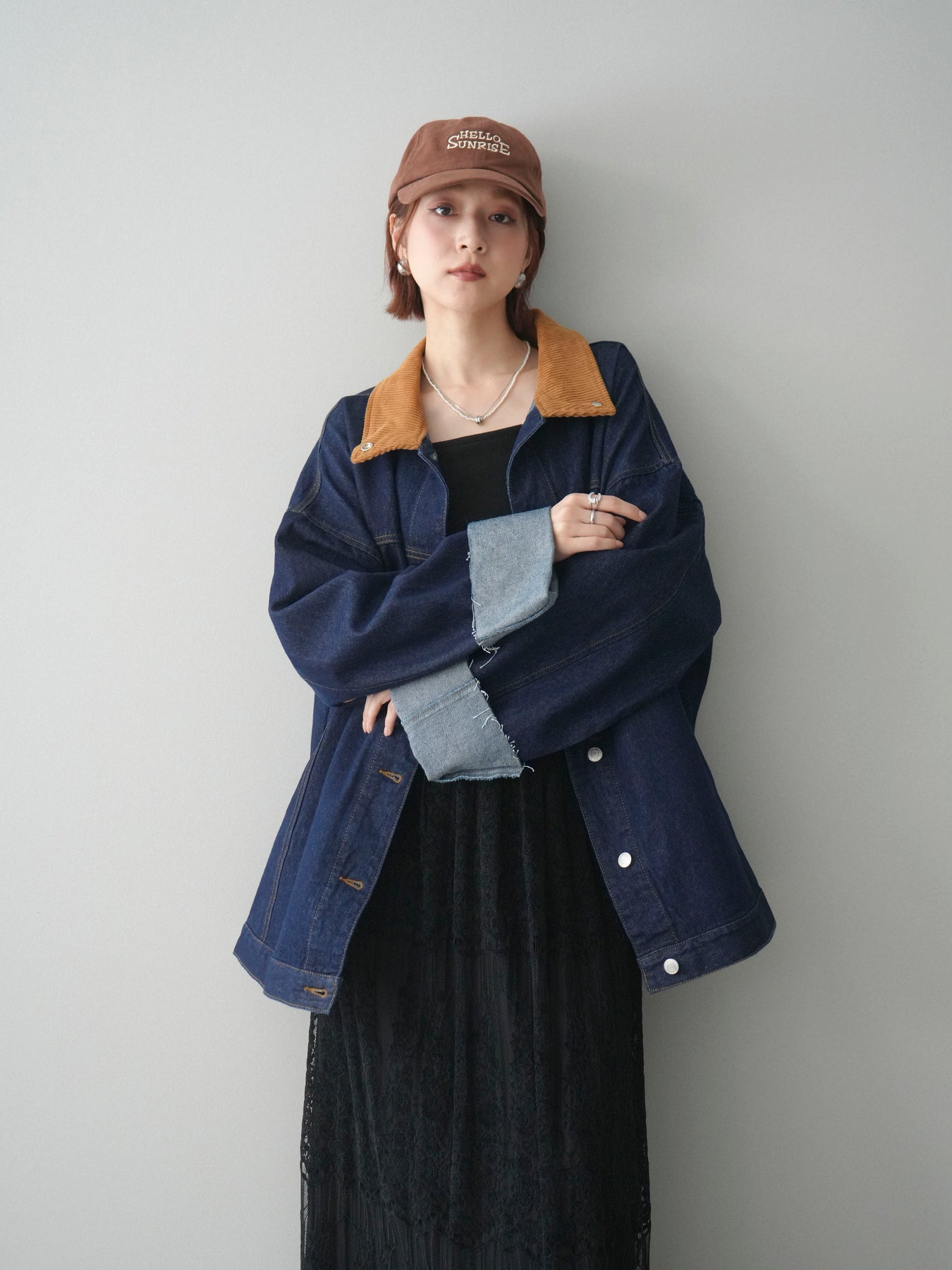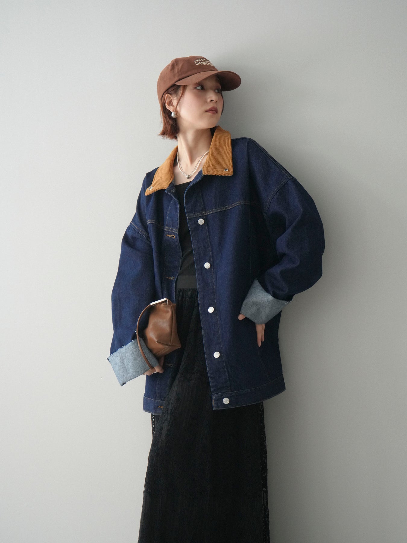 コーデュロイとデニムを組み合わせた、存在感のあるミドル丈ジャケット。異素材の切り替えがシンプルな中にも奥行きを生み、羽織るだけでこなれた印象に仕上がります。程よくゆとりのあるシルエットで、厚手のトップスの上からも着用しやすく、ロングシーズン活躍。袖口を折り返した際のデザインもアクセントになり、カジュアルながらも計算されたバランスの一着です。パンツにもスカートにも合わせやすく、デイリーからお出かけまで幅広いスタイリングに対応します。 ※ボトムス、キャミソール(インナー)以外の商品は一律でインナーは付属していません。