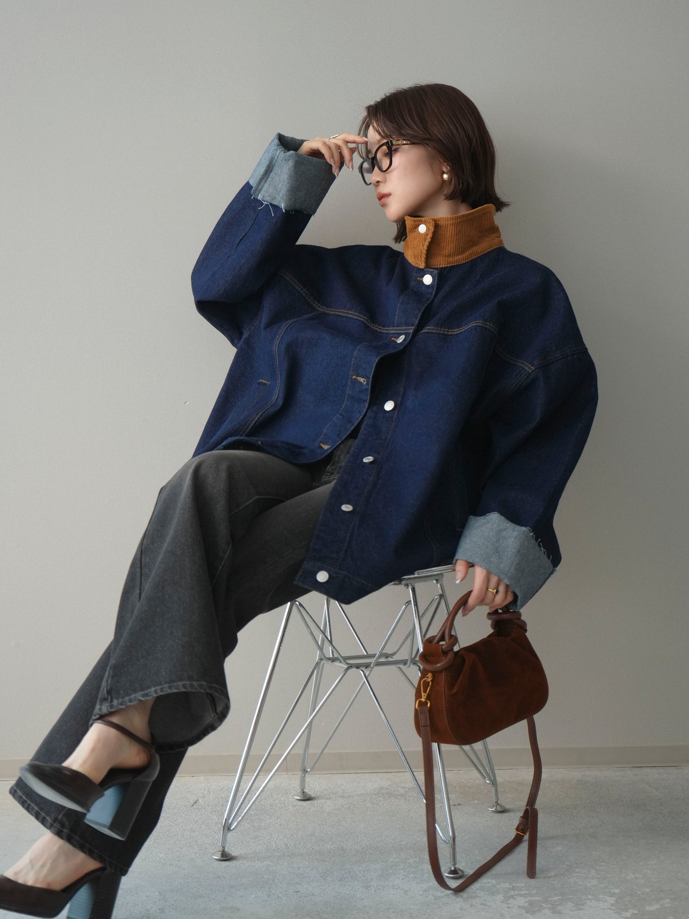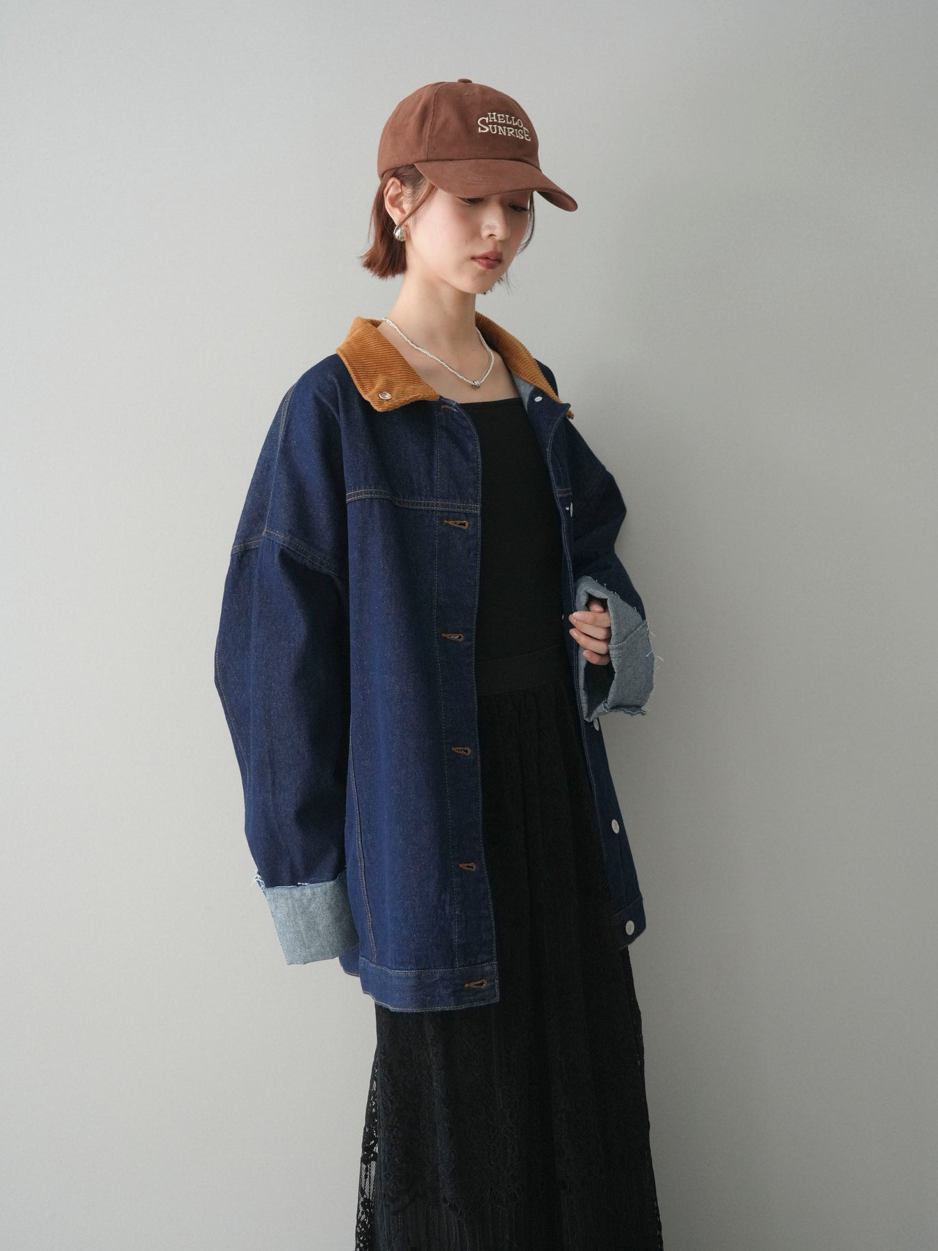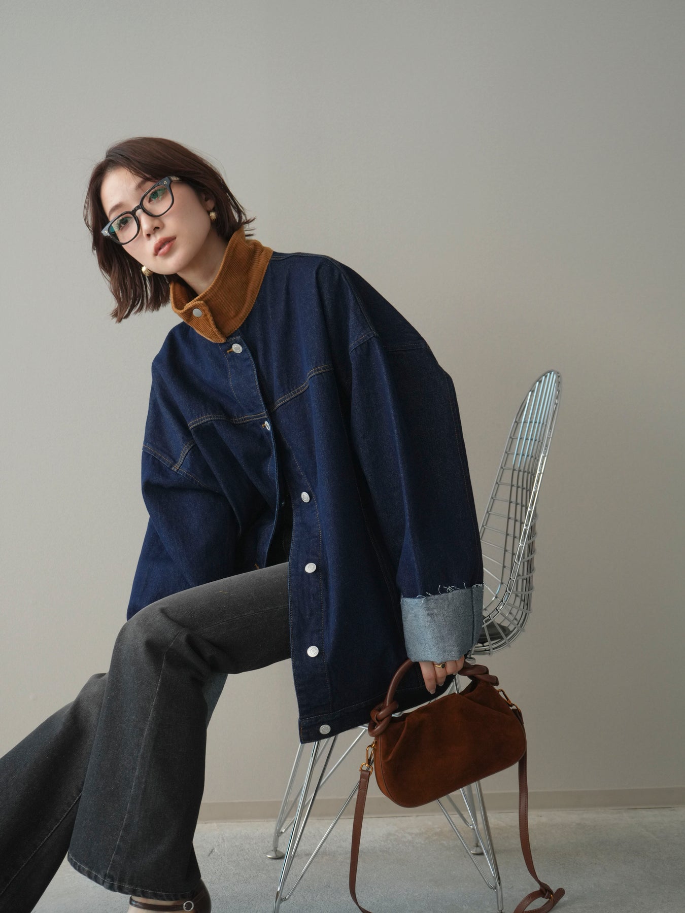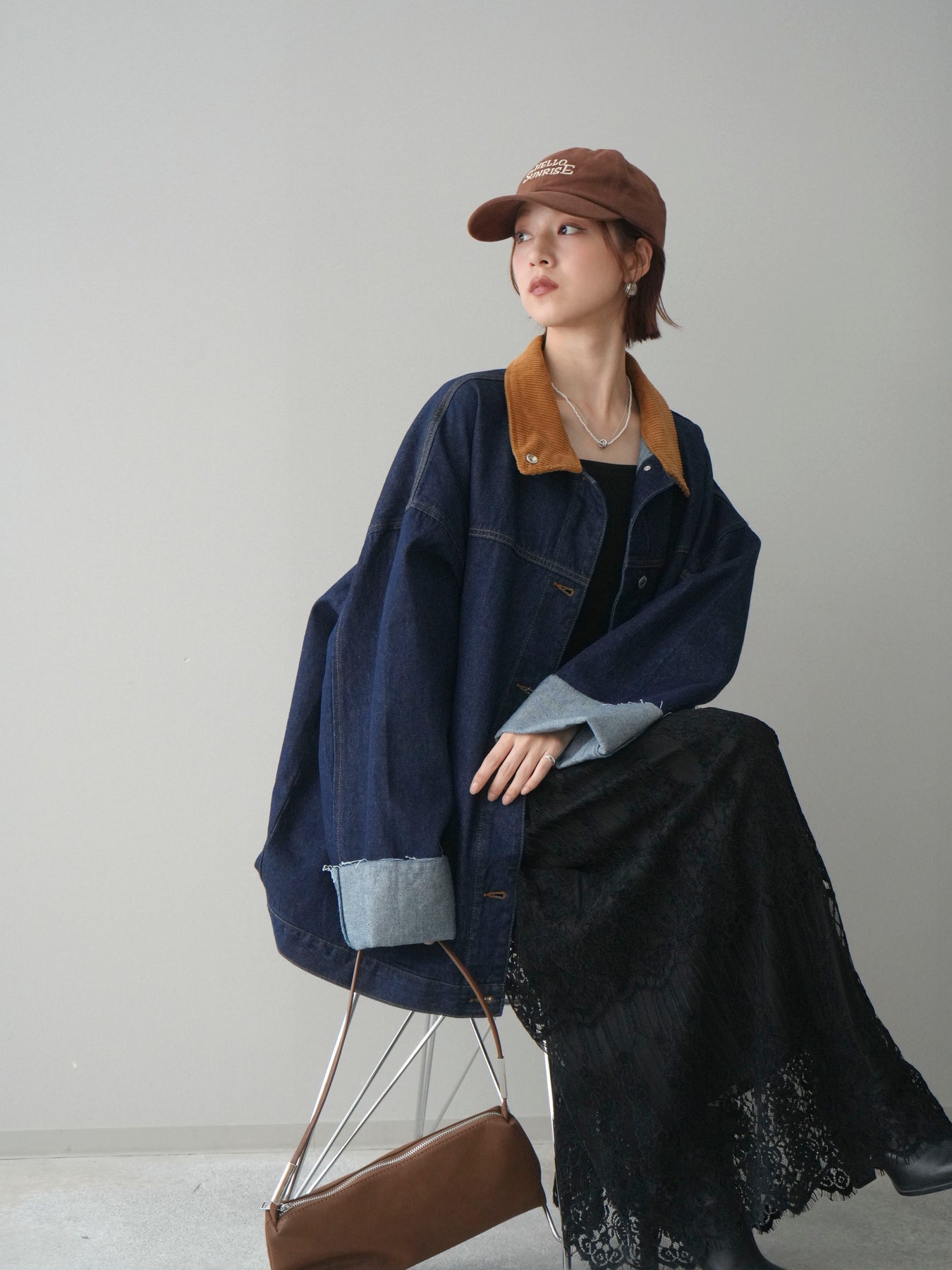 コーデュロイとデニムを組み合わせた、存在感のあるミドル丈ジャケット。異素材の切り替えがシンプルな中にも奥行きを生み、羽織るだけでこなれた印象に仕上がります。程よくゆとりのあるシルエットで、厚手のトップスの上からも着用しやすく、ロングシーズン活躍。袖口を折り返した際のデザインもアクセントになり、カジュアルながらも計算されたバランスの一着です。パンツにもスカートにも合わせやすく、デイリーからお出かけまで幅広いスタイリングに対応します。 ※ボトムス、キャミソール(インナー)以外の商品は一律でインナーは付属していません。