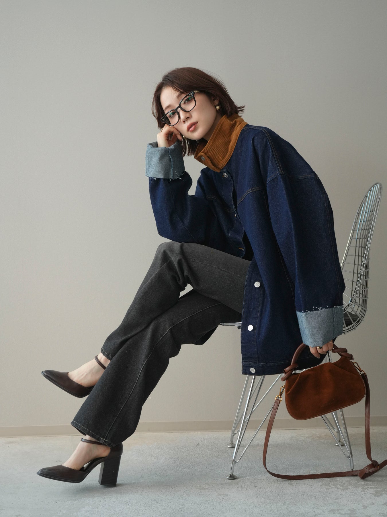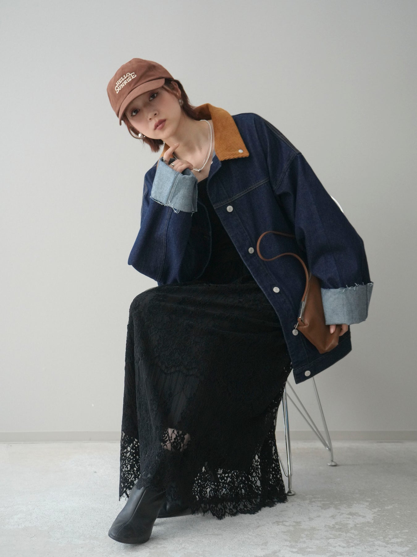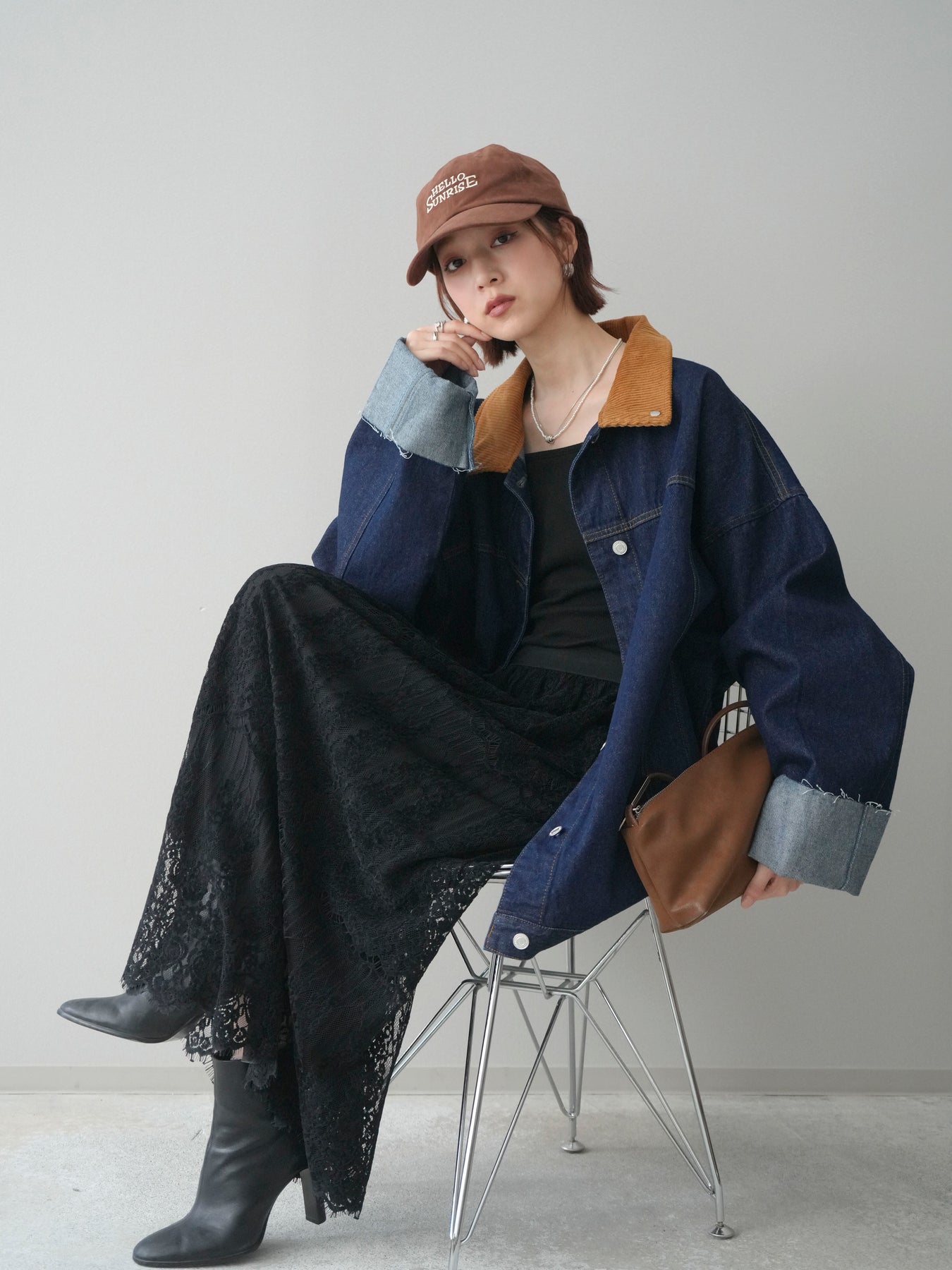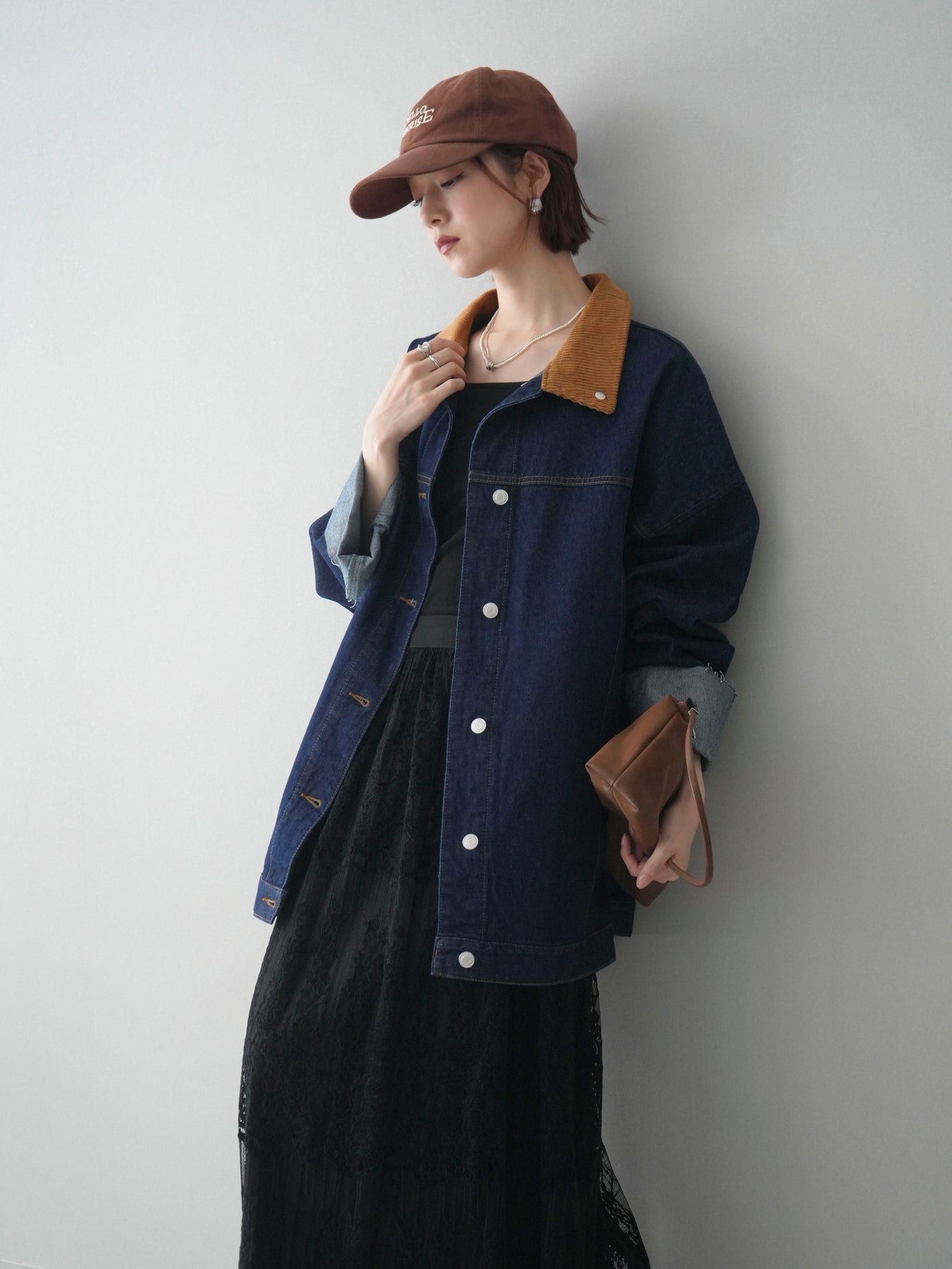 コーデュロイとデニムを組み合わせた、存在感のあるミドル丈ジャケット。異素材の切り替えがシンプルな中にも奥行きを生み、羽織るだけでこなれた印象に仕上がります。程よくゆとりのあるシルエットで、厚手のトップスの上からも着用しやすく、ロングシーズン活躍。袖口を折り返した際のデザインもアクセントになり、カジュアルながらも計算されたバランスの一着です。パンツにもスカートにも合わせやすく、デイリーからお出かけまで幅広いスタイリングに対応します。 ※ボトムス、キャミソール(インナー)以外の商品は一律でインナーは付属していません。