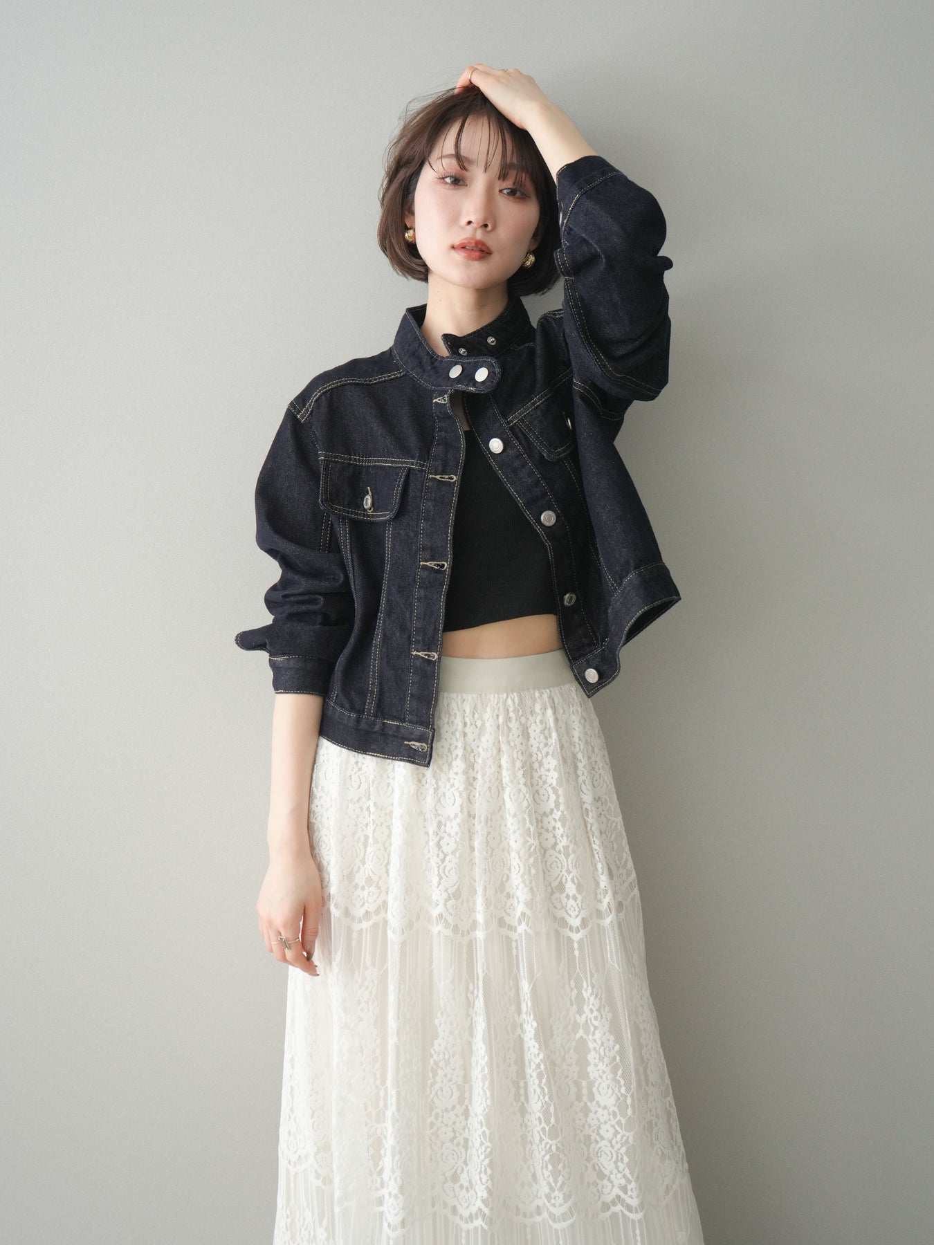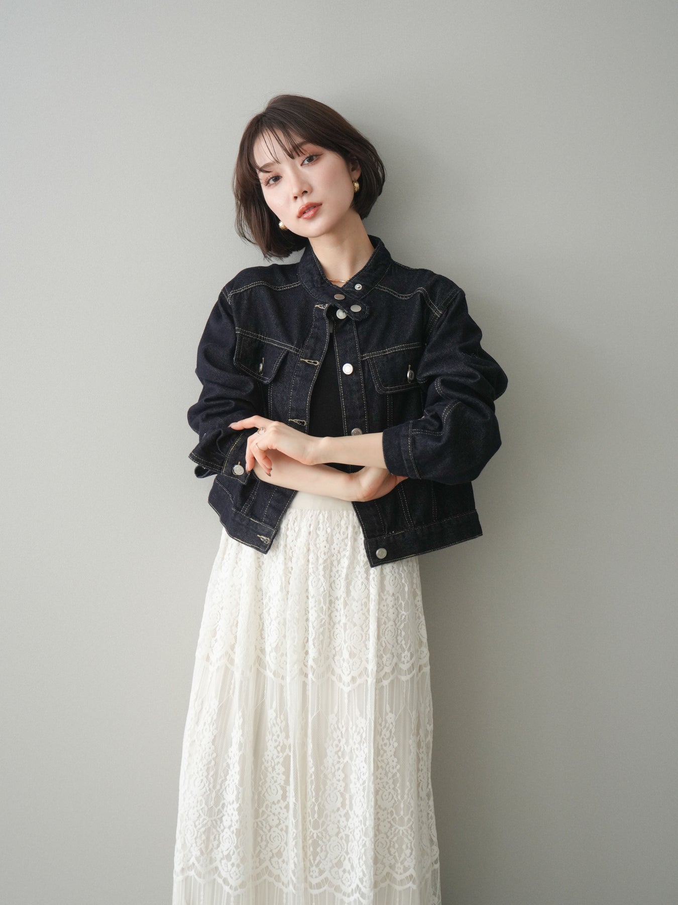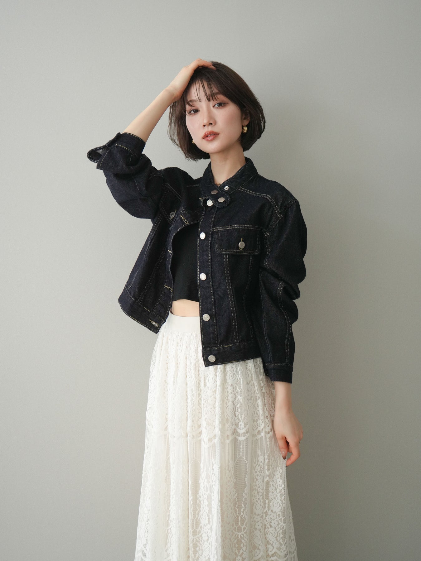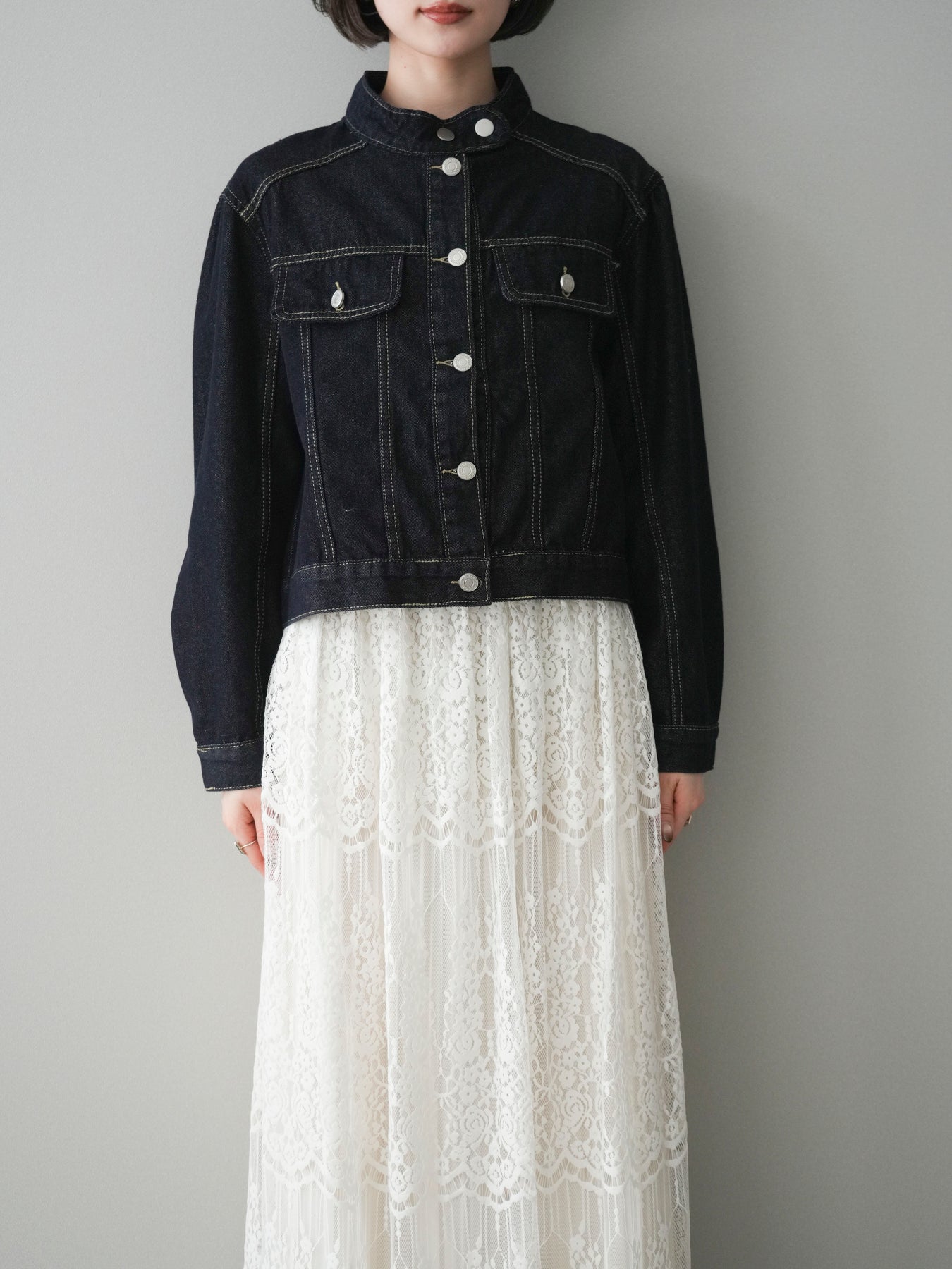 スタンドカラーが印象的な、すっきりとしたシルエットのコンパクトデニムジャケット。首元を立体的に見せるデザインが、カジュアルなデニム素材に程よいきちんと感をプラスします。身頃はバランスの取りやすいコンパクトな丈感で、ワンピースやワイドボトムスとも好相性。季節の変わり目の軽い羽織りとしてはもちろん、コーディネートの引き締め役としても活躍する一着です。 ※ボトムス、キャミソール(インナー)以外の商品は一律でインナーは付属していません。
