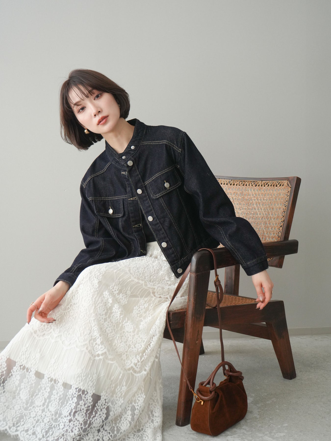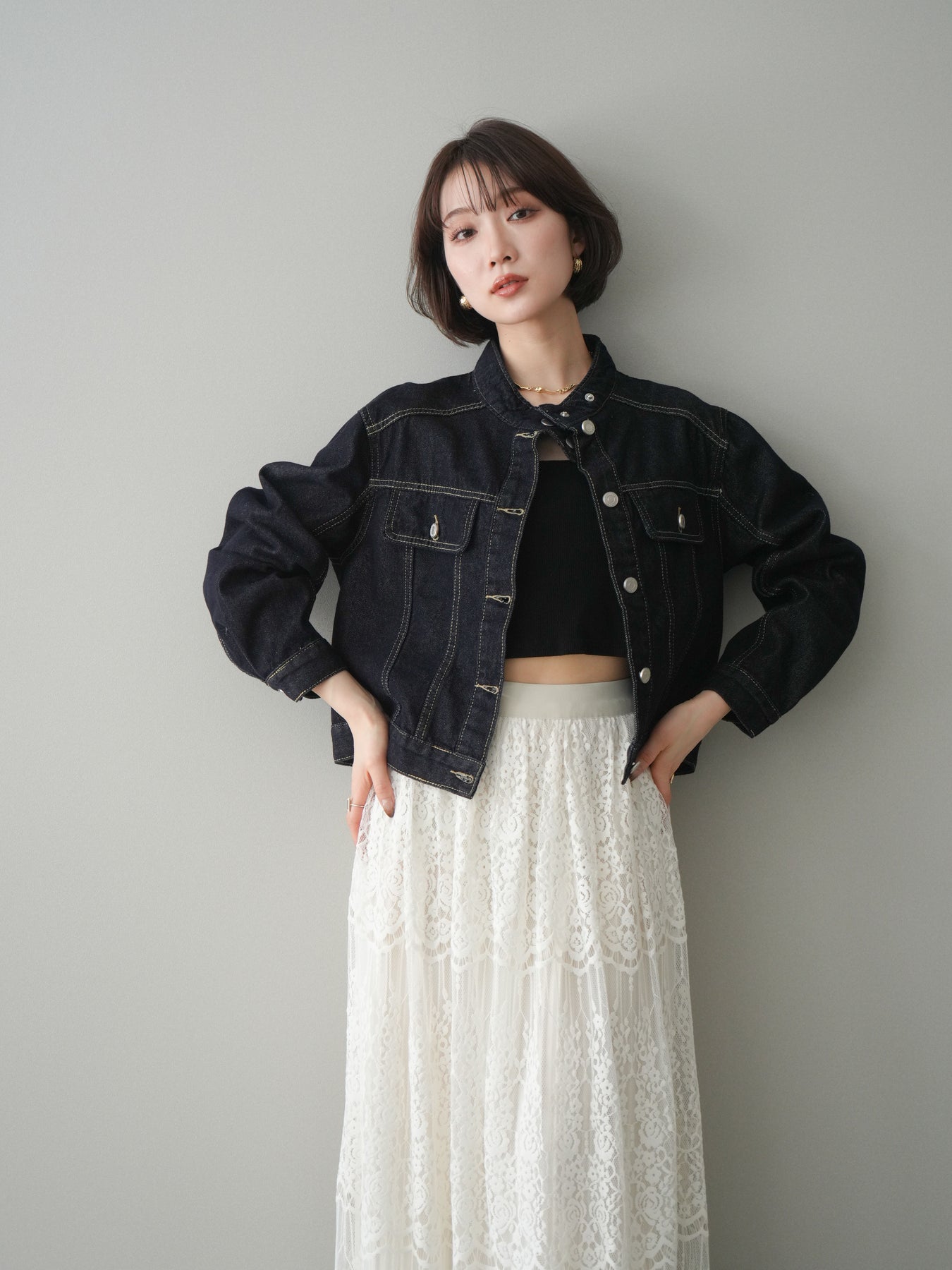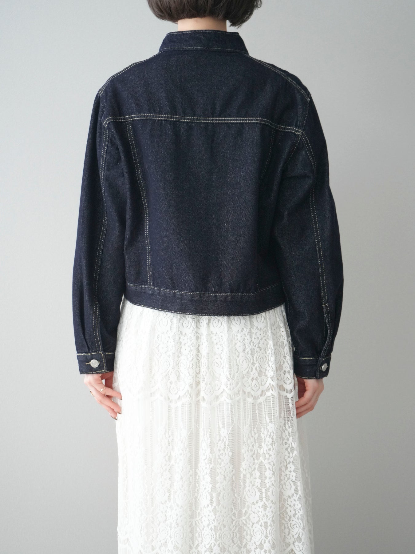 スタンドカラーが印象的な、すっきりとしたシルエットのコンパクトデニムジャケット。首元を立体的に見せるデザインが、カジュアルなデニム素材に程よいきちんと感をプラスします。身頃はバランスの取りやすいコンパクトな丈感で、ワンピースやワイドボトムスとも好相性。季節の変わり目の軽い羽織りとしてはもちろん、コーディネートの引き締め役としても活躍する一着です。 ※ボトムス、キャミソール(インナー)以外の商品は一律でインナーは付属していません。