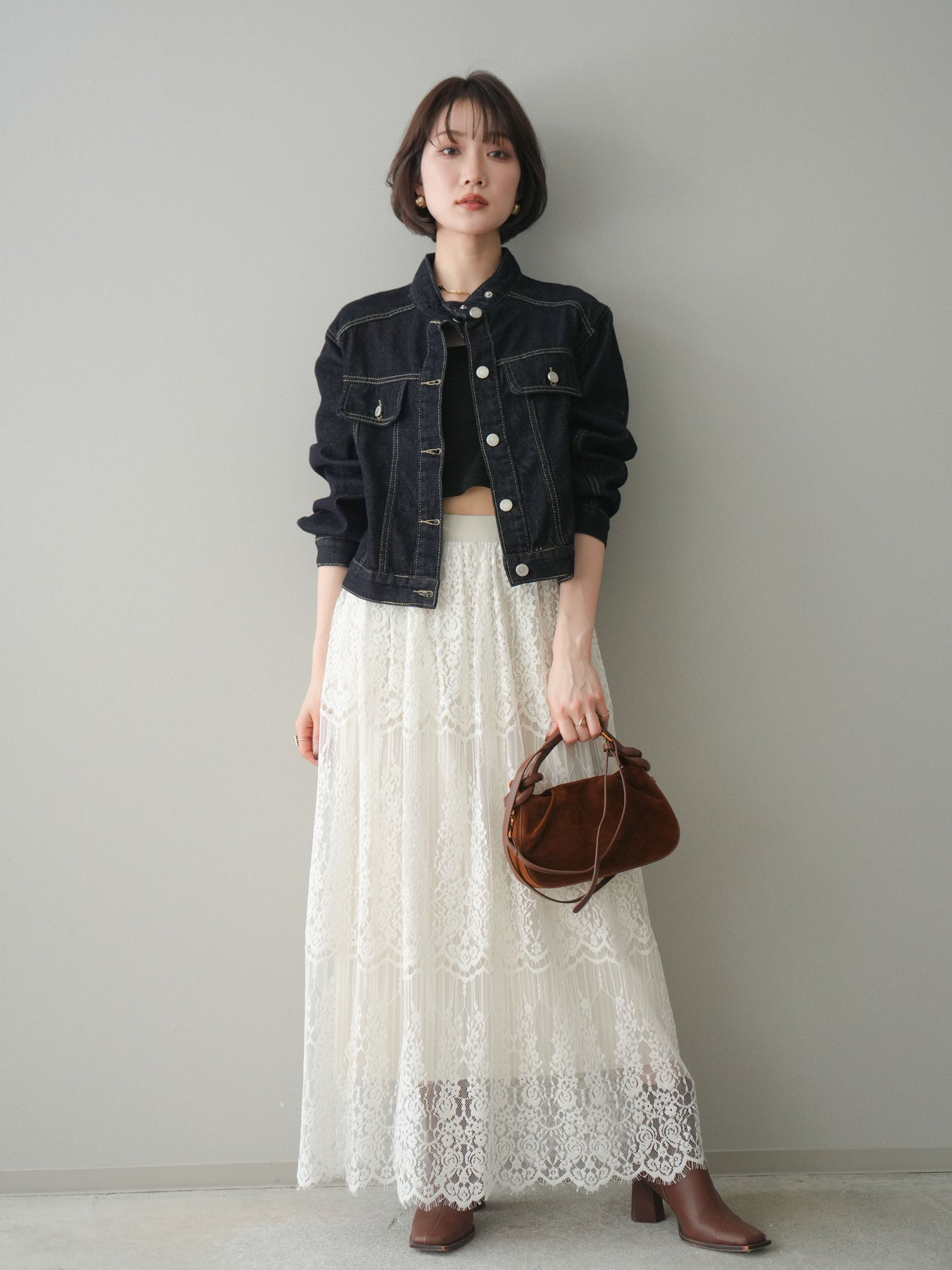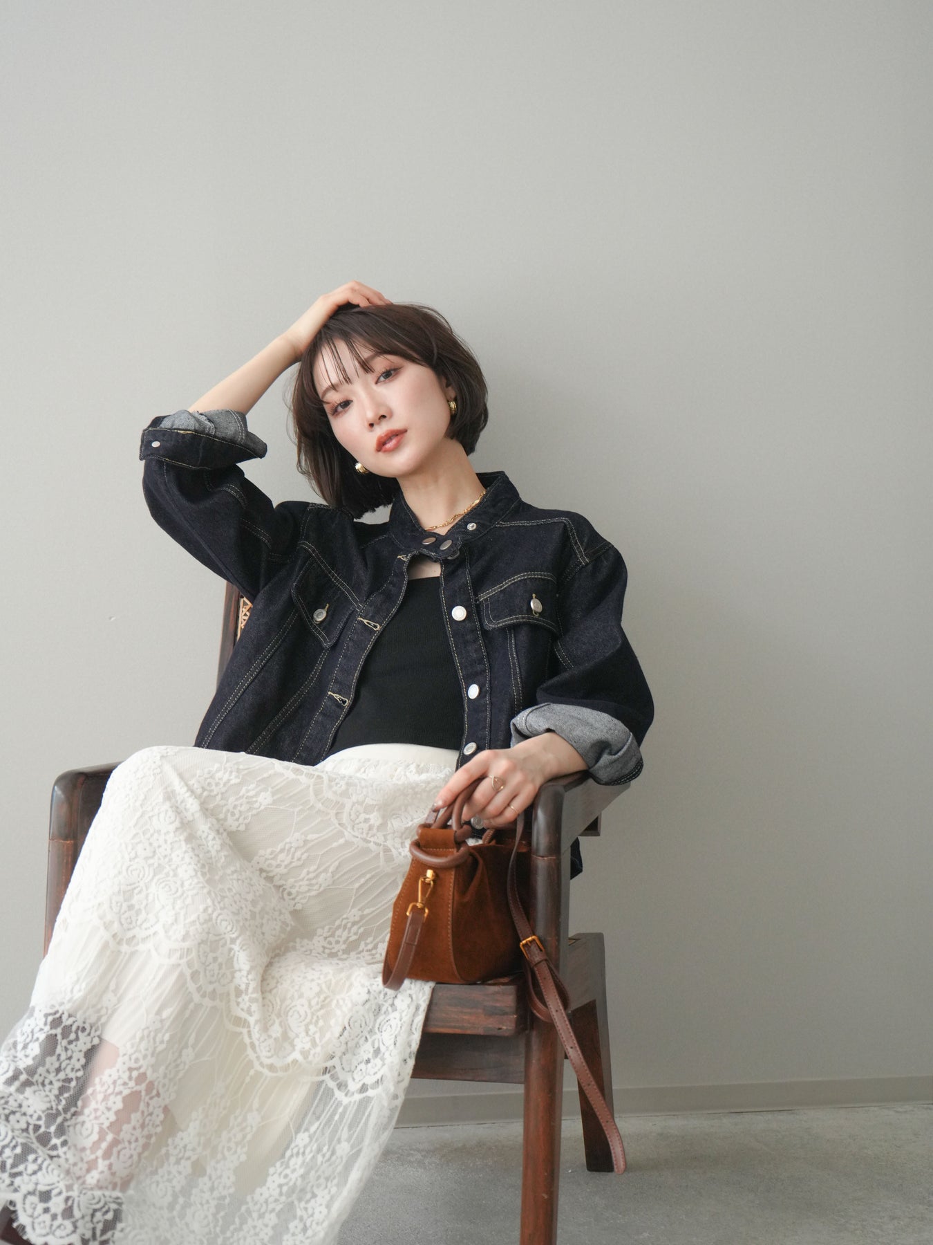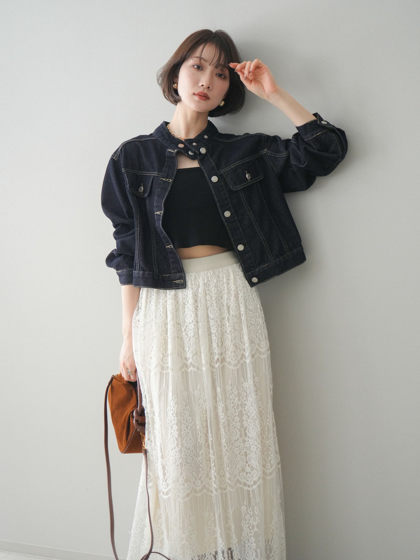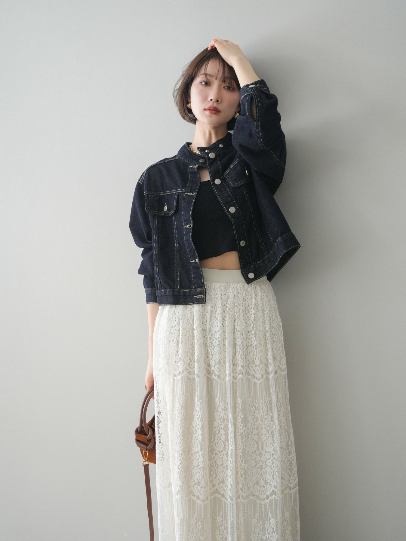 スタンドカラーが印象的な、すっきりとしたシルエットのコンパクトデニムジャケット。首元を立体的に見せるデザインが、カジュアルなデニム素材に程よいきちんと感をプラスします。身頃はバランスの取りやすいコンパクトな丈感で、ワンピースやワイドボトムスとも好相性。季節の変わり目の軽い羽織りとしてはもちろん、コーディネートの引き締め役としても活躍する一着です。 ※ボトムス、キャミソール(インナー)以外の商品は一律でインナーは付属していません。