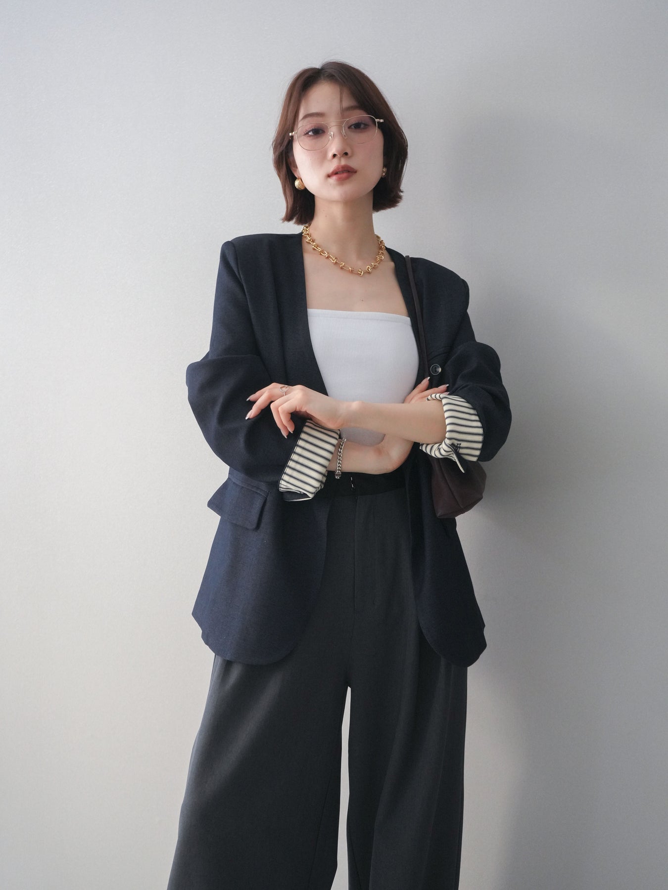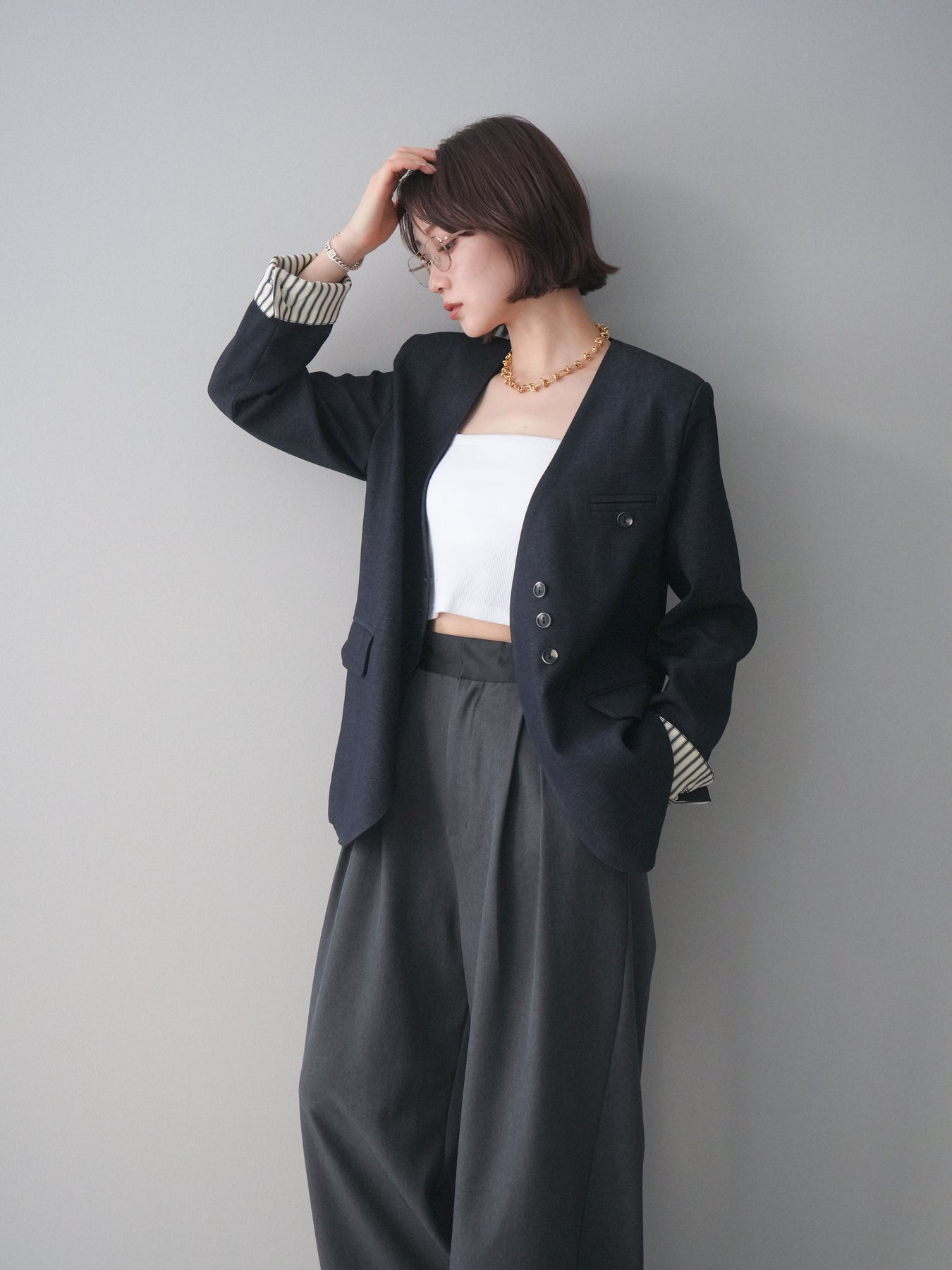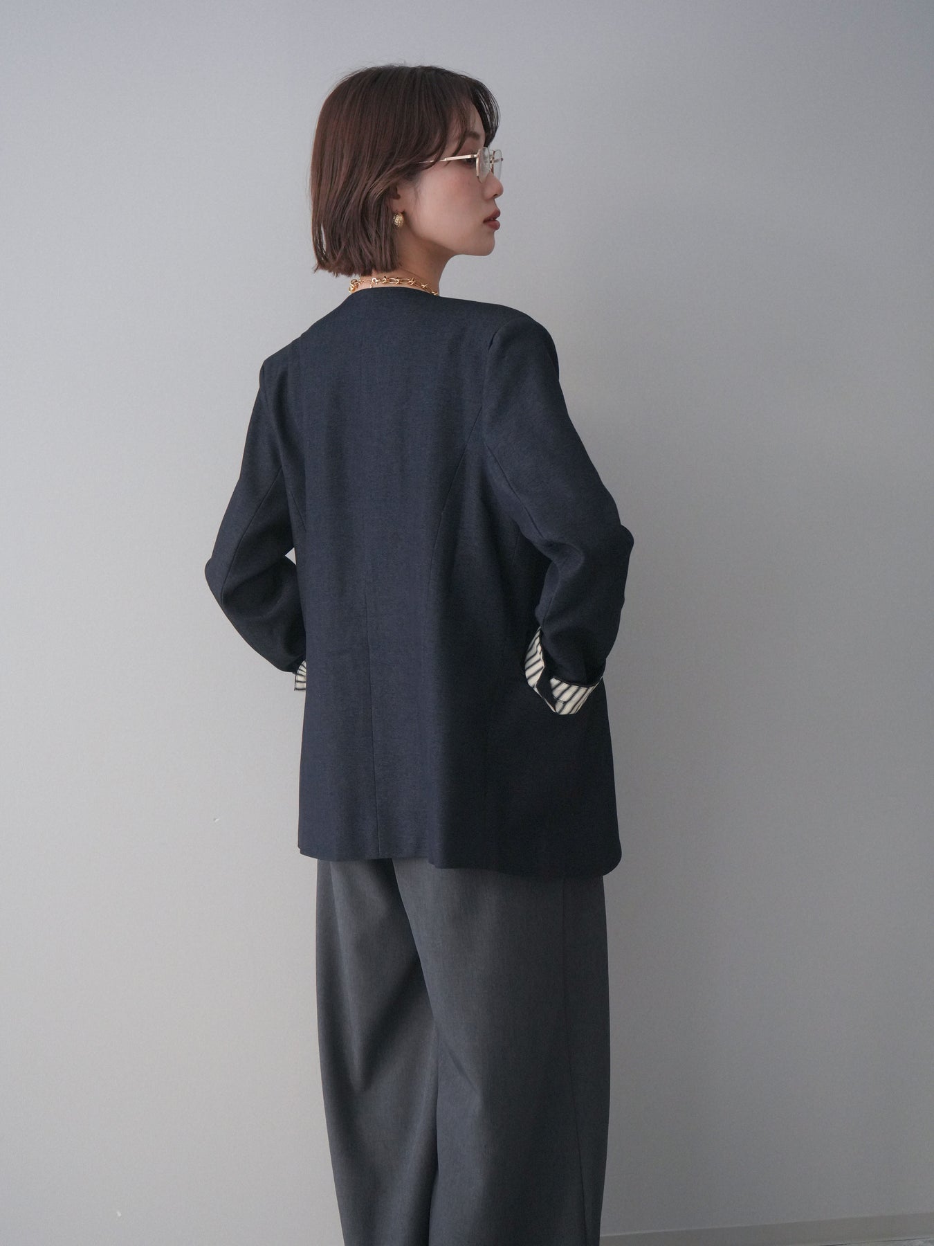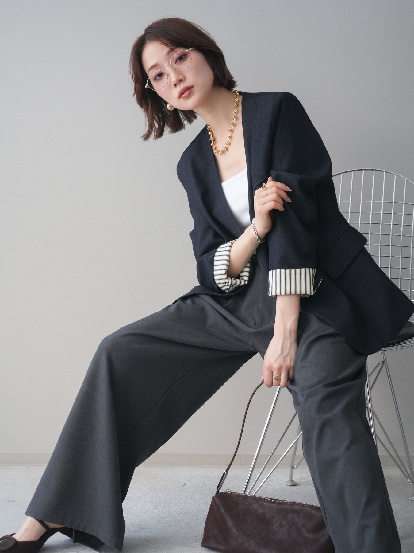 程よいきちんと感と抜け感を両立した、ノーカラーデザインのジャケット。 首元をすっきり見せるカッティングに、さりげないボタン配置がアクセントになり、シンプルながら印象に残る一着です。 袖口を折り返したときに覗くディテールが、着こなしに奥行きをプラス。インナー次第で雰囲気が変わり、デイリーから少し整えたいシーンまで幅広く活躍します。 軽やかな着心地で、肩の力を抜いたスタイルにも自然に馴染むのも魅力です。 ※ボトムス、キャミソール(インナー)以外の商品は一律でインナーは付属していません。