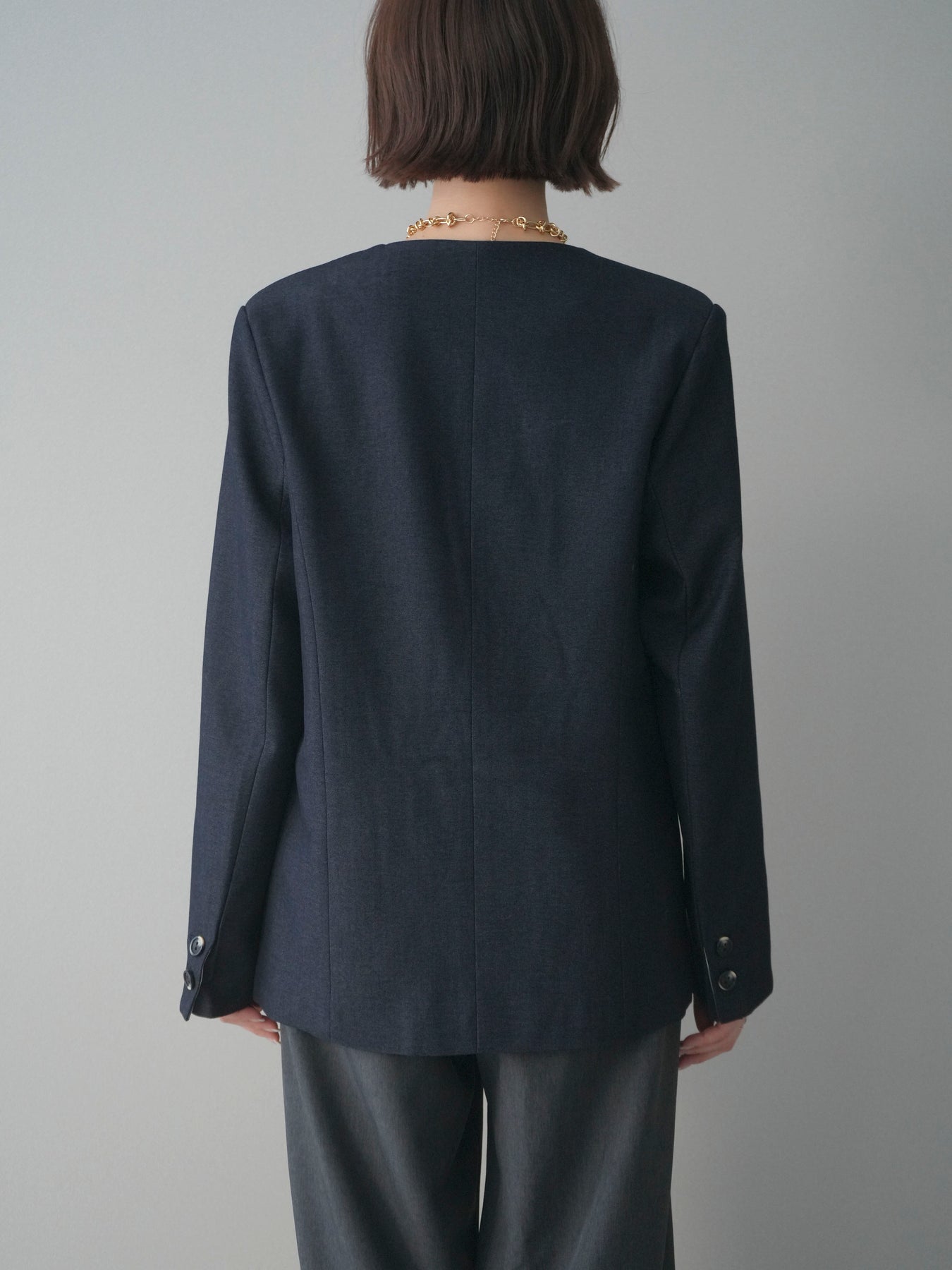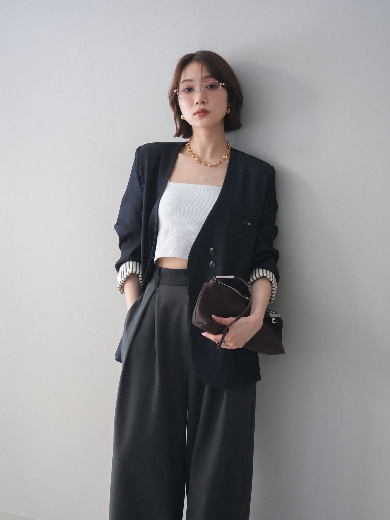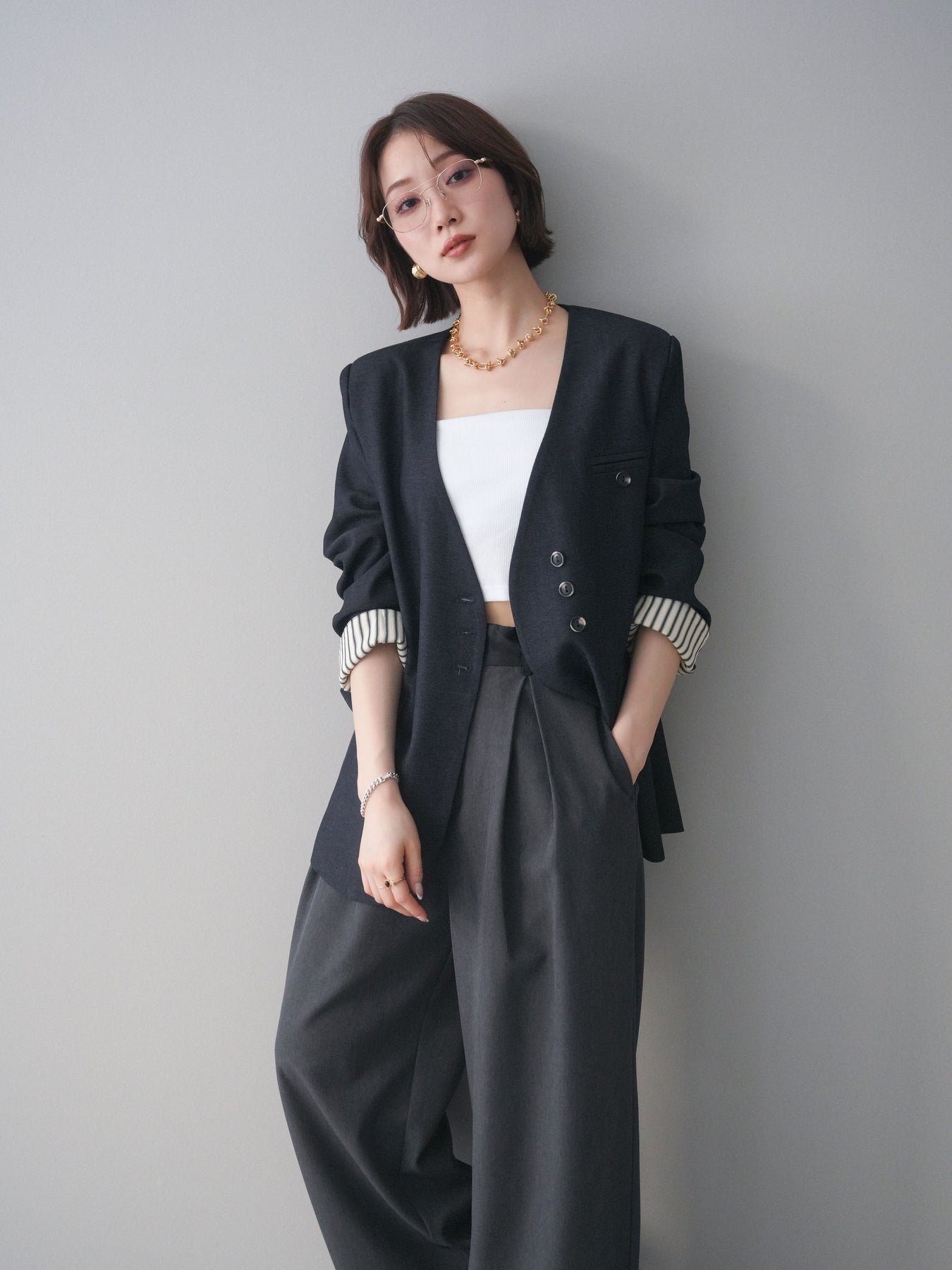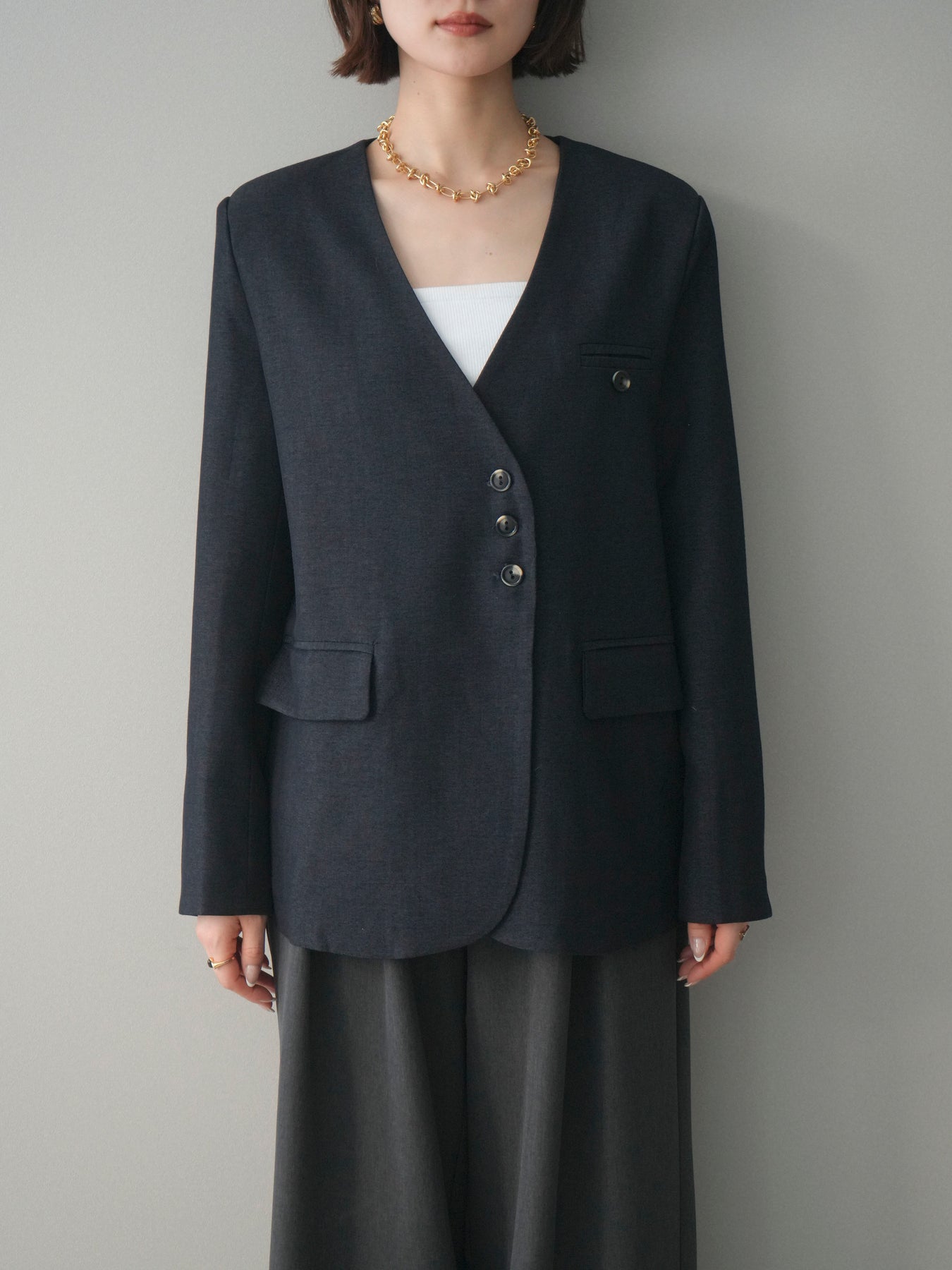 程よいきちんと感と抜け感を両立した、ノーカラーデザインのジャケット。 首元をすっきり見せるカッティングに、さりげないボタン配置がアクセントになり、シンプルながら印象に残る一着です。 袖口を折り返したときに覗くディテールが、着こなしに奥行きをプラス。インナー次第で雰囲気が変わり、デイリーから少し整えたいシーンまで幅広く活躍します。 軽やかな着心地で、肩の力を抜いたスタイルにも自然に馴染むのも魅力です。 ※ボトムス、キャミソール(インナー)以外の商品は一律でインナーは付属していません。
