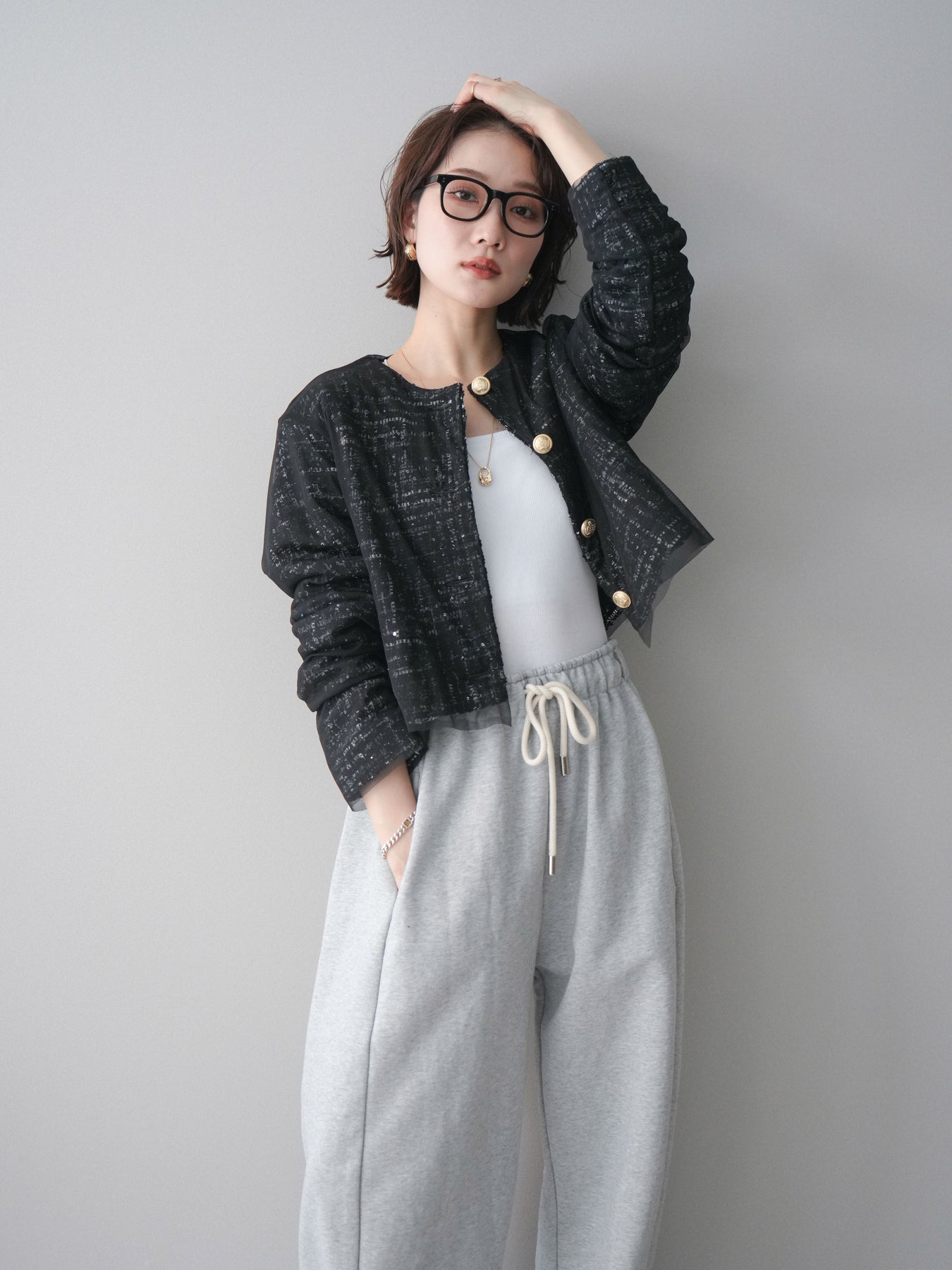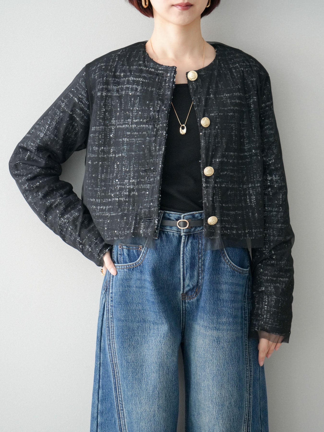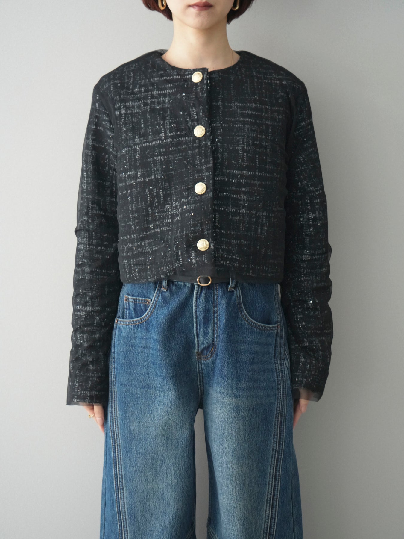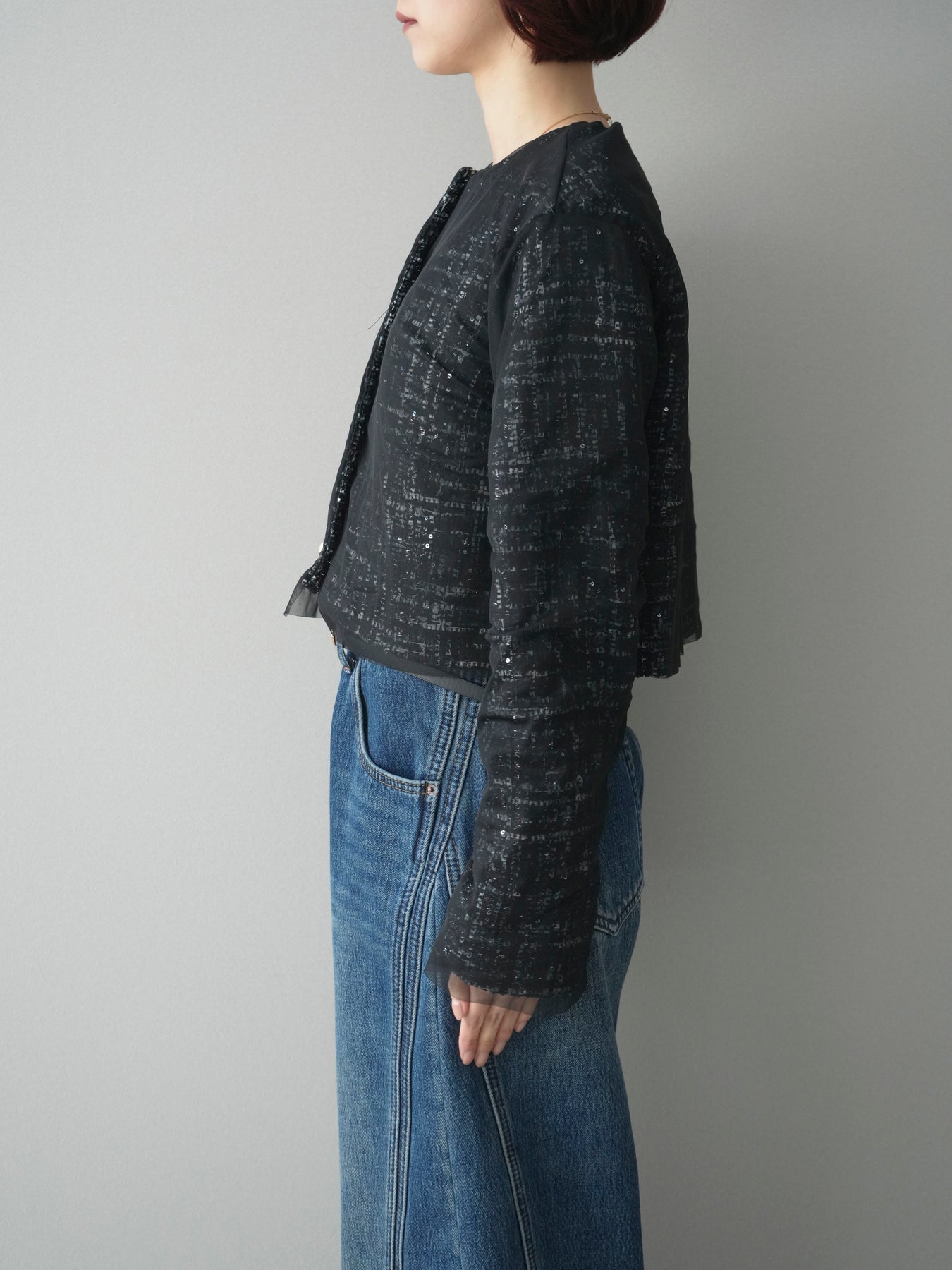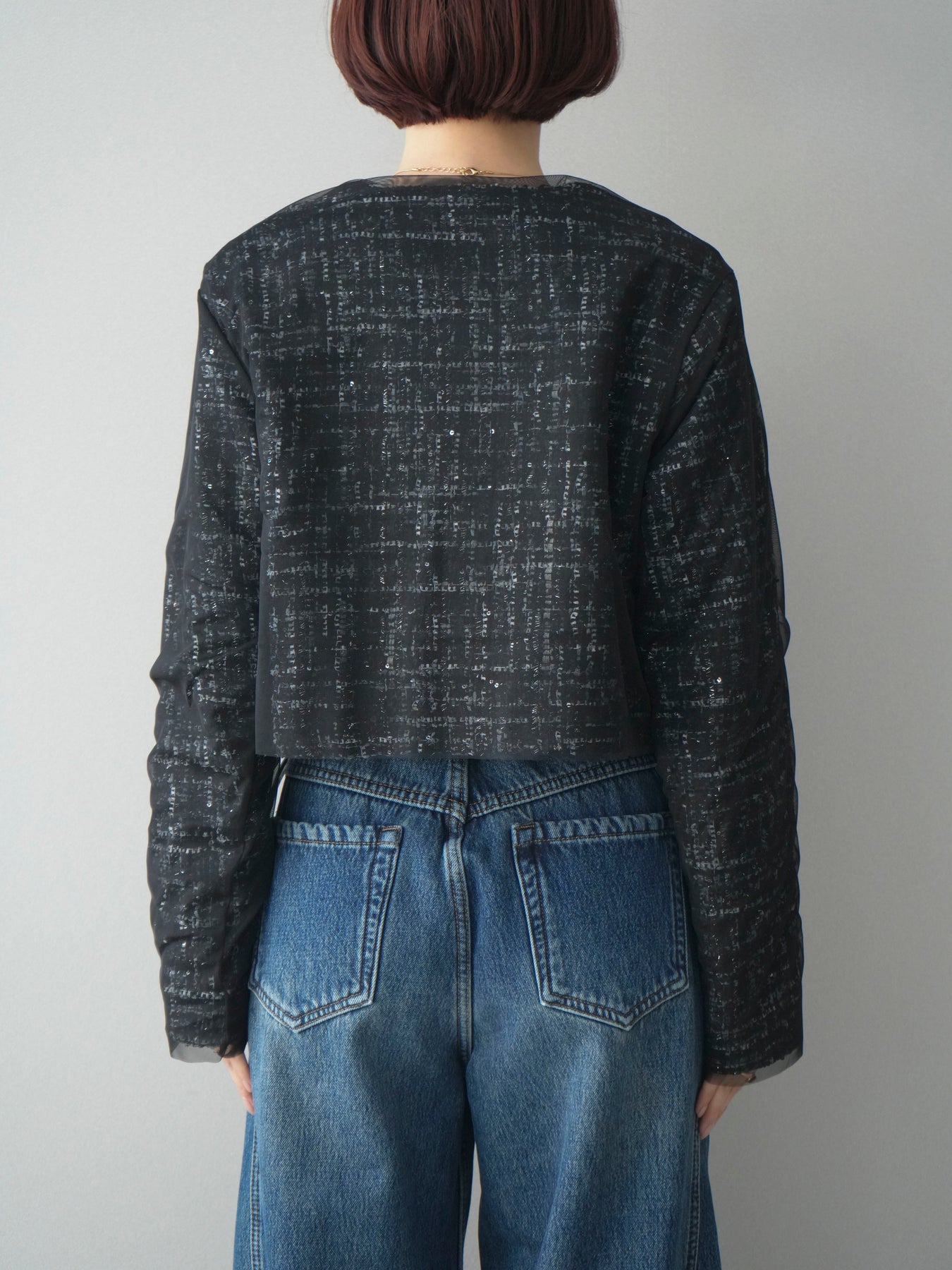 [予約]チュールレイヤードツイードクロップドジャケット/black