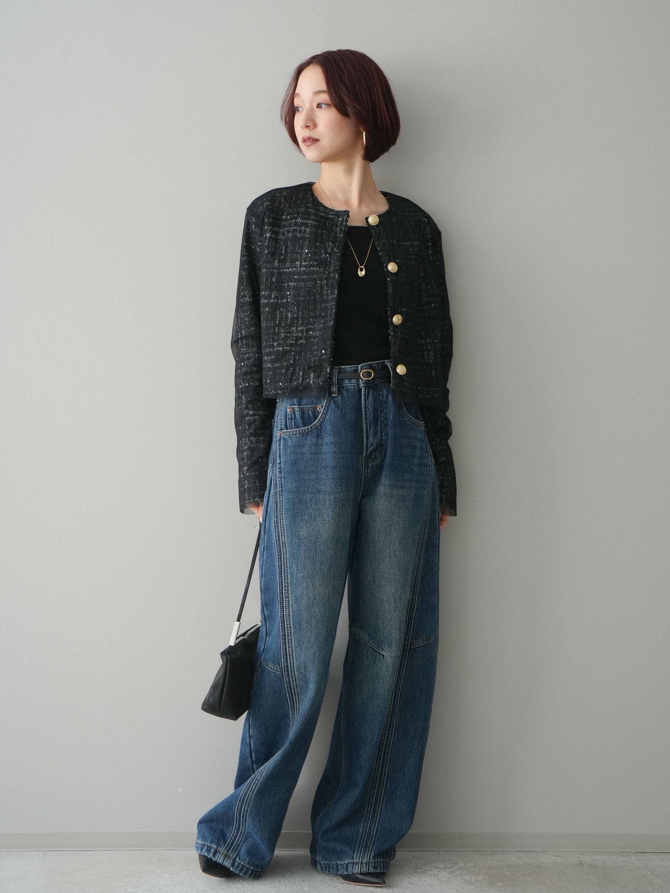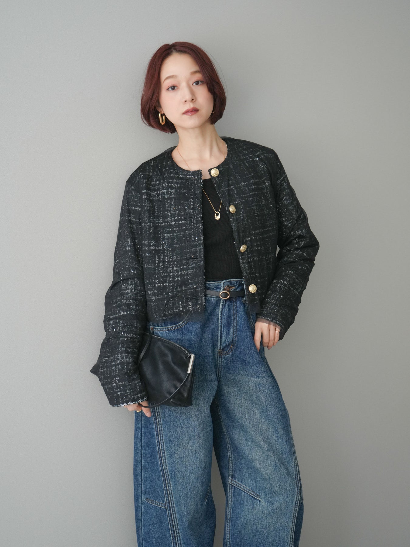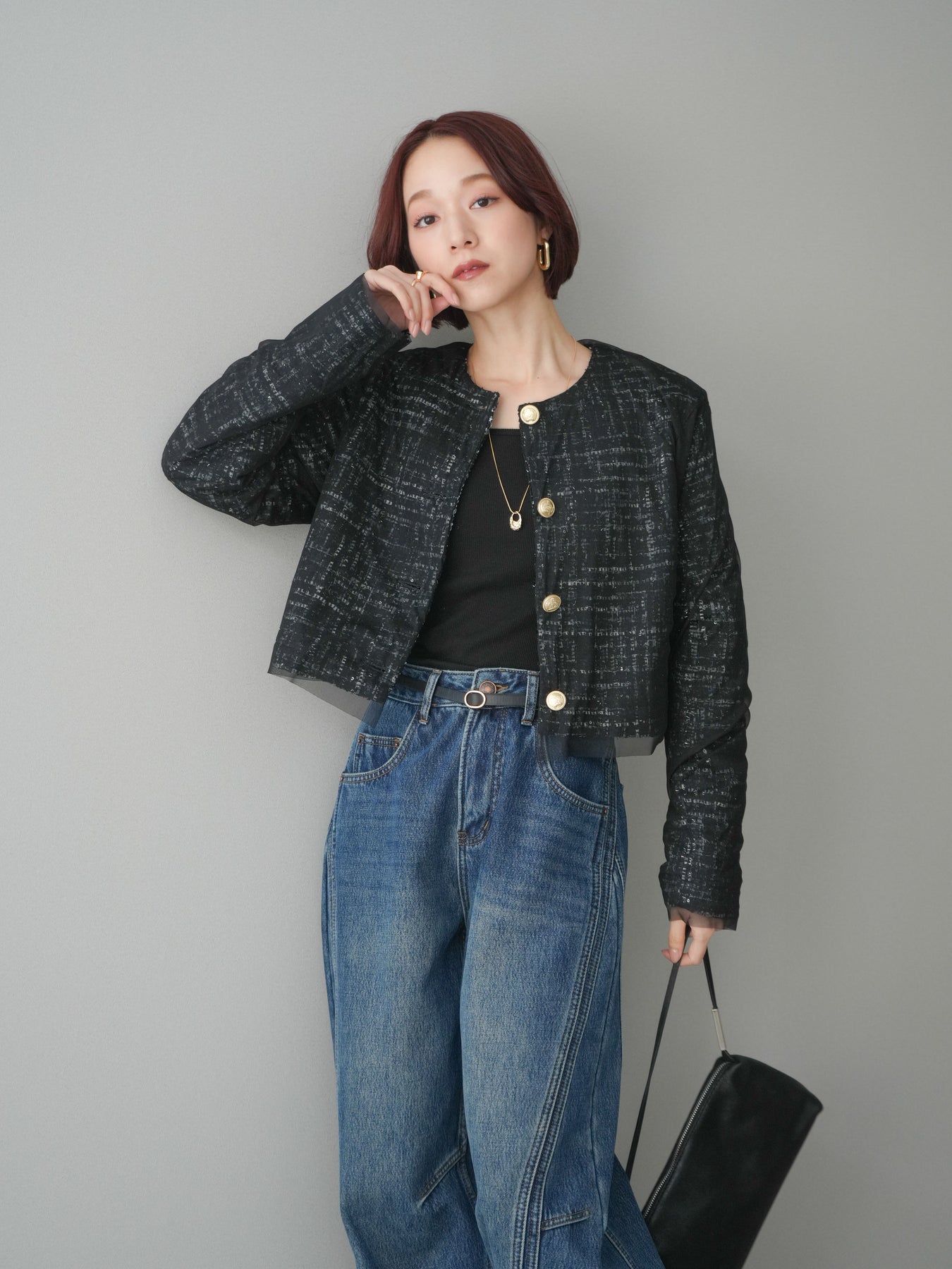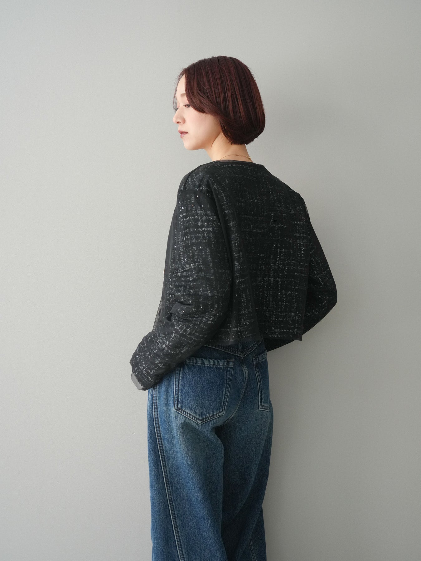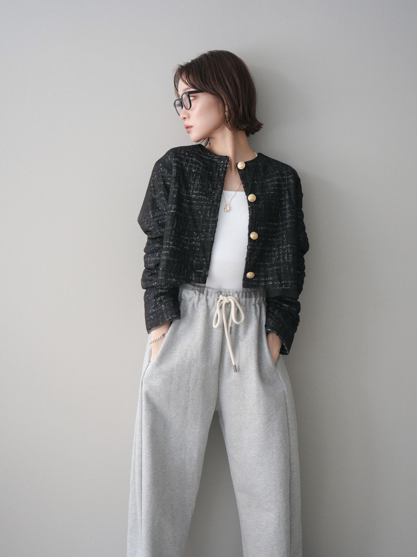 [予約]チュールレイヤードツイードクロップドジャケット/black