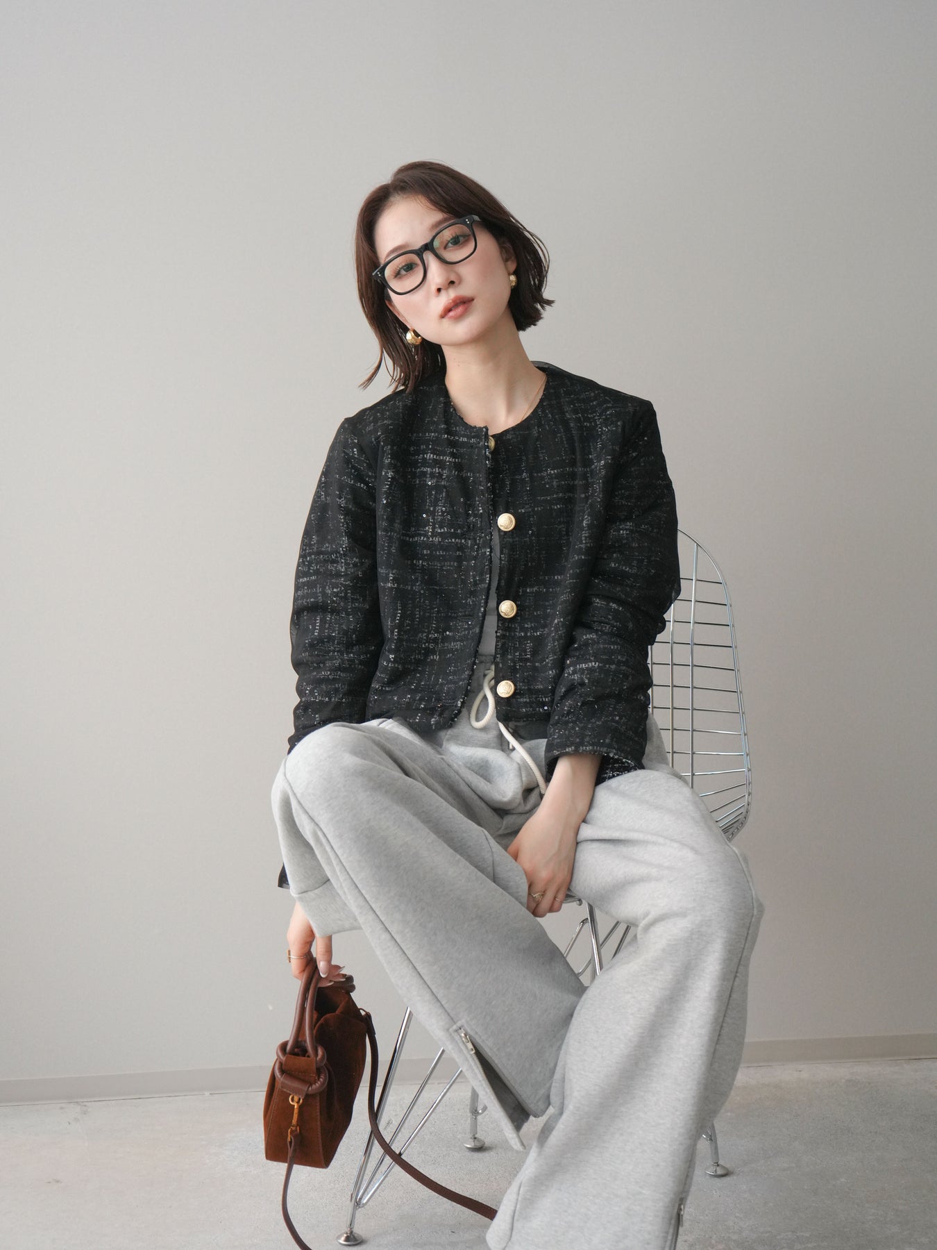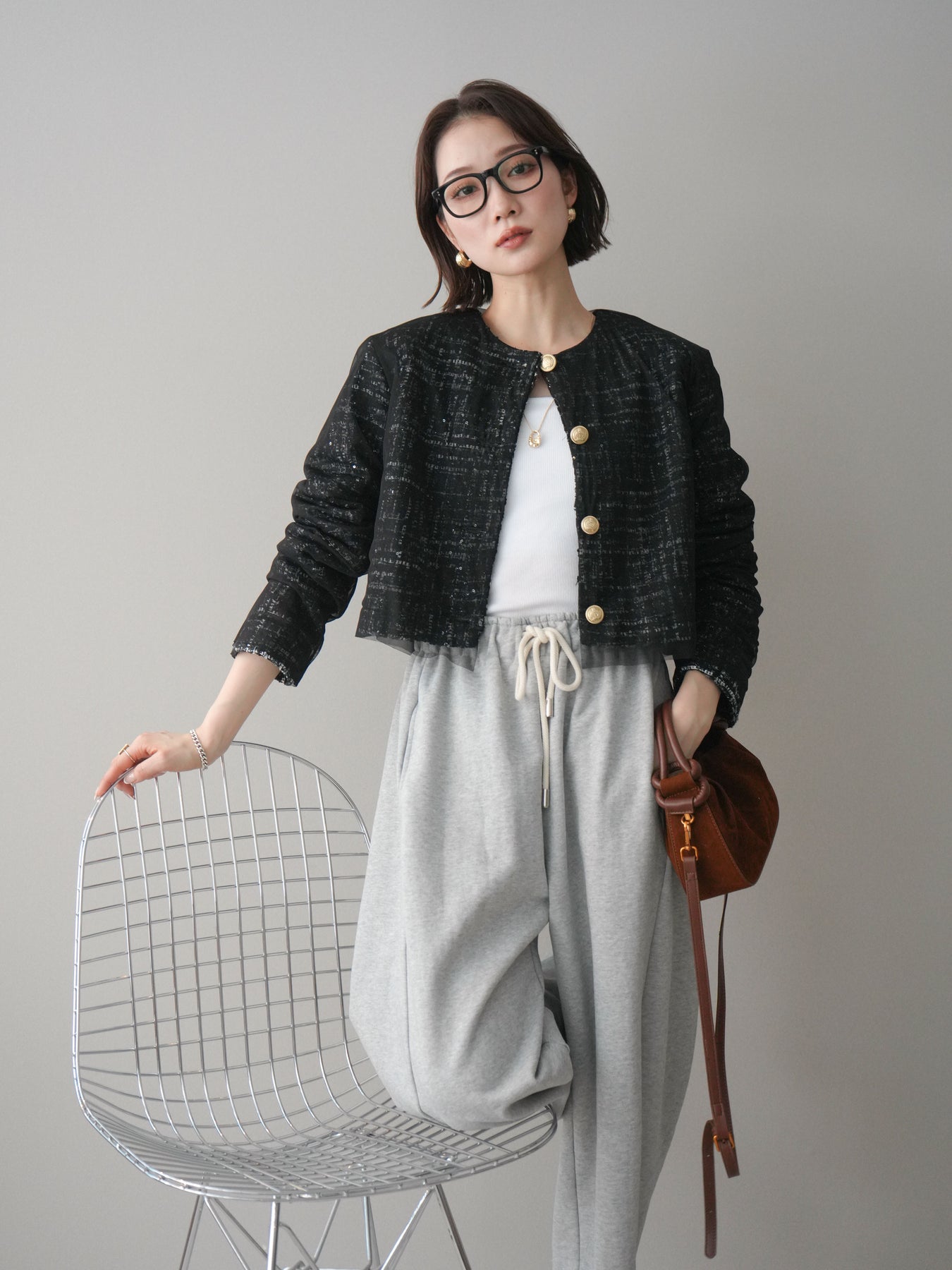 繊細な表情を持つツイード素材に、チュールを重ねたレイヤードデザインが印象的なクロップドジャケット。 コンパクトな丈感が全体のバランスをすっきりと見せ、パンツやスカートとも合わせやすい一枚です。 表情のある素材感がコーディネートに奥行きを与えつつ、ノーカラー仕様ですっきりとした印象に。 フロントのデザインが程よいアクセントになり、シンプルなインナー合わせでもスタイルがまとまります。 軽やかさと存在感を兼ね備えたデザインで、日常使いからきれいめなスタイリングまで幅広く活躍。 さっと羽織るだけで、コーディネートにさりげない変化を加えてくれるアイテムです。 ※ボトムス、キャミソール(インナー)以外の商品は一律でインナーは付属していません。
