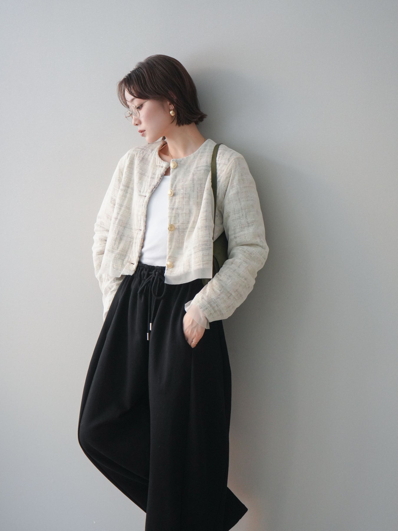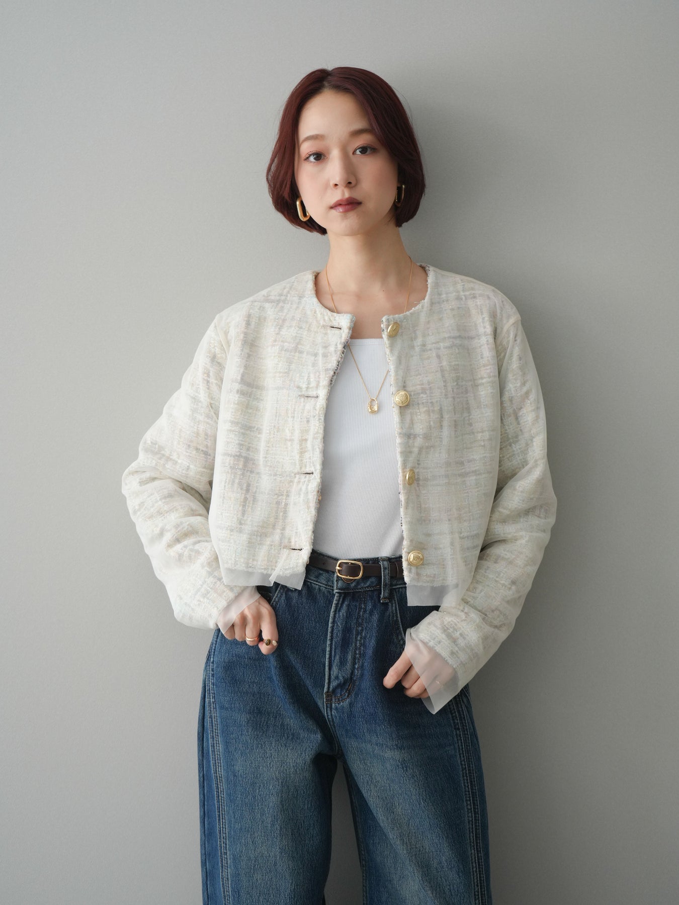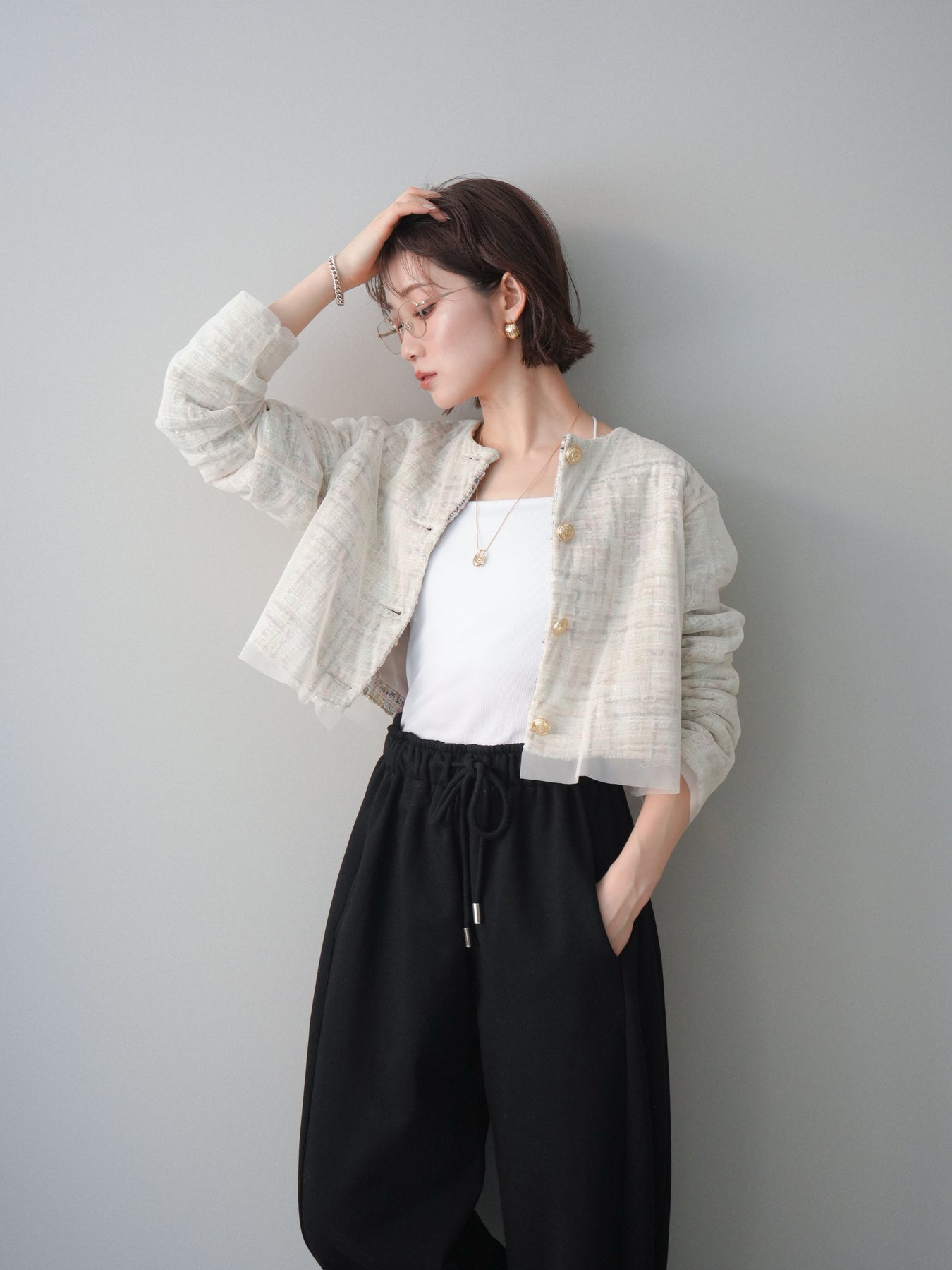 繊細な表情を持つツイード素材に、チュールを重ねたレイヤードデザインが印象的なクロップドジャケット。 コンパクトな丈感が全体のバランスをすっきりと見せ、パンツやスカートとも合わせやすい一枚です。 表情のある素材感がコーディネートに奥行きを与えつつ、ノーカラー仕様ですっきりとした印象に。 フロントのデザインが程よいアクセントになり、シンプルなインナー合わせでもスタイルがまとまります。 軽やかさと存在感を兼ね備えたデザインで、日常使いからきれいめなスタイリングまで幅広く活躍。 さっと羽織るだけで、コーディネートにさりげない変化を加えてくれるアイテムです。 ※ボトムス、キャミソール(インナー)以外の商品は一律でインナーは付属していません。