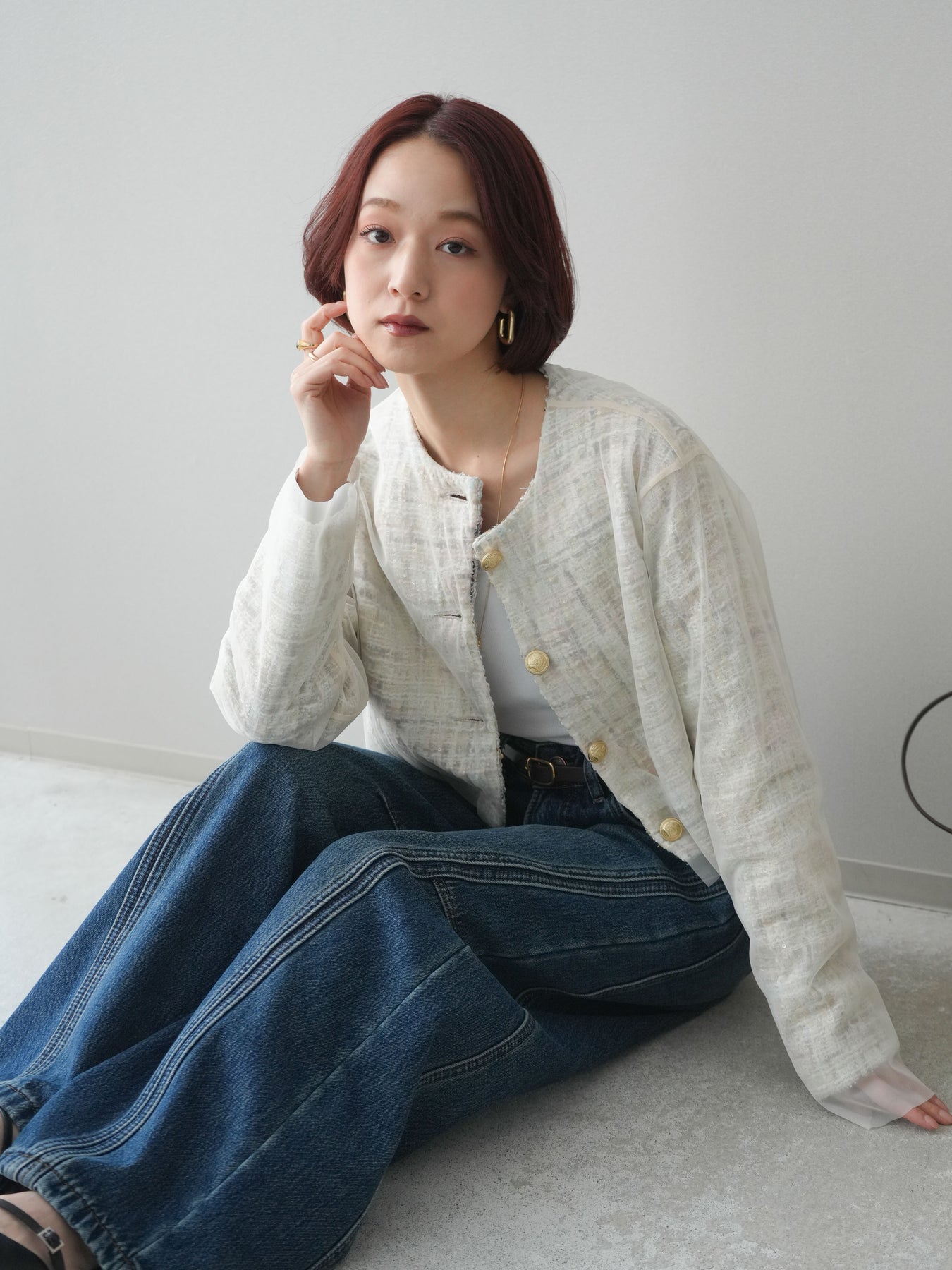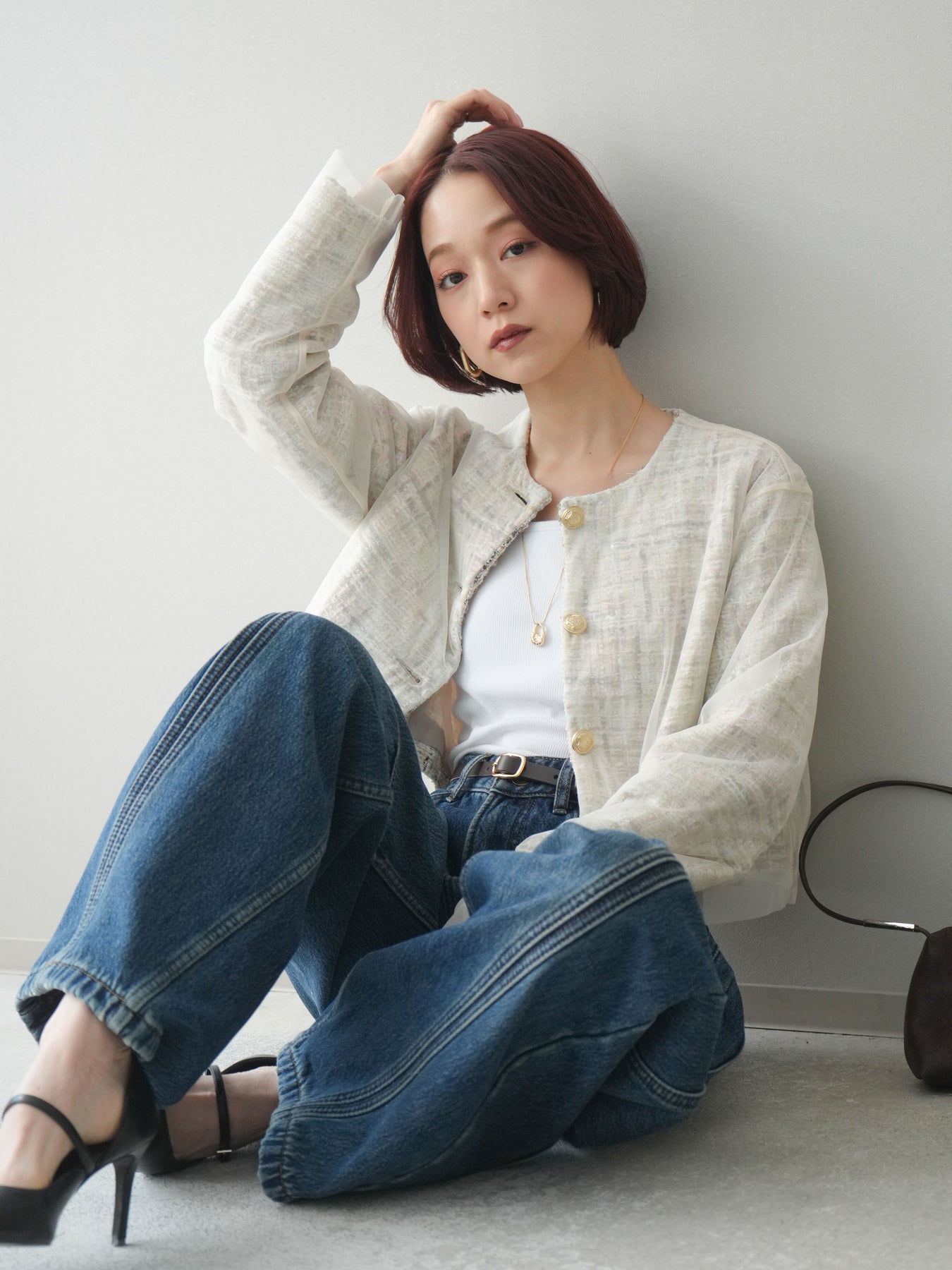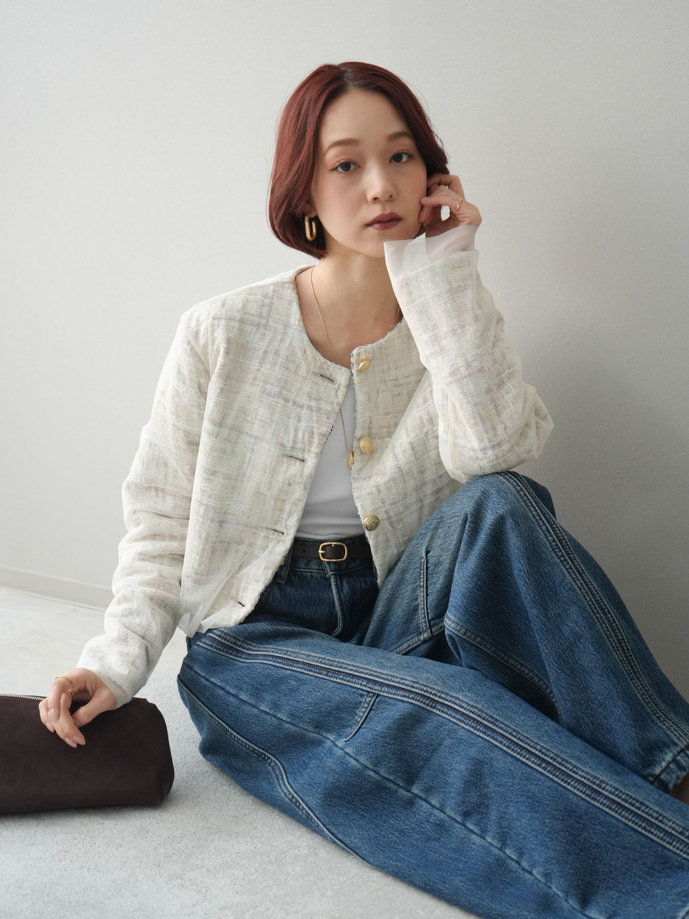 繊細な表情を持つツイード素材に、チュールを重ねたレイヤードデザインが印象的なクロップドジャケット。 コンパクトな丈感が全体のバランスをすっきりと見せ、パンツやスカートとも合わせやすい一枚です。 表情のある素材感がコーディネートに奥行きを与えつつ、ノーカラー仕様ですっきりとした印象に。 フロントのデザインが程よいアクセントになり、シンプルなインナー合わせでもスタイルがまとまります。 軽やかさと存在感を兼ね備えたデザインで、日常使いからきれいめなスタイリングまで幅広く活躍。 さっと羽織るだけで、コーディネートにさりげない変化を加えてくれるアイテムです。 ※ボトムス、キャミソール(インナー)以外の商品は一律でインナーは付属していません。